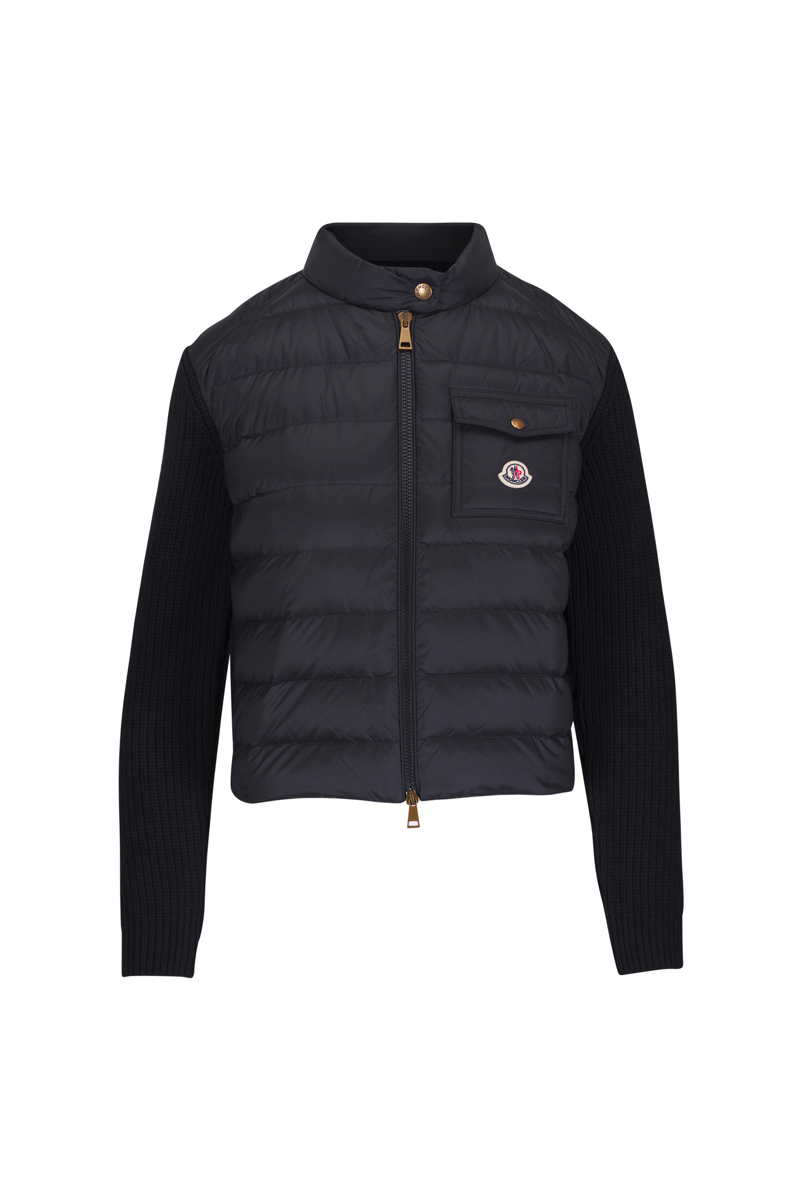 Stand collar. Front two-way zip placket. Lower zip pockets; chest snap pocket pocket. Straight hem. Imported. Shoulder to hem 20" (size m). Outer front: 100% polyamide; base fabric: 90% virgin wool, 10% cashmere; front lining: 100% polyamide. Dry clean.