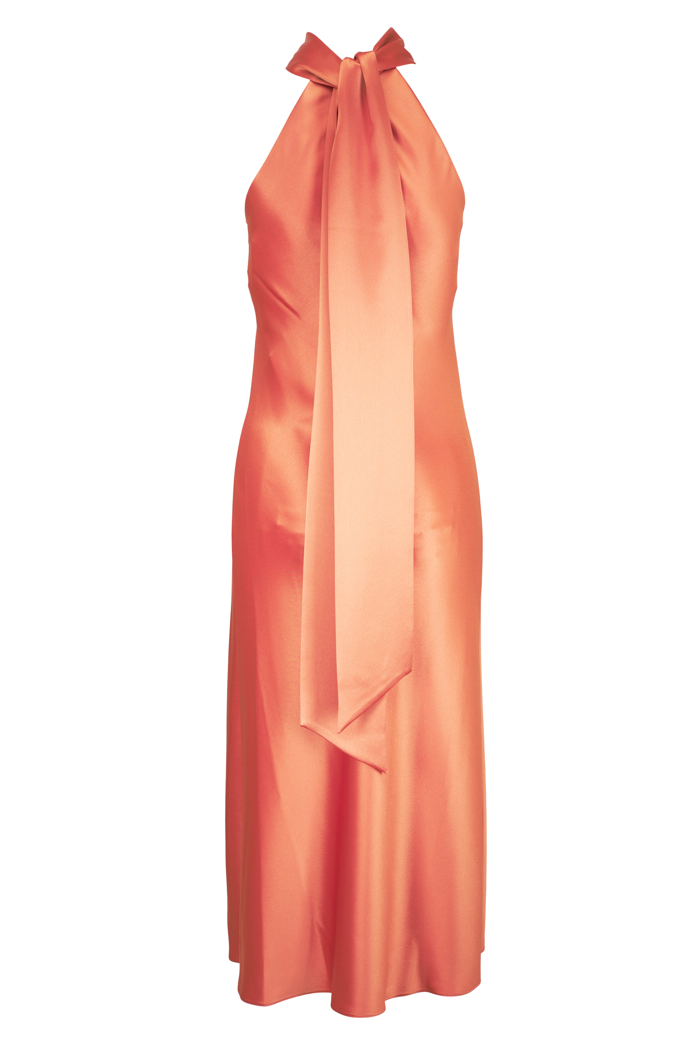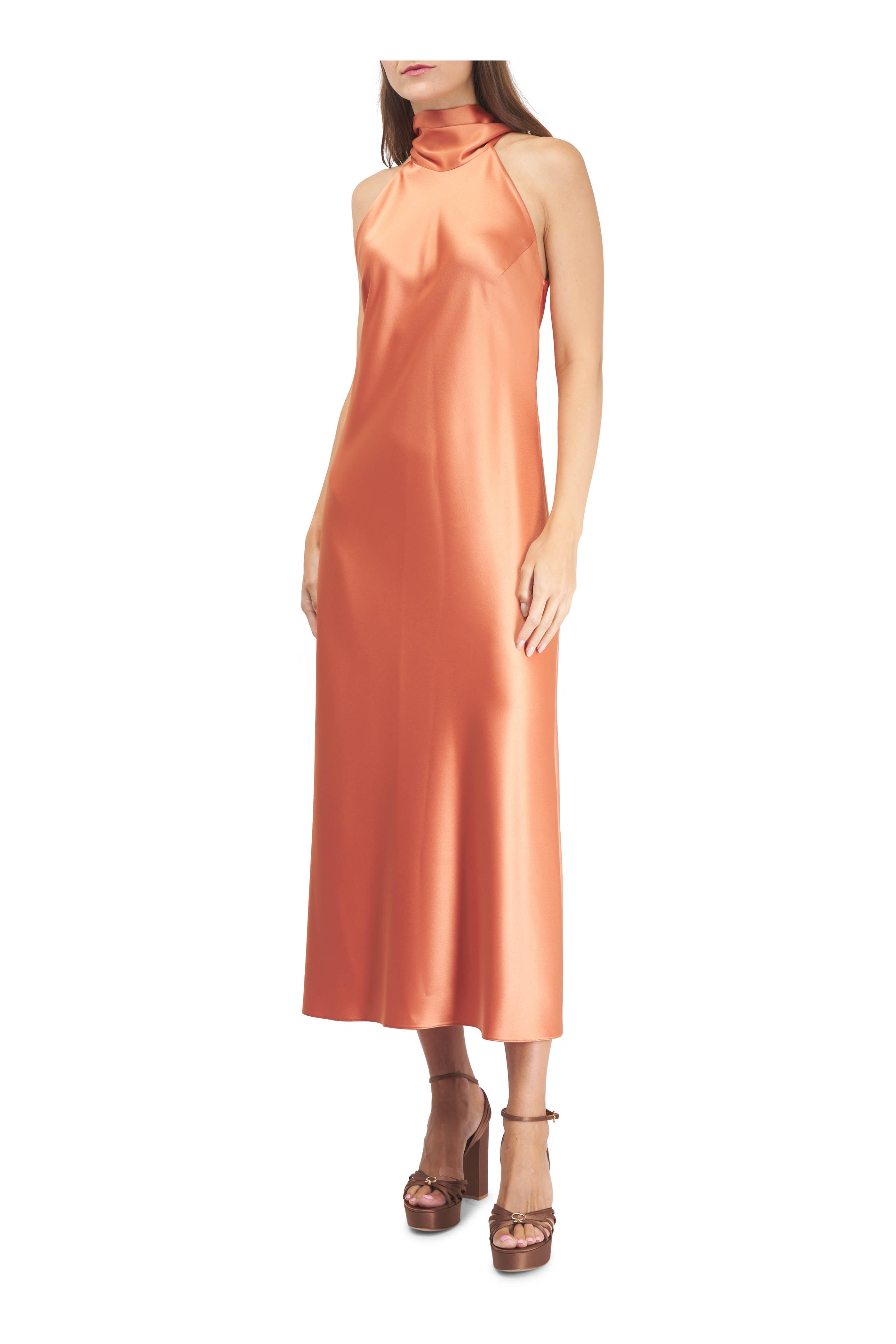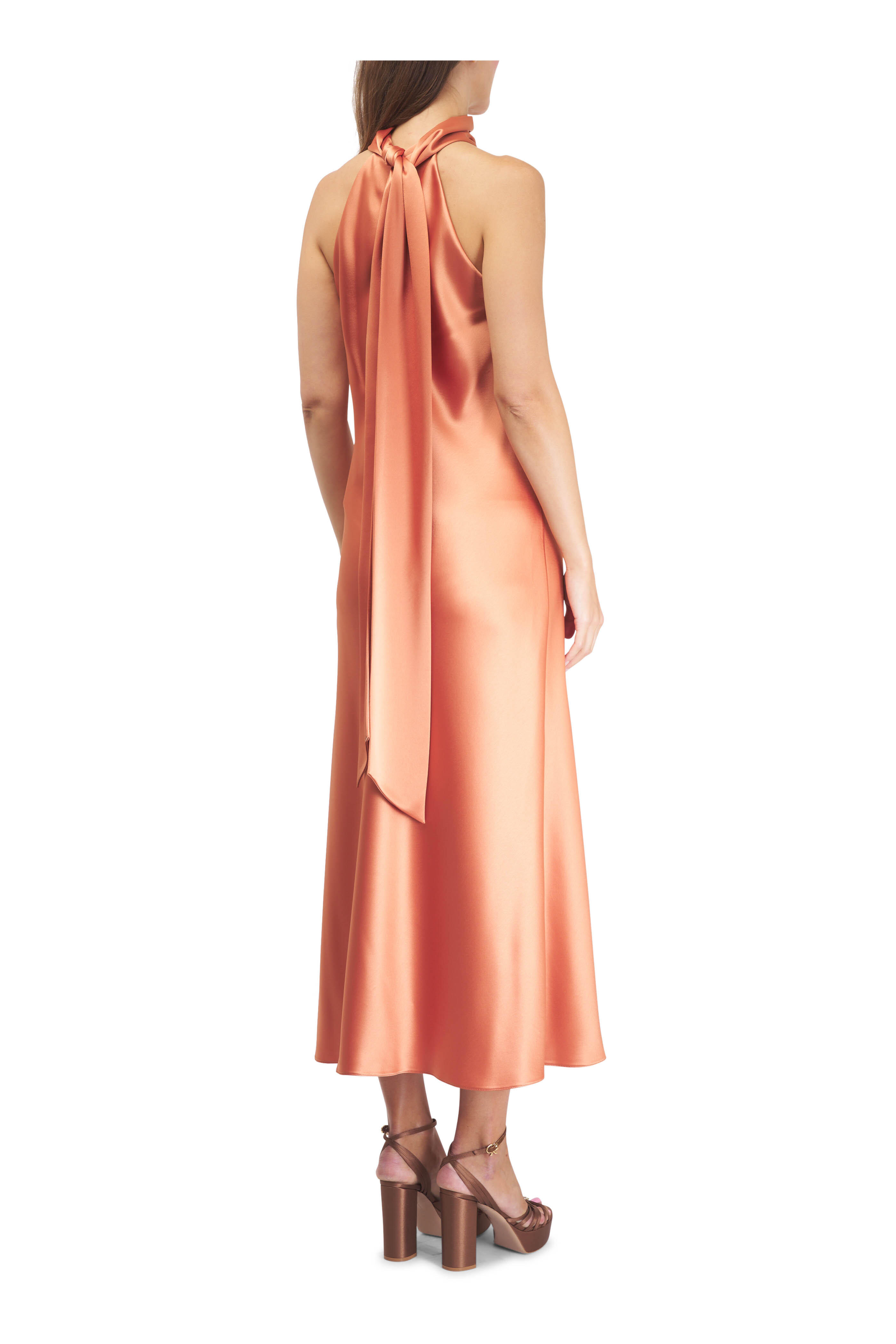 Halter neckline with sash tie. Back single button closure with keyhole detail. Straight hem. Imported. Shoulder to hem 54" (size 2). 100% silk; lined. Dry clean.
