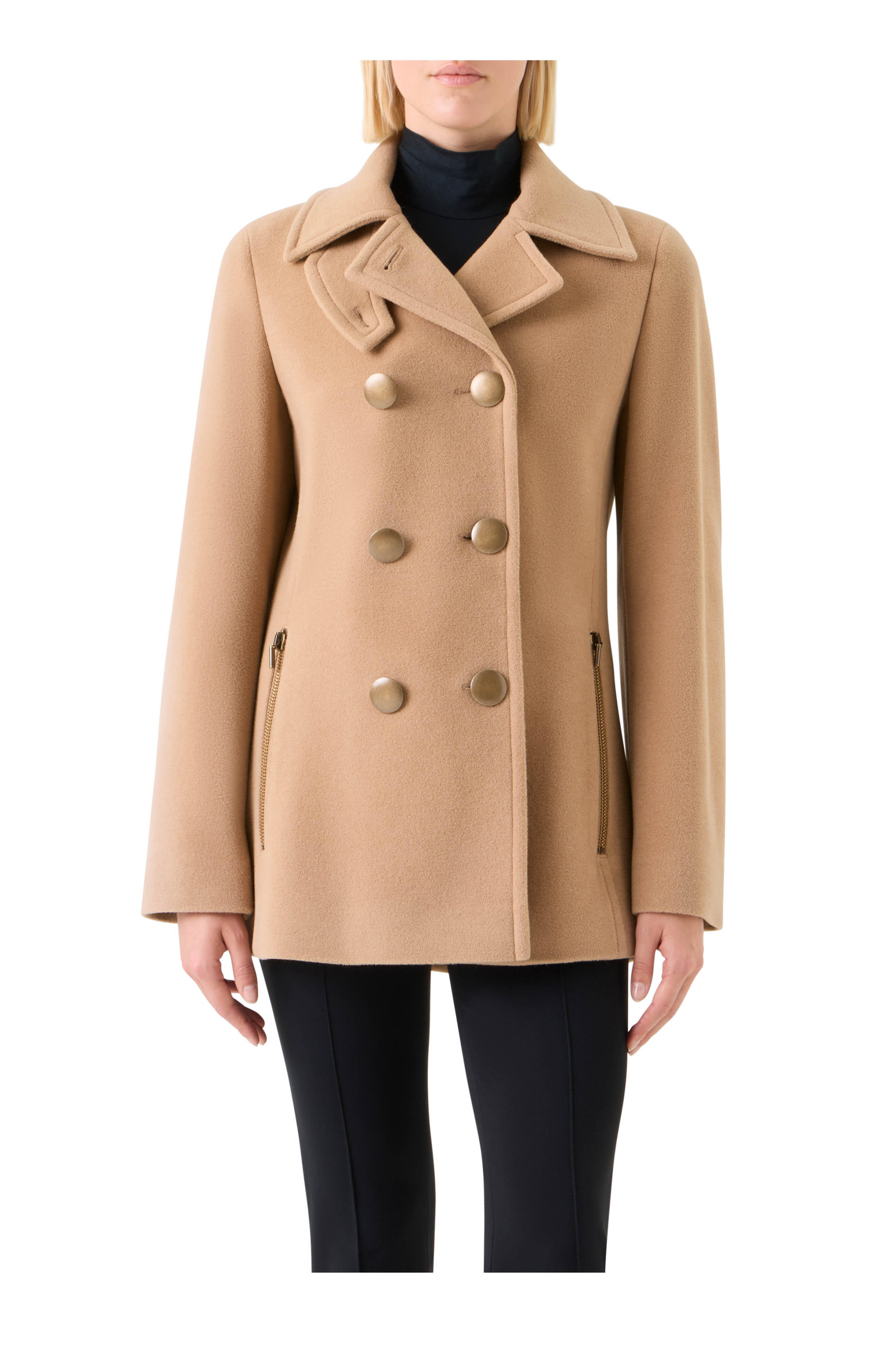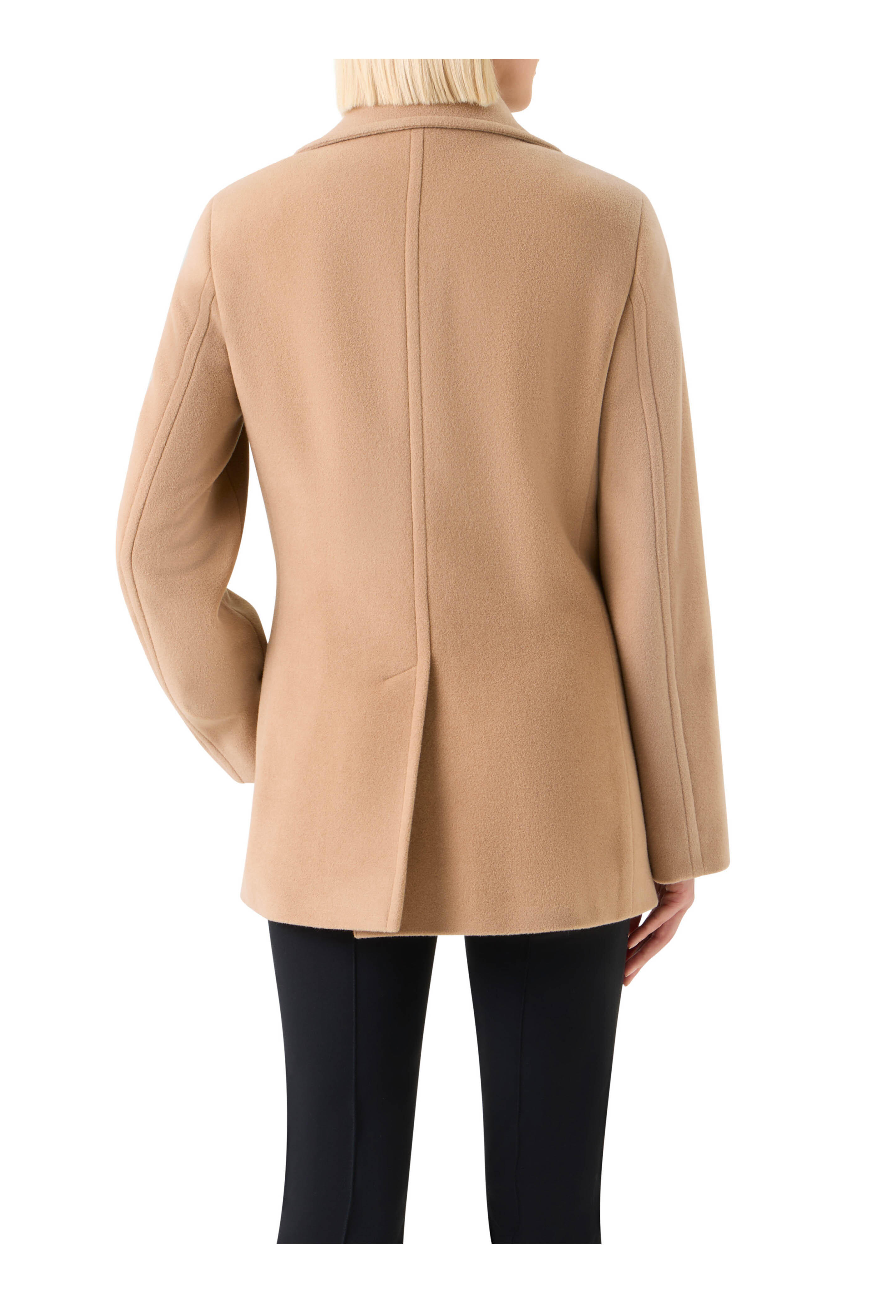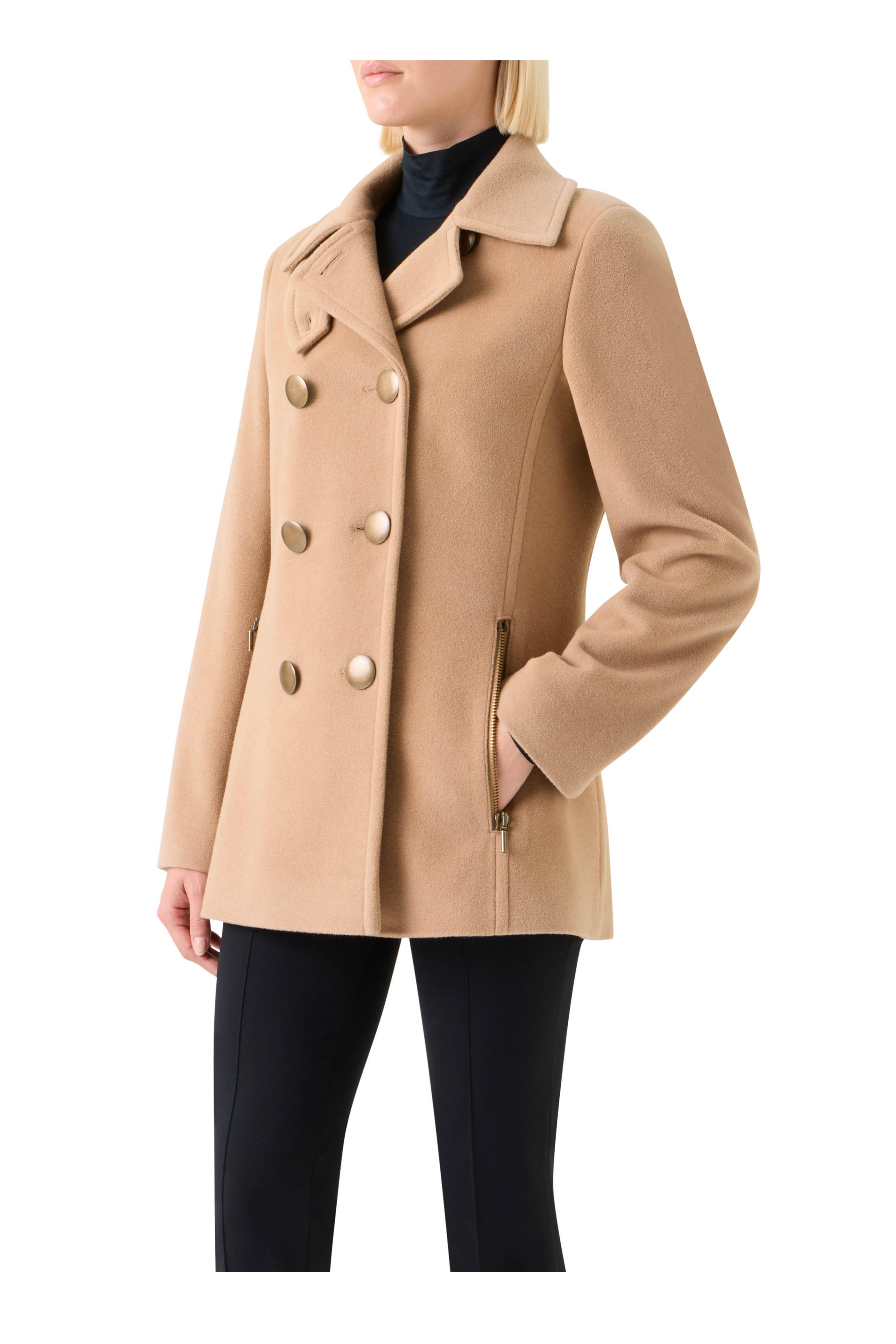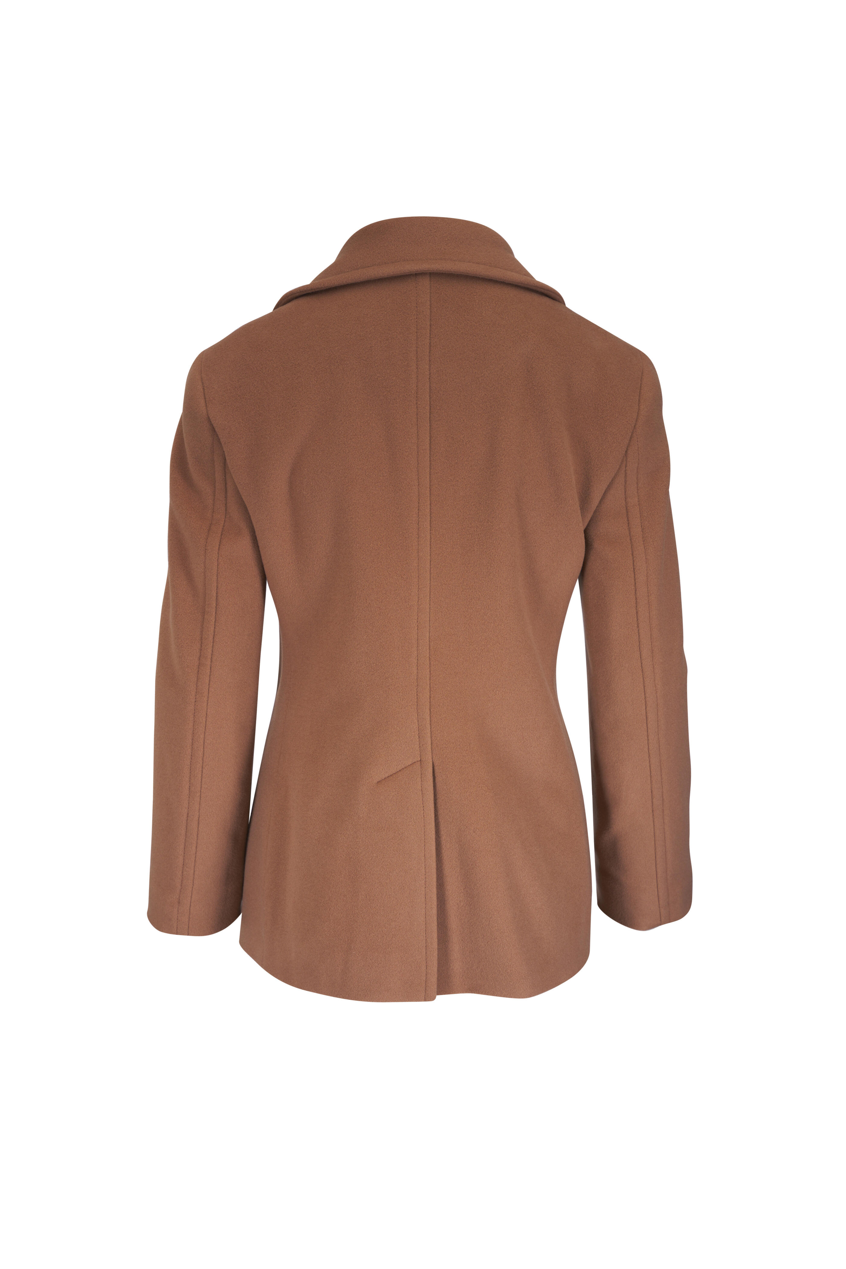 Notched lapel collar. Front double breasted button closure. Side vertical zip pockets. Detachable throat latch. Back vent. Fabric from Italy. Approximately 29" shoulder to hem (measurements taken from size 4). 75% virgin wool, 20% polyamide, 5% cashmere; lined. Dry clean.