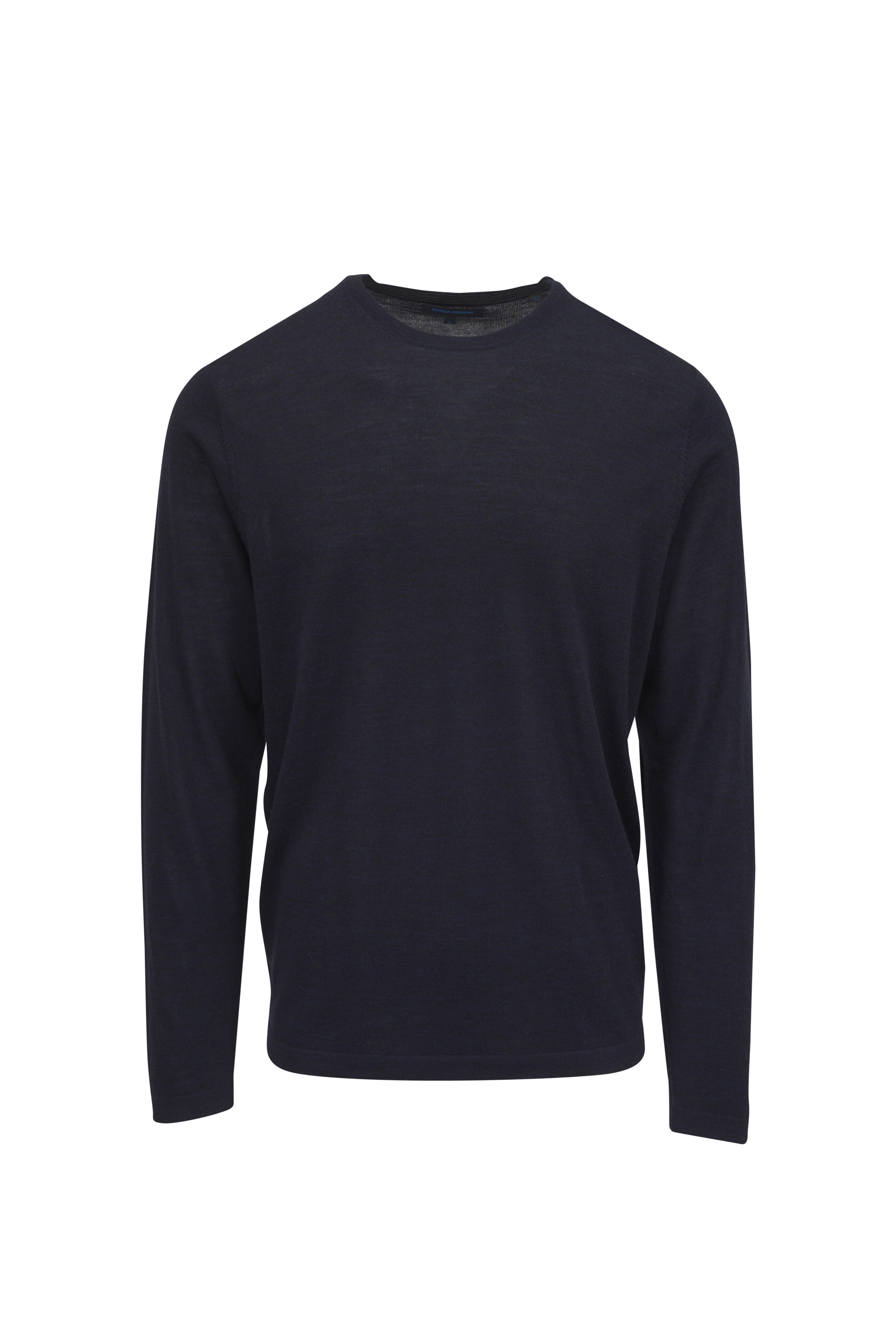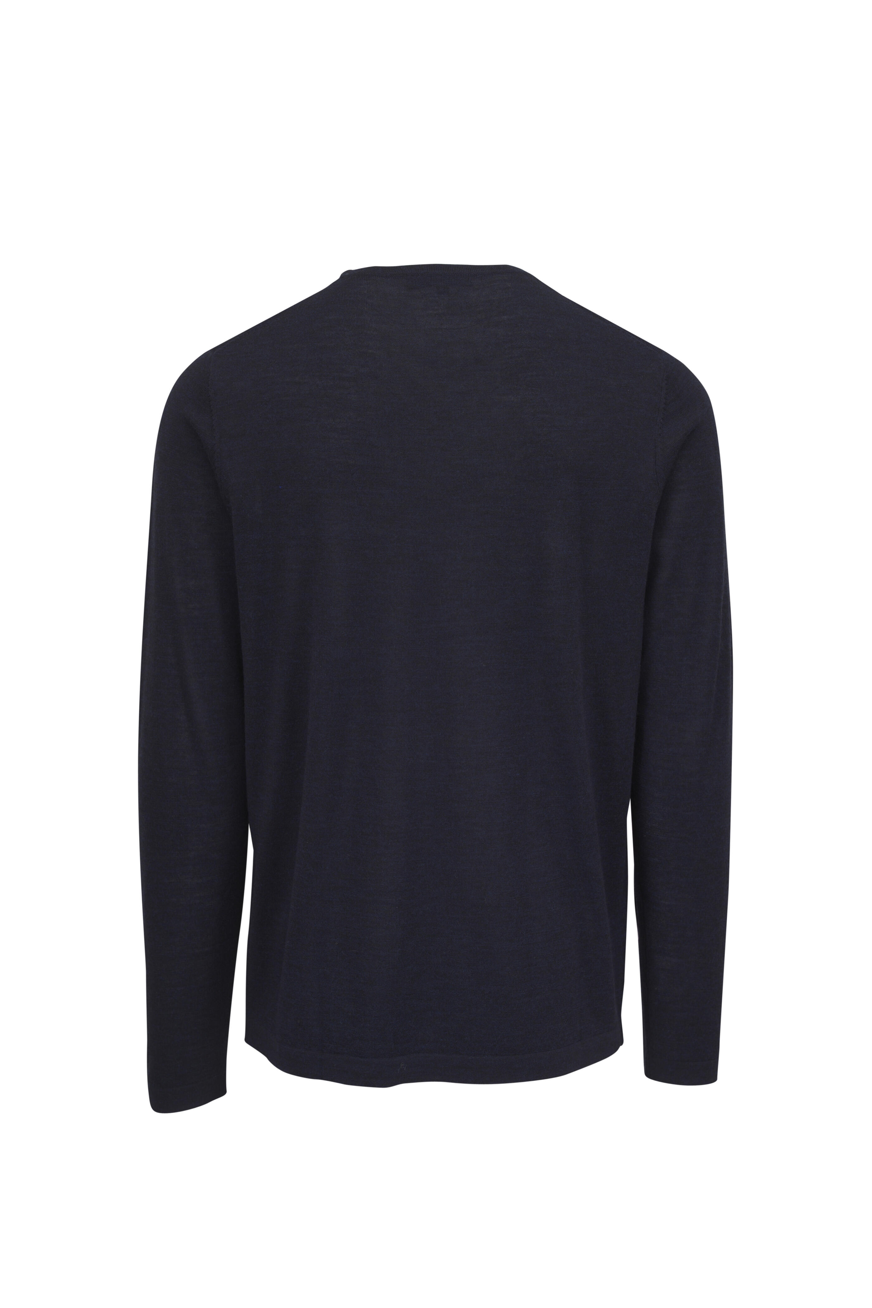 Crew neckline. Imported. 100% extra fine merino wool. Dry clean.