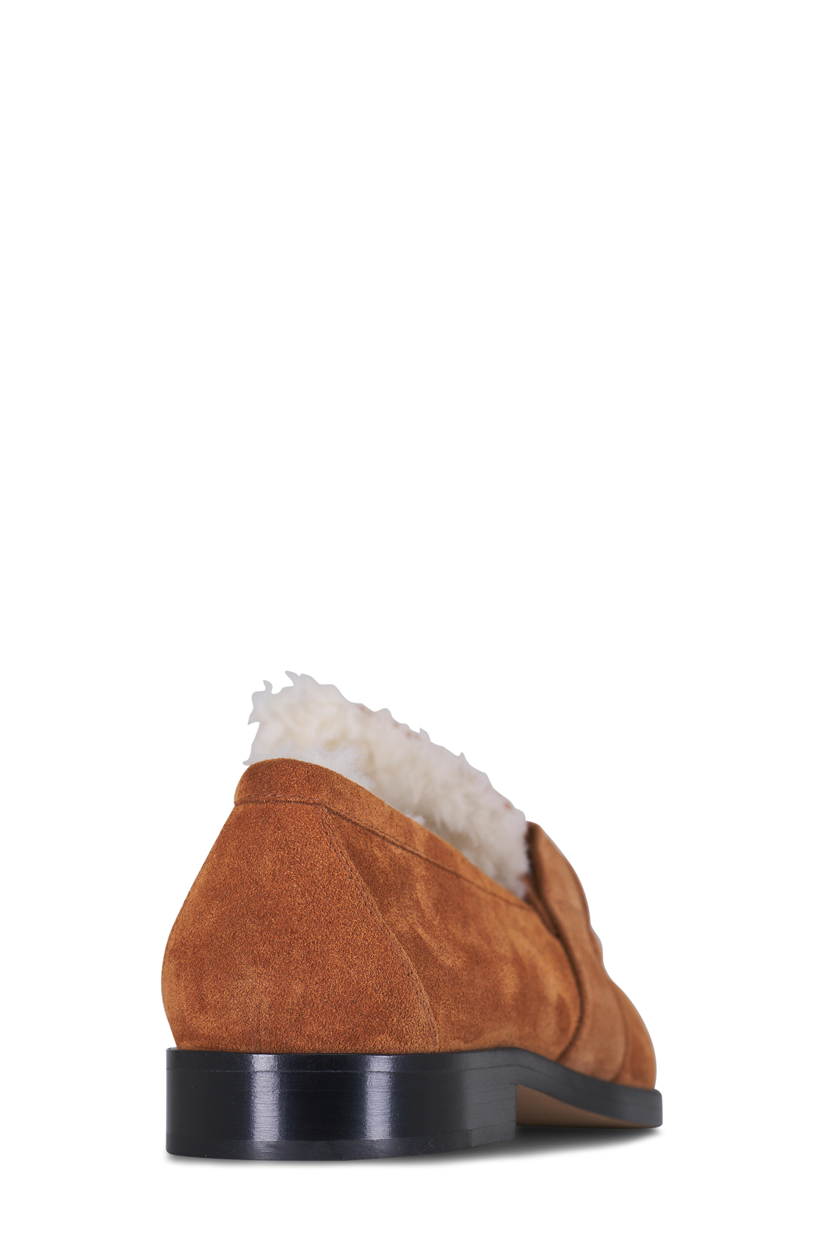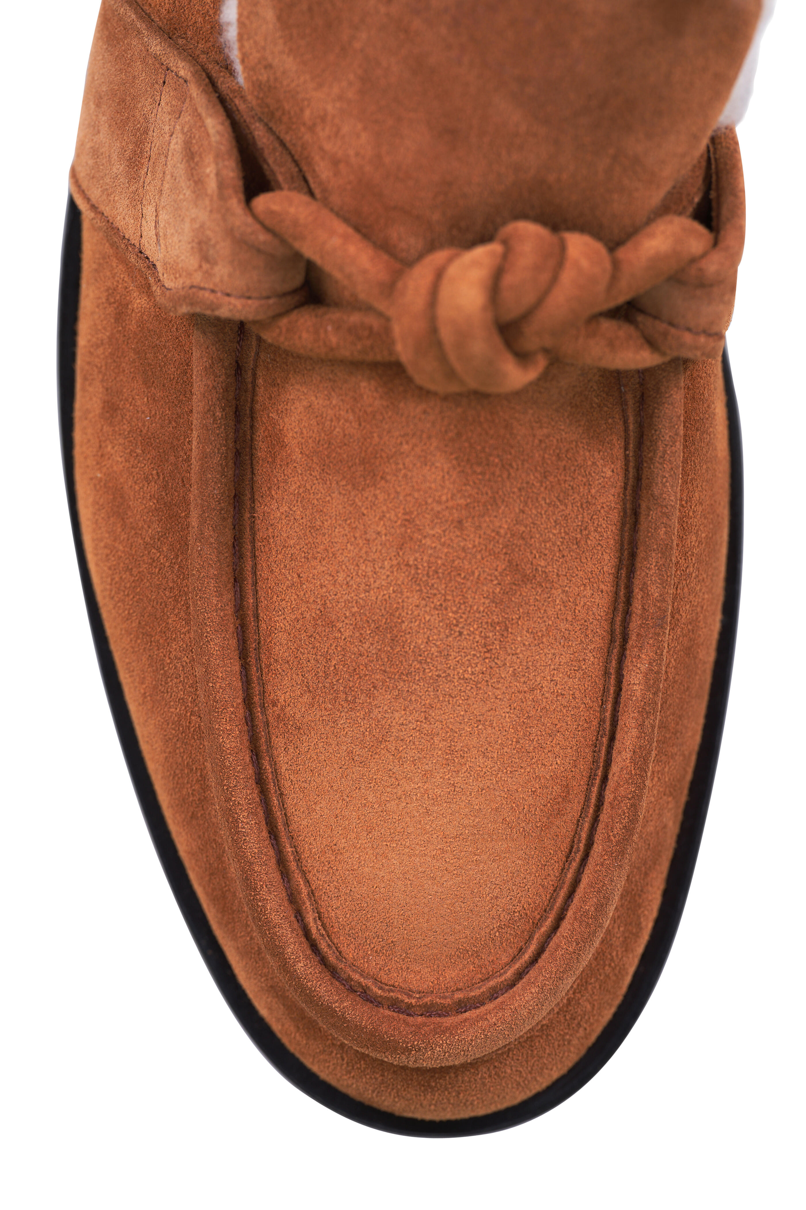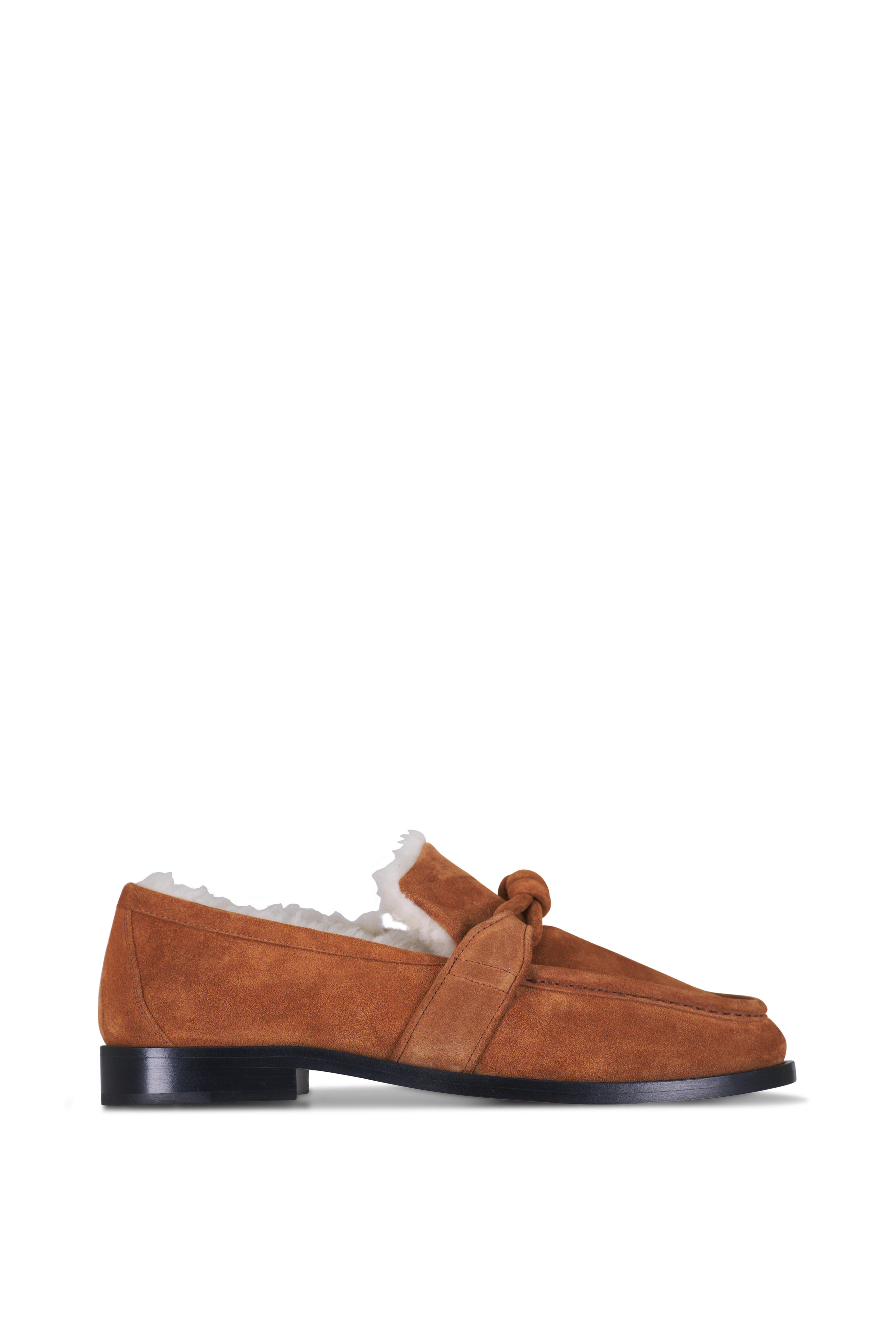 Suede upper. Moc toe. Signature leather knot detail at vamp. Shearling lining and insole. Leather & rubber sole. Made in Italy.