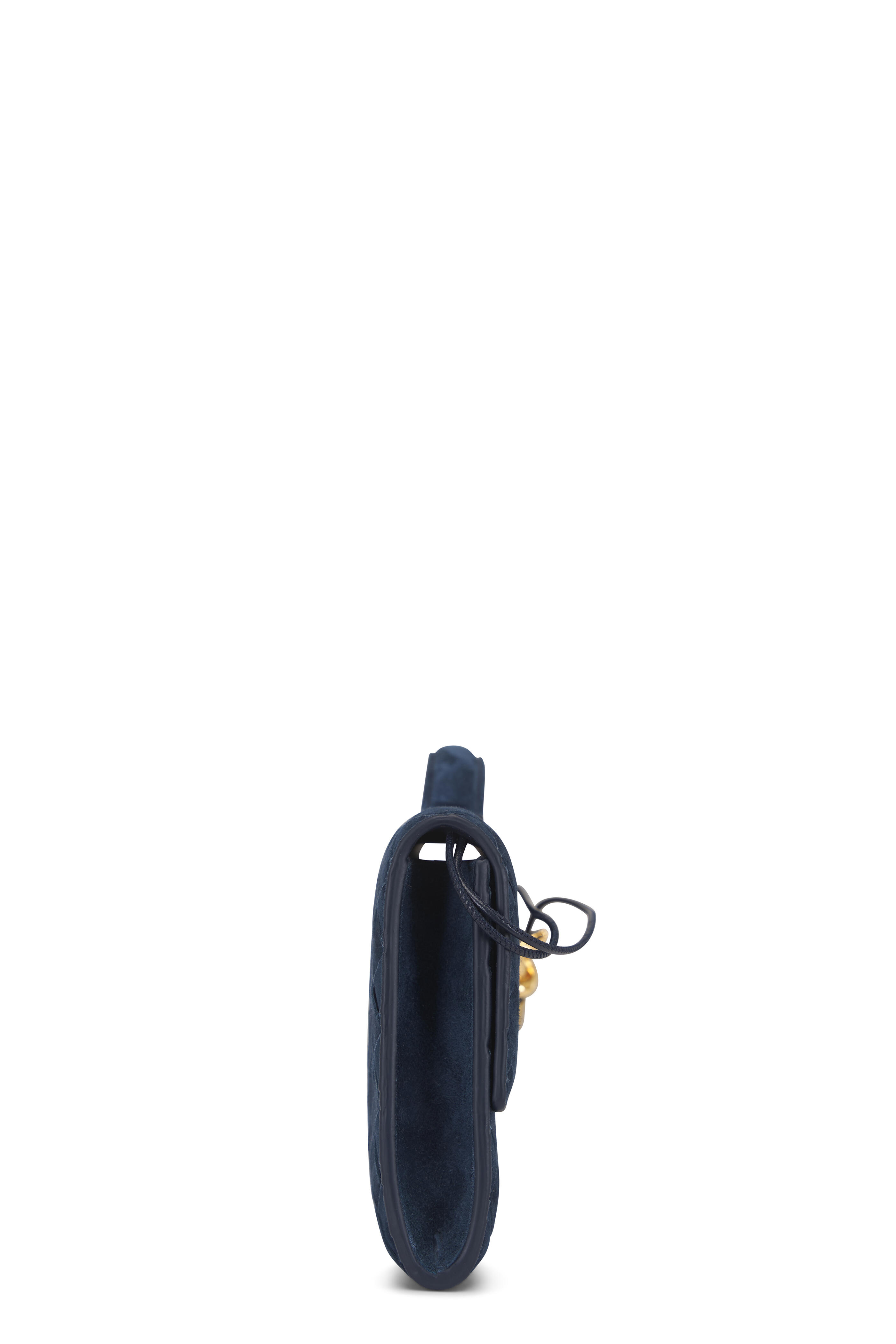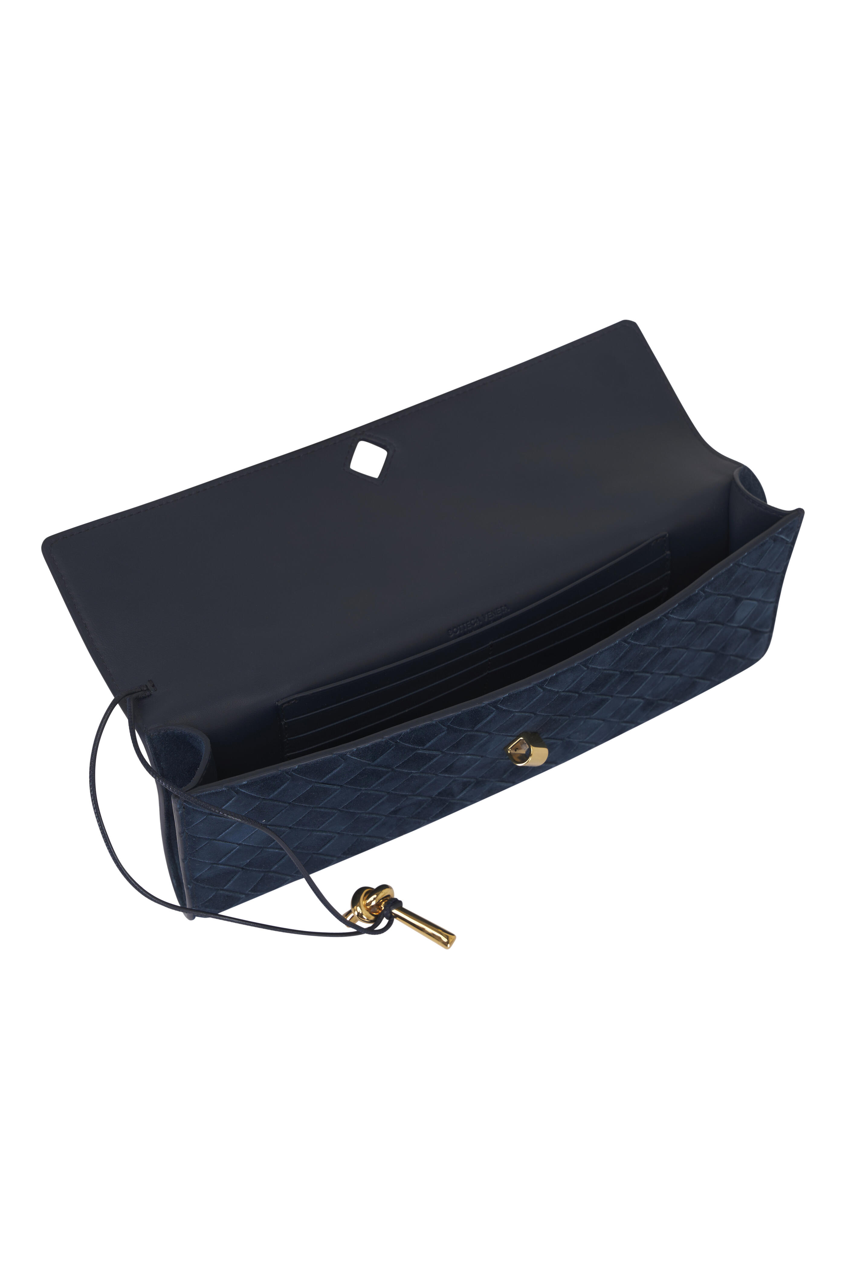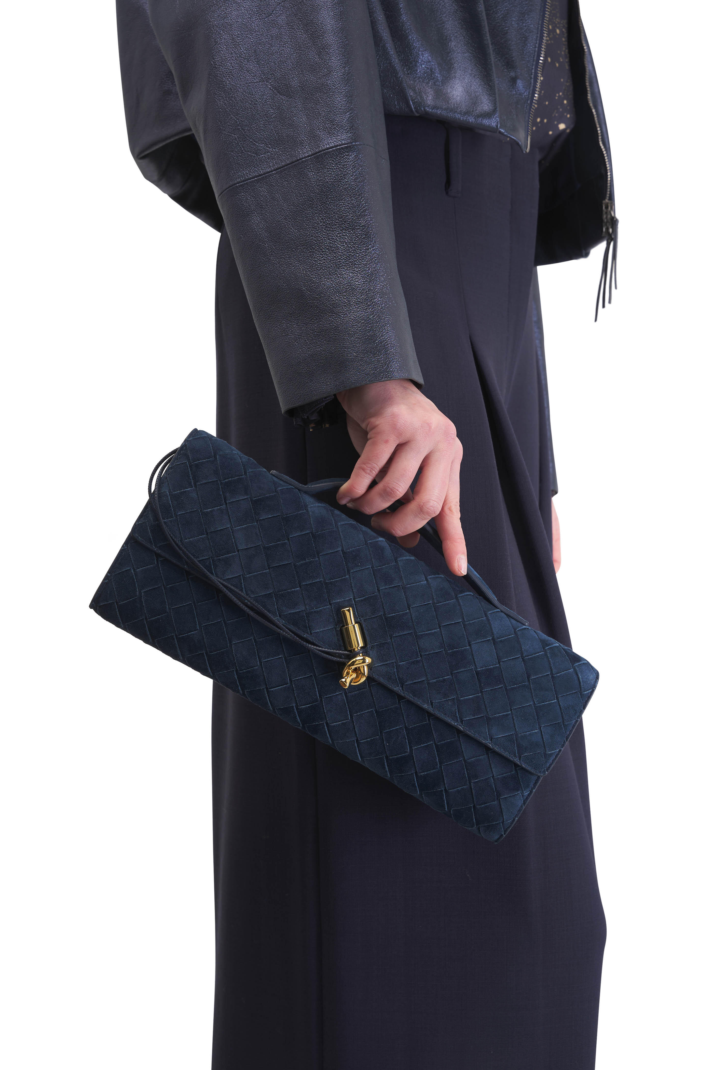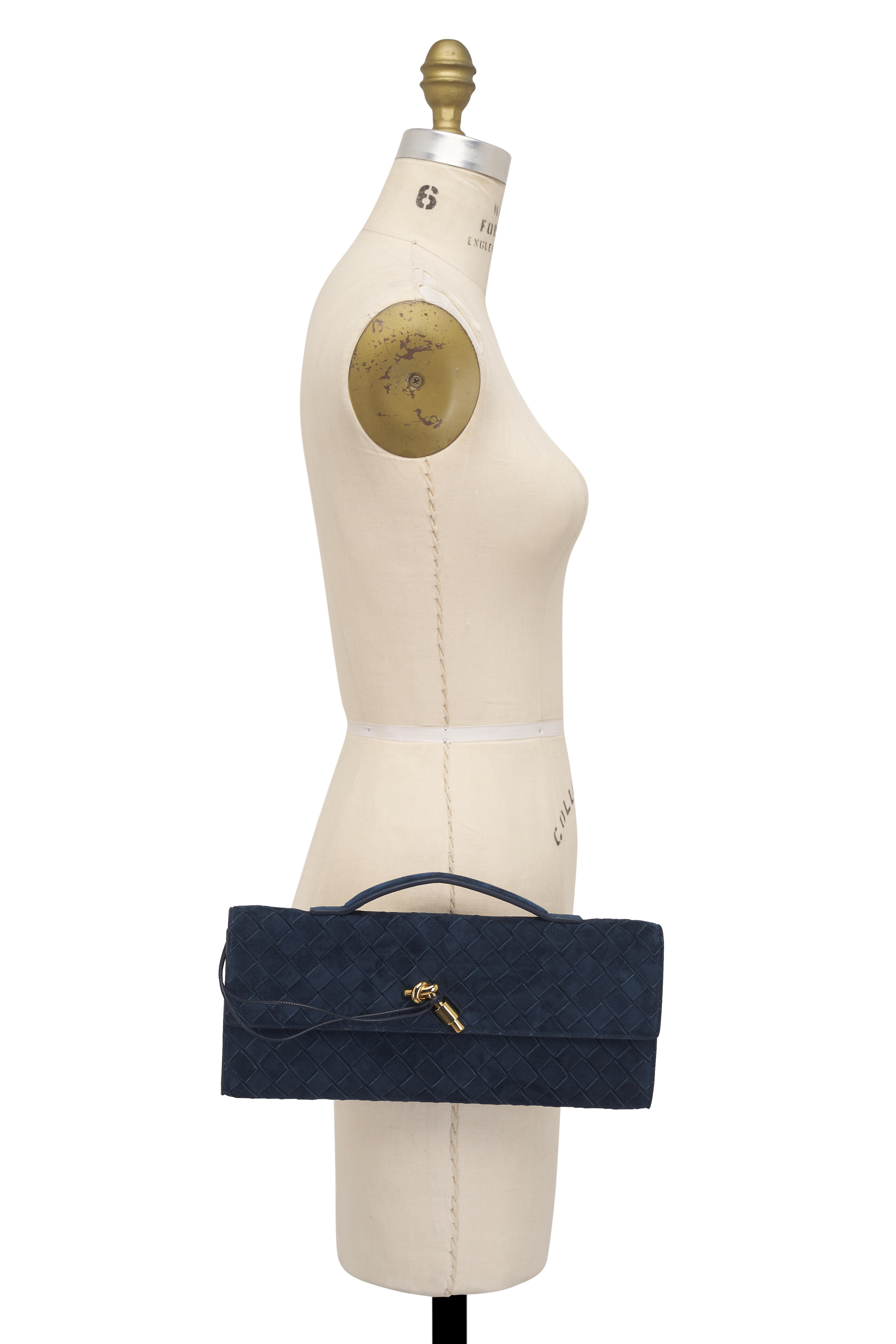 Intrecciato suede. Single top handle. Metallic knot closure. Six interior card slots; one additional pocket. Brass finish hardware. Lambskin leather lining. Made in Italy. Height: 13 cm | 5.1". Width: 31 cm | 12.2". Depth: 3 cm | 1.2”.
