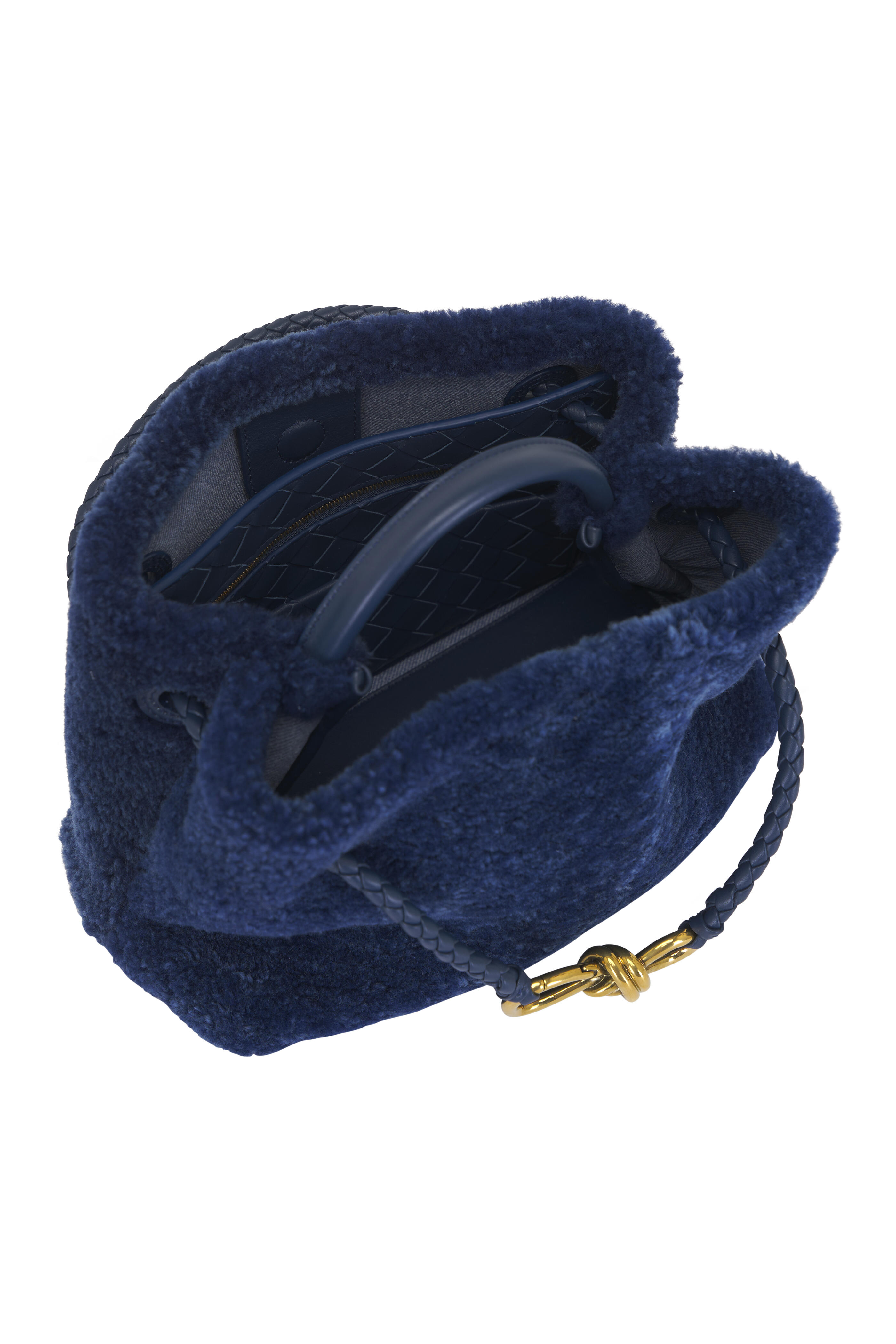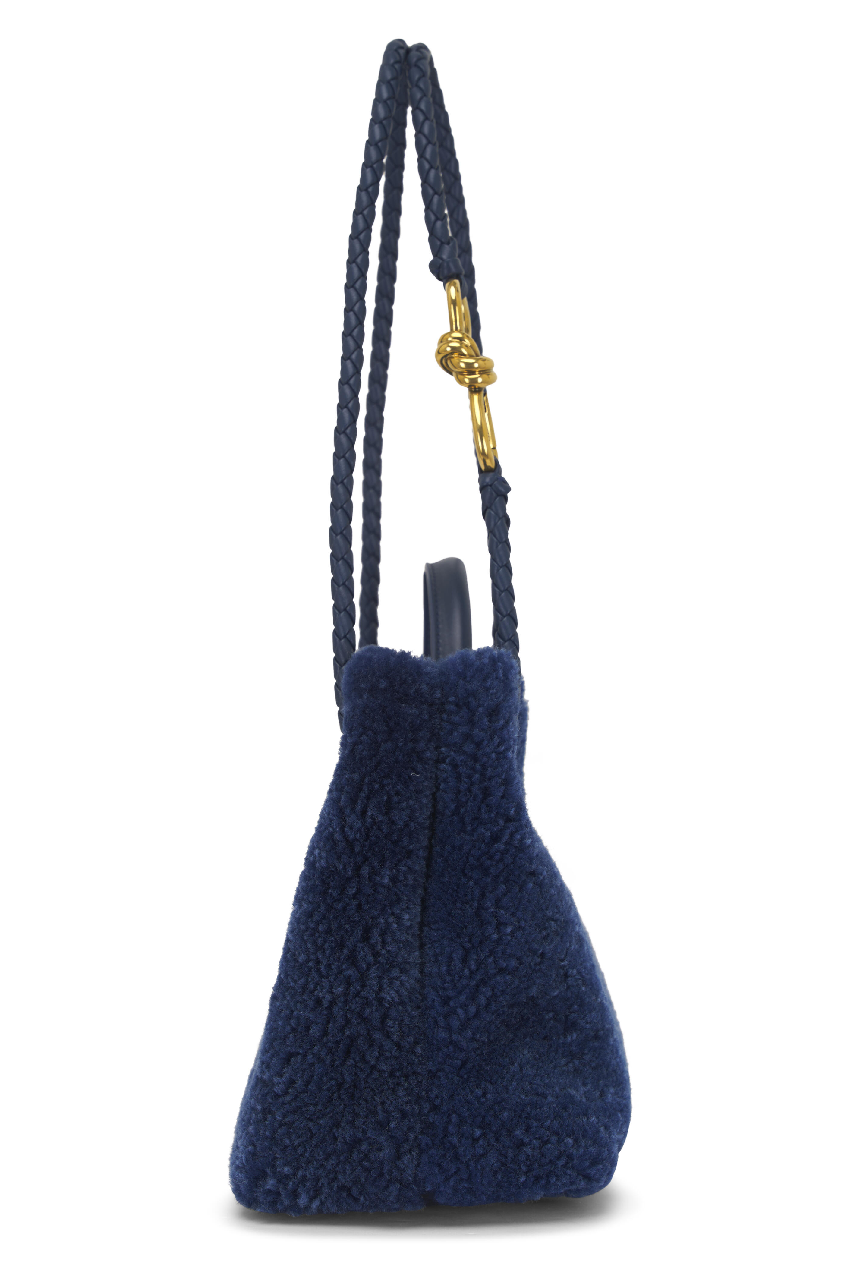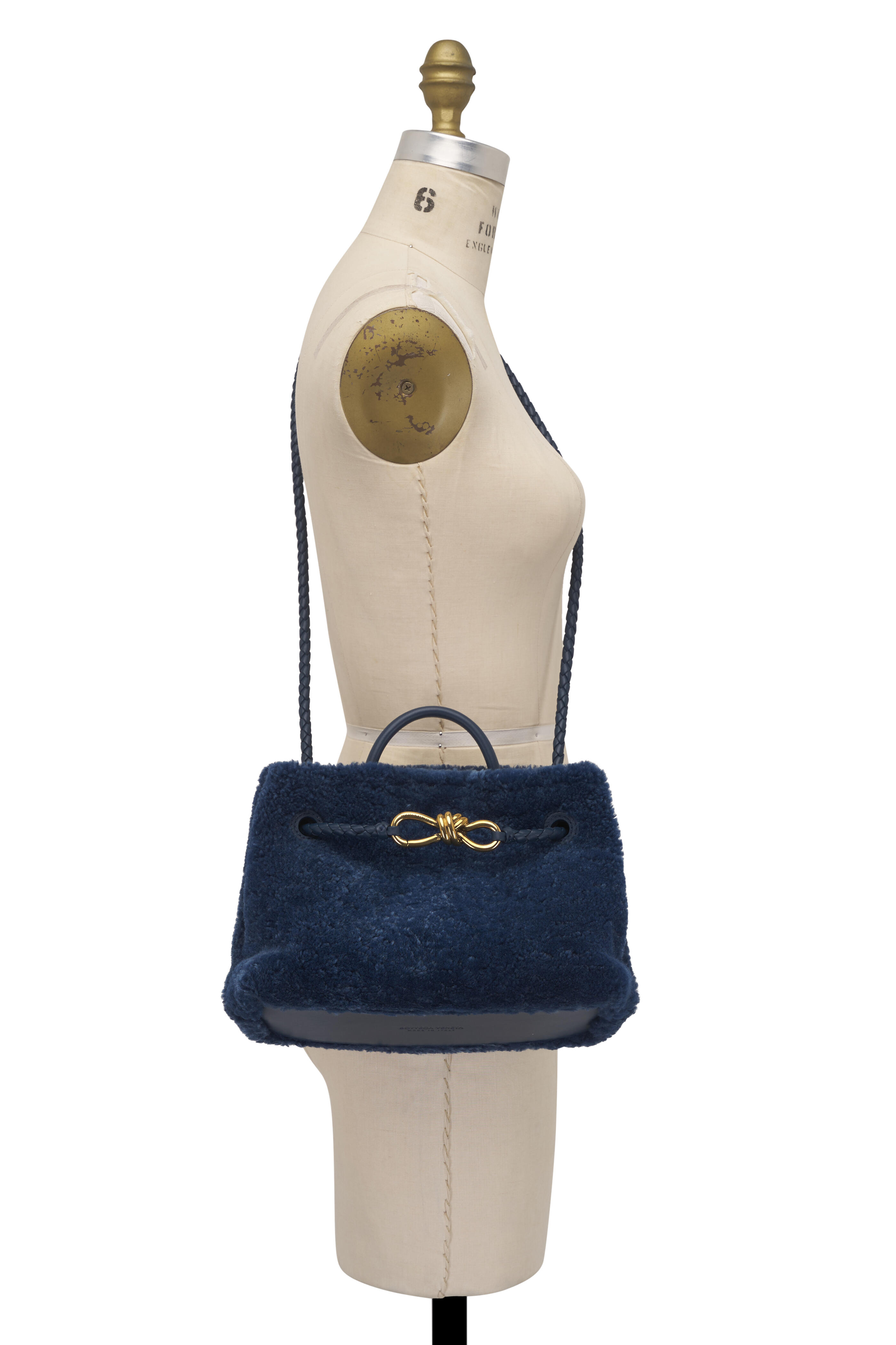 Merino denim effect shearling. Top handle. Magnetic closure. Sliding crossbody strap with signature knot detail. Compartmented interior with one zipped pocket, one open pocket. Suede lining. Brass-tone hardware. Made in Italy. Height: 7.9". Width: 9.8". Depth: 3.9". Handle drop: 2.4". Strap drop: 19.7".