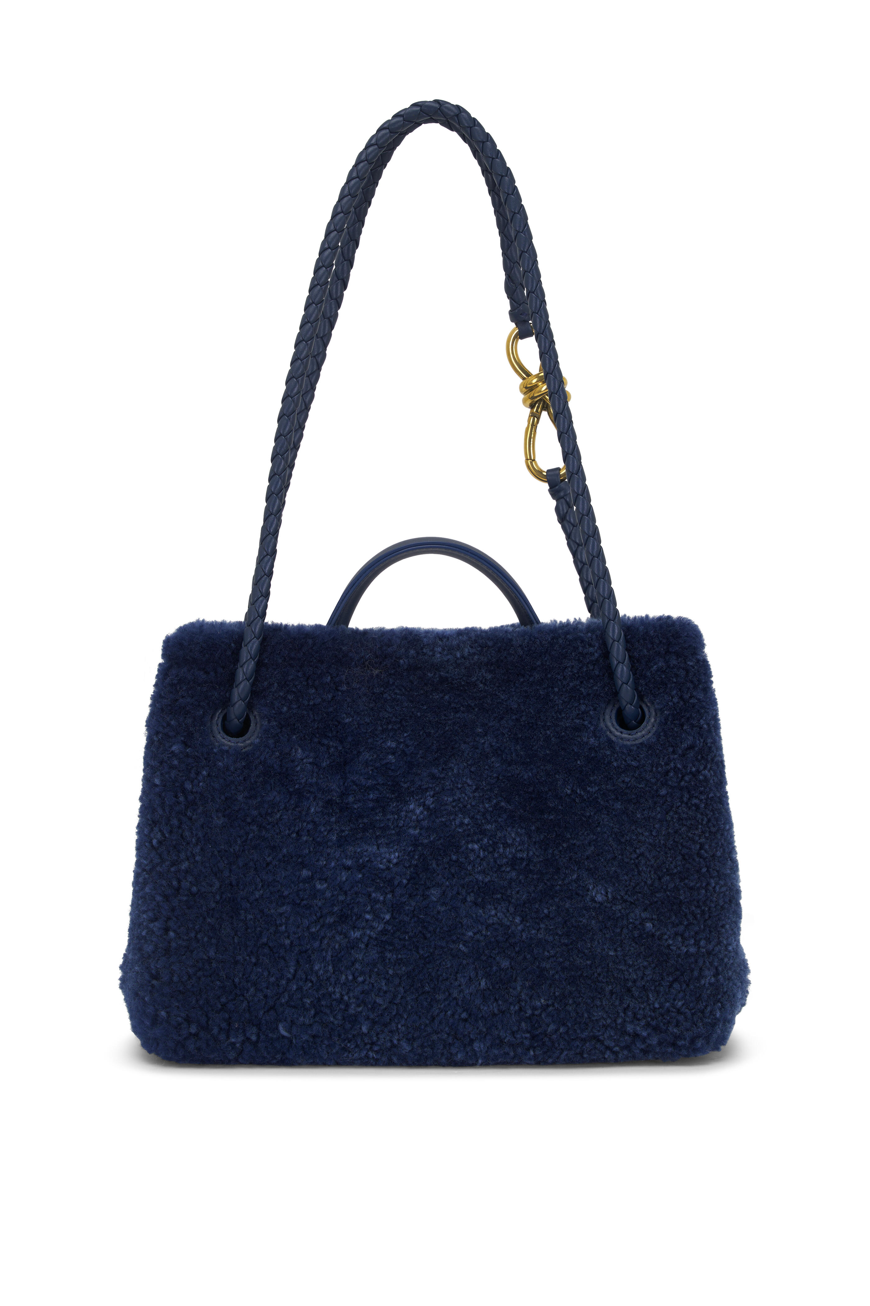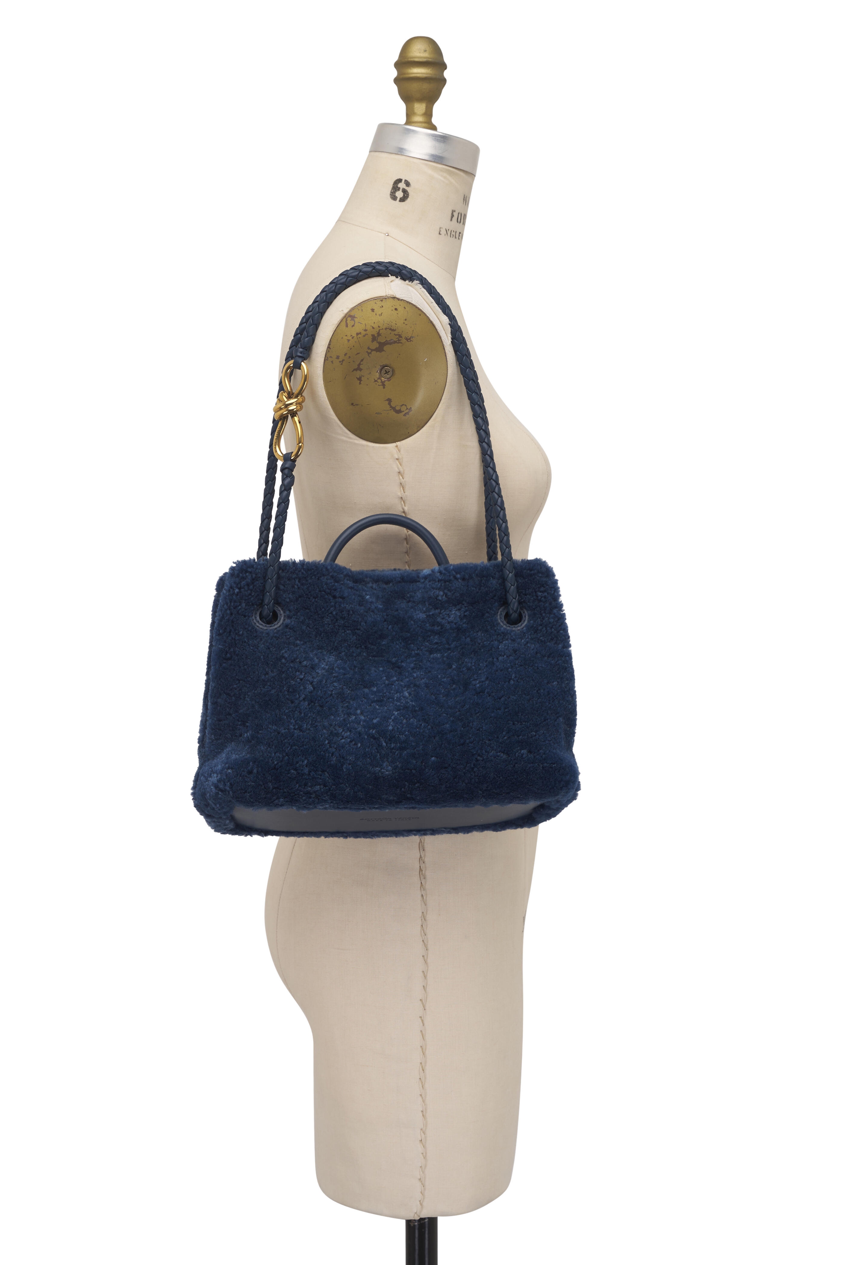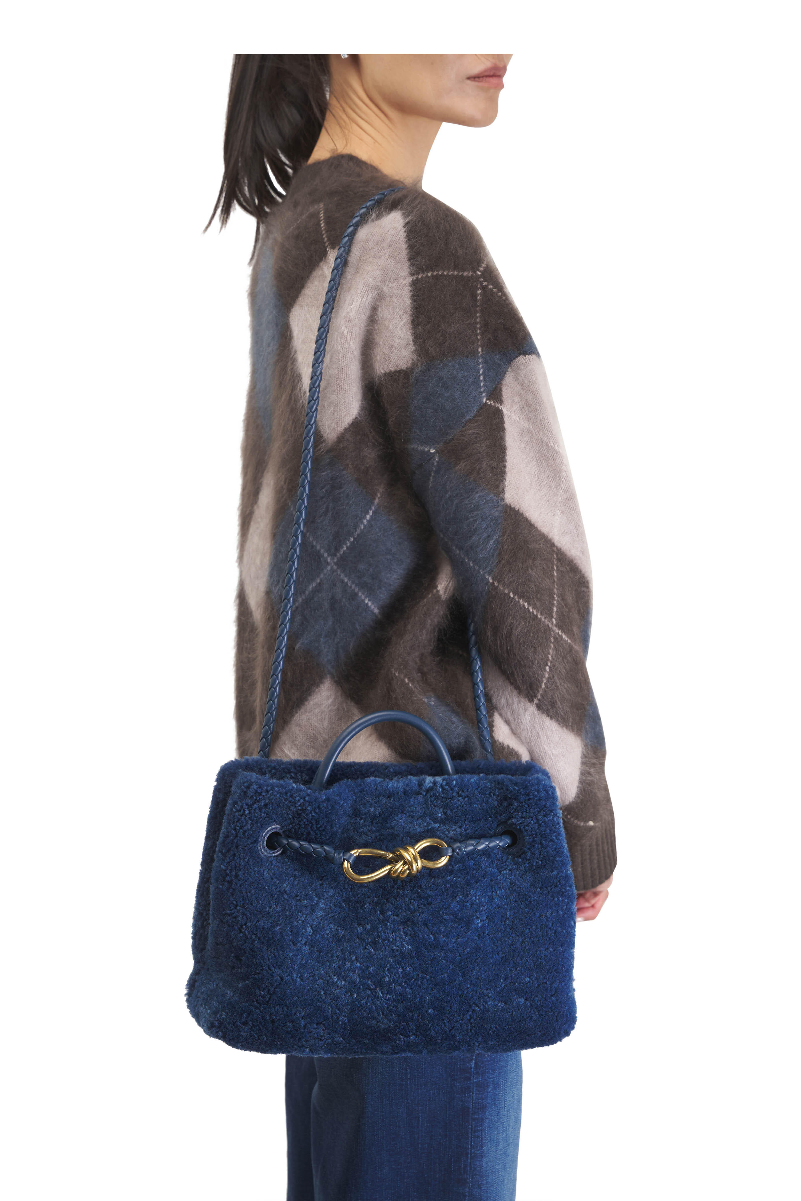 Merino denim effect shearling. Top handle. Magnetic closure. Sliding crossbody strap with signature knot detail. Compartmented interior with one zipped pocket, one open pocket. Suede lining. Brass-tone hardware. Made in Italy. Height: 7.9". Width: 9.8". Depth: 3.9". Handle drop: 2.4". Strap drop: 19.7".
