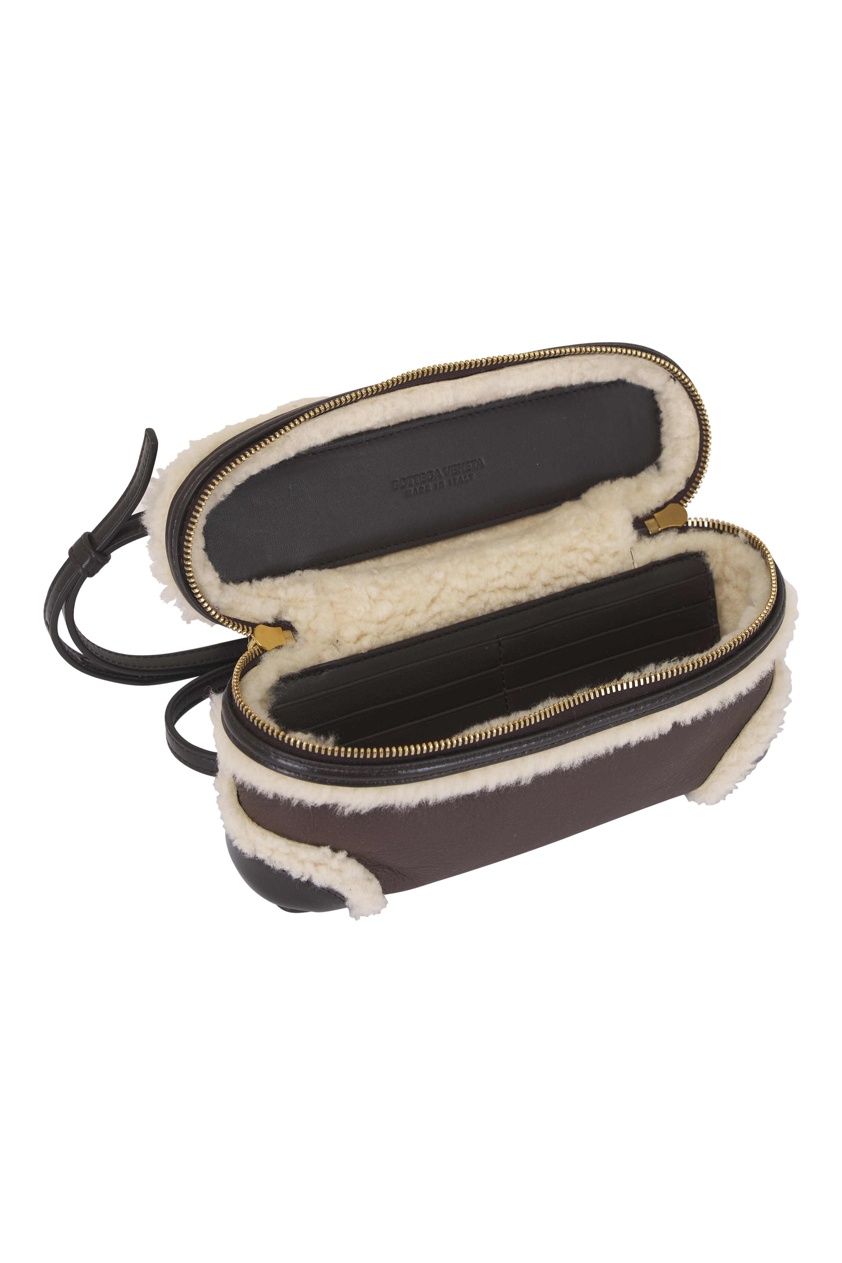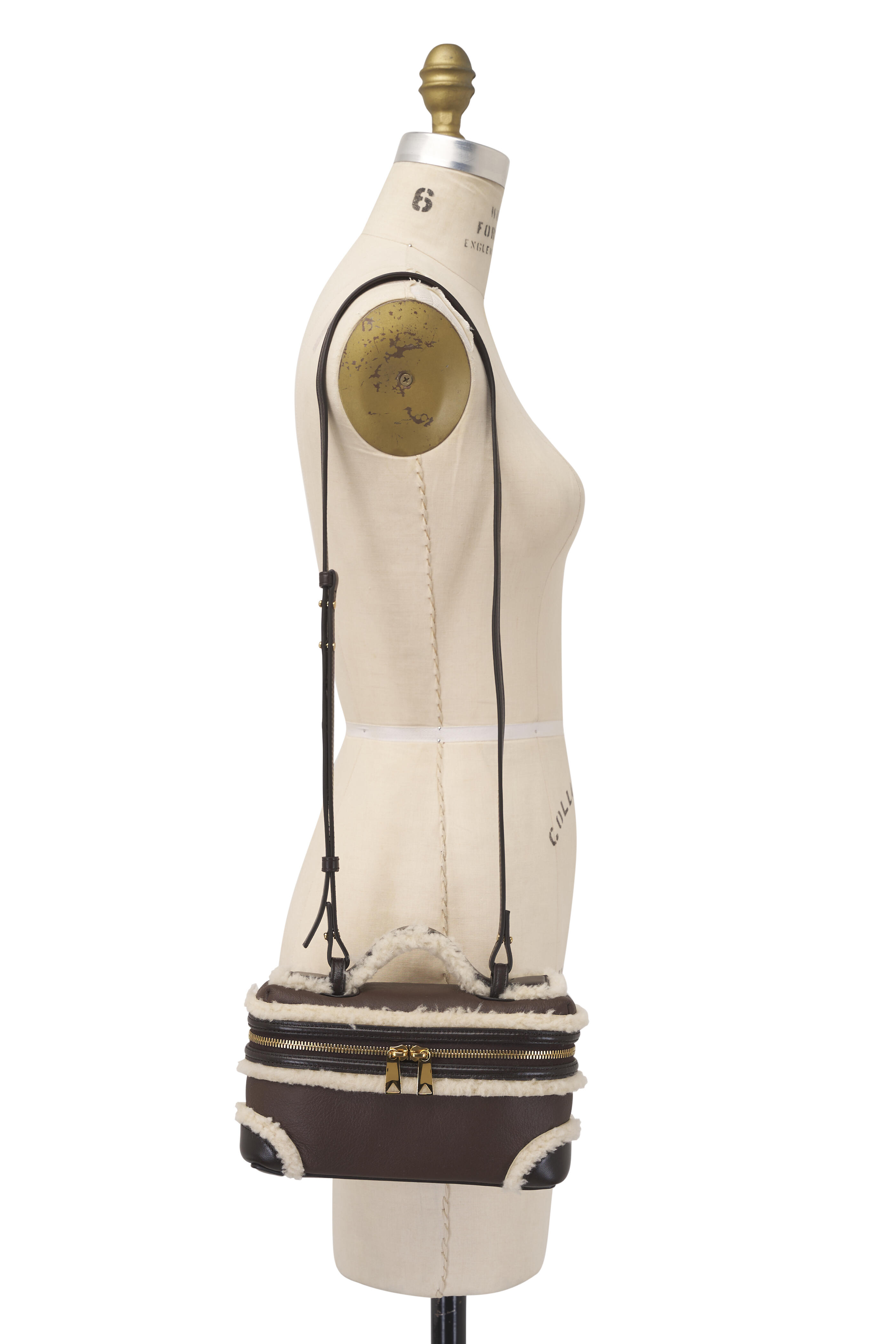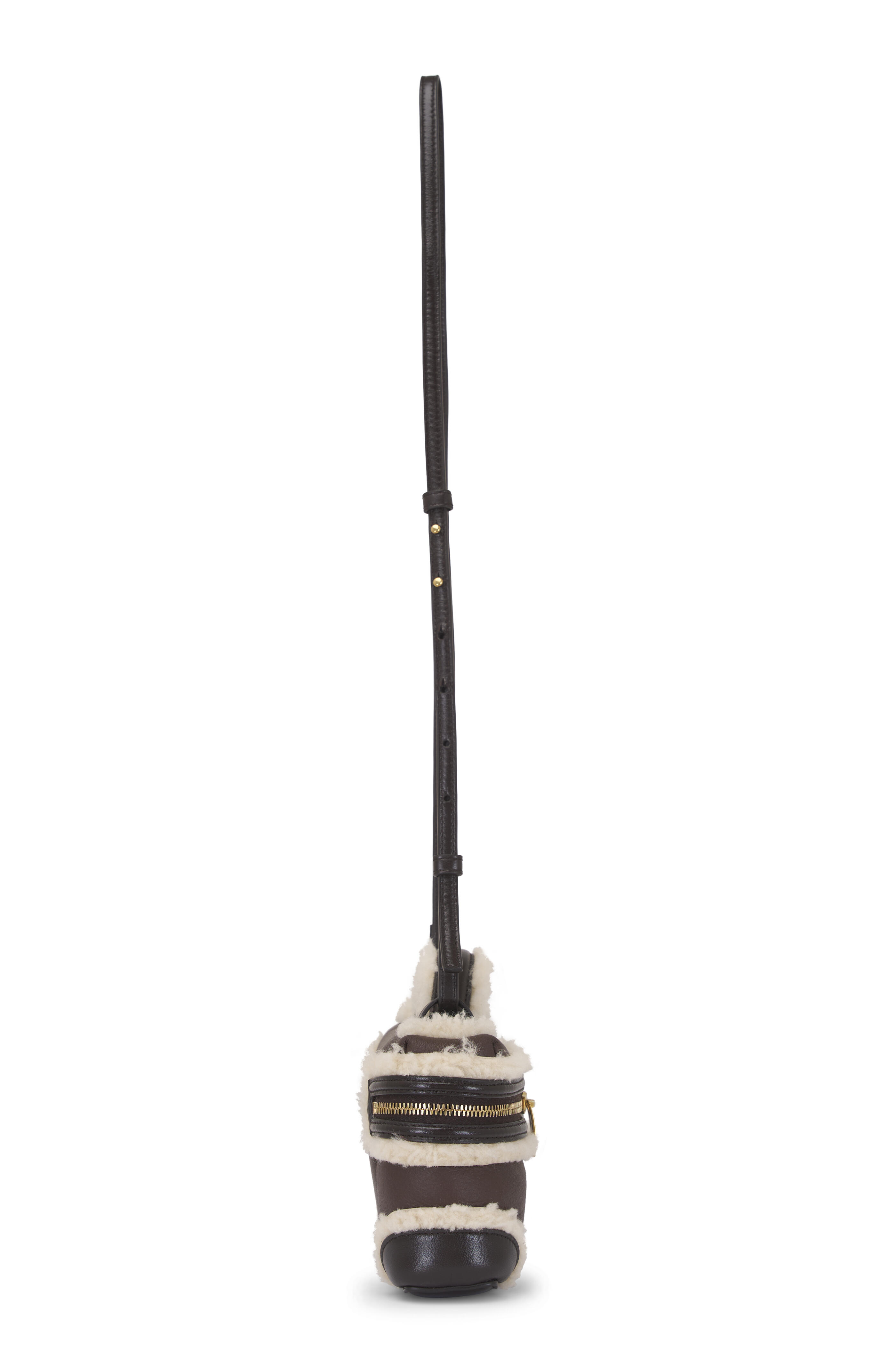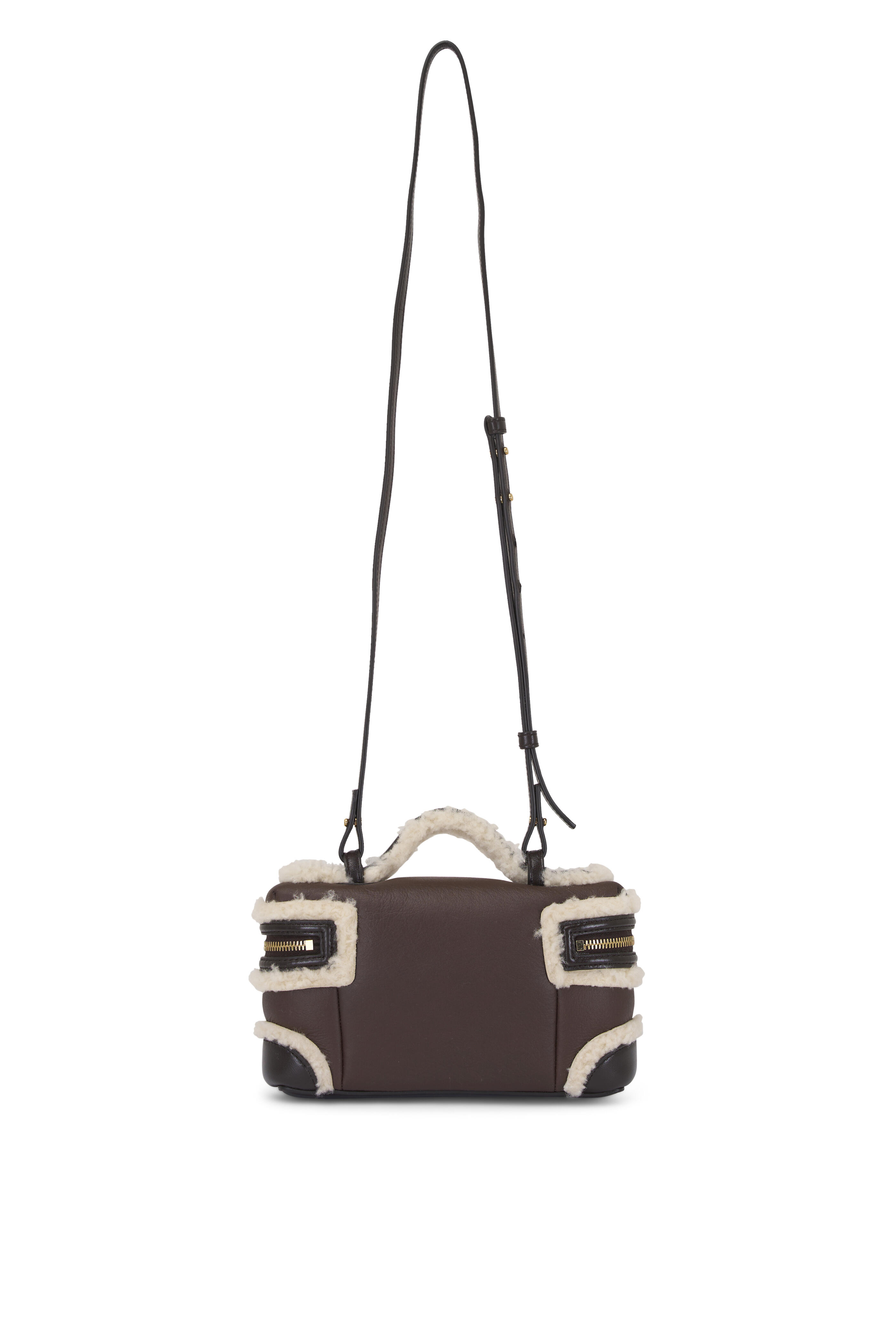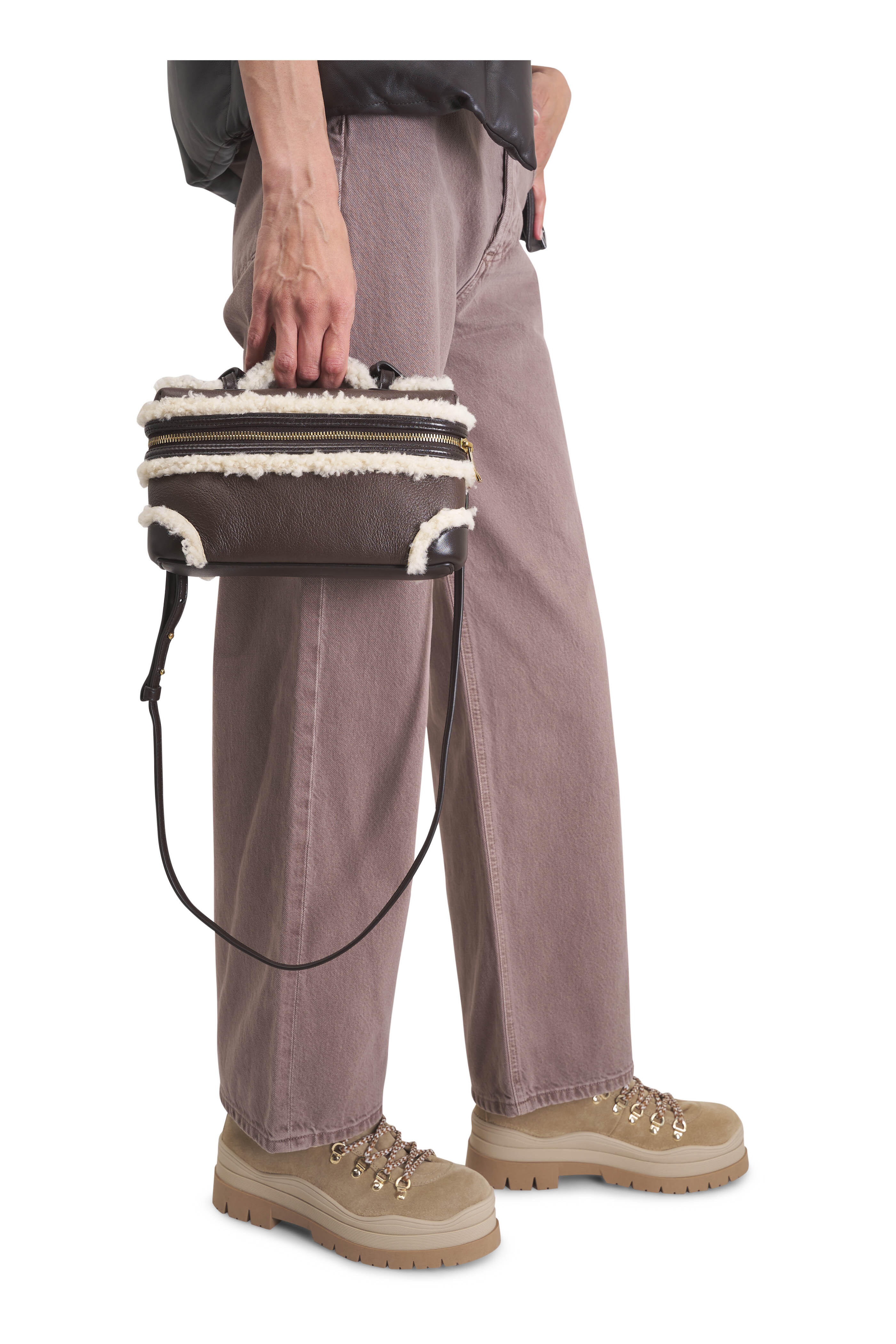 Sheepskin shearling. Top handle. Adjustable and detachable leather strap. Zip closure. One main compartment; six card slots. Unlined. Brass-tone hardware. Made in Italy. Color: Light Brown, Teddy & Fondant. Height: 4.9". Width: 8.7". Depth: 2". Handle drop: 1.8". Strap drop: 17.7".