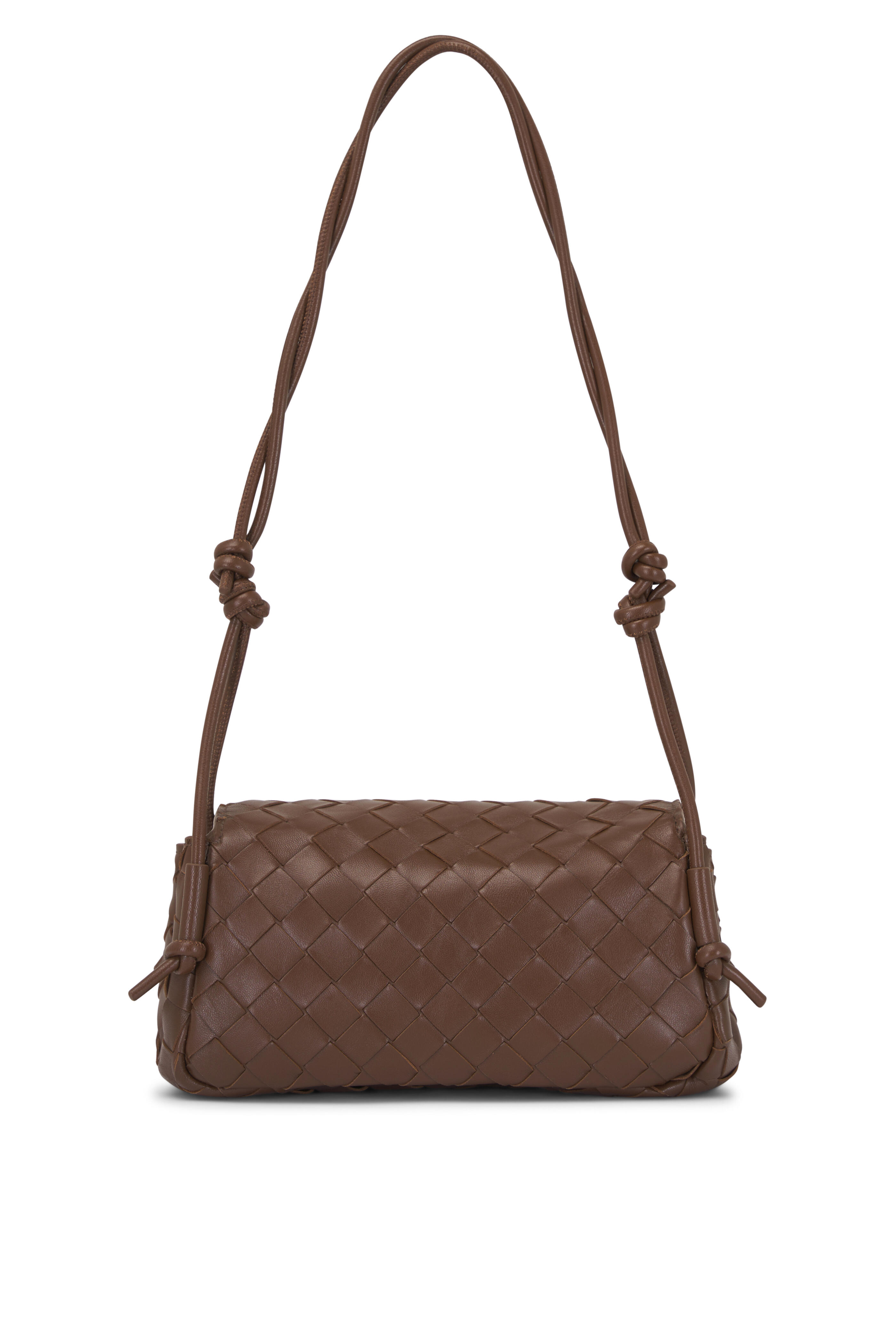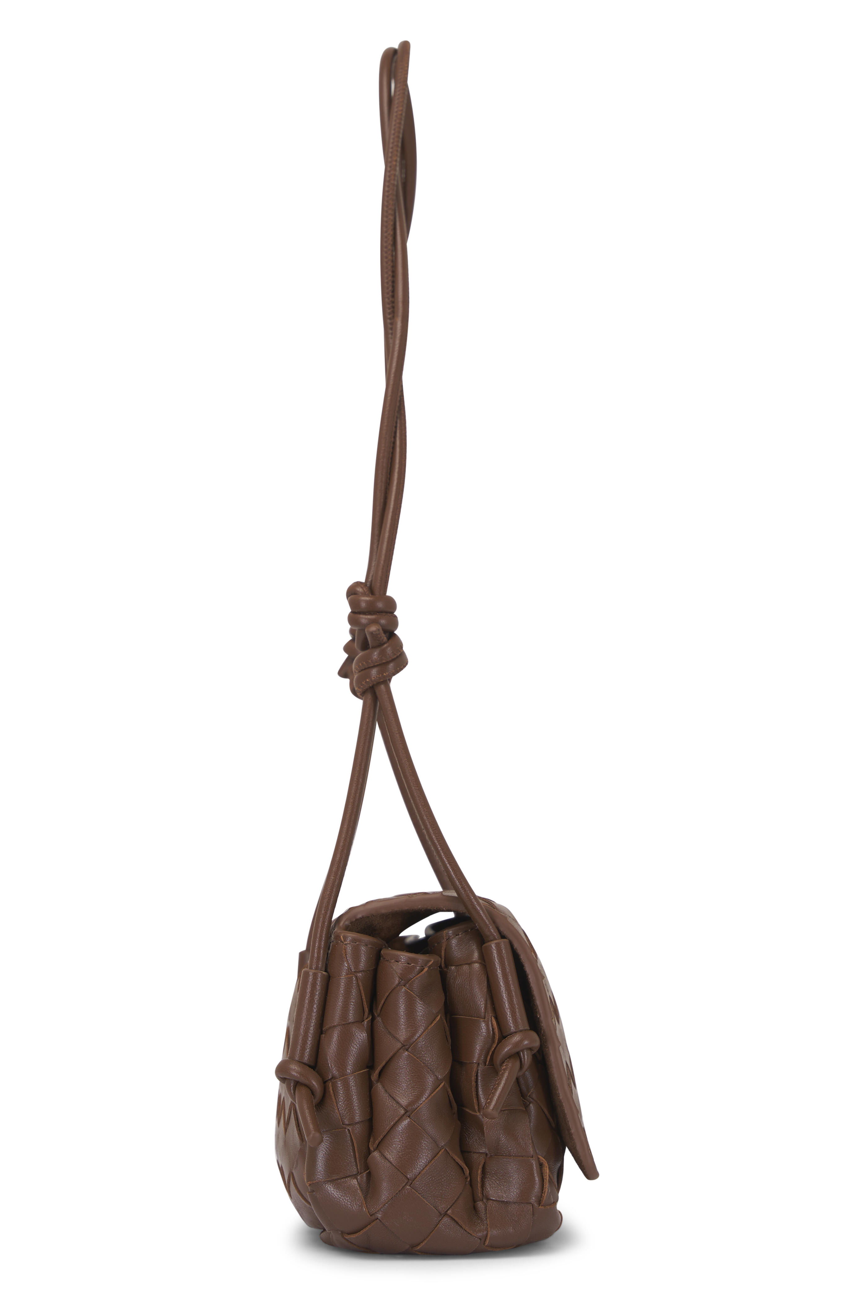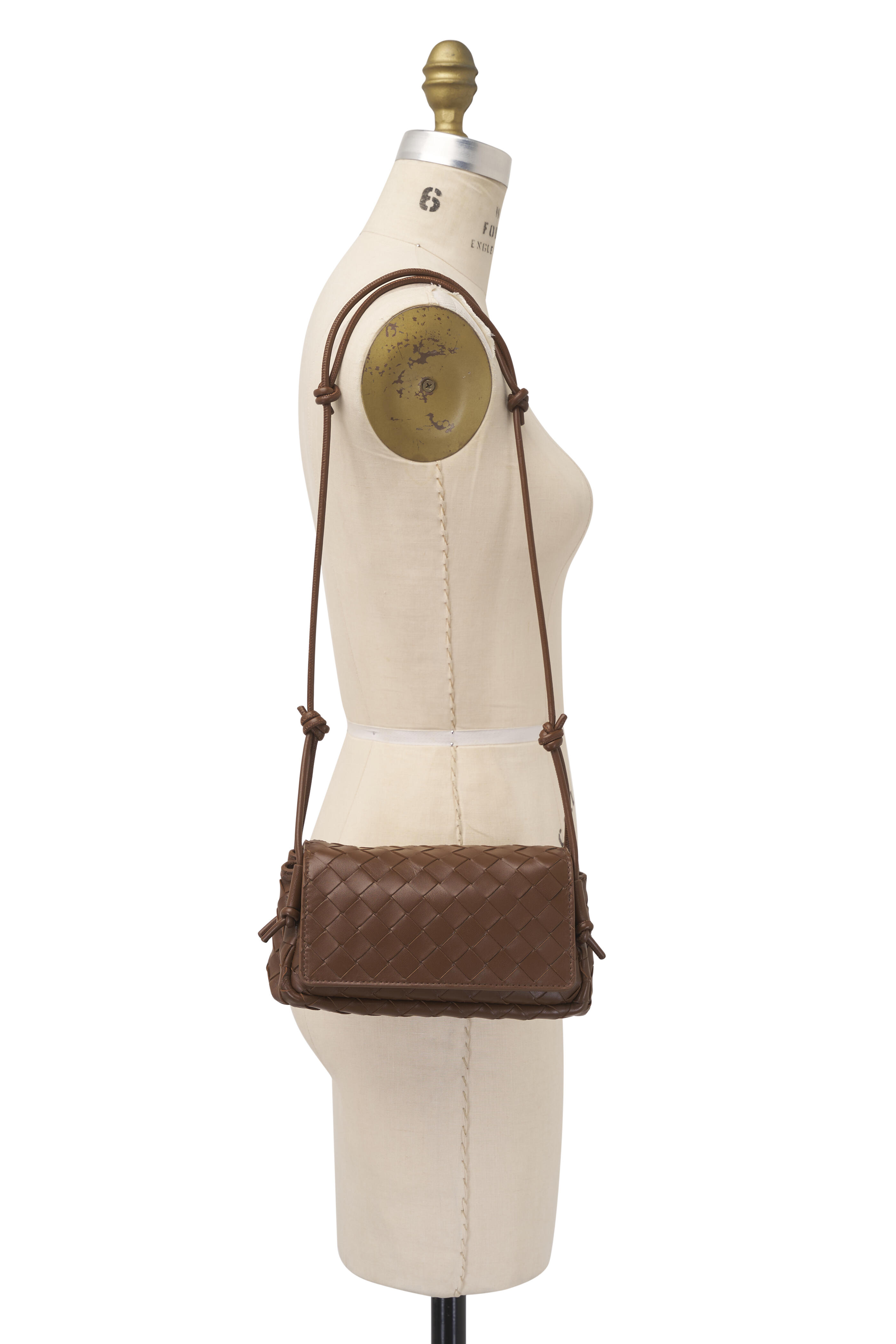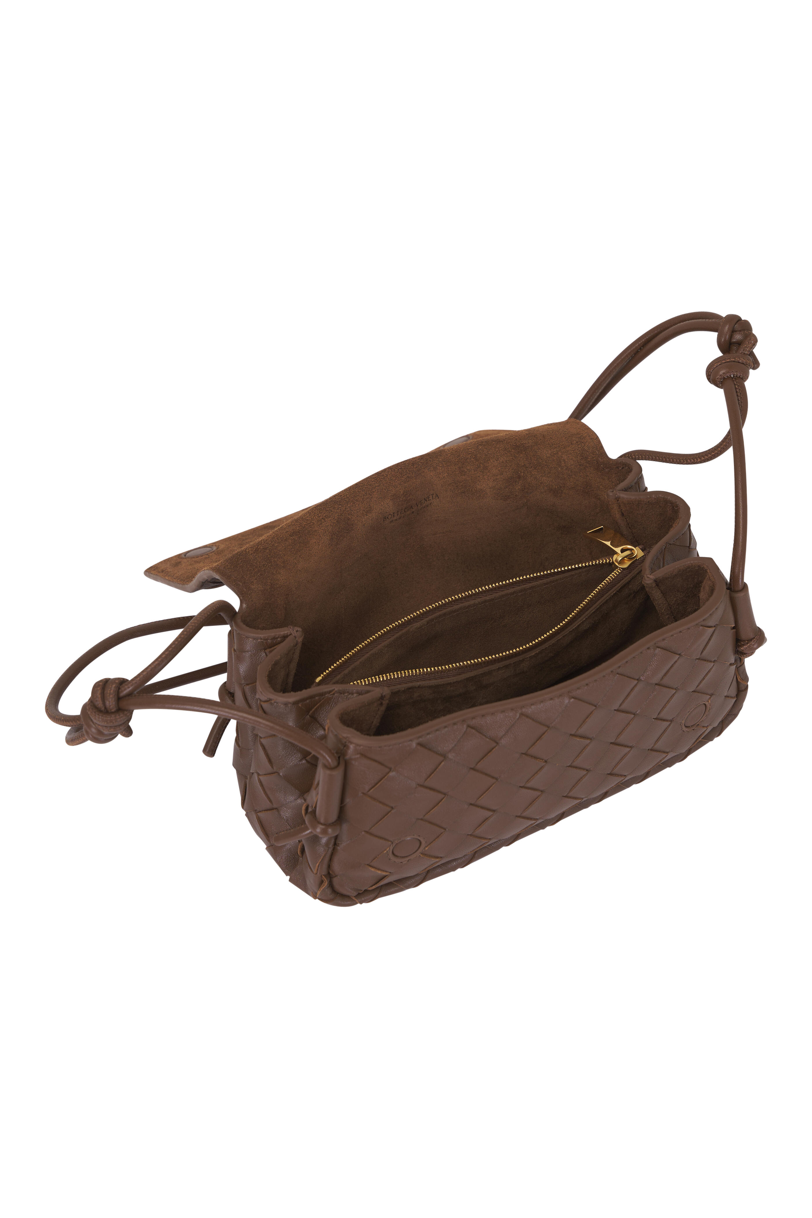 Nappa lambskin leather. Flap with magnetic closure. Adjustable leather tubular strap with sliding knots. Two main compartments. One interior zipper pocket. Suede lining. Gold-tone hardware. Made in Italy. Length: 8.5". Height: 4.3". Depth: 3".