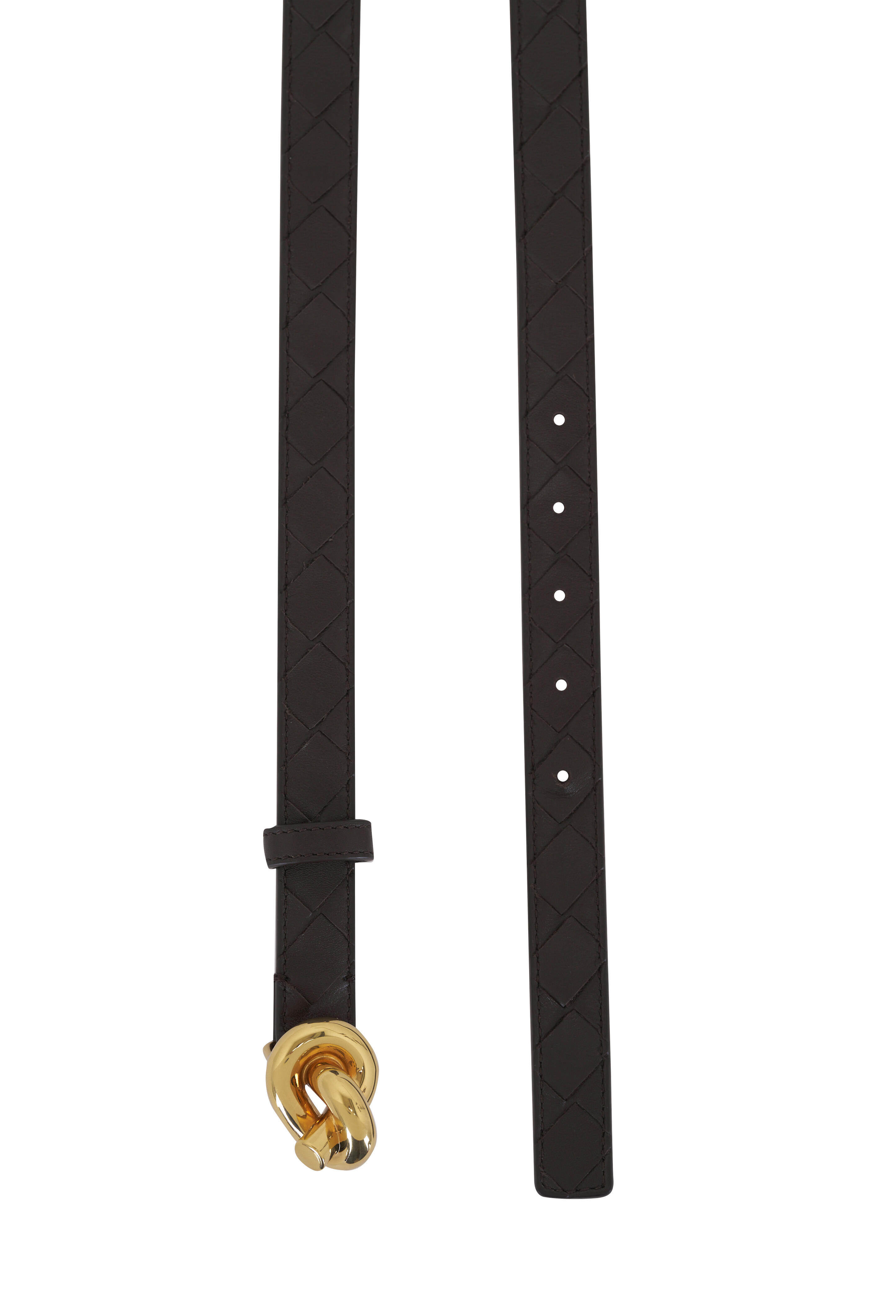 Intrecciato leather. Brass knot closure. Square tip. Single loop keeper. Made in Italy. Width: 2cm.