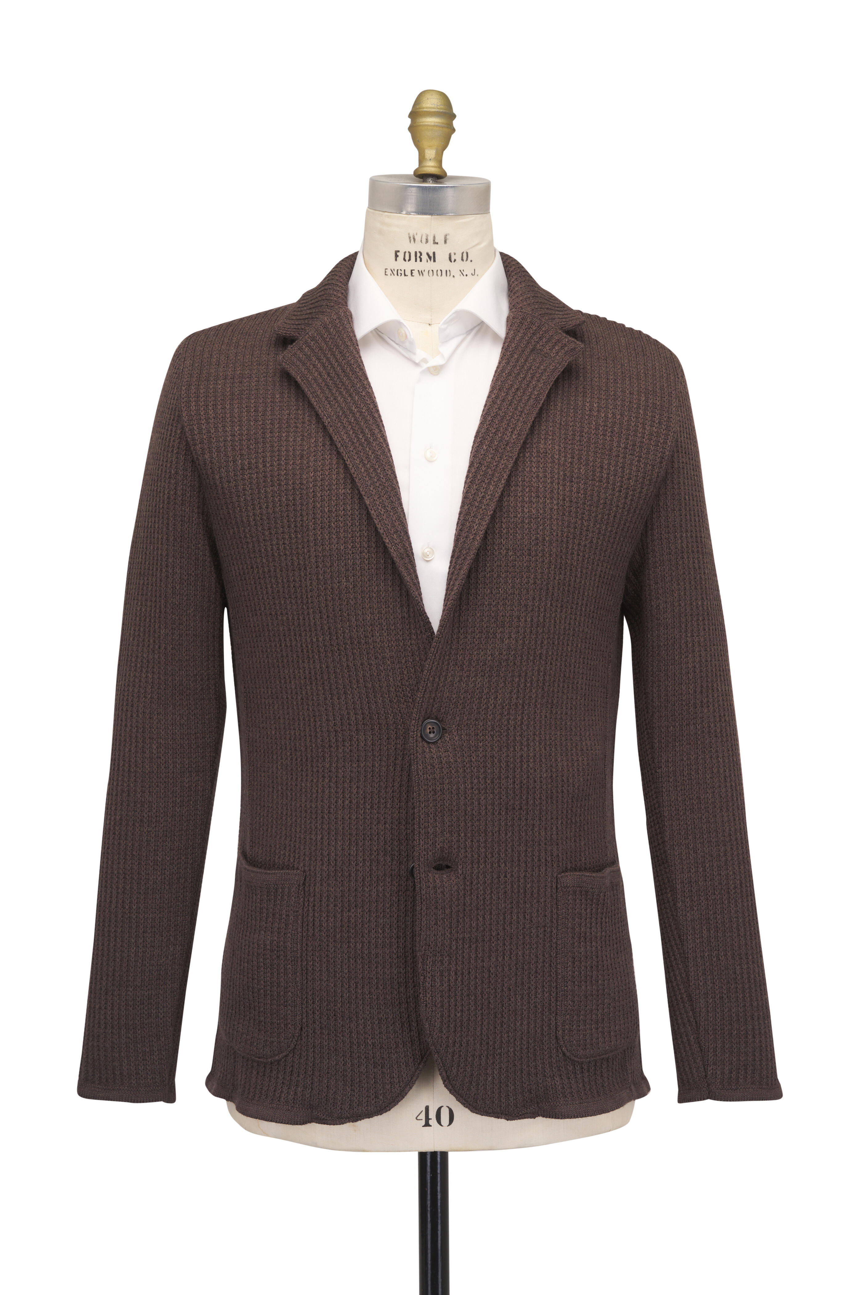 Notched collar. Two button placket. Ribbed trims. Lower patch pockets. Straight hem. Made in Italy. Shoulder to hem 32" (size L). 100% Extra fine wool. Hand wash.