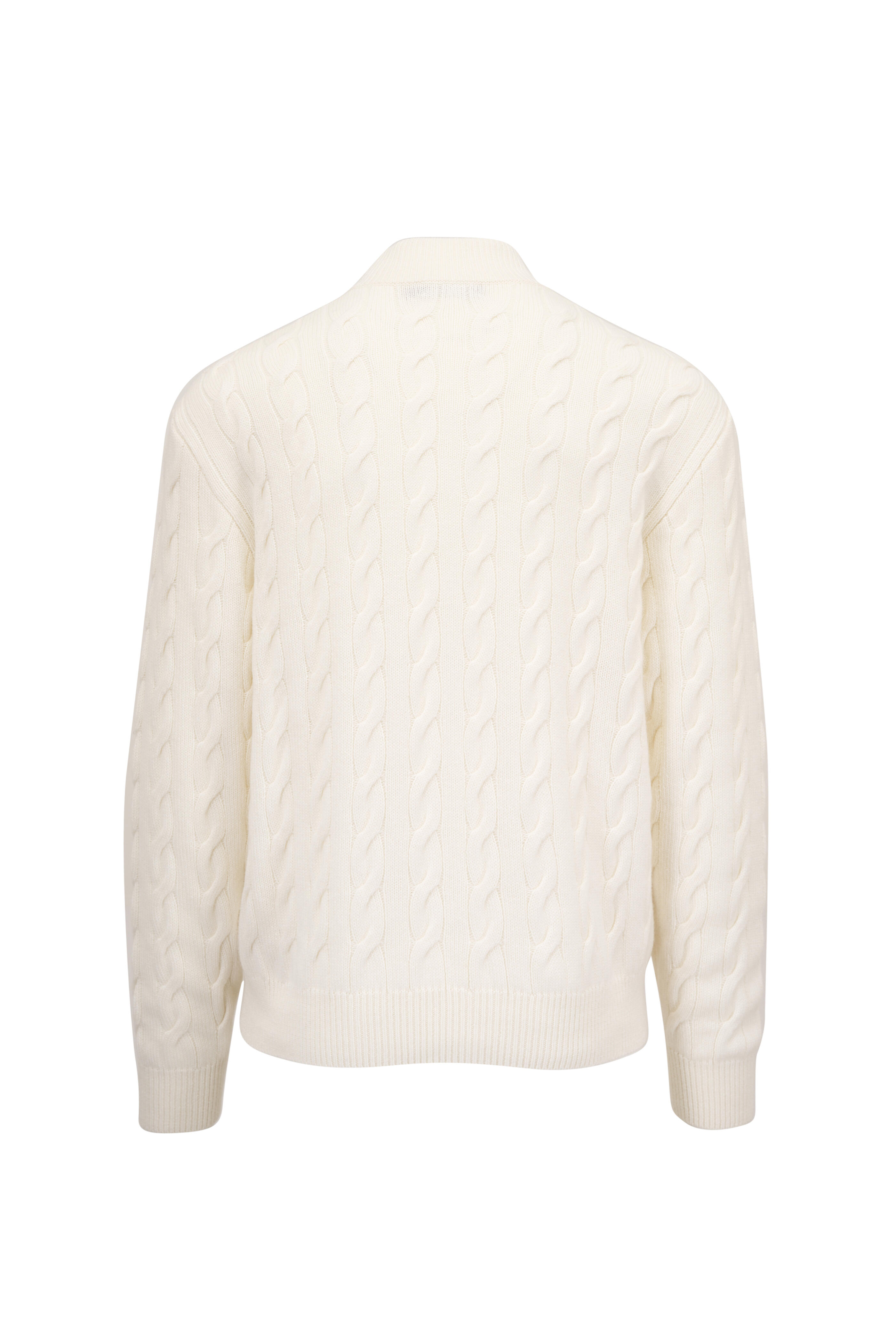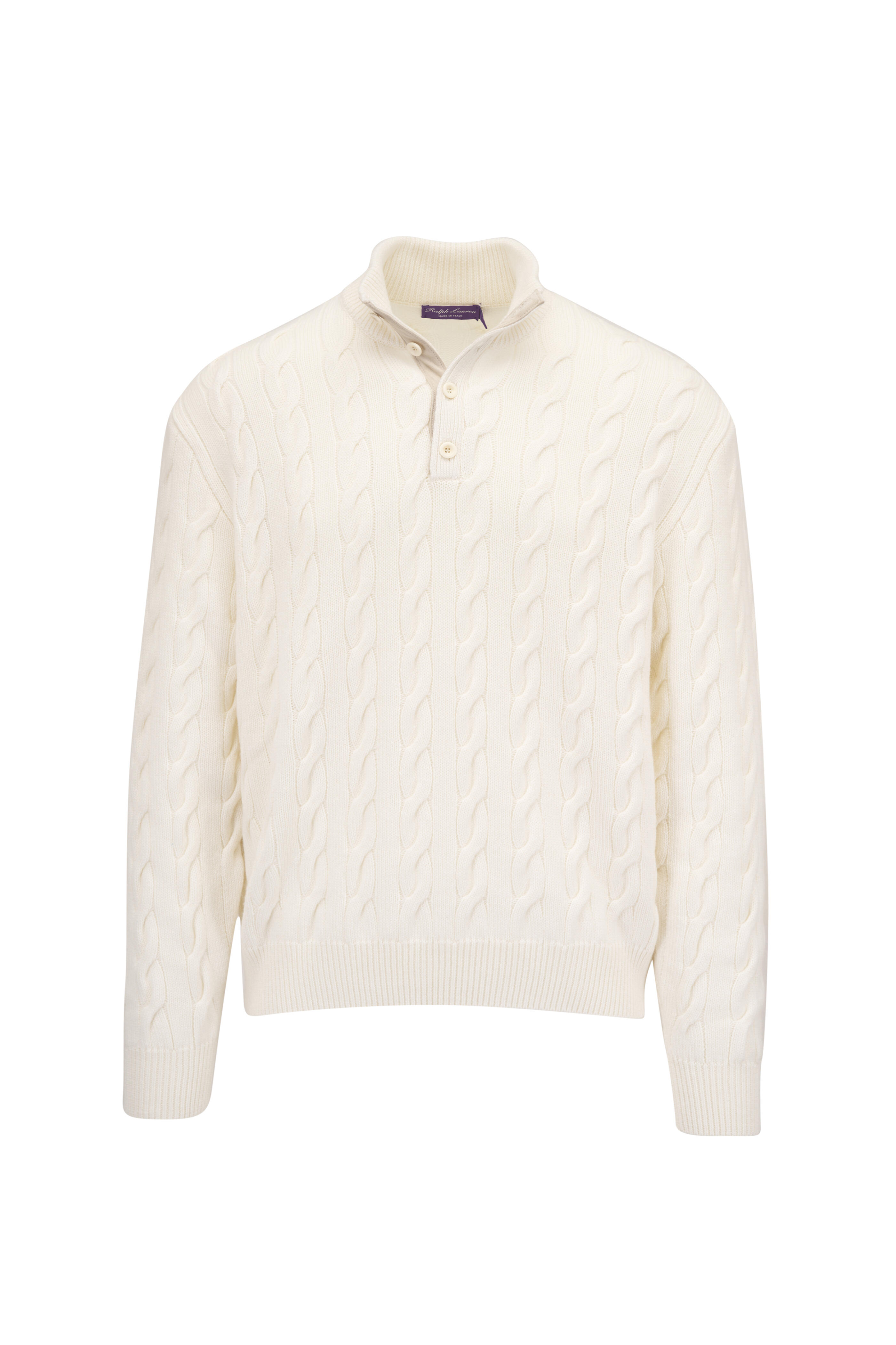 Mock neckline. Partial button placket. Ribbed knit trim. Made in Italy. Approximately 28" shoulder to hem (measurements taken from size XL). 100% cashmere. Dry clean.