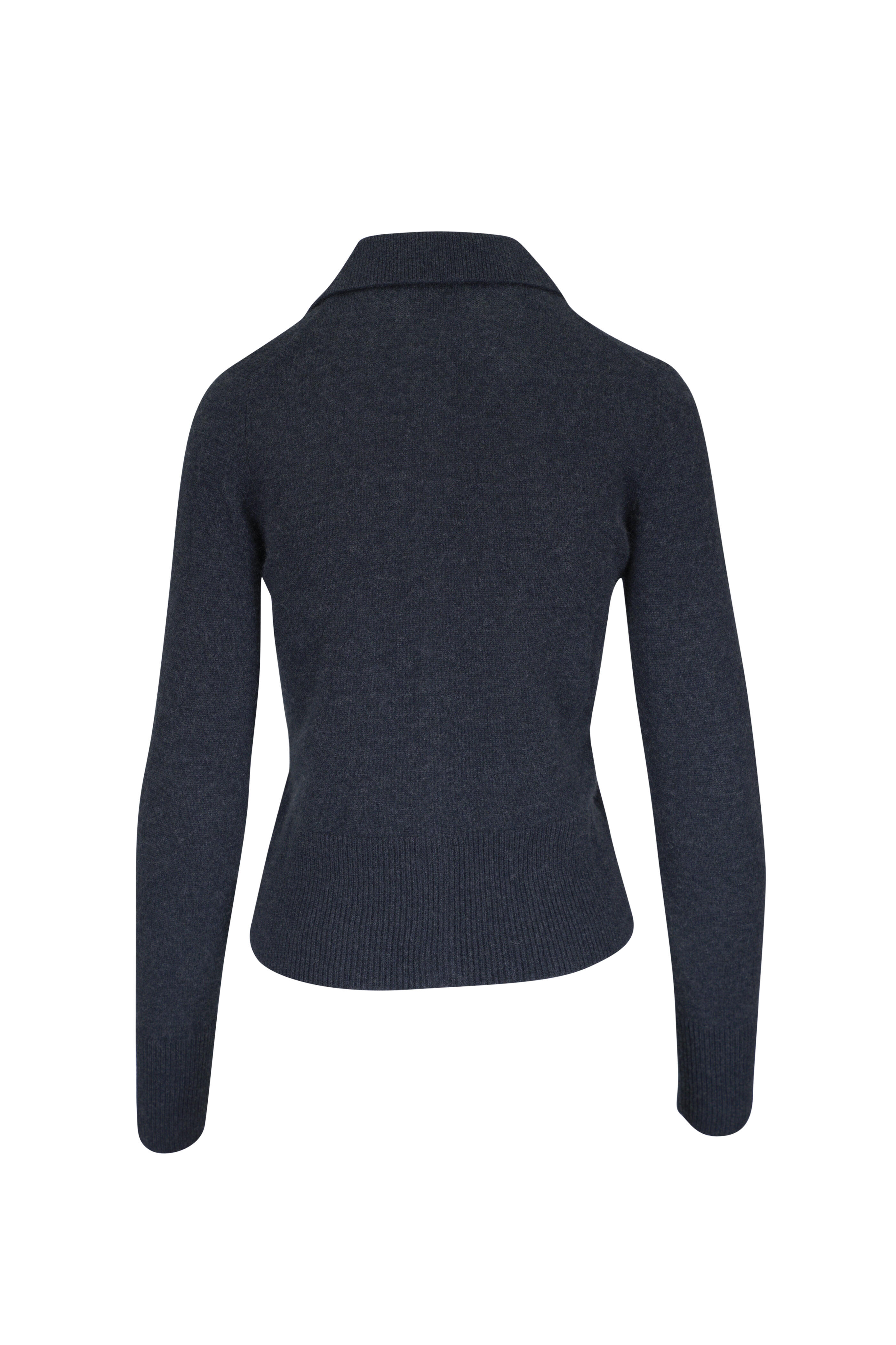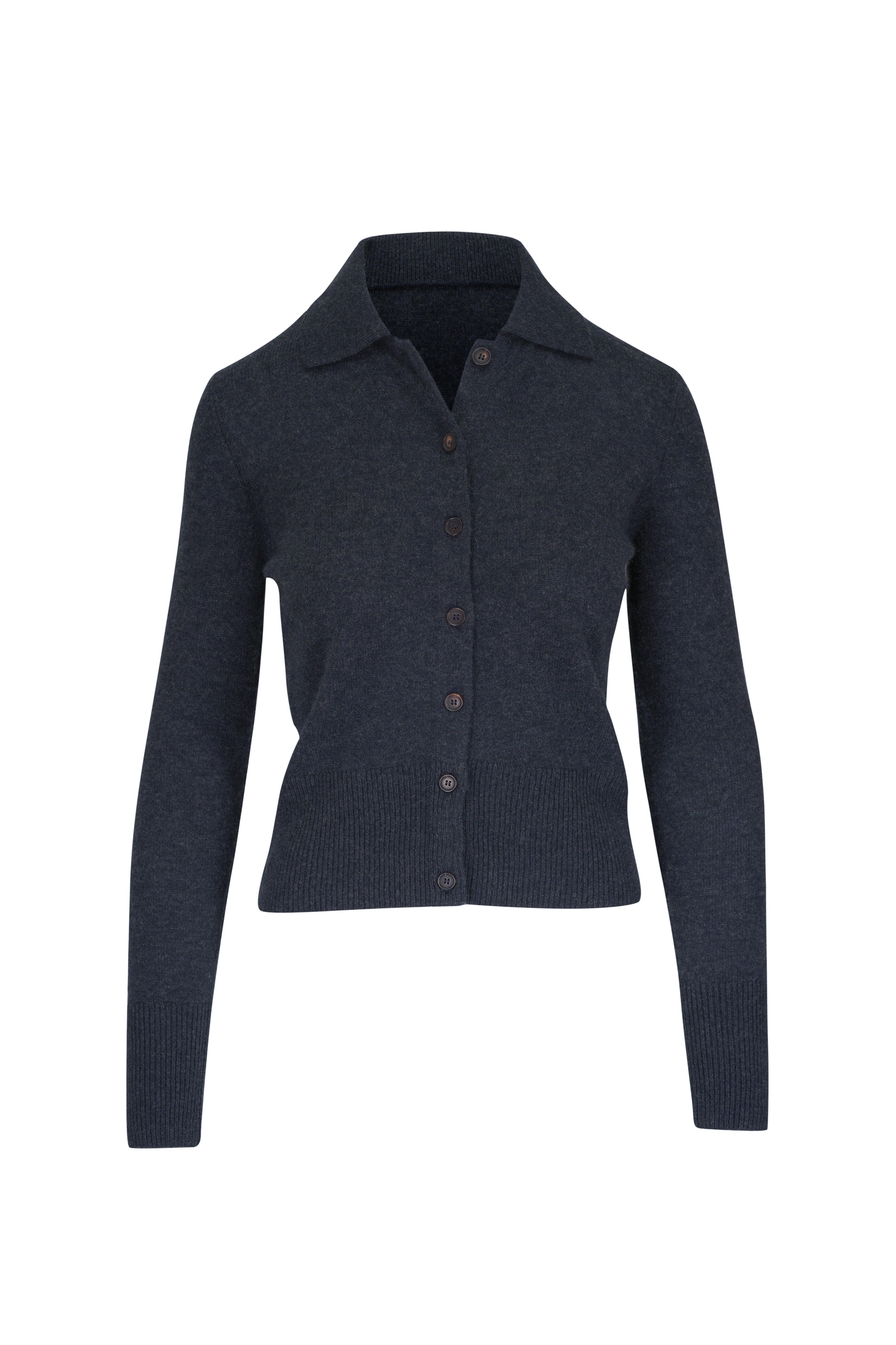 Spread collar. Front button placket. Wide ribbed trims. Imported. 100% organic cashmere; buttons: 100% horn (Buffalo). Hand wash.