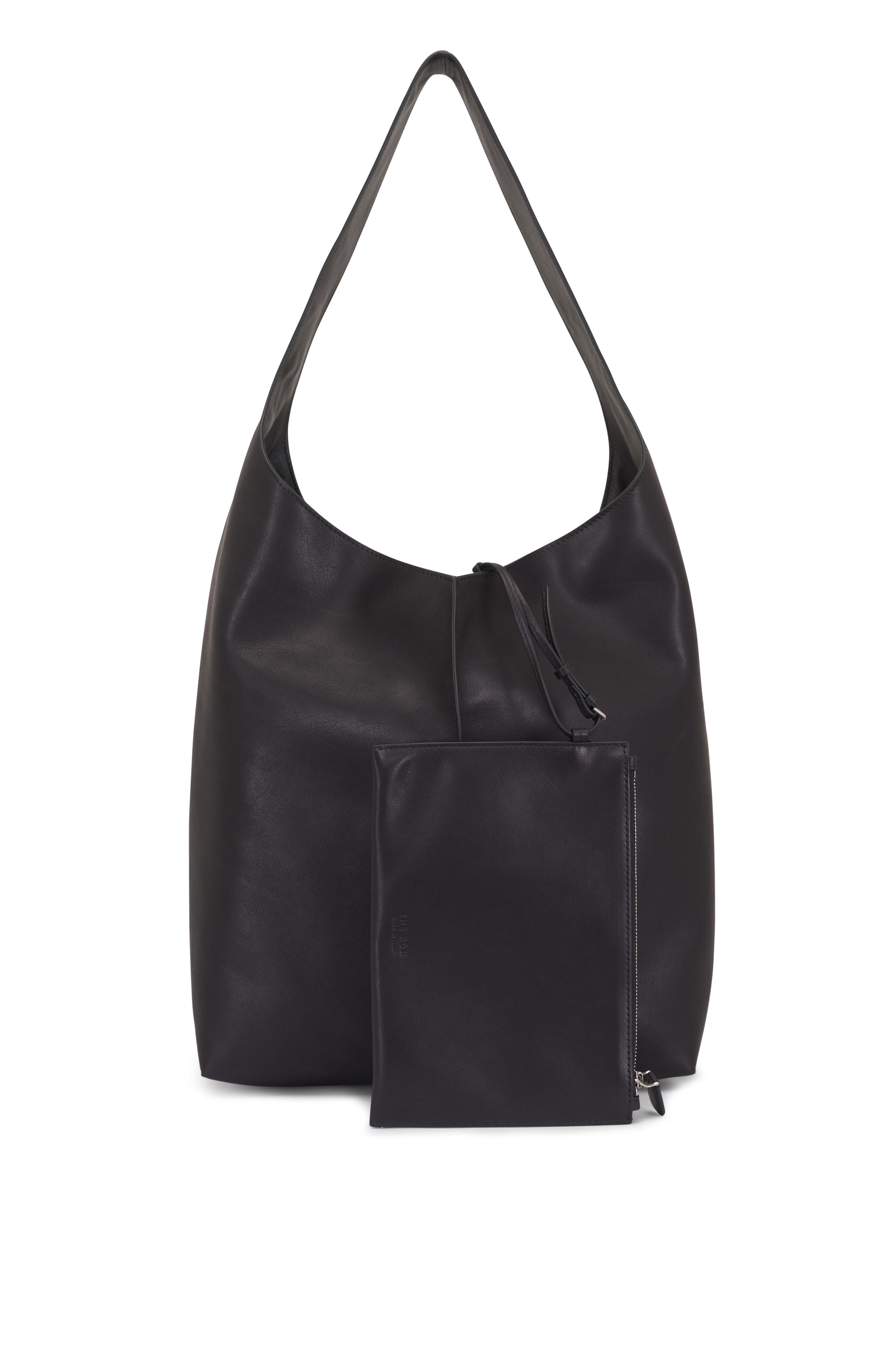 Leather. Shoulder strap. Open top. Single compartment. Detachable zipper pouch. Leather lining. Made in Italy. Width: 11.6". Height: 14.5". Depth: 4.5". Shoulder drop: 12".