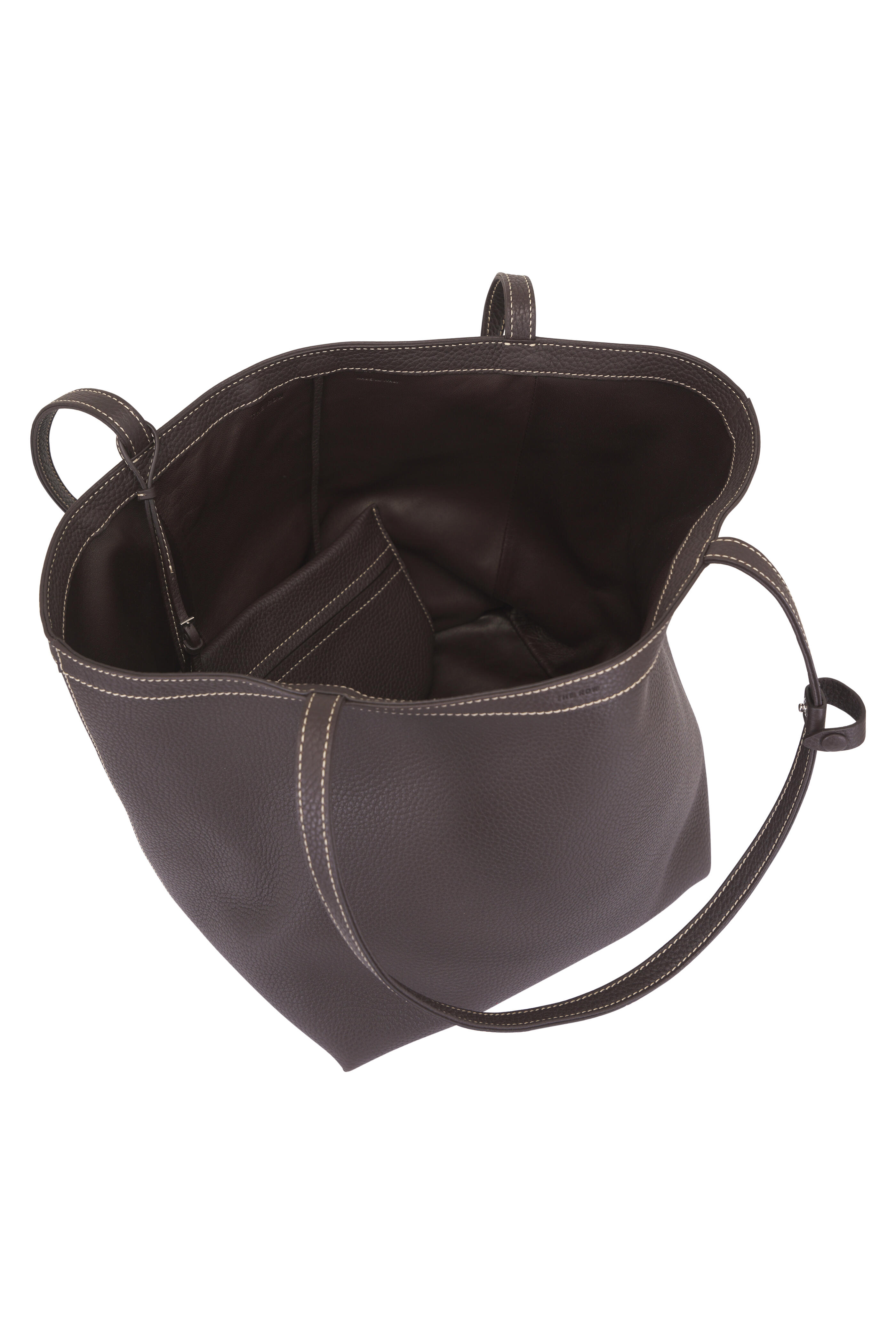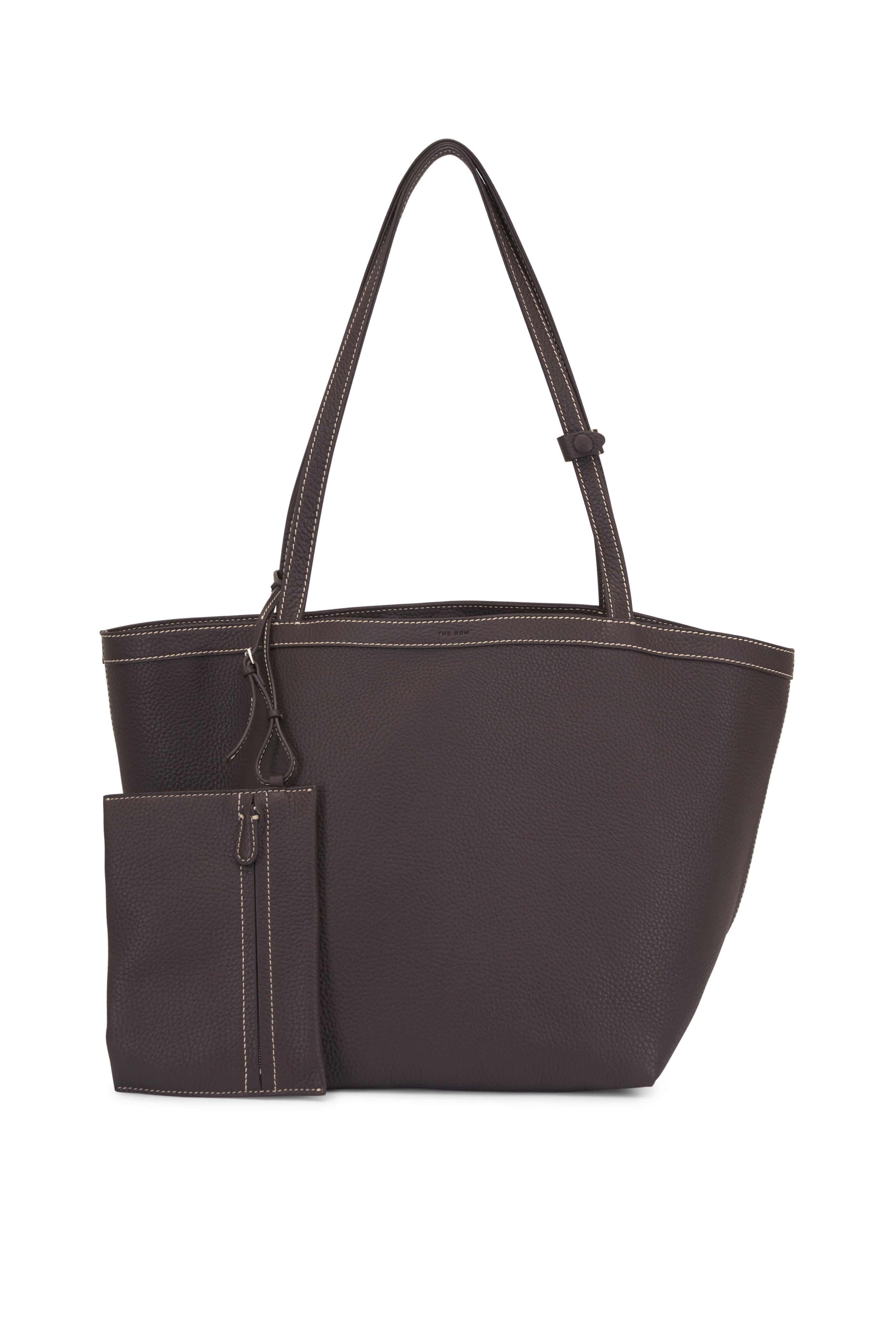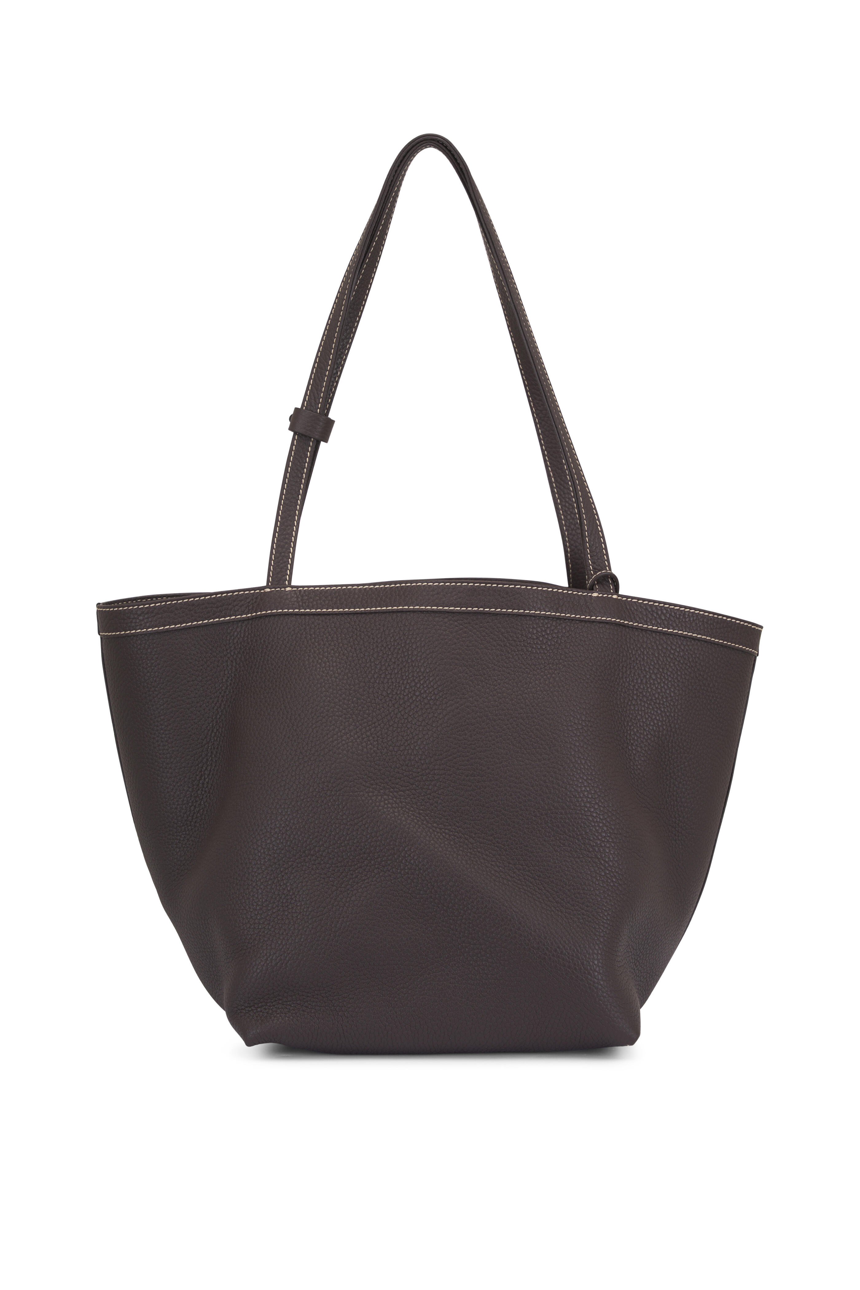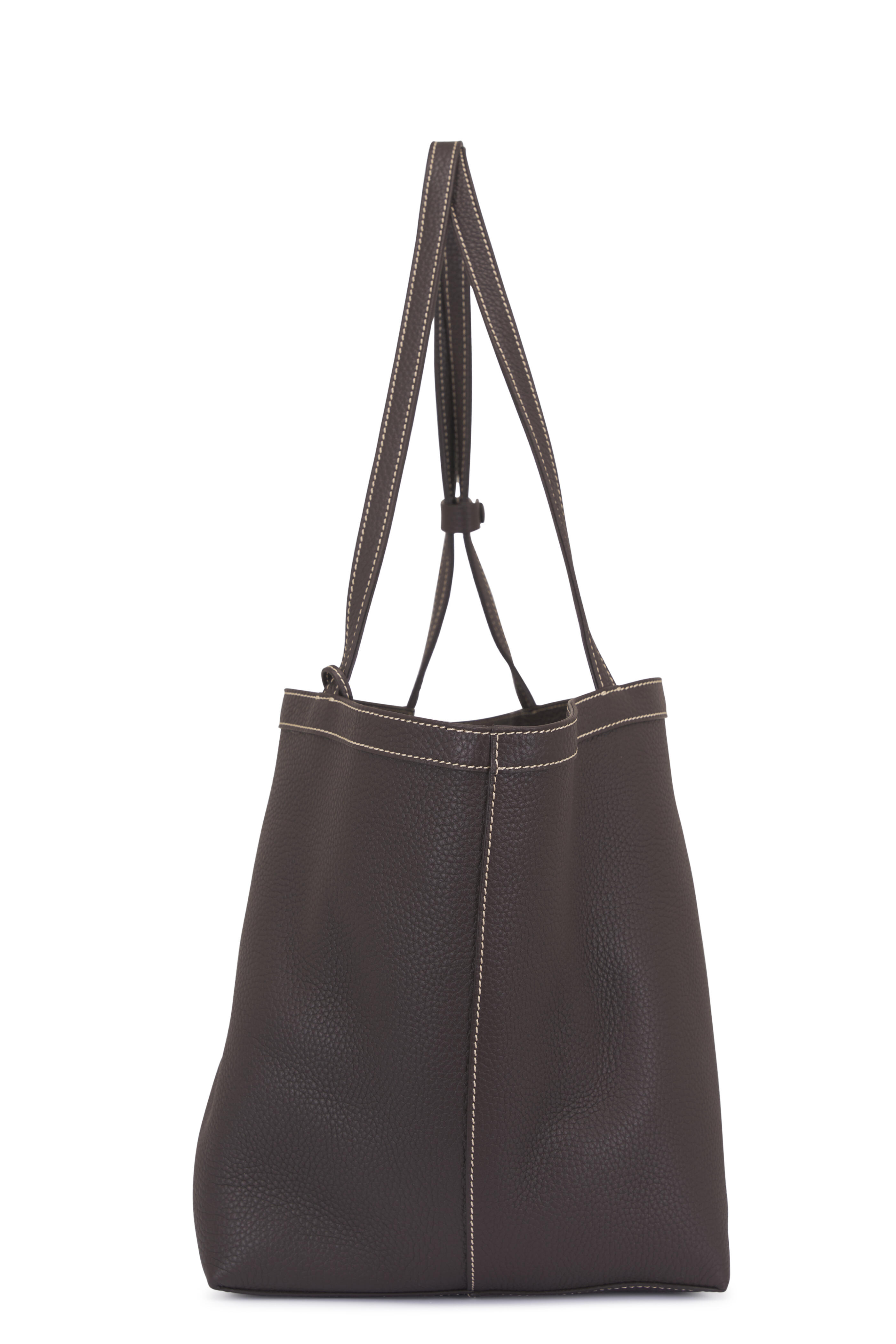 Pebbled calfskin leather. Dual top handles. Interior toggle closure. Interior wristlet with adjustable strap. Contrast stitch detailing. Lambskin leather lining. Made in Italy. 19" x 9.75" x 11.75".