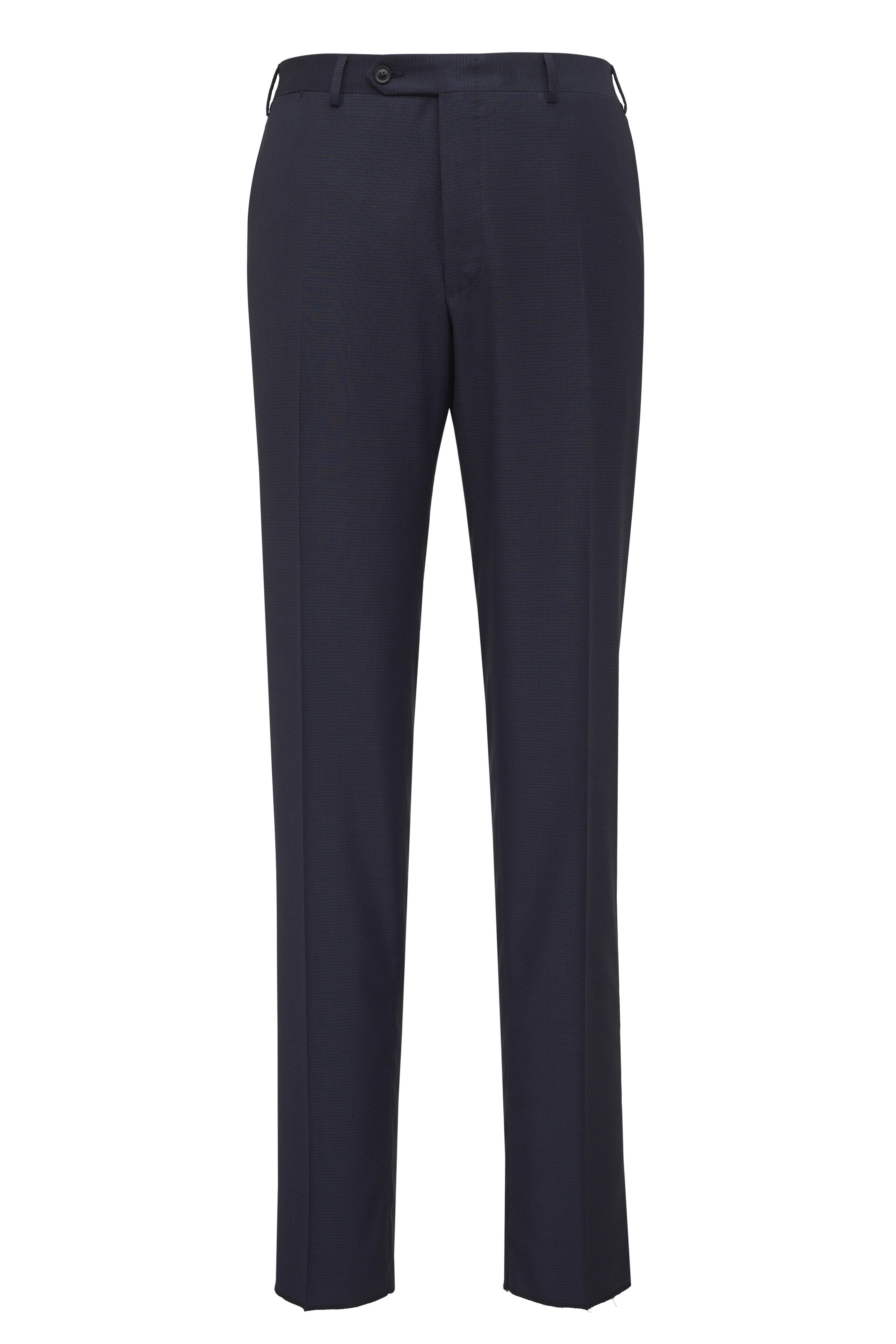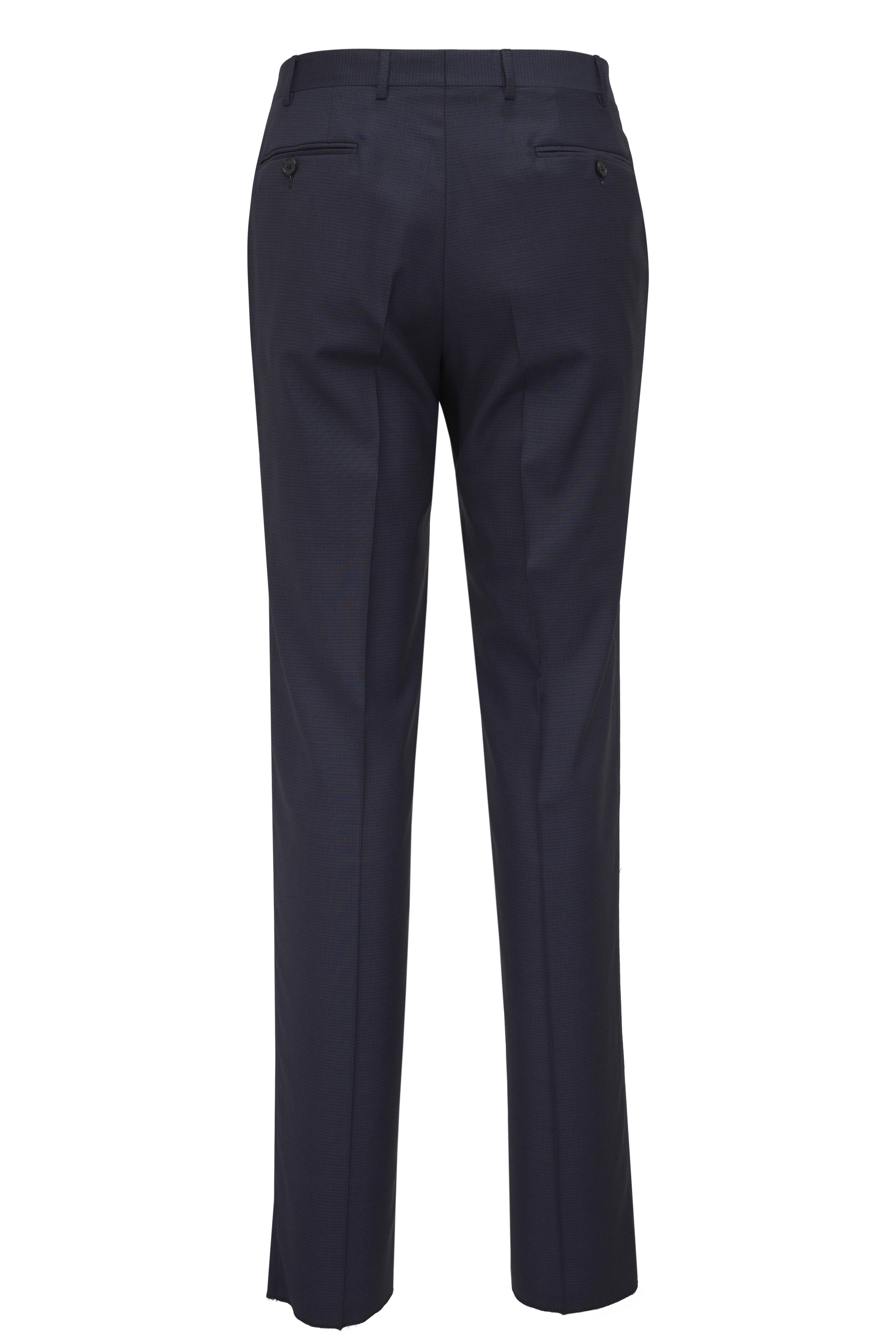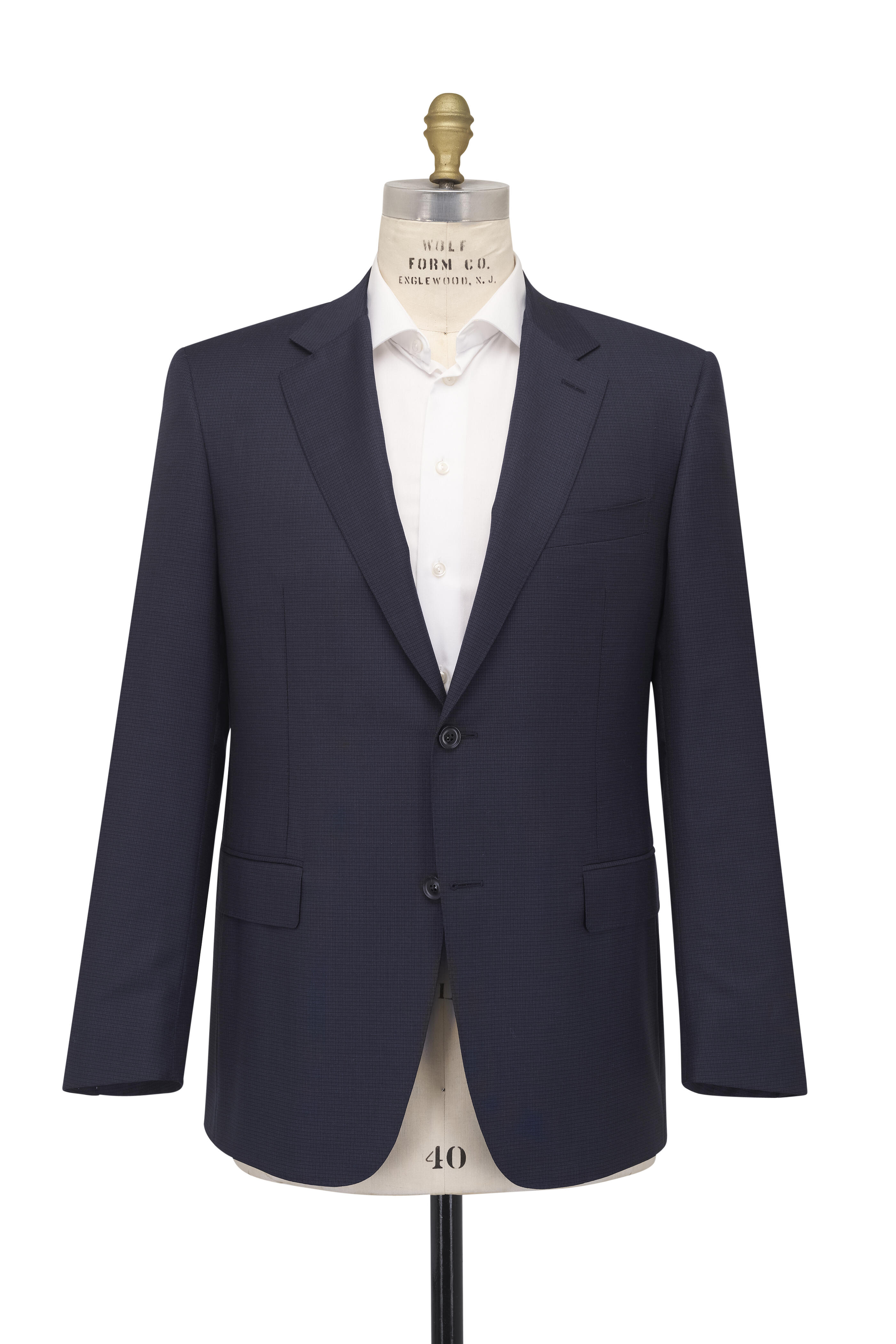 Made in Italy. Jacket: Fully lined. Notched lapels. Front two button closure. Chest welt pocket; lower flap pockets; interior slip pockets. No buttons attached. Double vent. Pant: Banded waist; belt loops. Front slip pockets; back besom pockets. Unfinished hem. 100% wool. Dry clean.