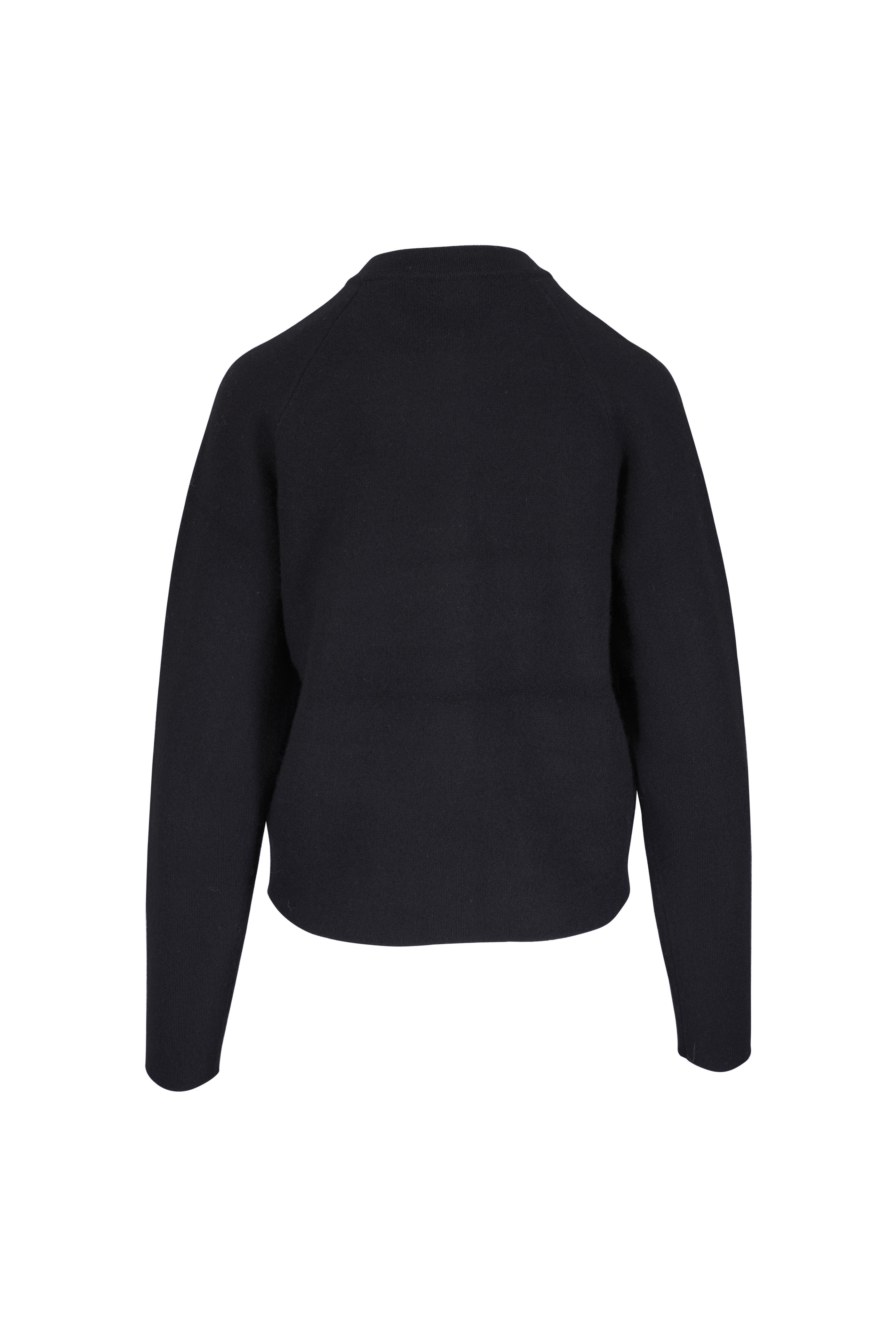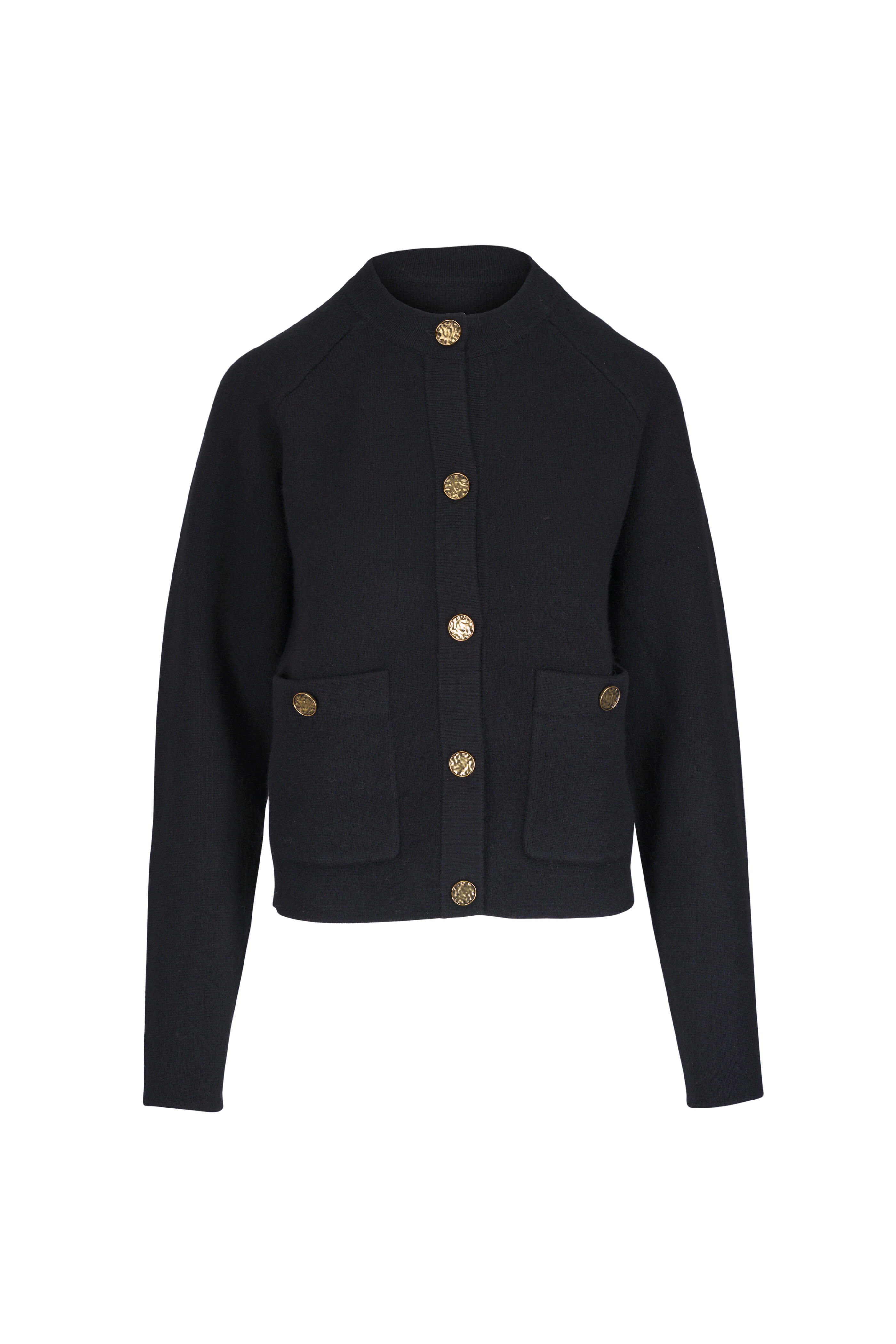Crew neckline. Front button placket. Lower buttoned patch pockets. Imported. 53% cashmere, 44% wool, 3% elastane. Hand wash.