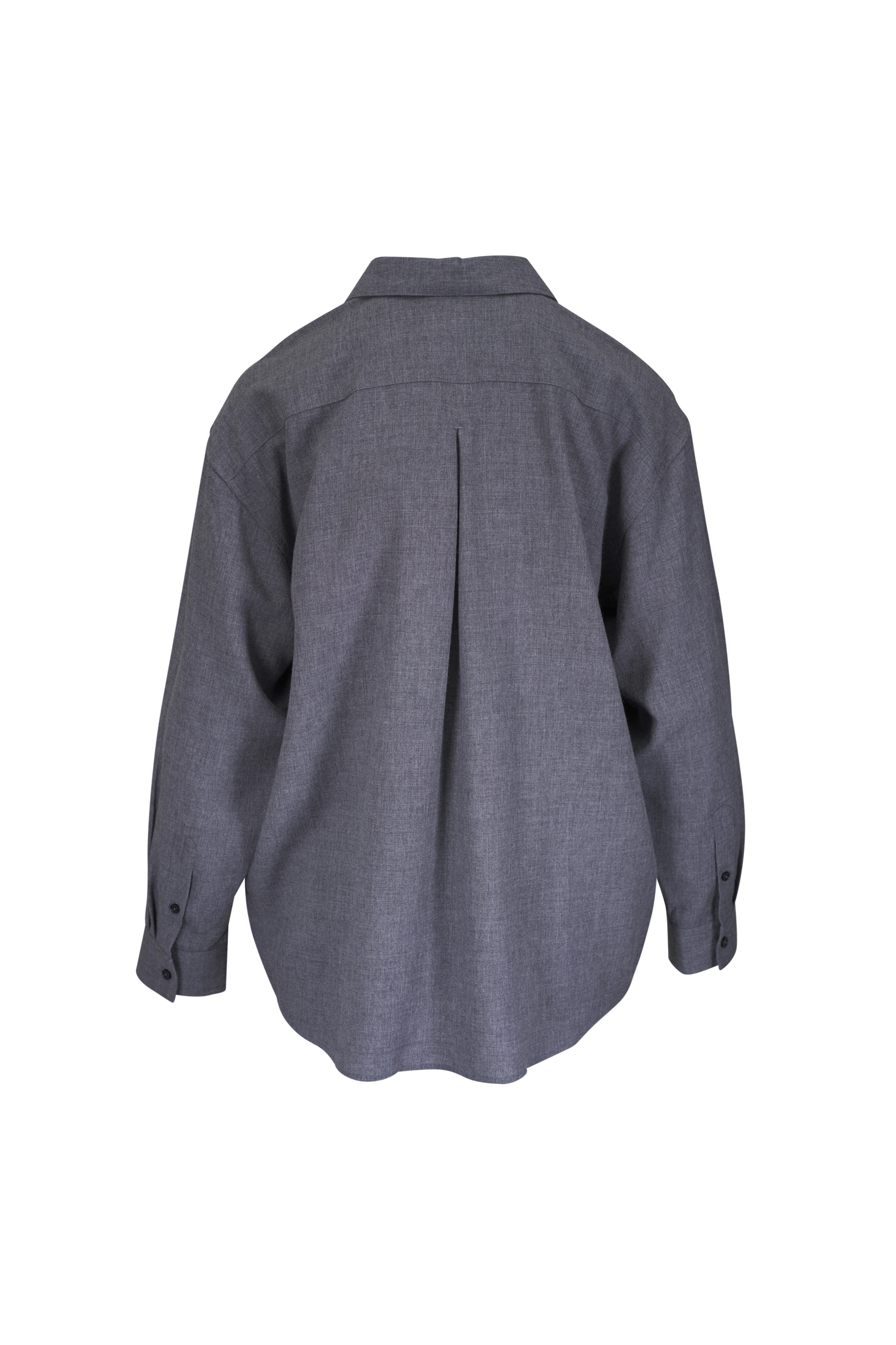 Spread collar. Front button placket. Single button square cuffs. Imported. 90% viscose, 10% wool. Dry clean.
