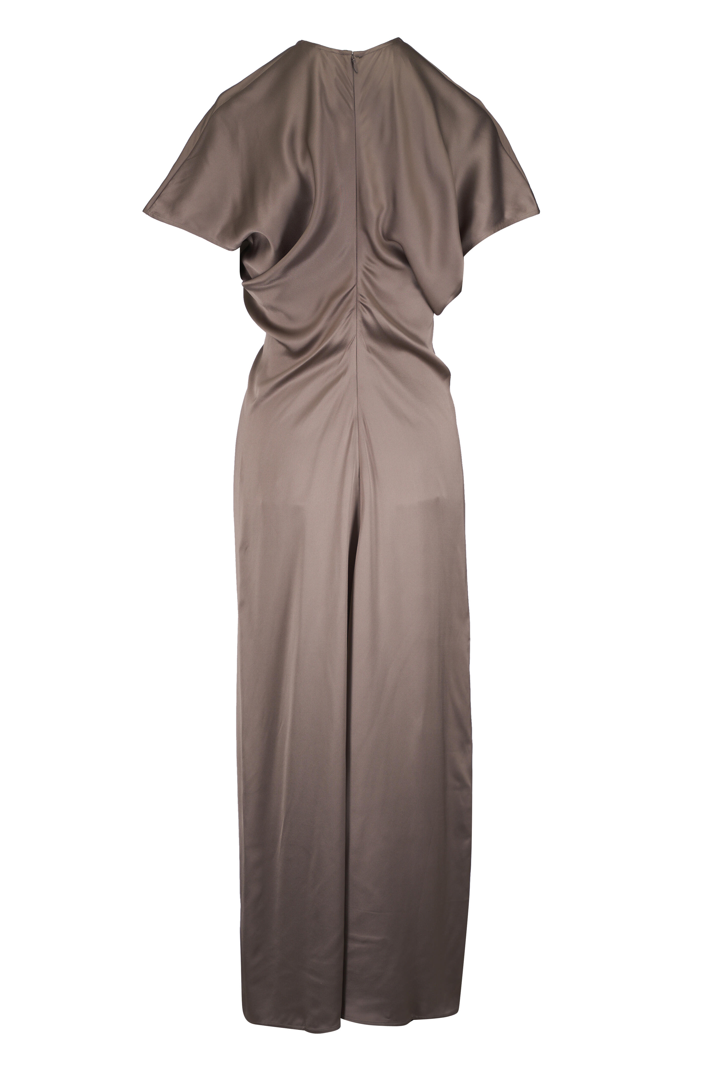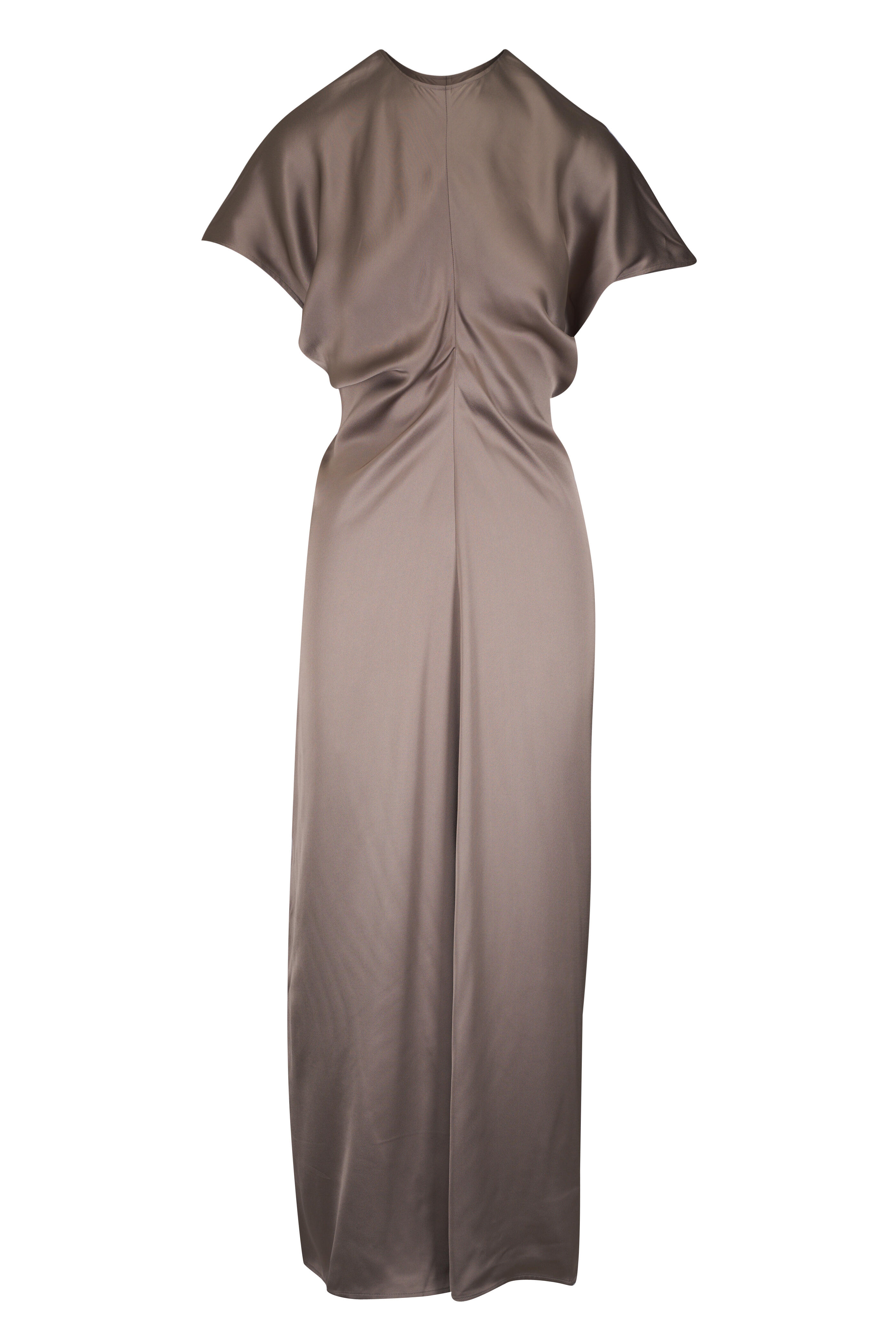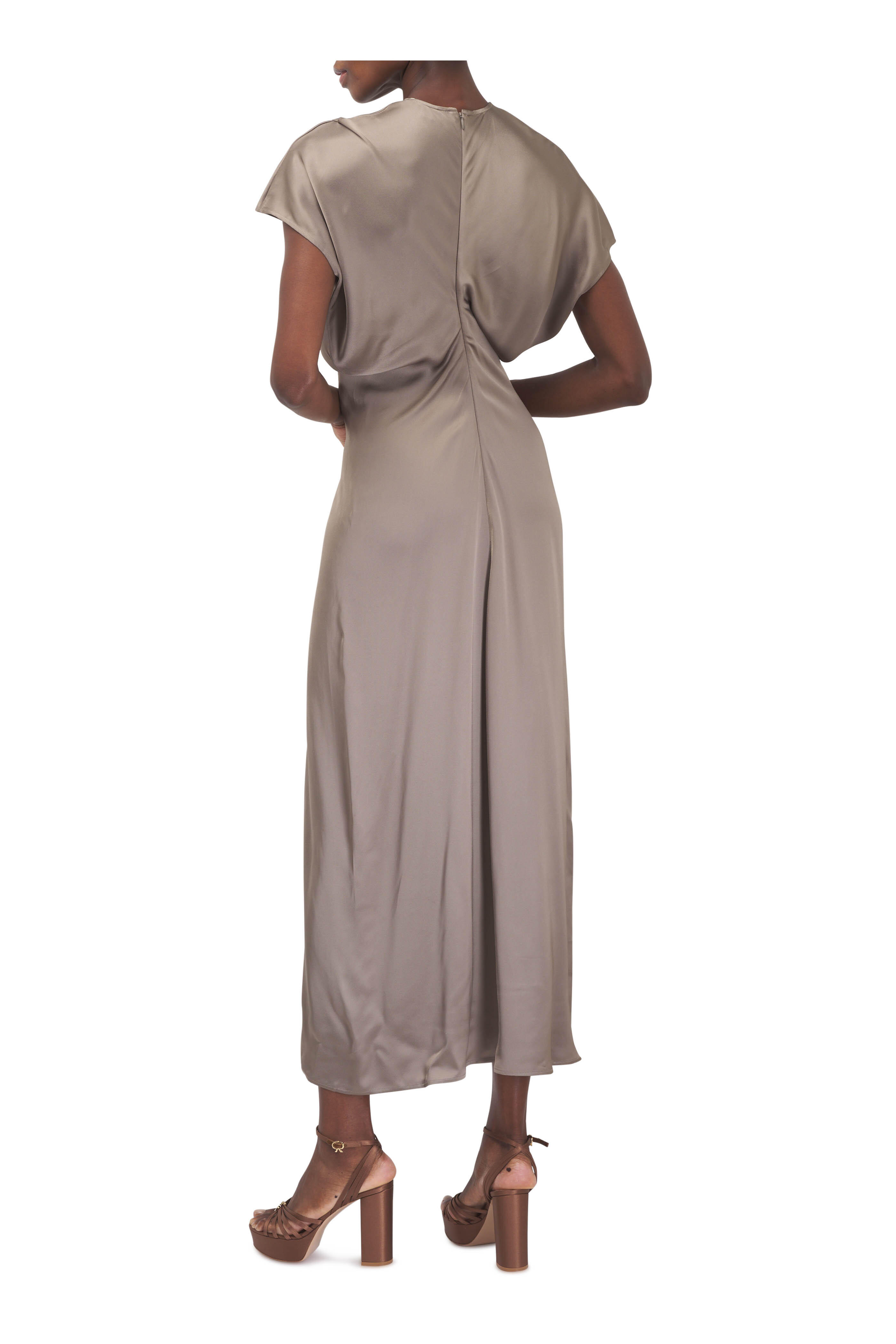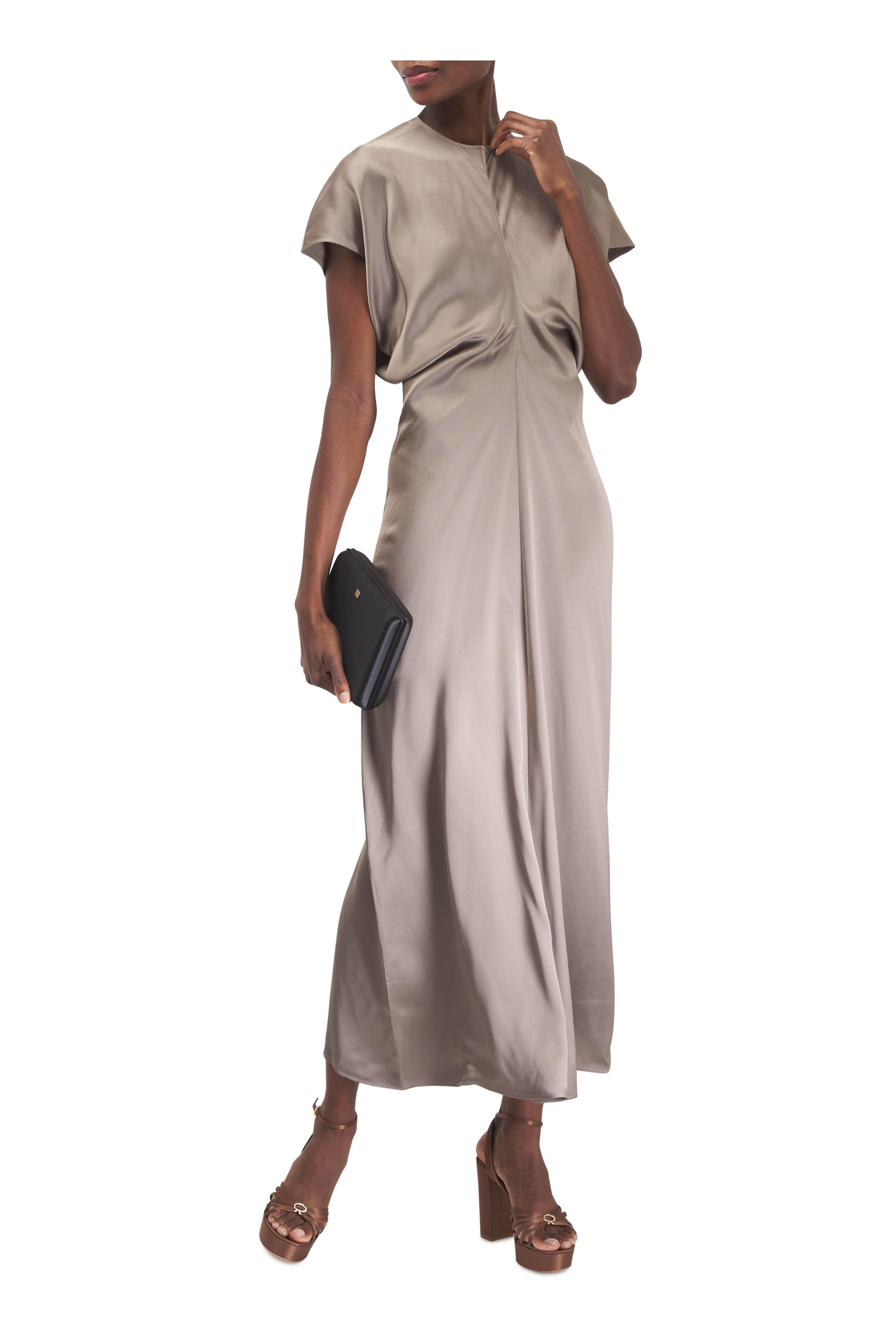Round neckline. Concealed back zip. Imported. 55" shoulder to hem. 100% viscose. Dry clean.