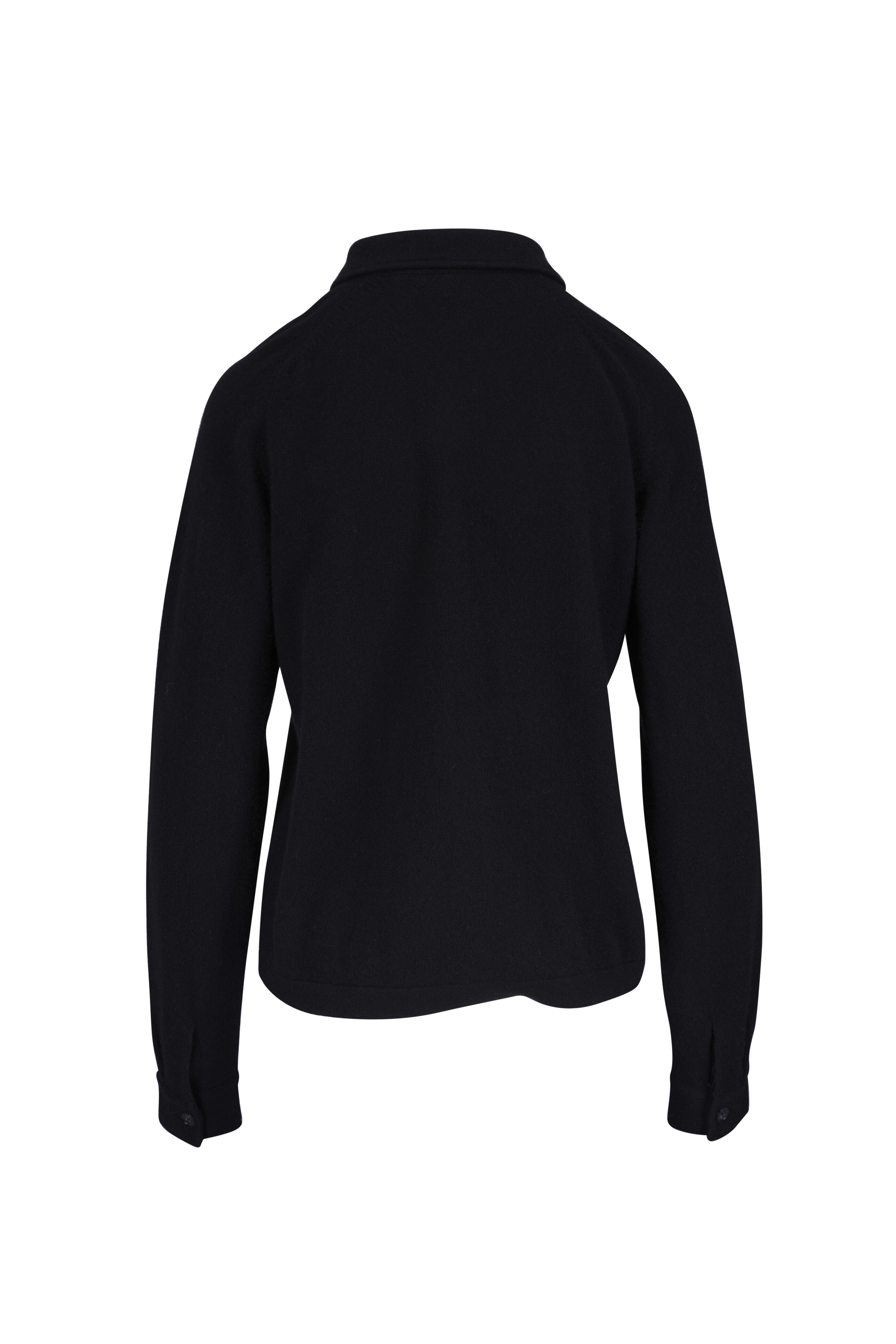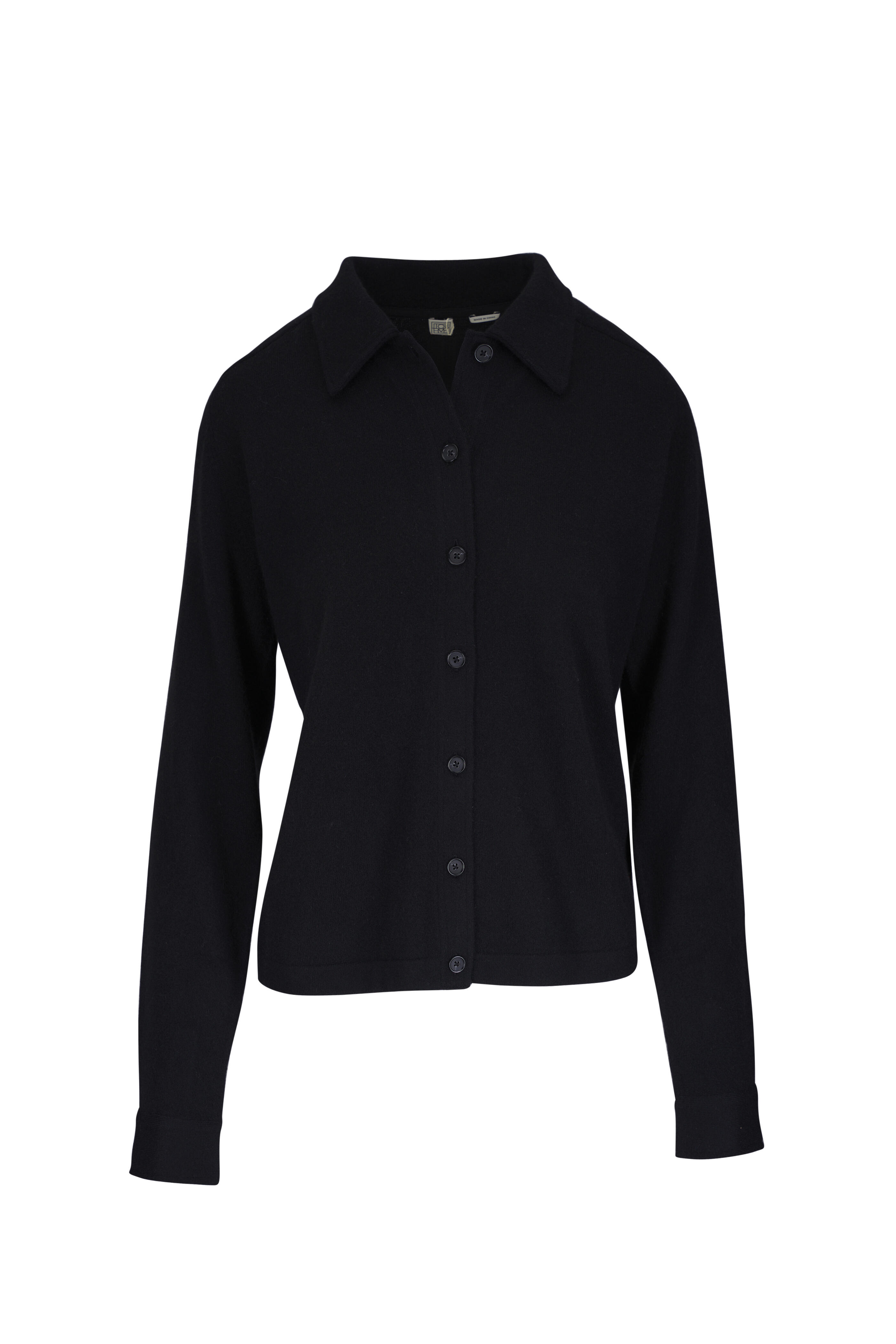 Shirt-style collar. Front button placket. Straight hem. Imported. 100% cashmere. Dry clean.