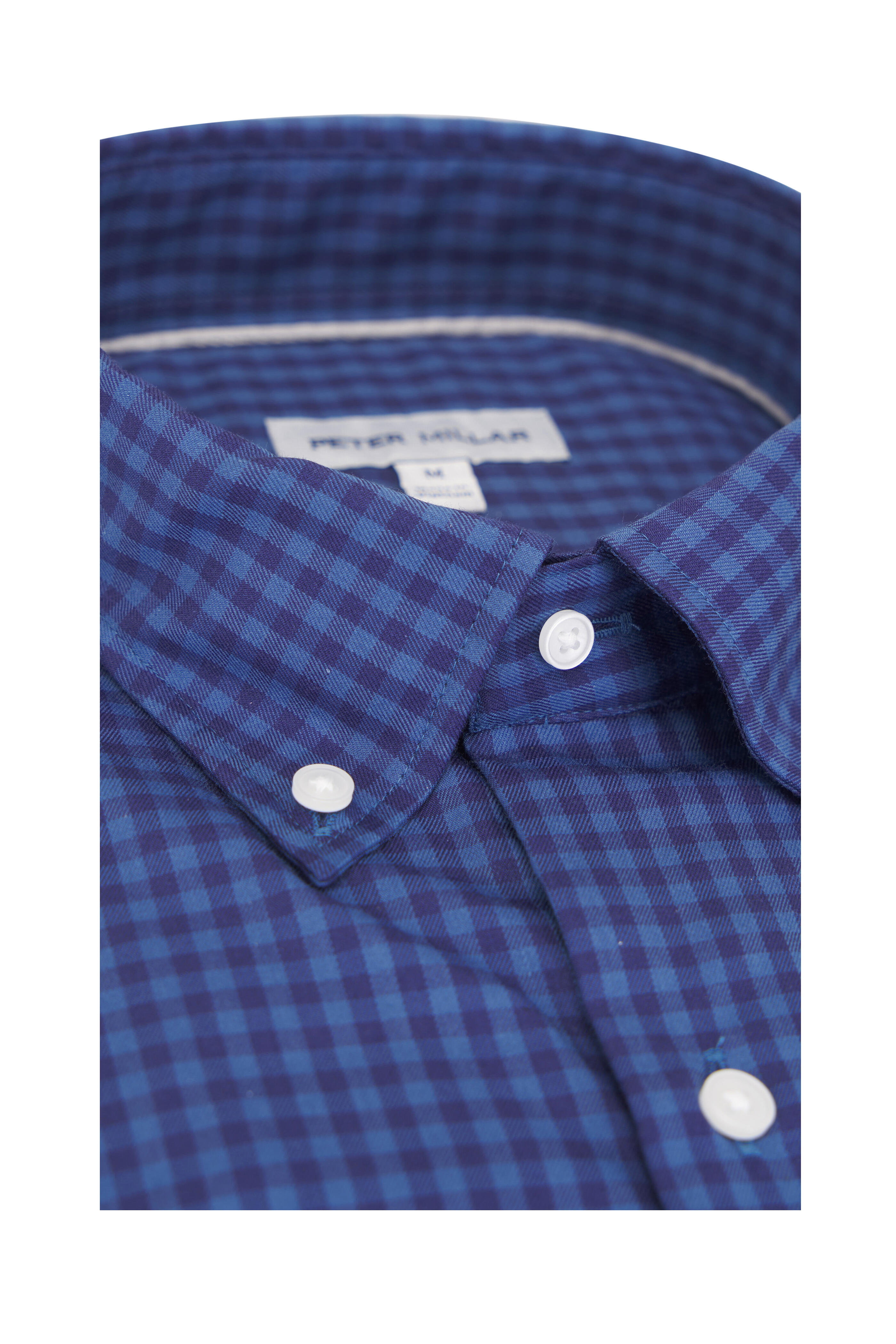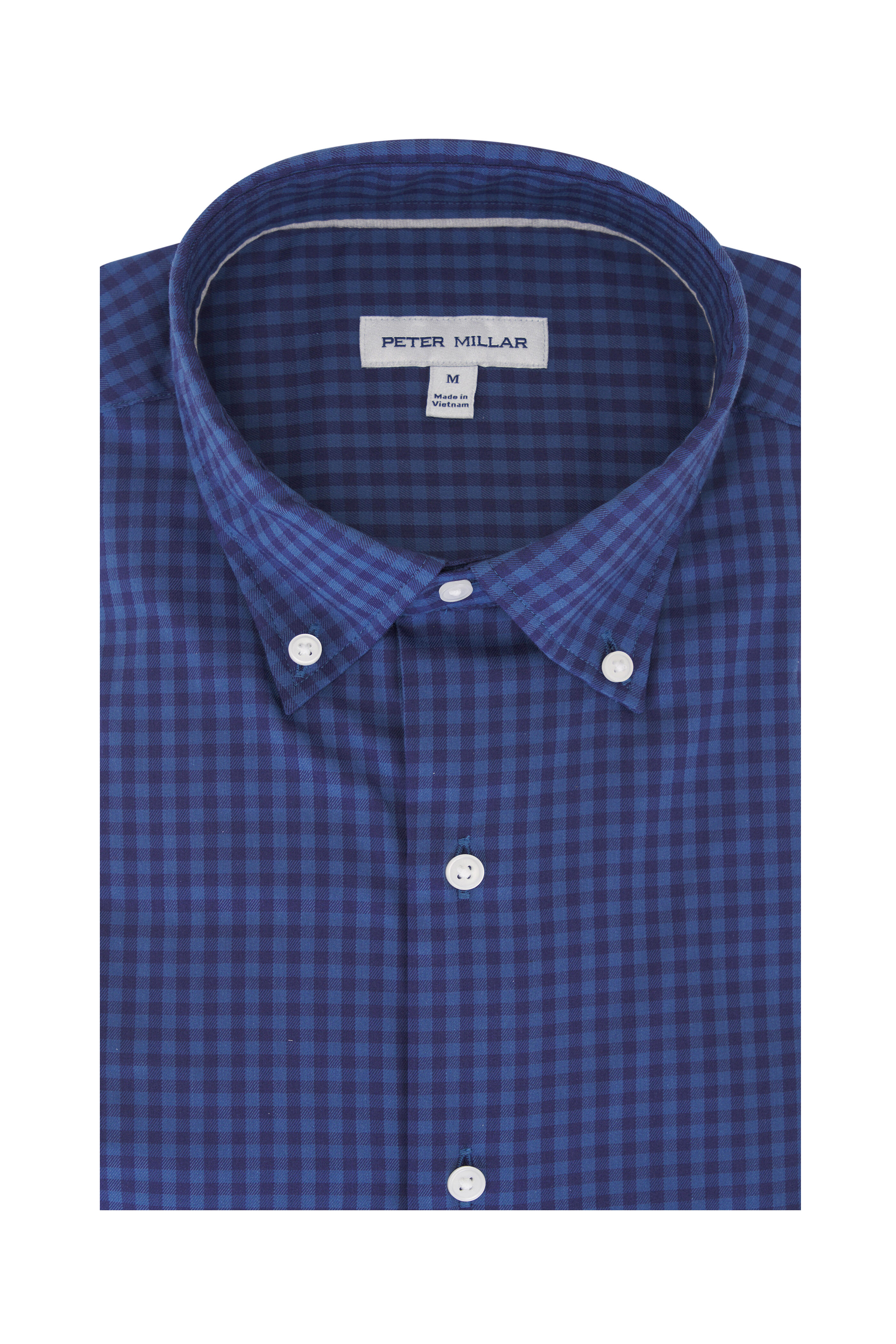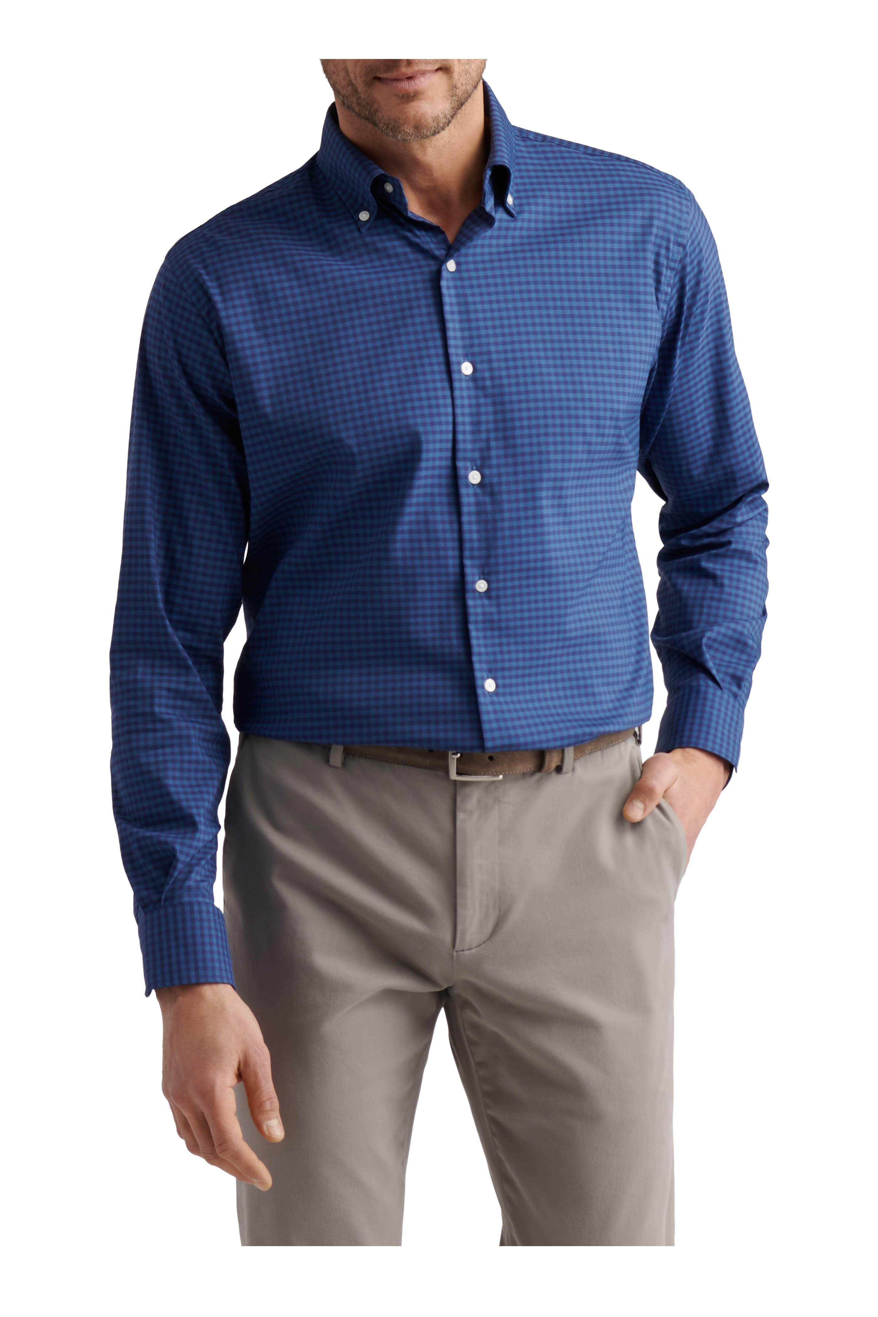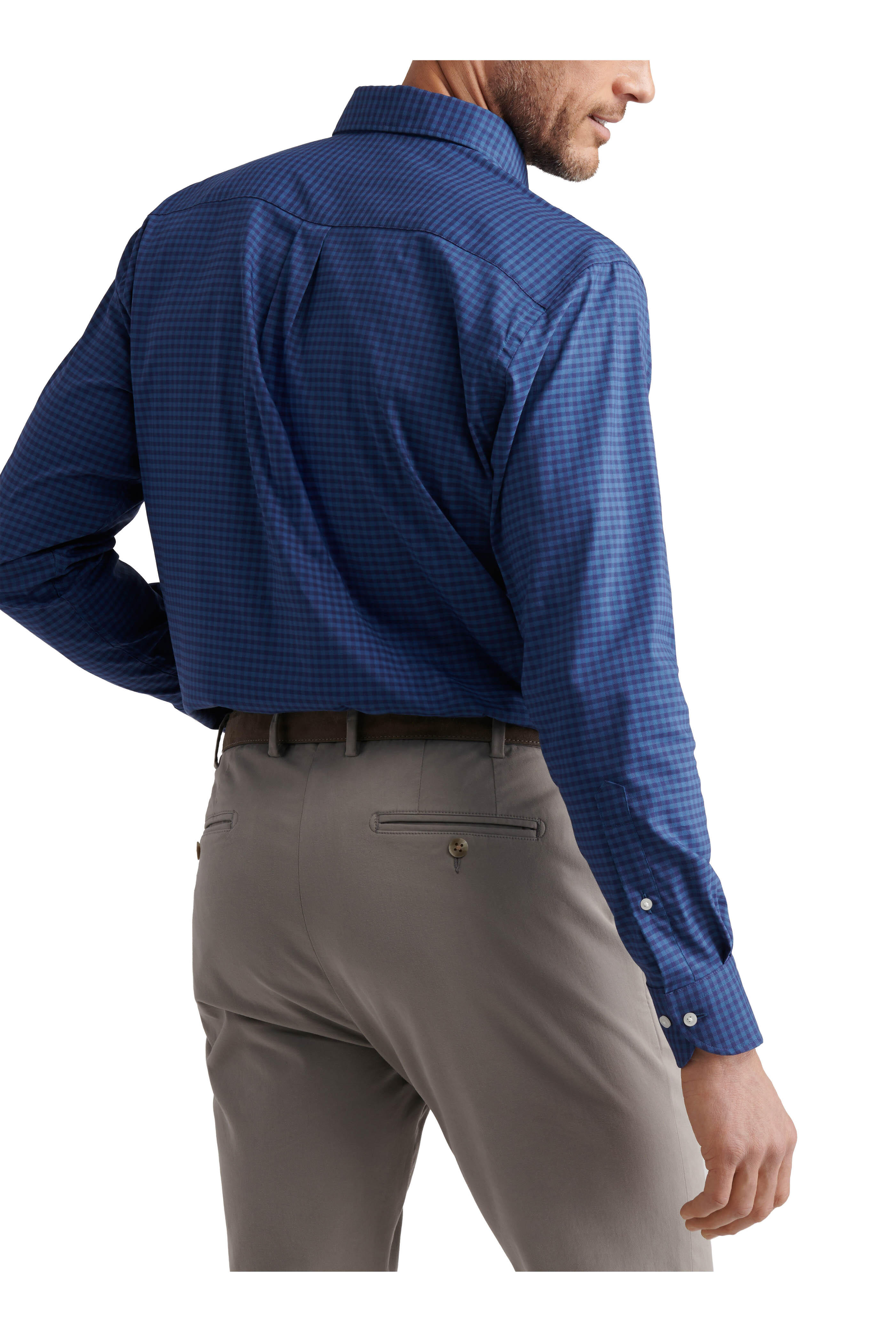 Buttoned down spread collar. French front button placket. Adjustable single button barrel cuffs. Imported. 42% cotton, 36% nylon, 17% lyocell, 5% spandex. Machine wash.