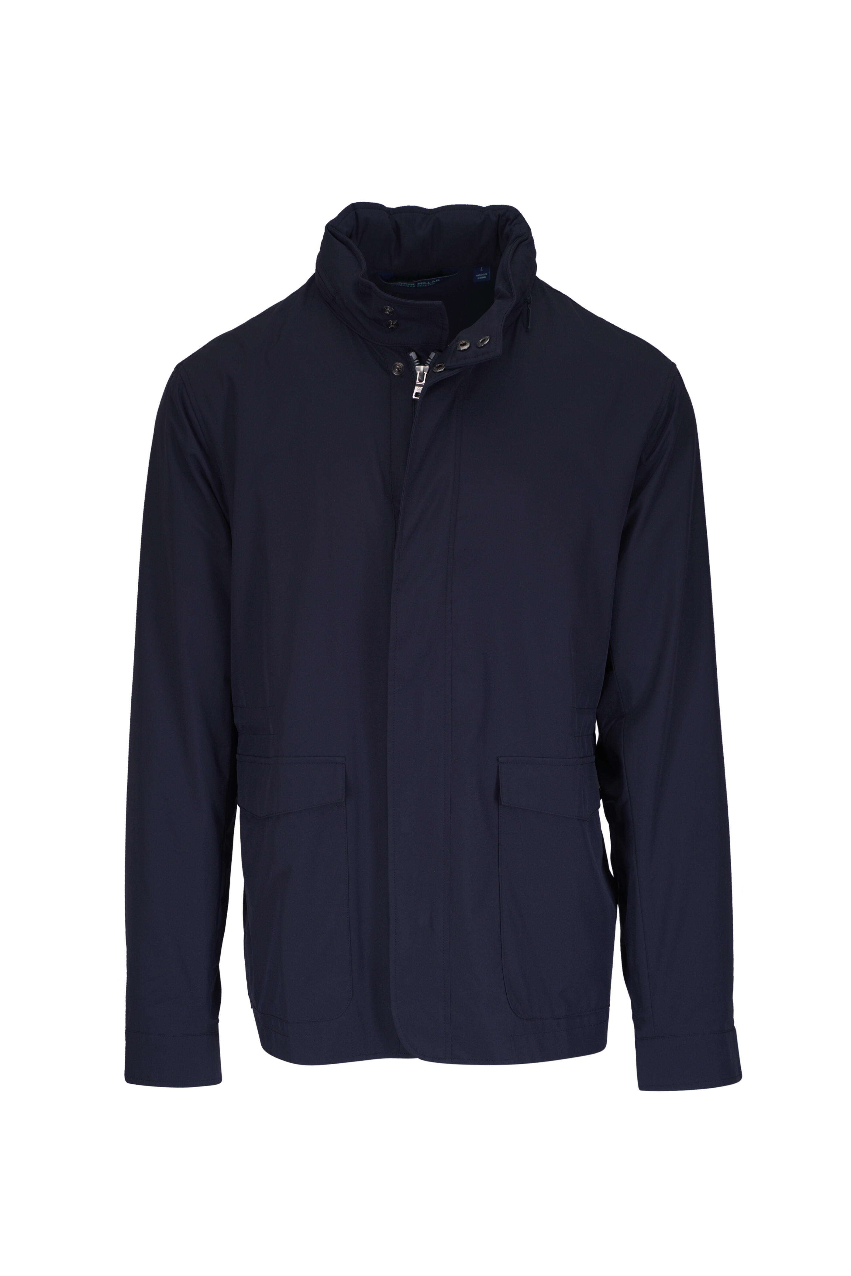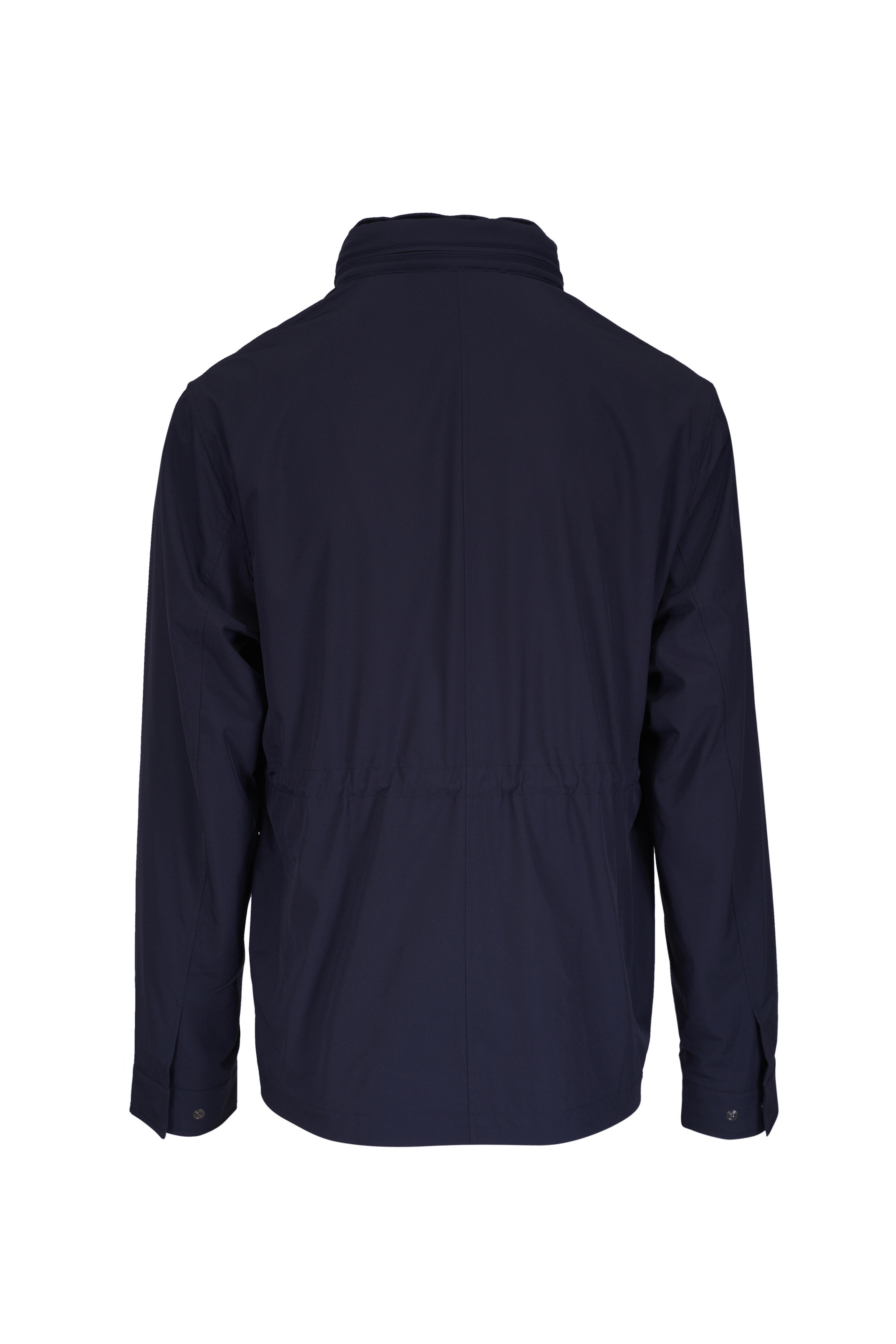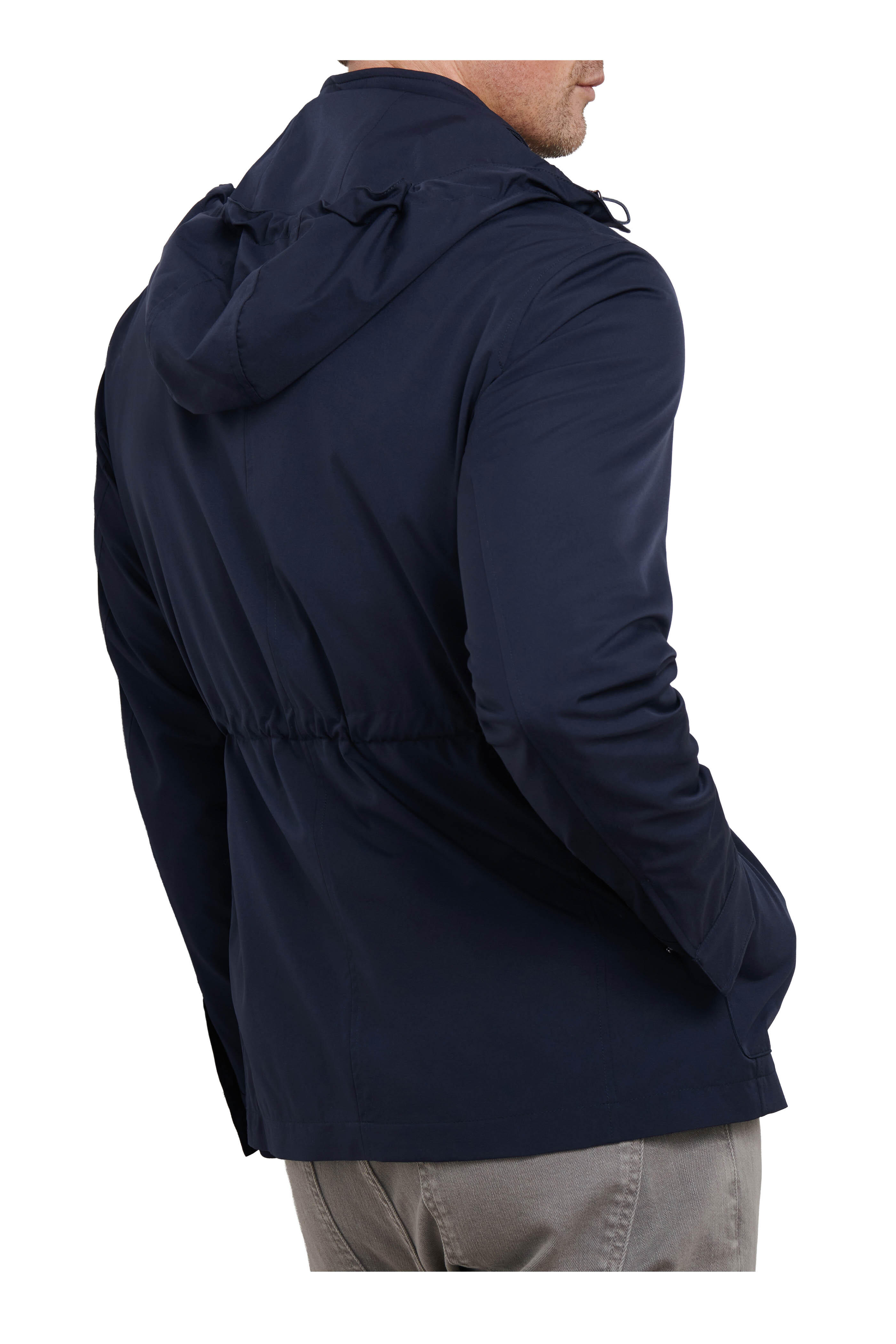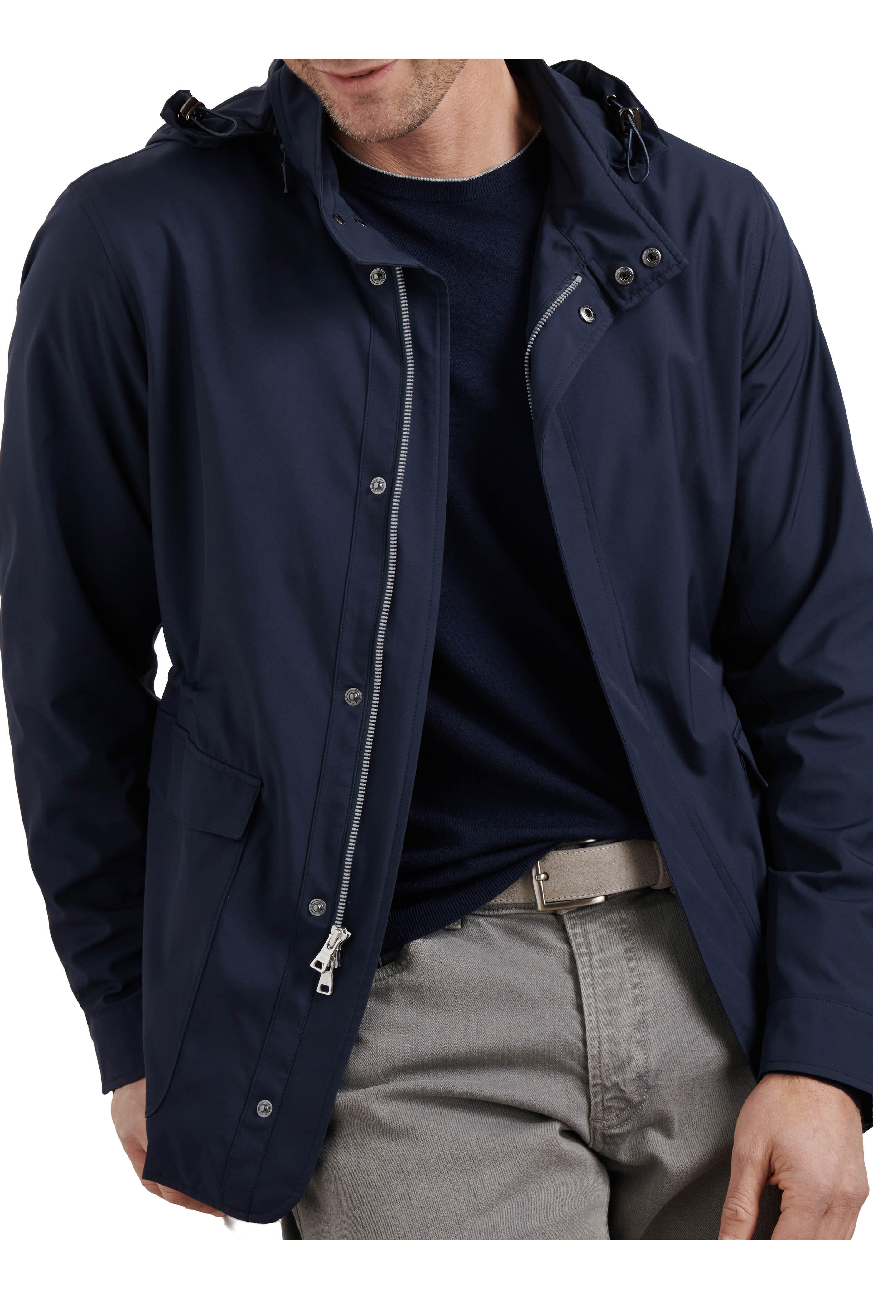 Stand collar; stowaway hood. Concealed two-way zip closure; snap button front closure. Adjustable snap cuffs. Lower Snap patch pockets; internal buttoned pockets. Imported. Shoulder to hem 29" ( size L). 93% Nylon, 7% polyester; fully lined. Machine wash.