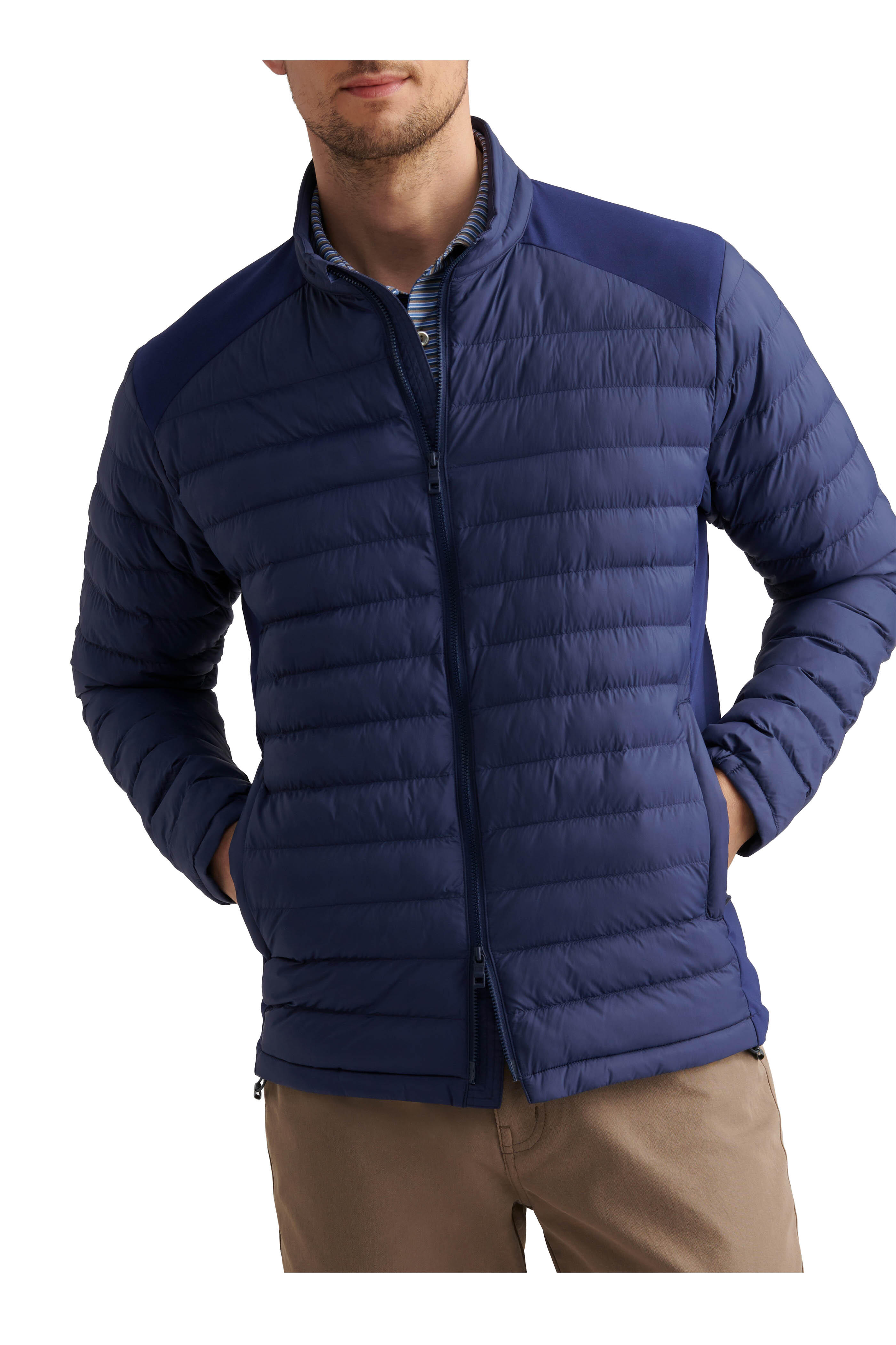 Stand collar. Two-way zip. Side zip pockets; internal slip pockets. Quilted panels. Straight hem. Imported. Shoulder to hem 28" (size xl). 100% Recycled nylon; contrast: 90% recycled polyester nylon, 10% spandex; fill: 100% polyester. Machine wash.