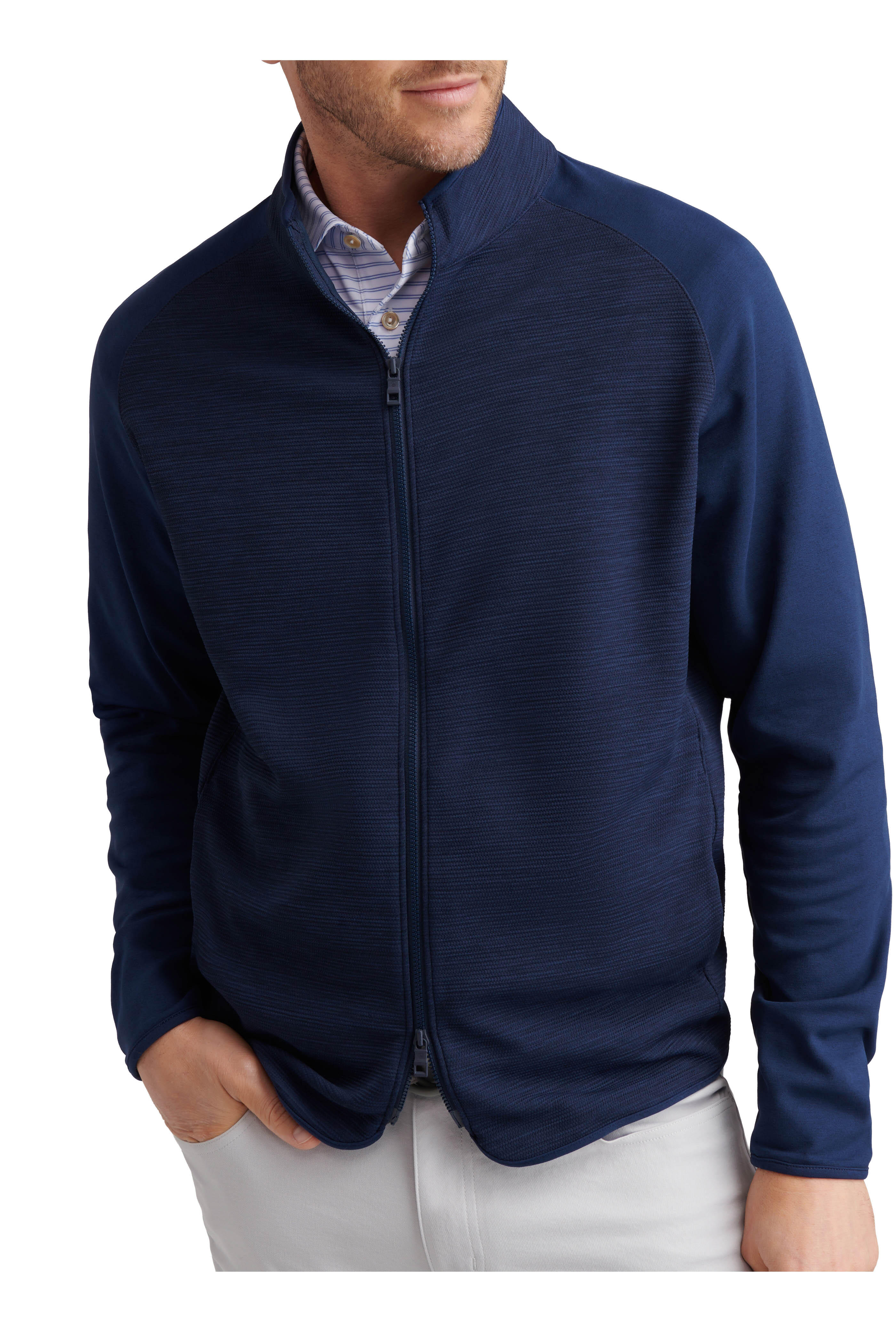 - Two-way front zip placket