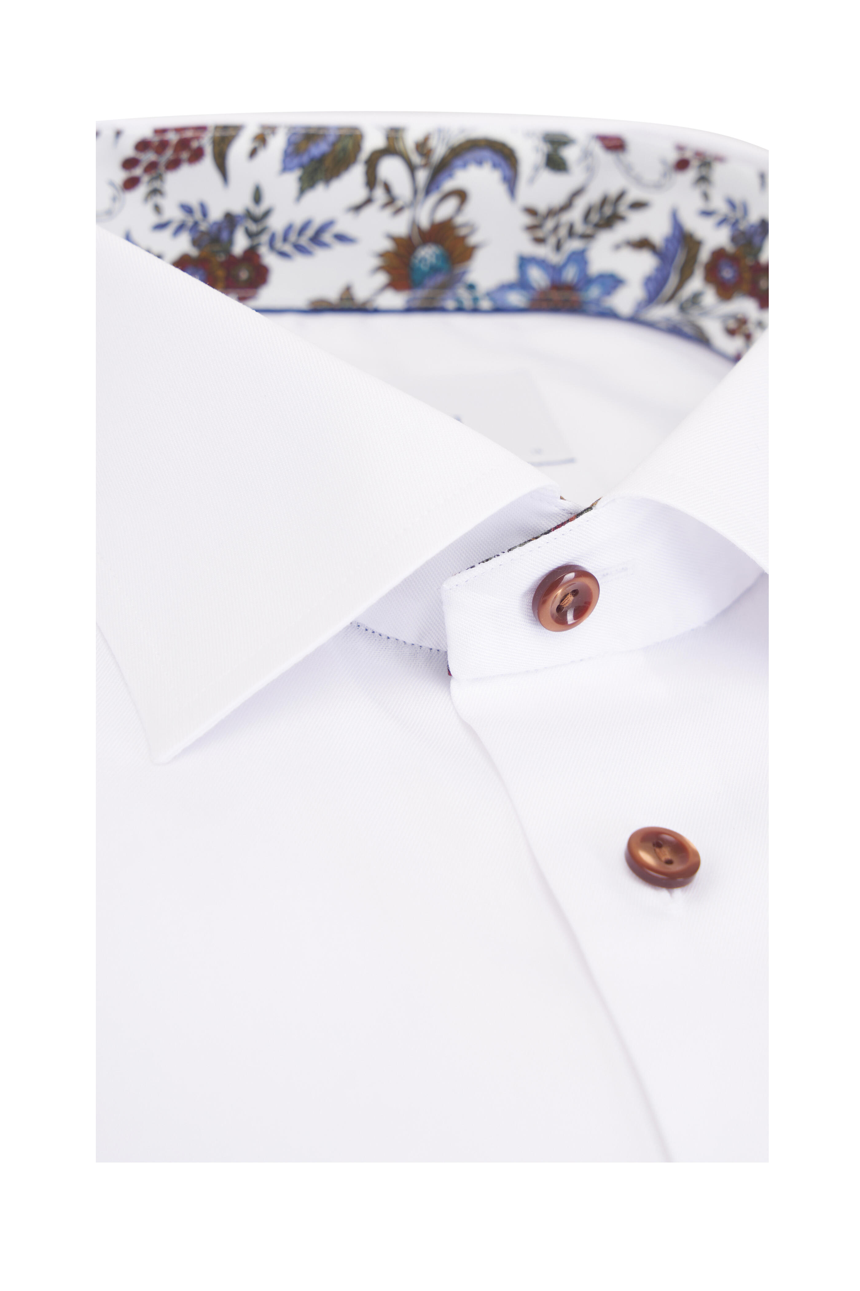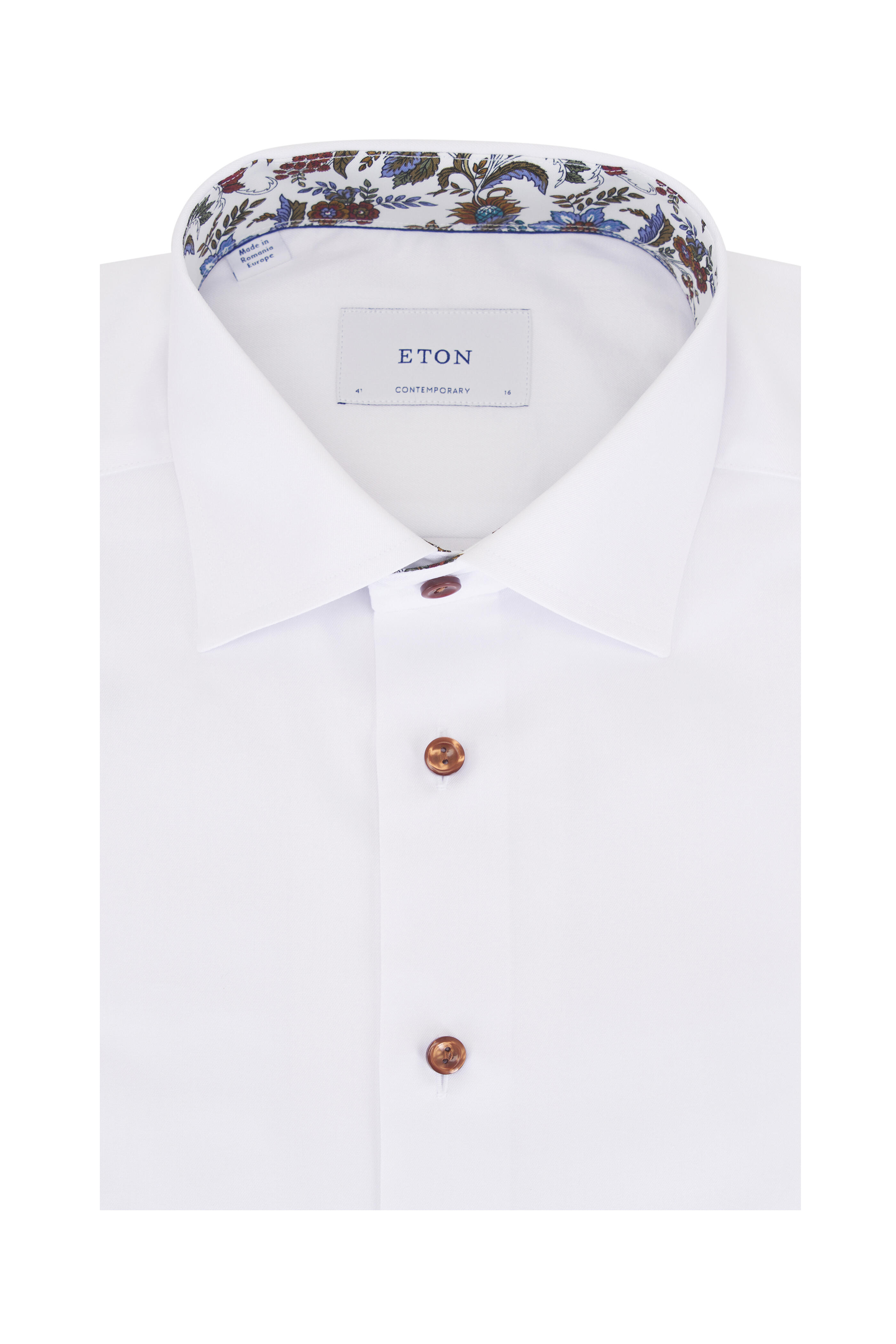 Spread collar. French placket. Single button mitered cuffs. Imported. Contemporary fit. 100% cotton. Machine wash.