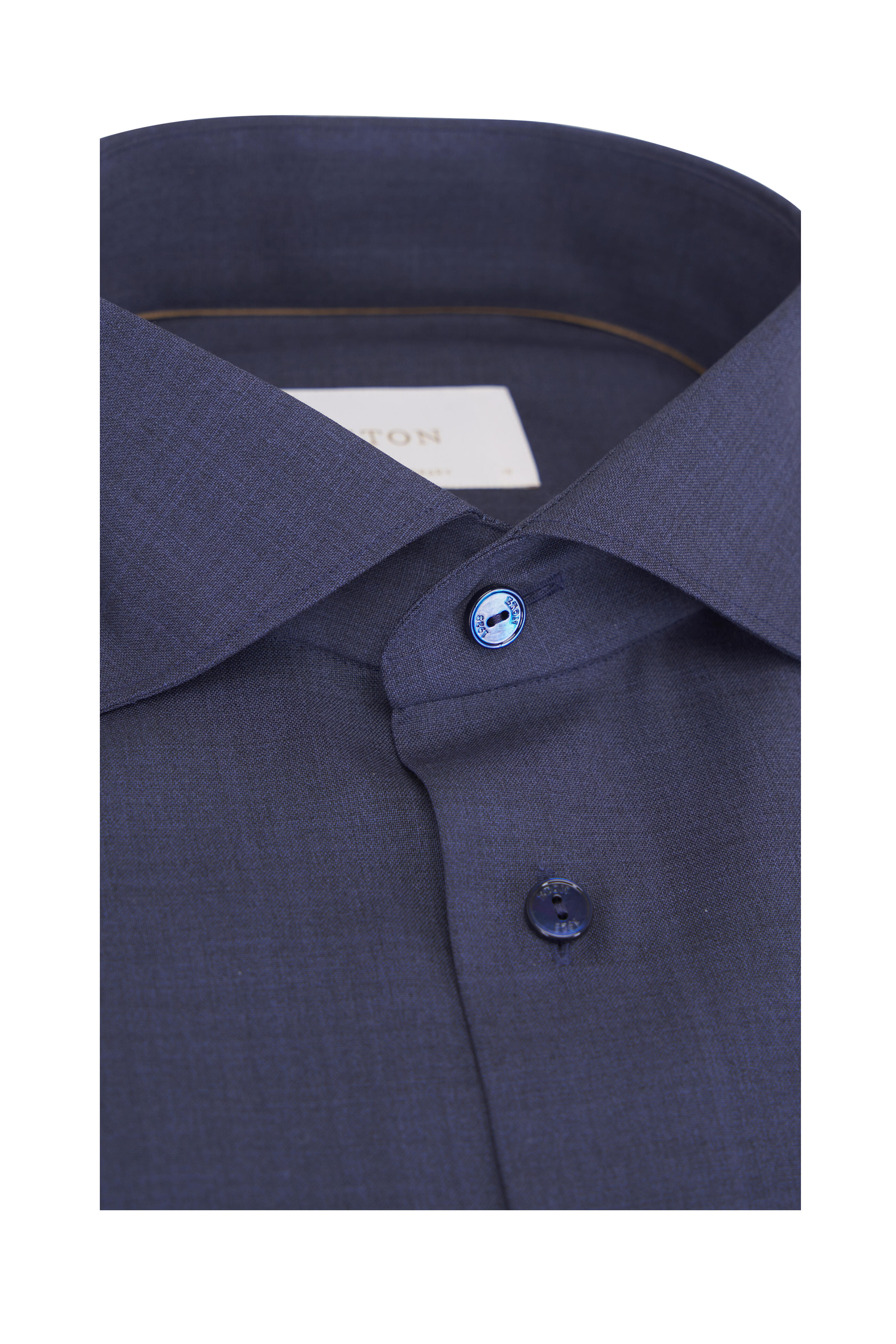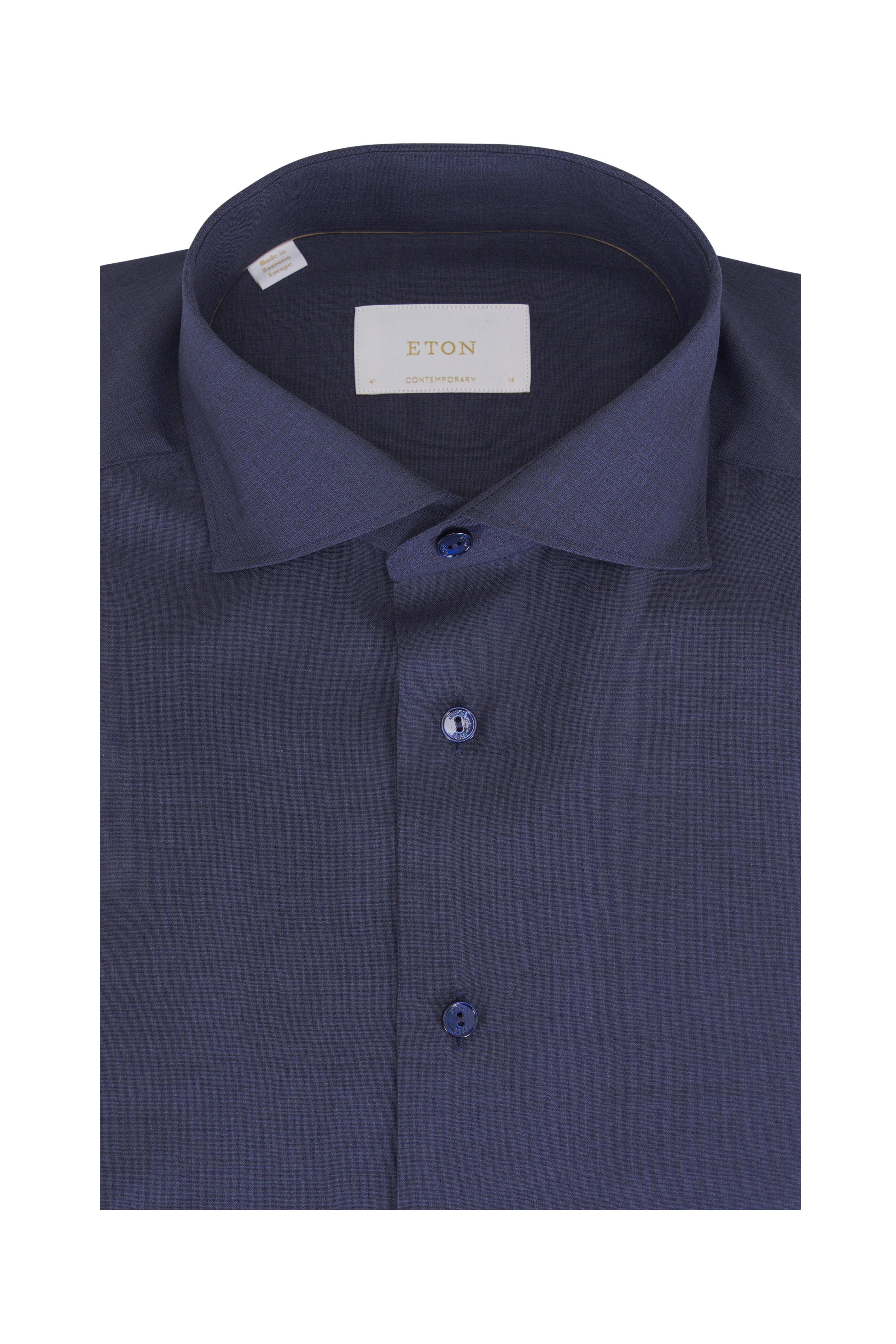 Spread collar. French front button placket. Adjustable single button cuffs. Imported. Contemporary fit. 100% wool. Machine wash.