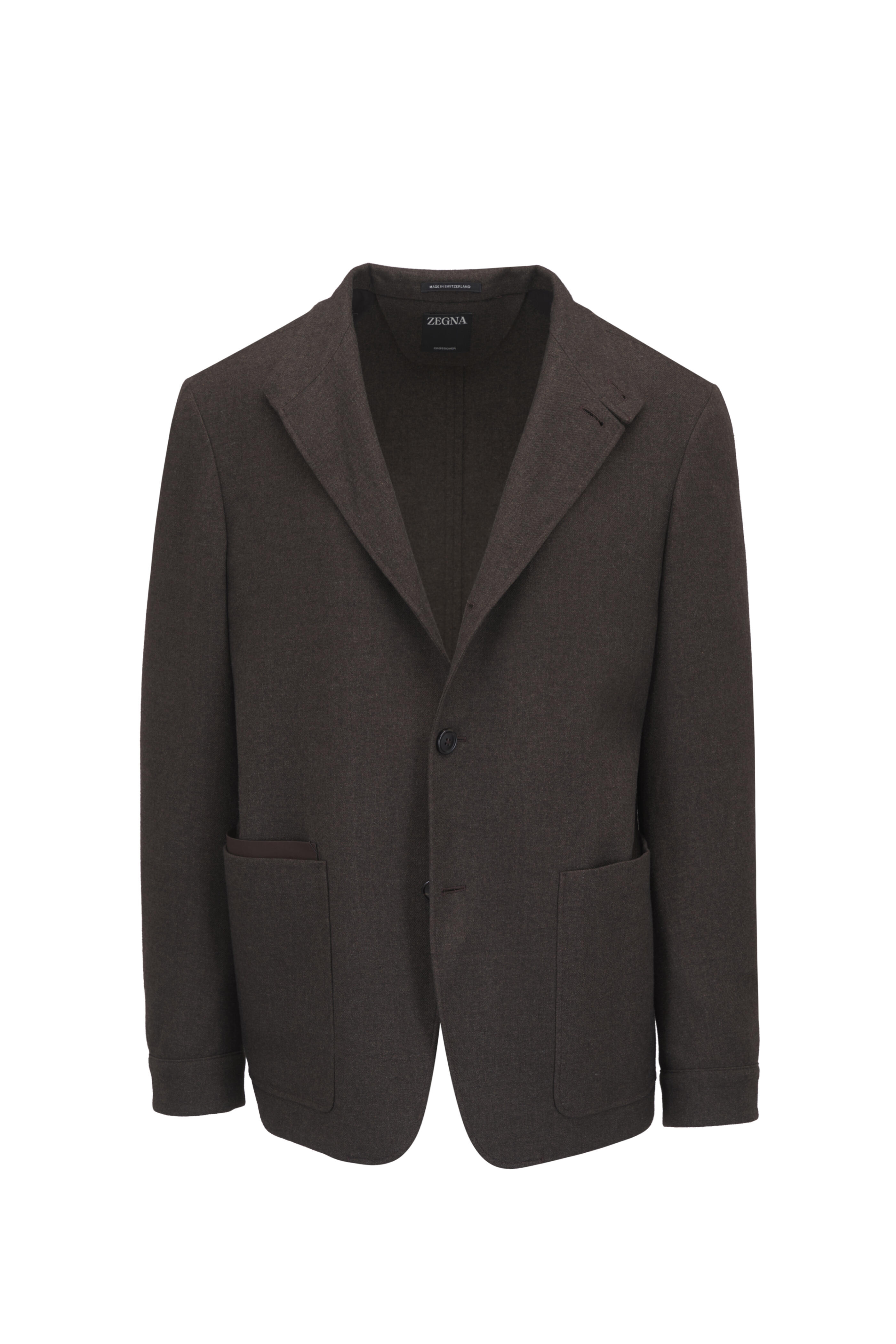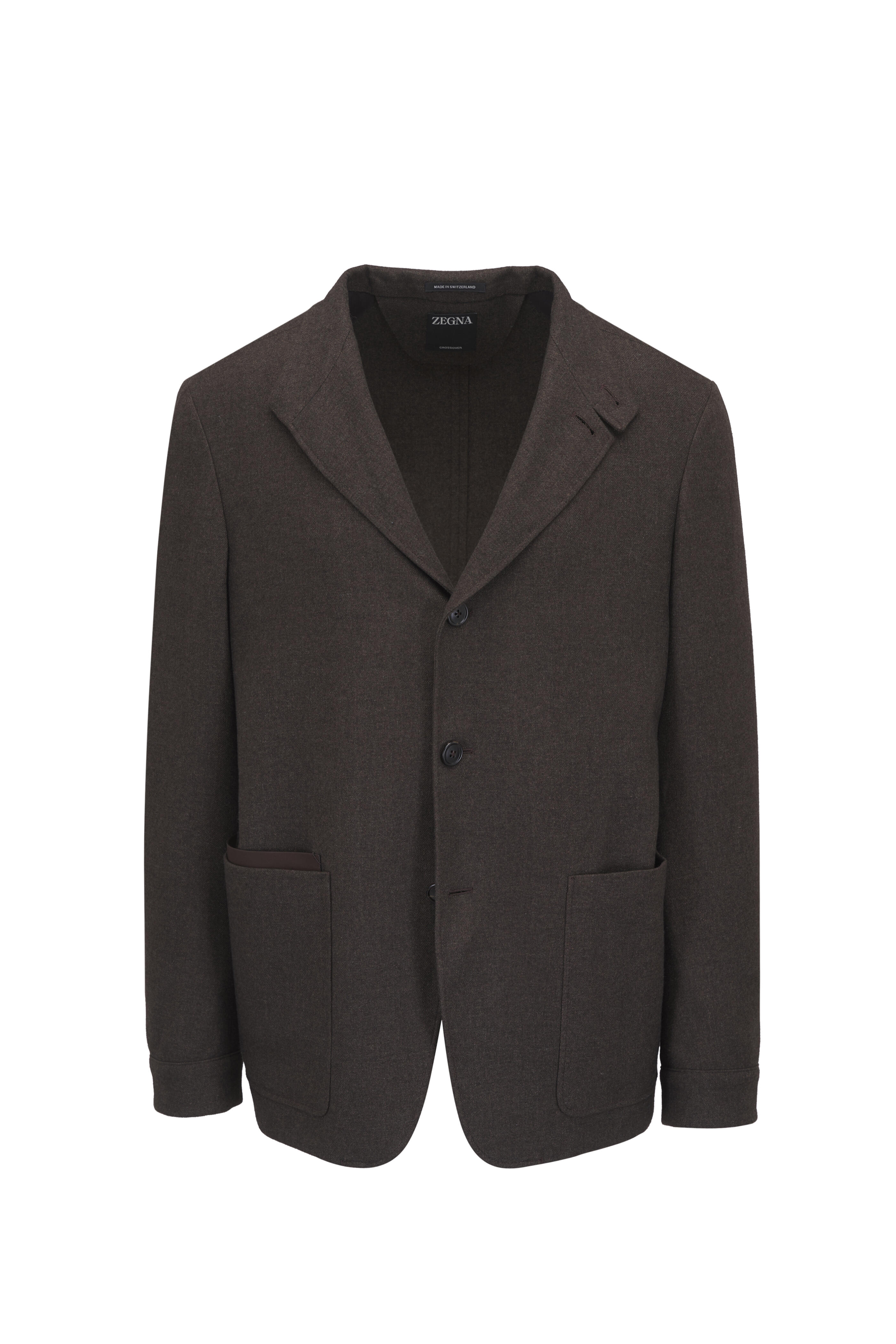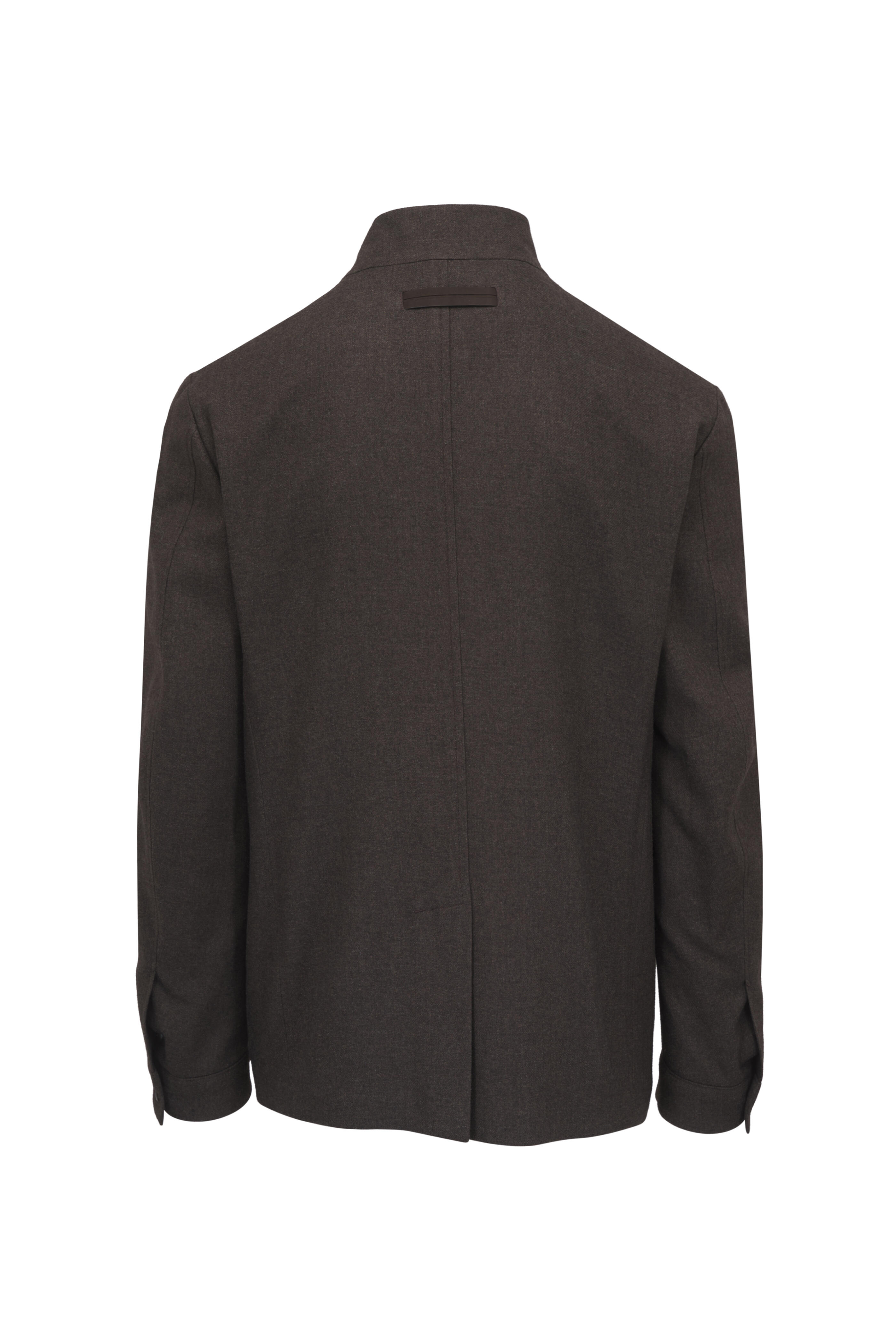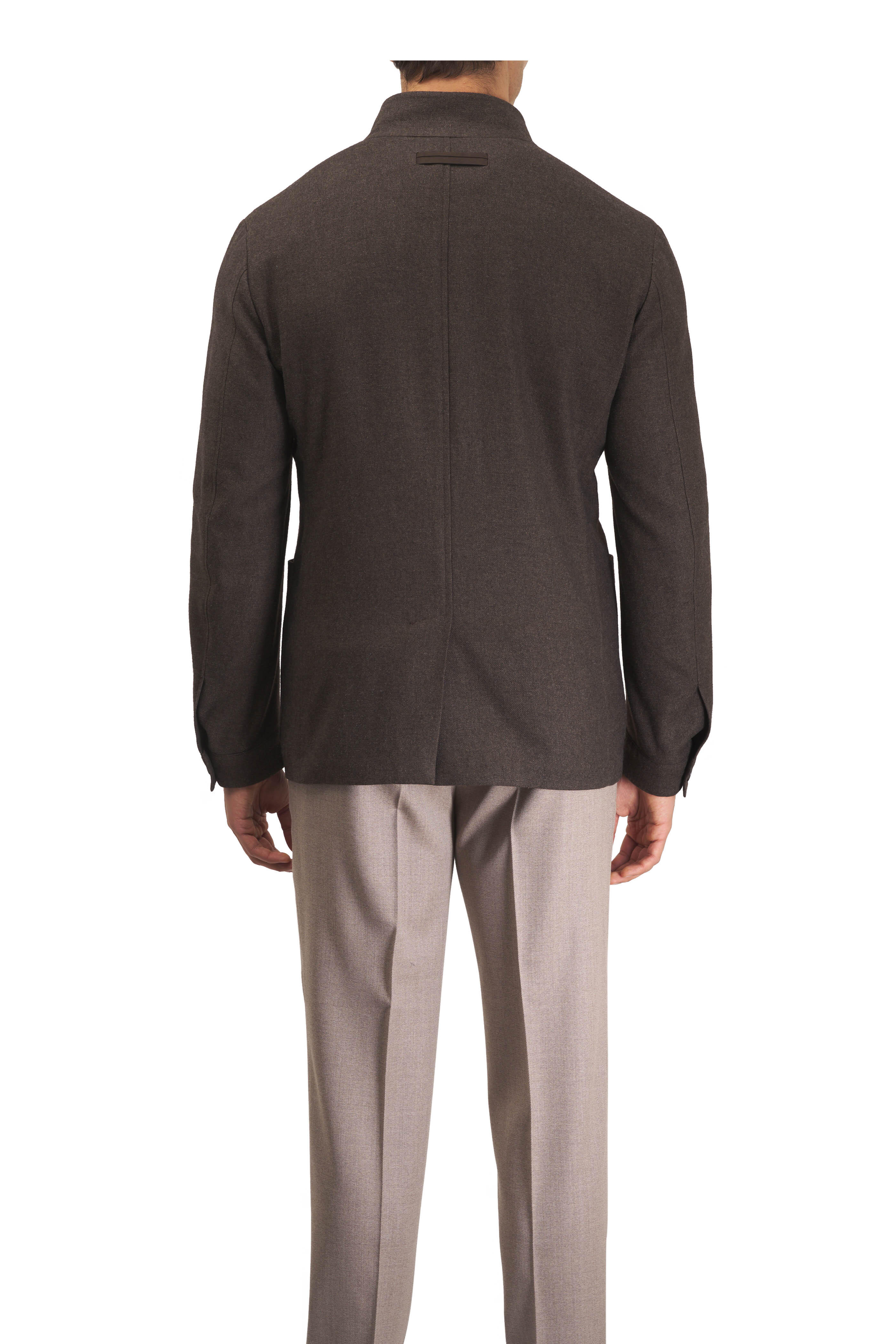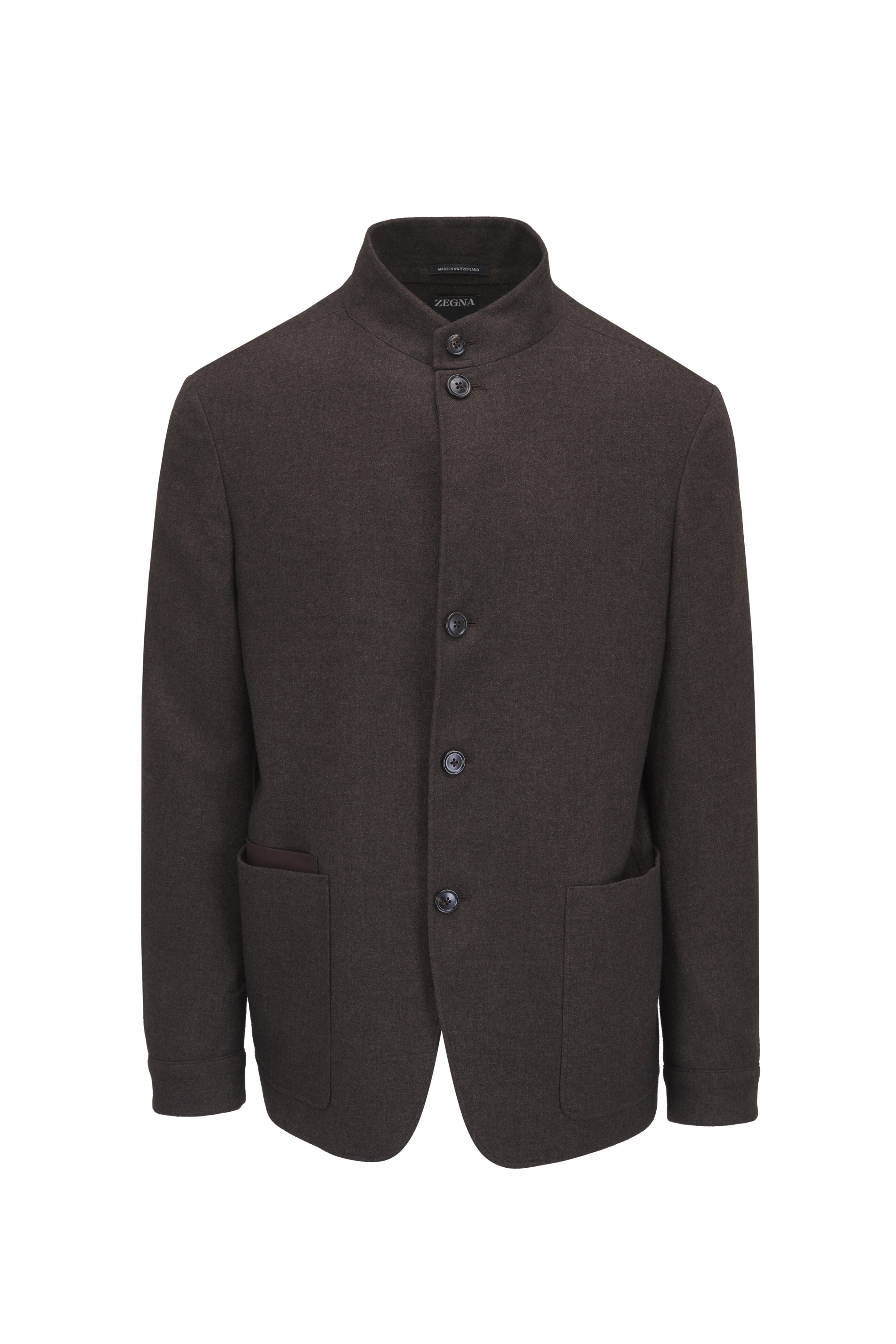 Stand collar. Front button placket. Lower waist patch pockets; internal slip pockets. Single button square cuffs. Back vent. Straight hem. Imported. Shoulder to hem 29" (size 41 R). 40% Wool, 35% silk, 20% linen, 5% cashmere: partially lined. Dry clean.