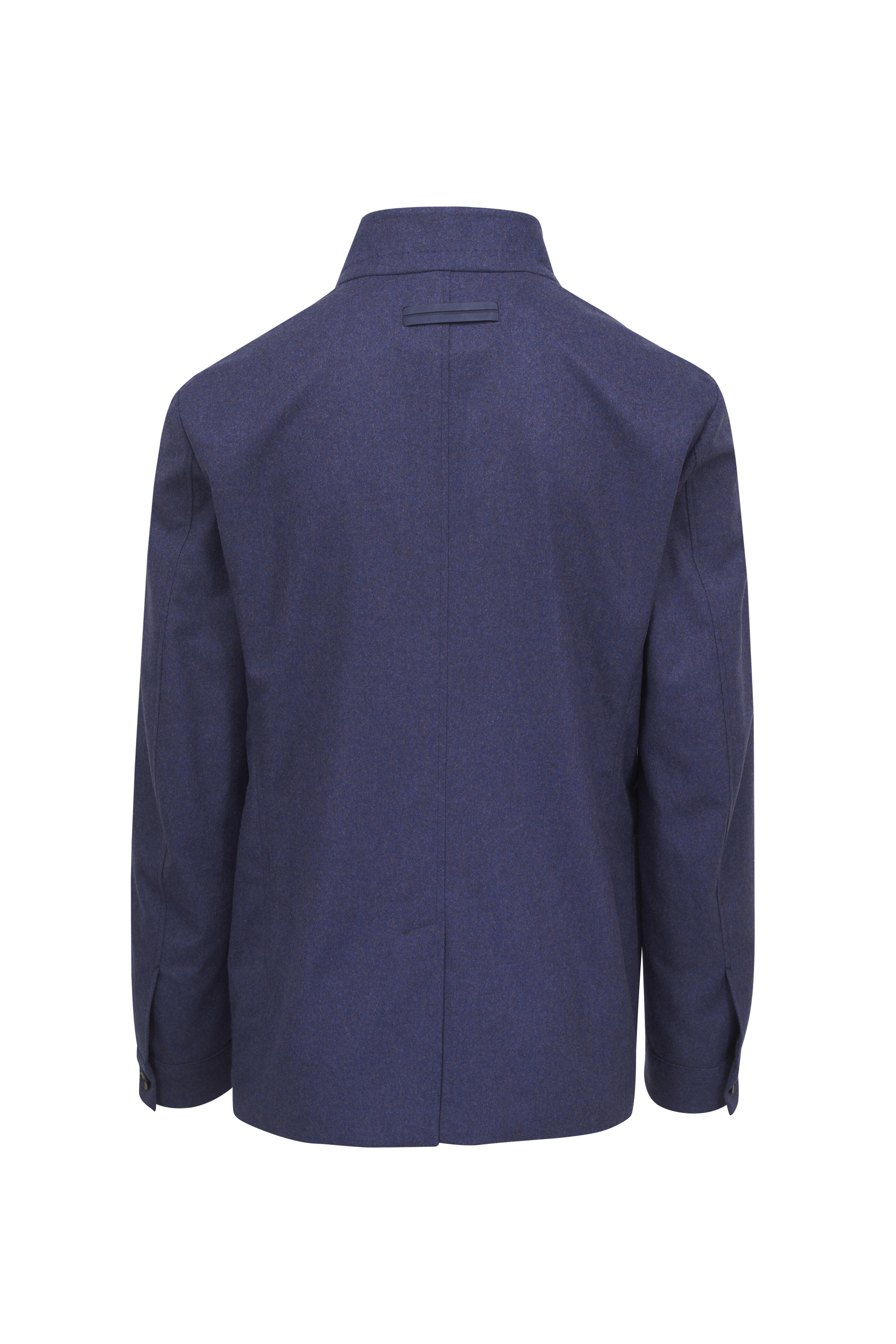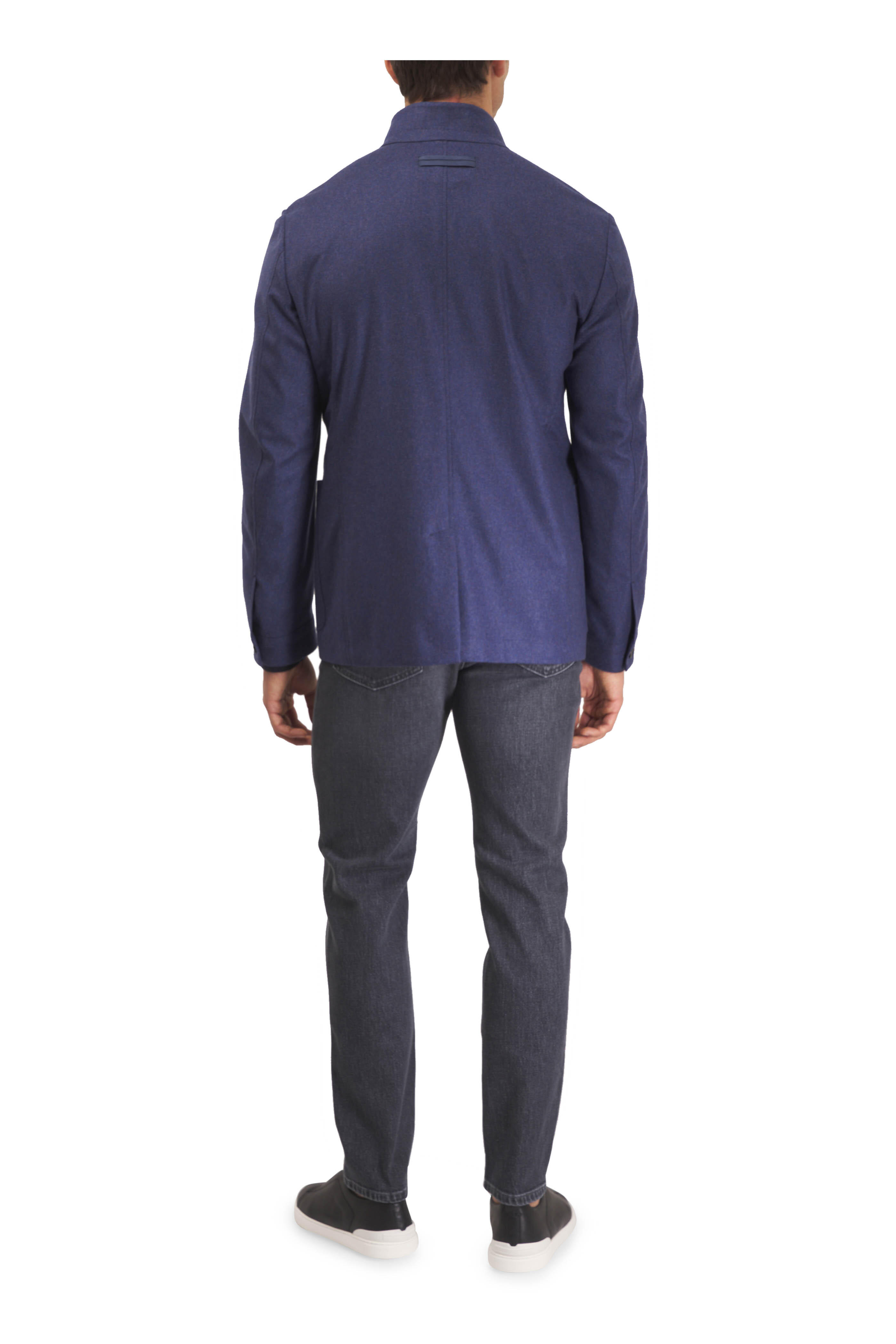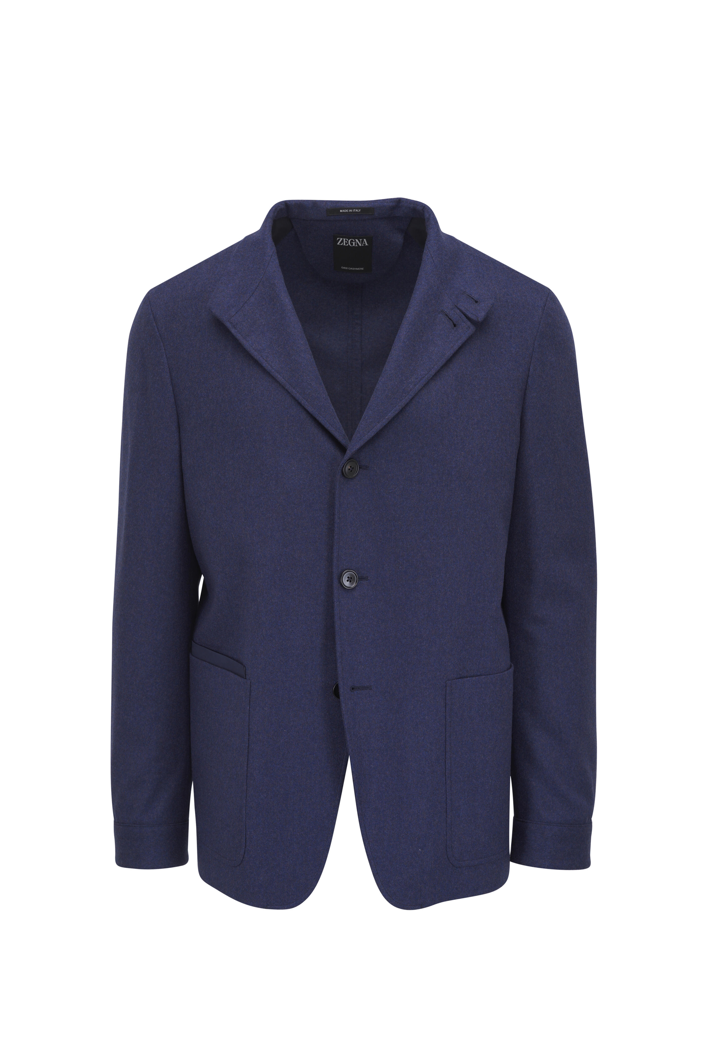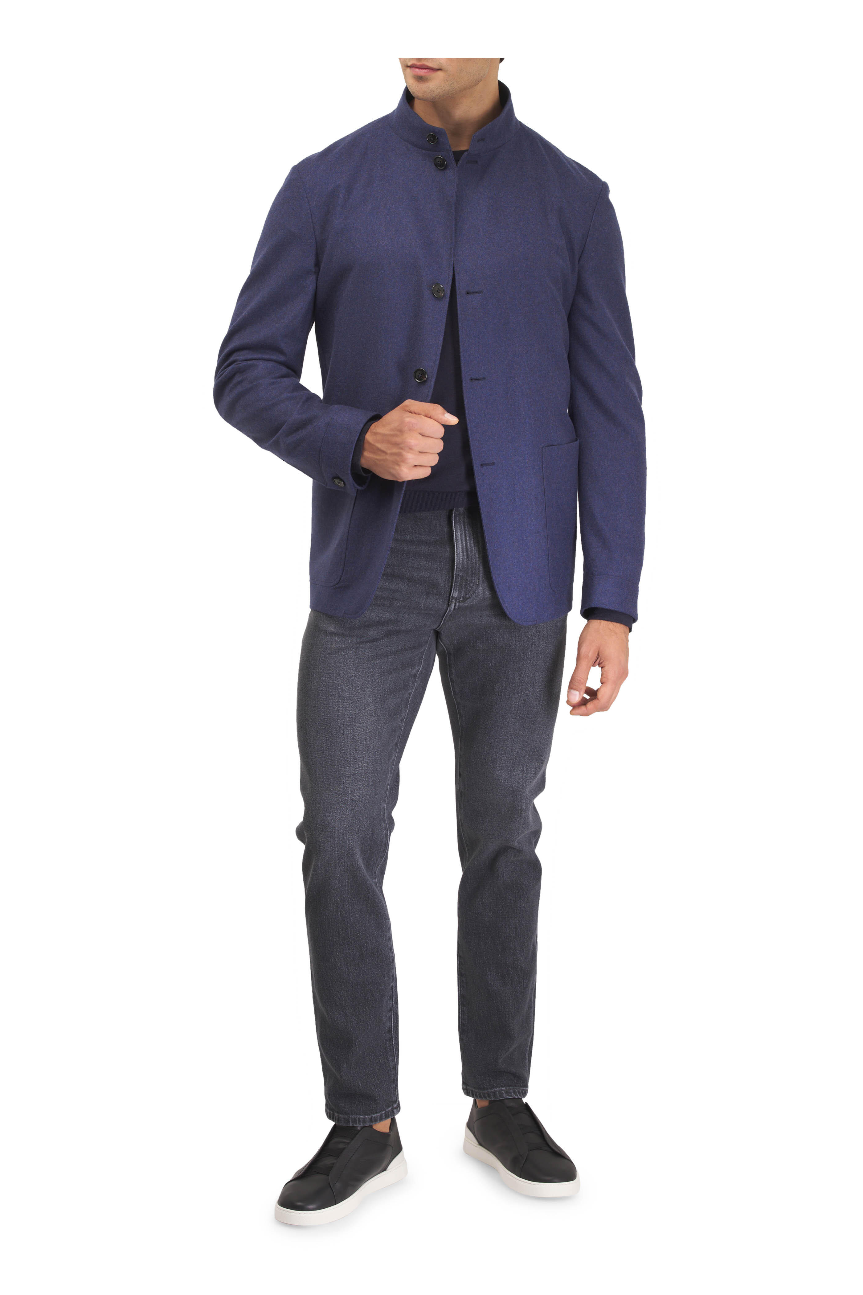 Stand collar with button closure. Front button placket. Lower patch pockets; one double with leather pocket. Single button squared cuffs. Center back vent. Made in Italy. Shoulder to hem 29" (size 41 R). 100% cashmere; partially lined. Dry clean.