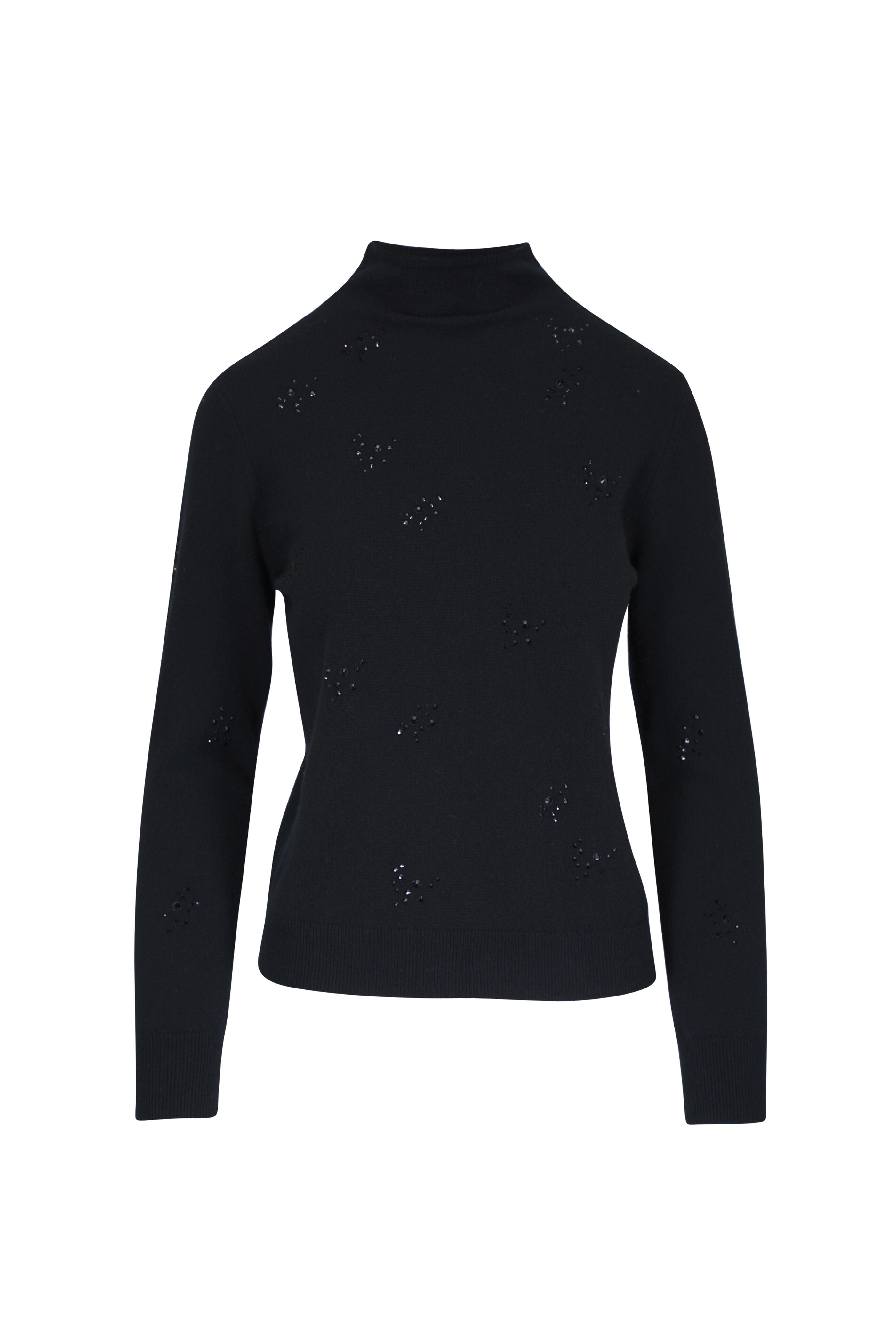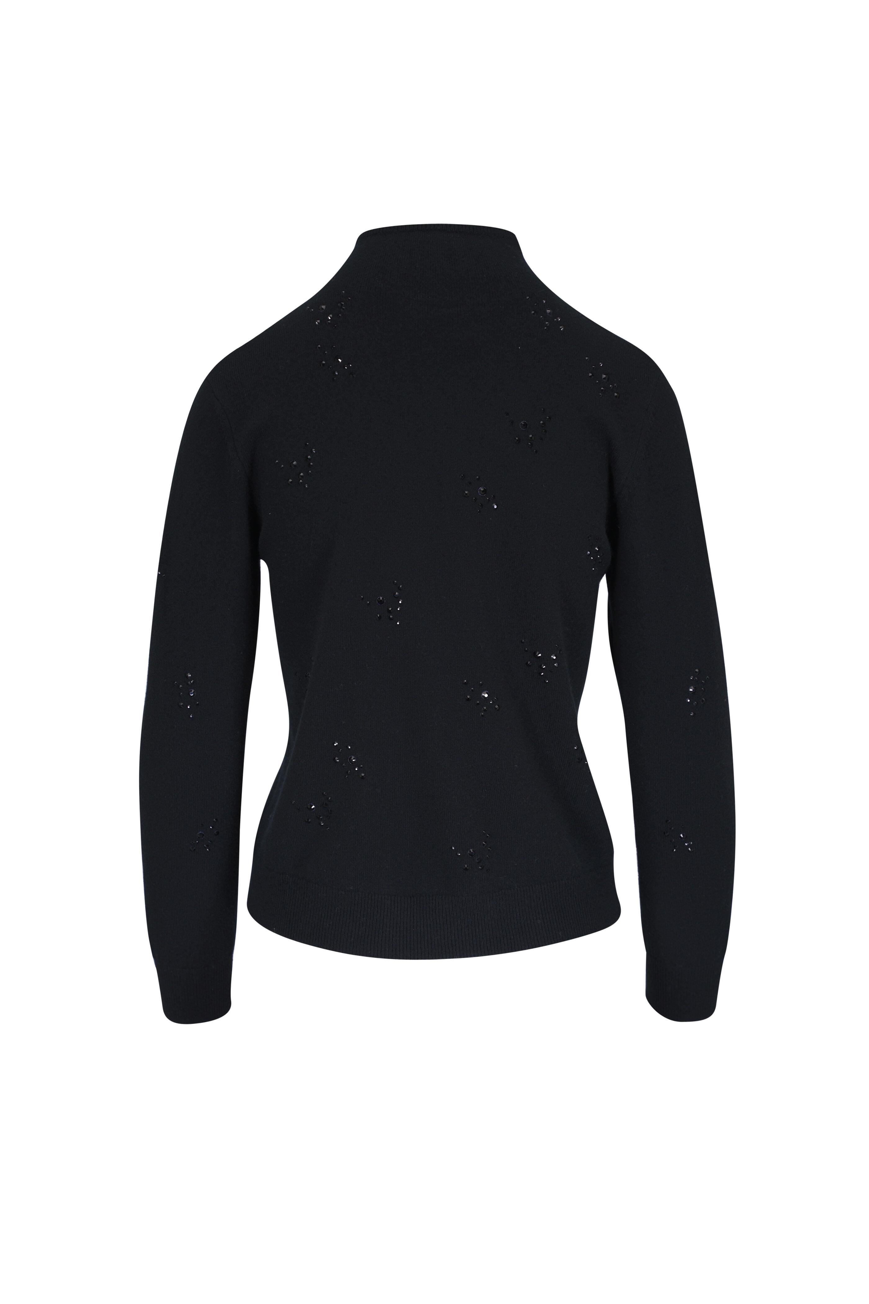 Funnel neckline. Crystal embellishments. Ribbed trims. Imported. 100% cashmere. Hand wash.