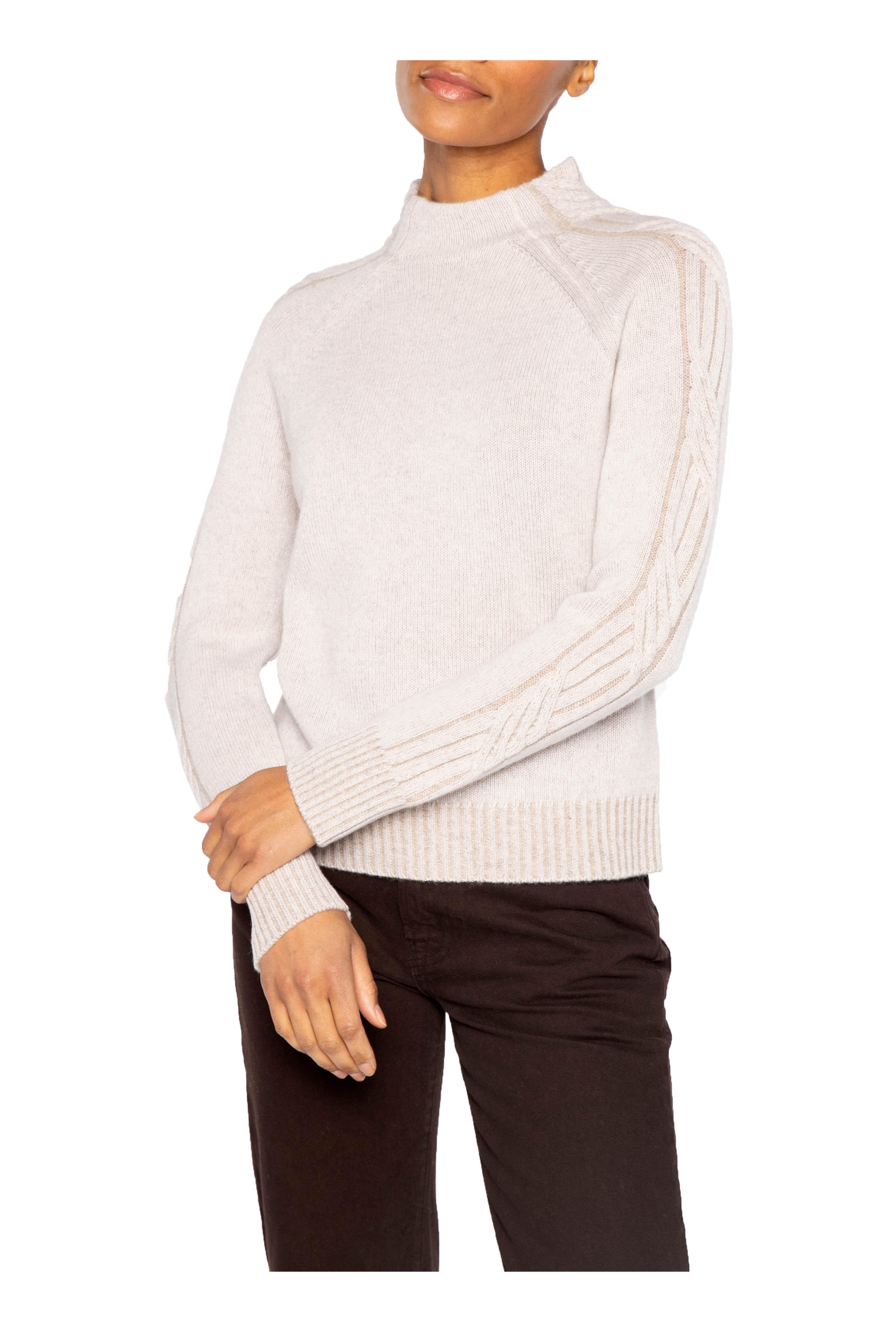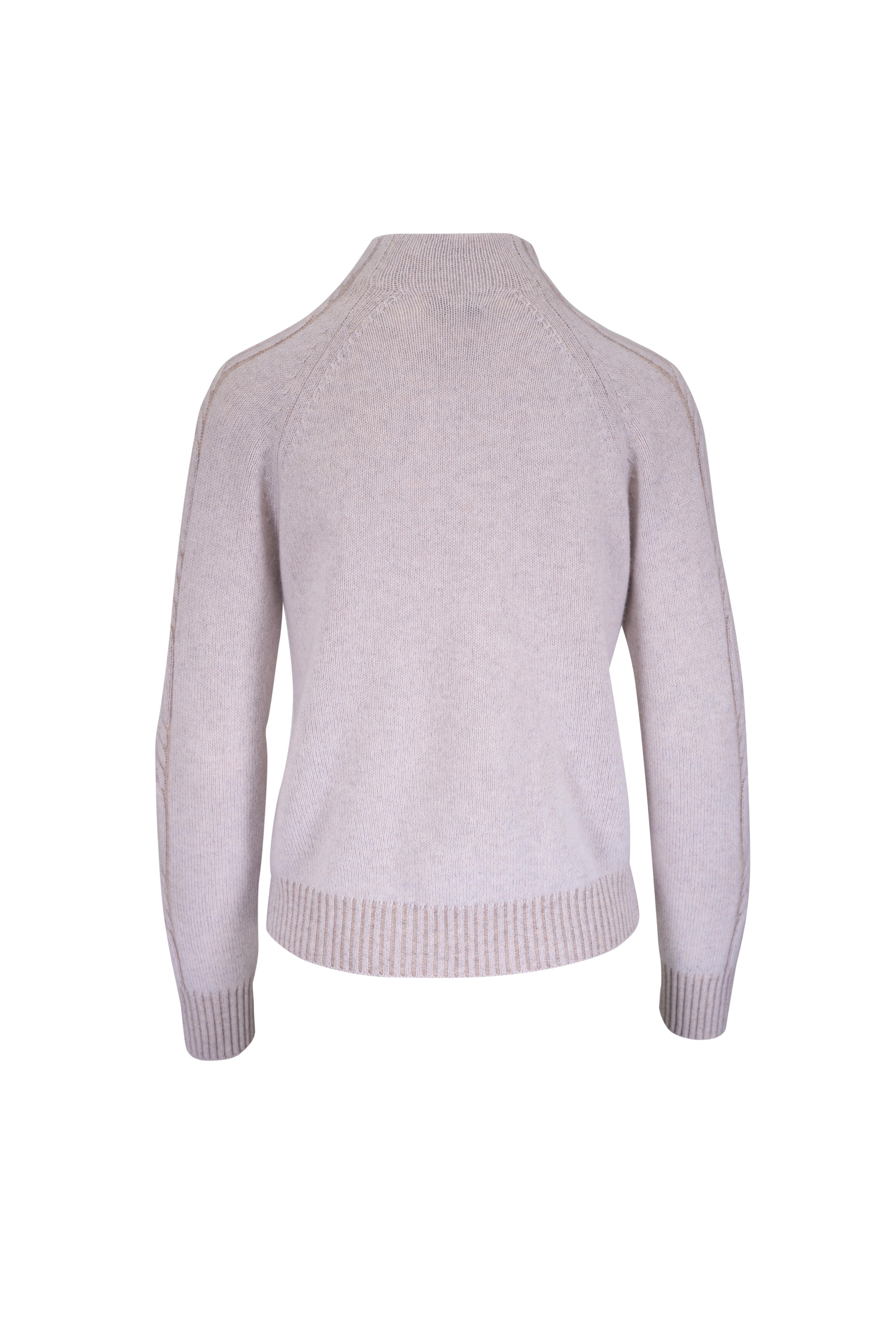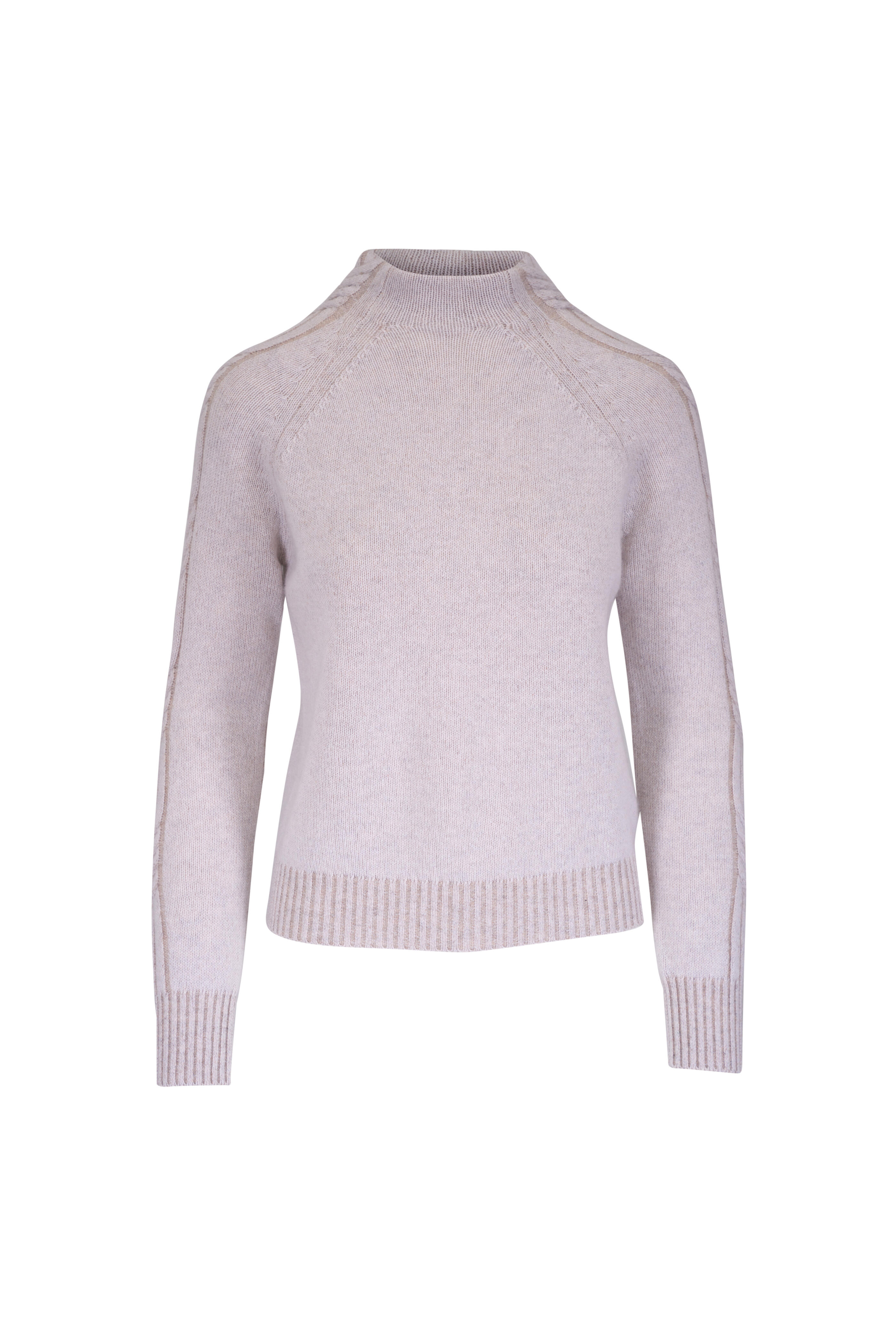 Funnel neckline. Plaited sleeves. Ribbed trims. Imported. 100% cashmere. Dry clean.