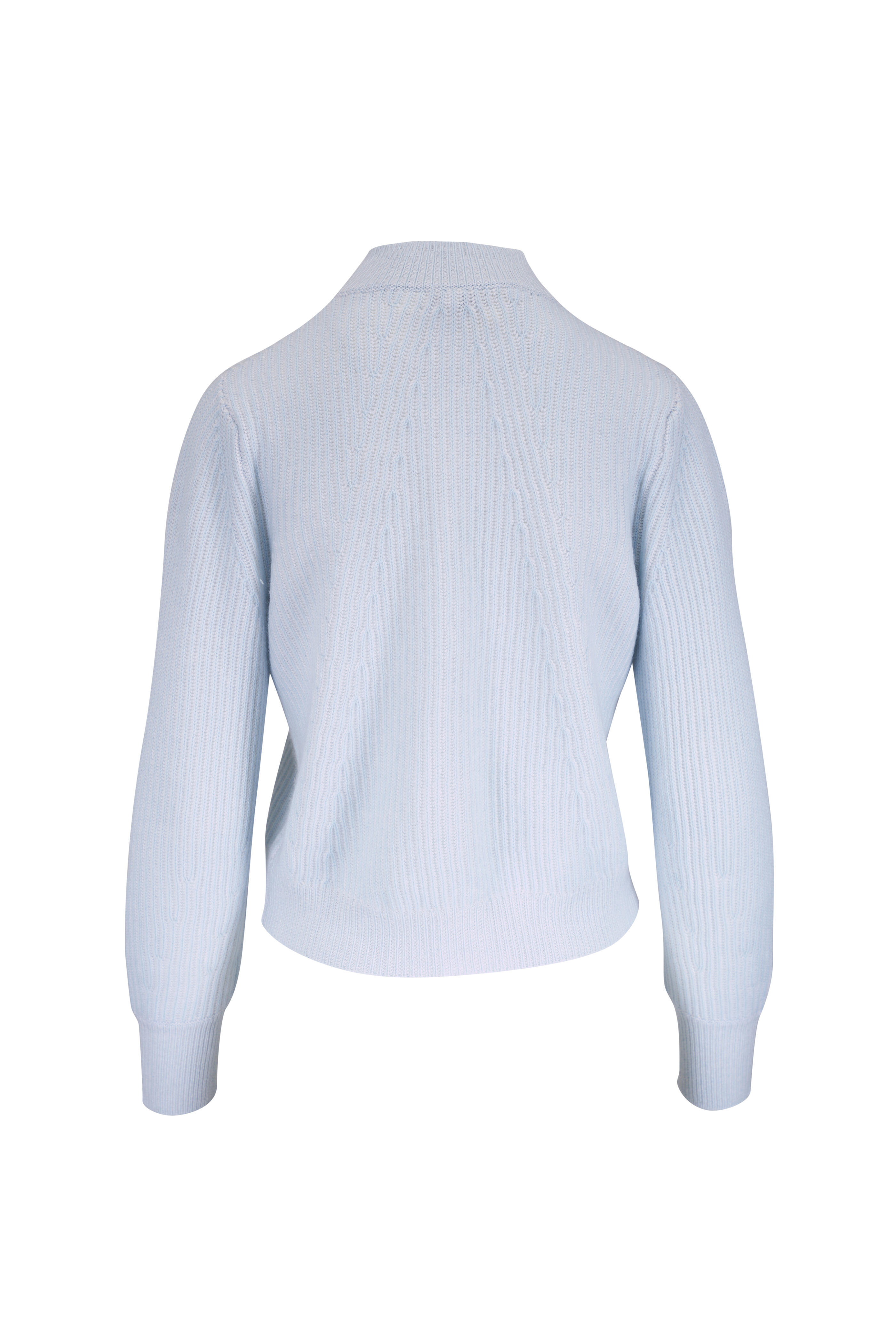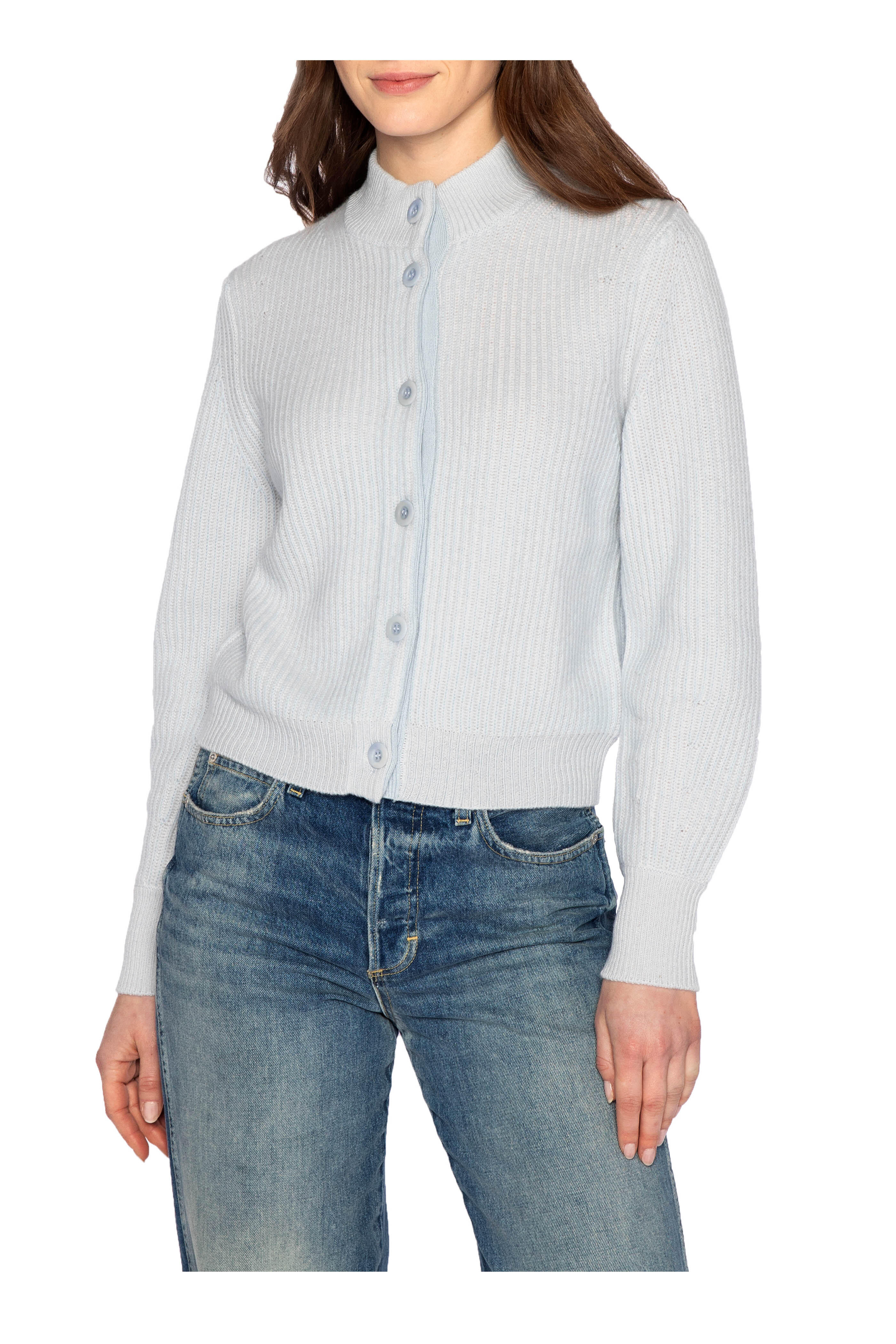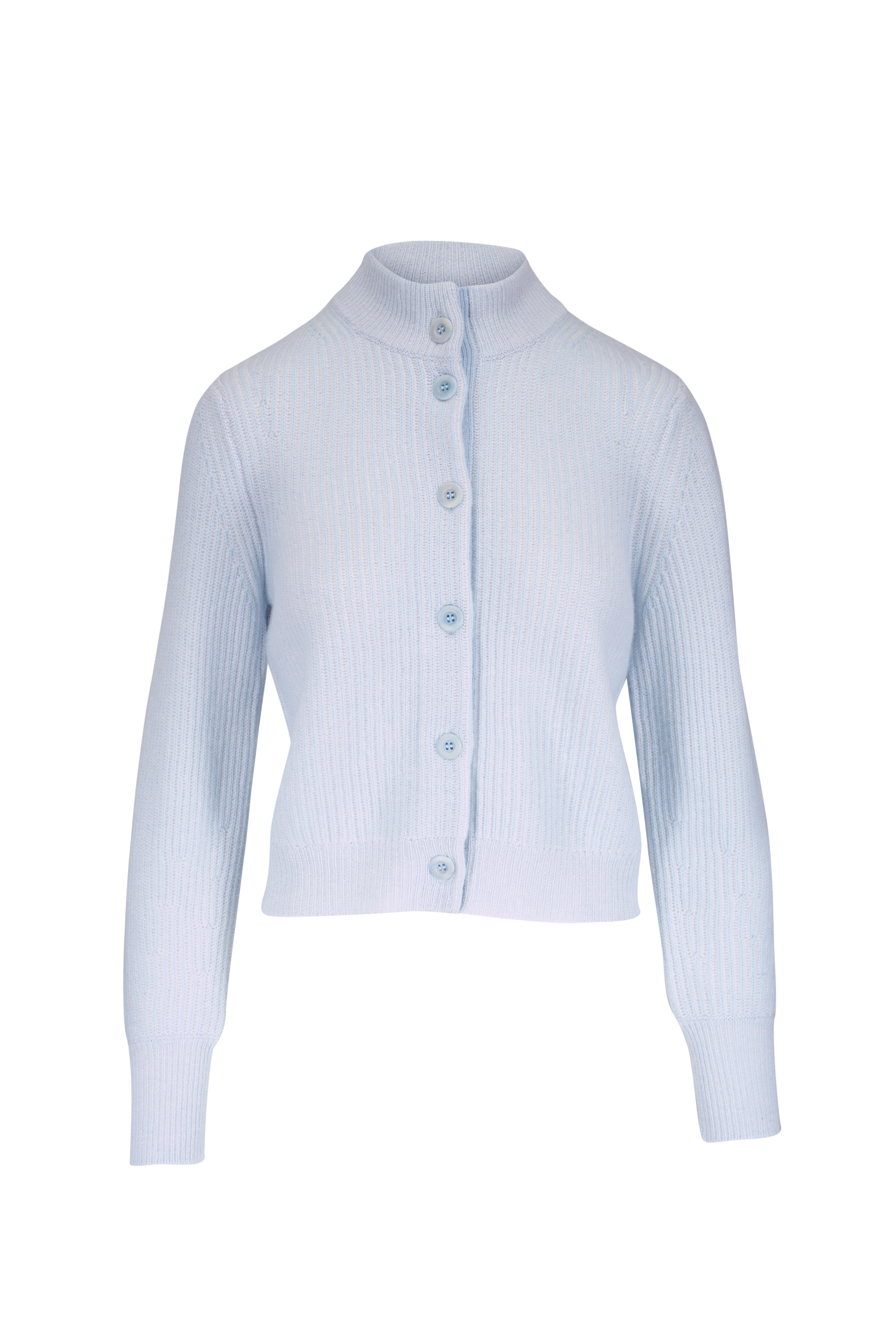 Stand collar. Front button placket. Imported. 100% cashmere. Dry clean.