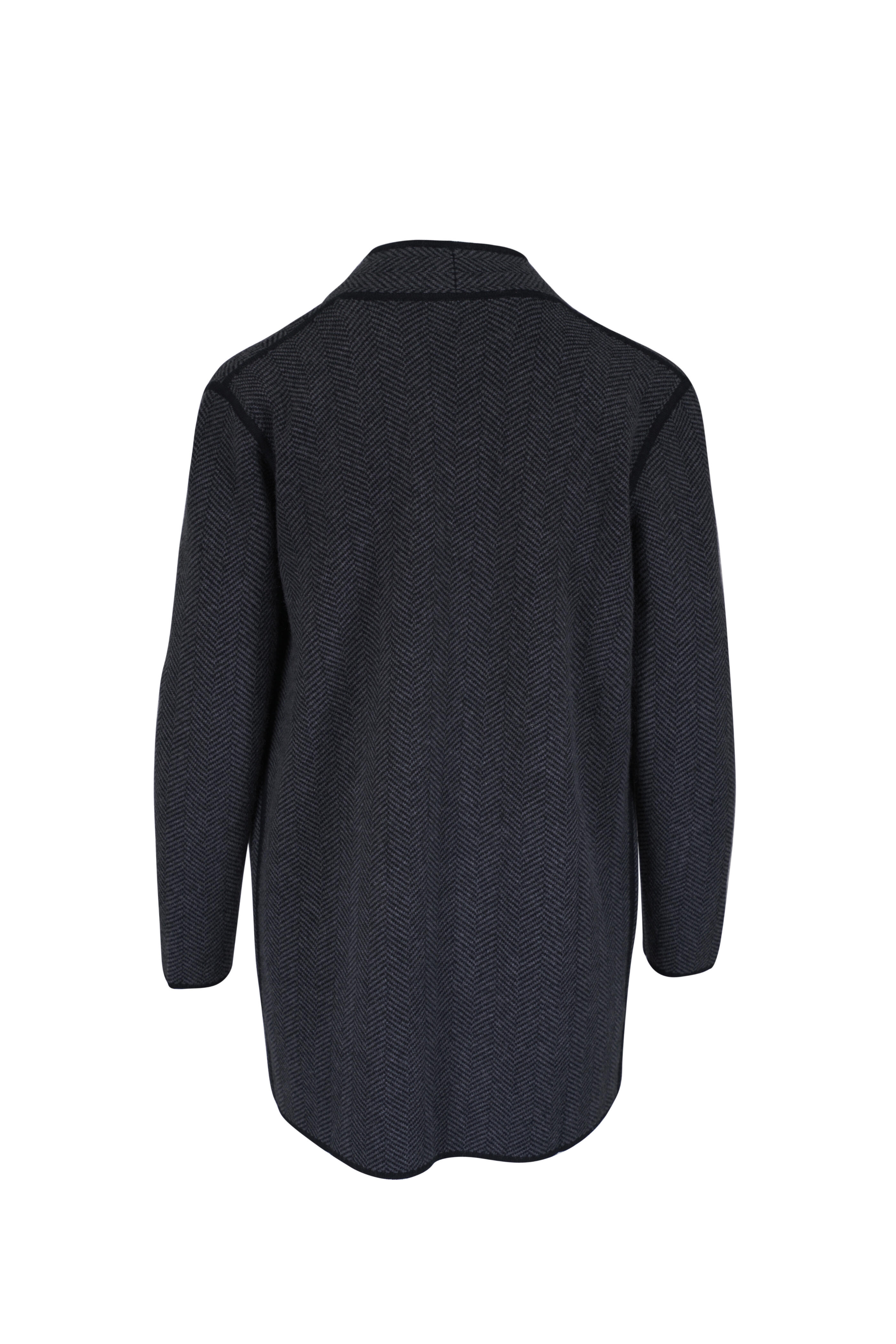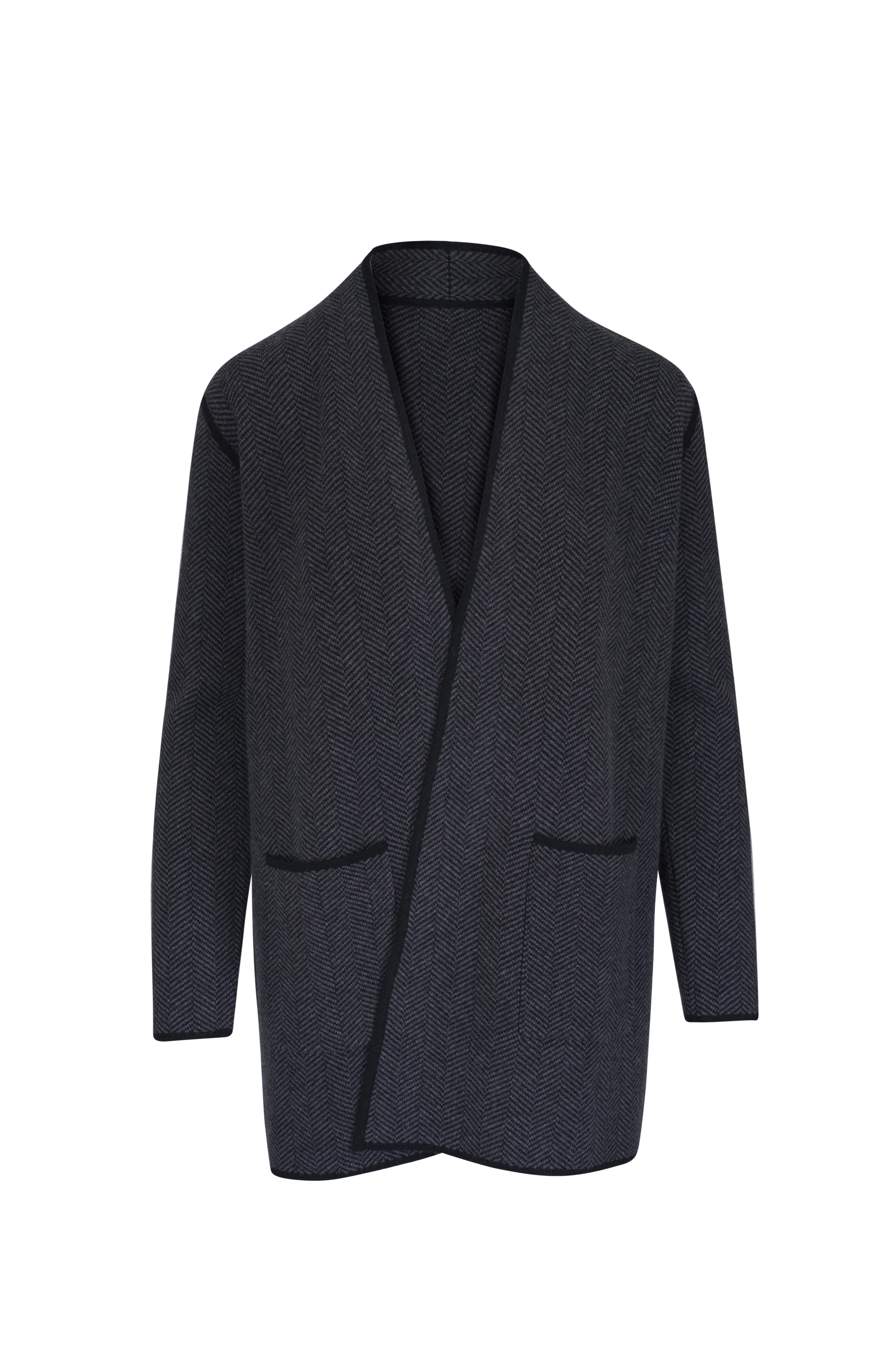 Open front. Lower patch pockets. Imported. 100% cashmere. Dry clean.