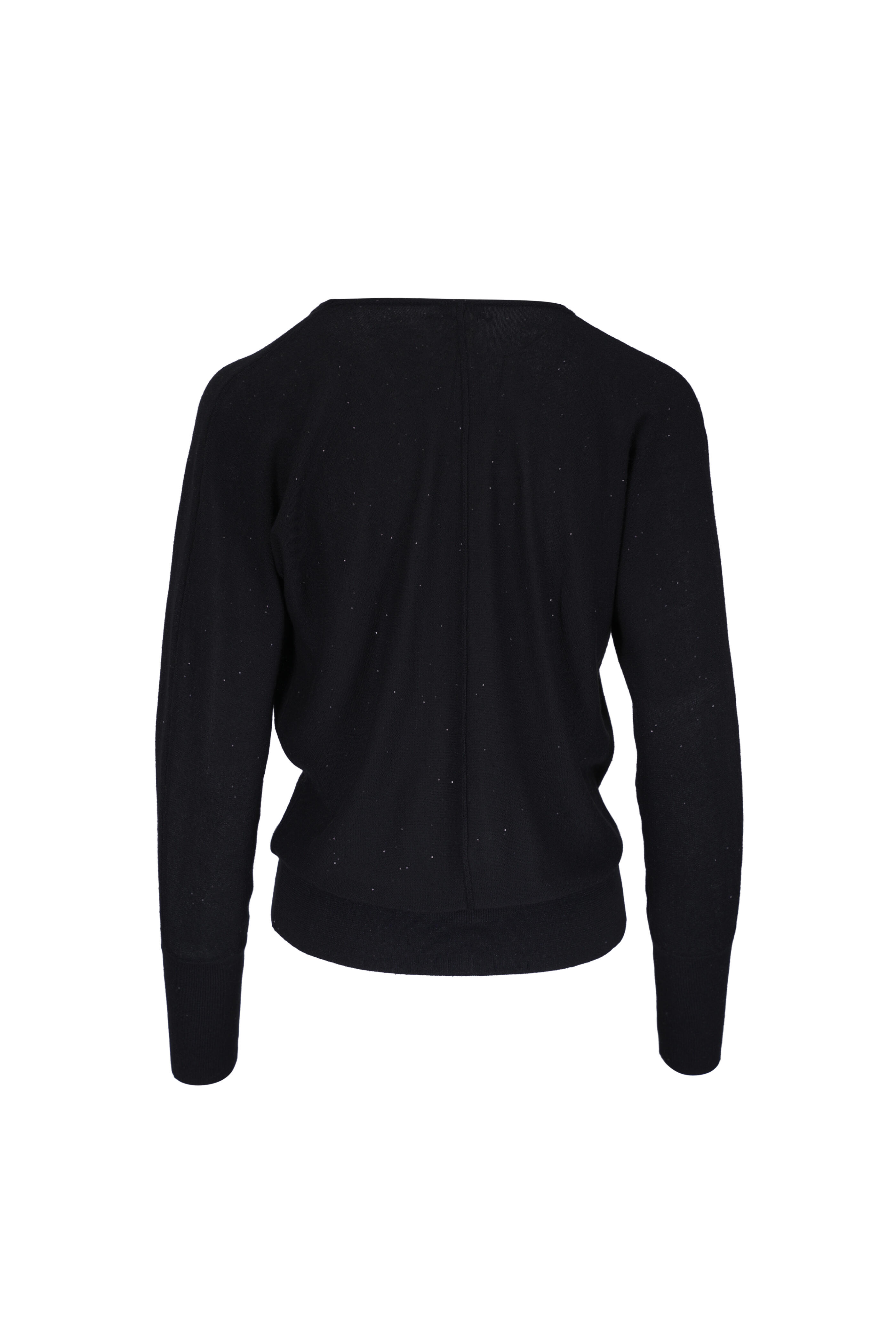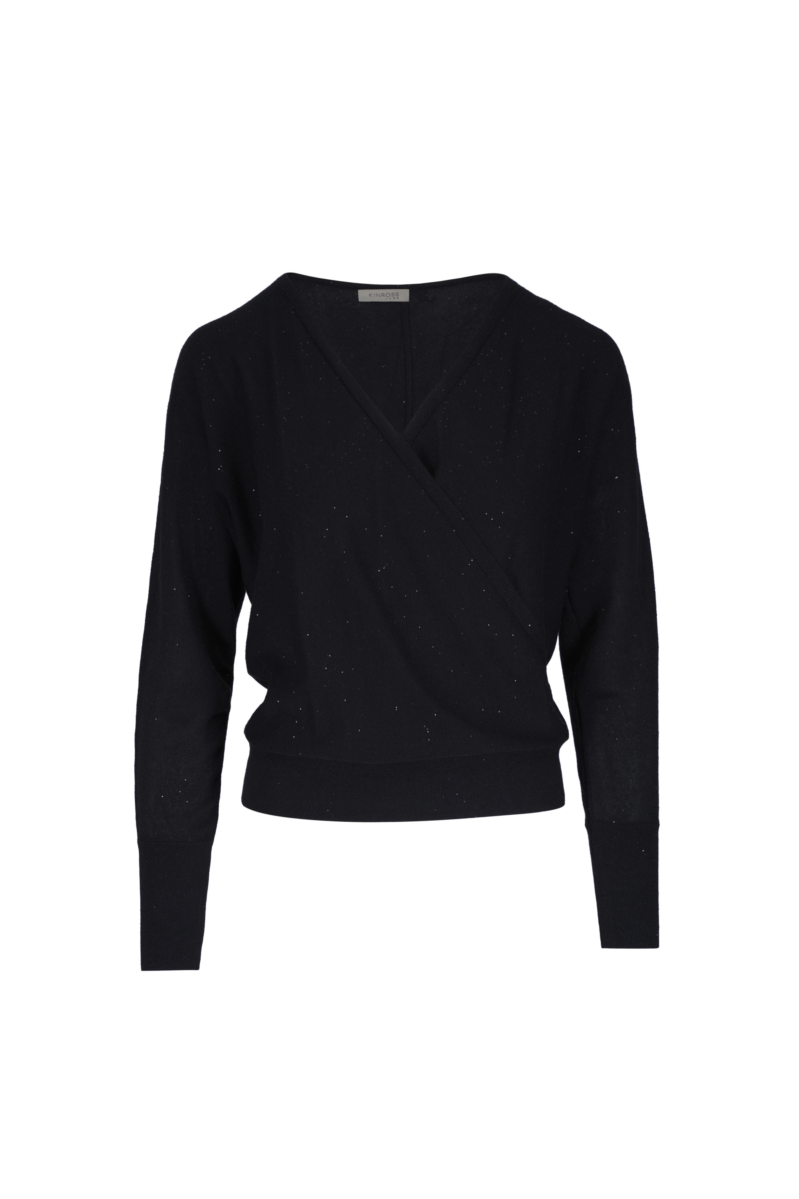 Surplice neckline. Ribbed trims. Imported. 60% lyocell, 24% polyester, 10% cashmere, 6% polyamide. Hand wash.