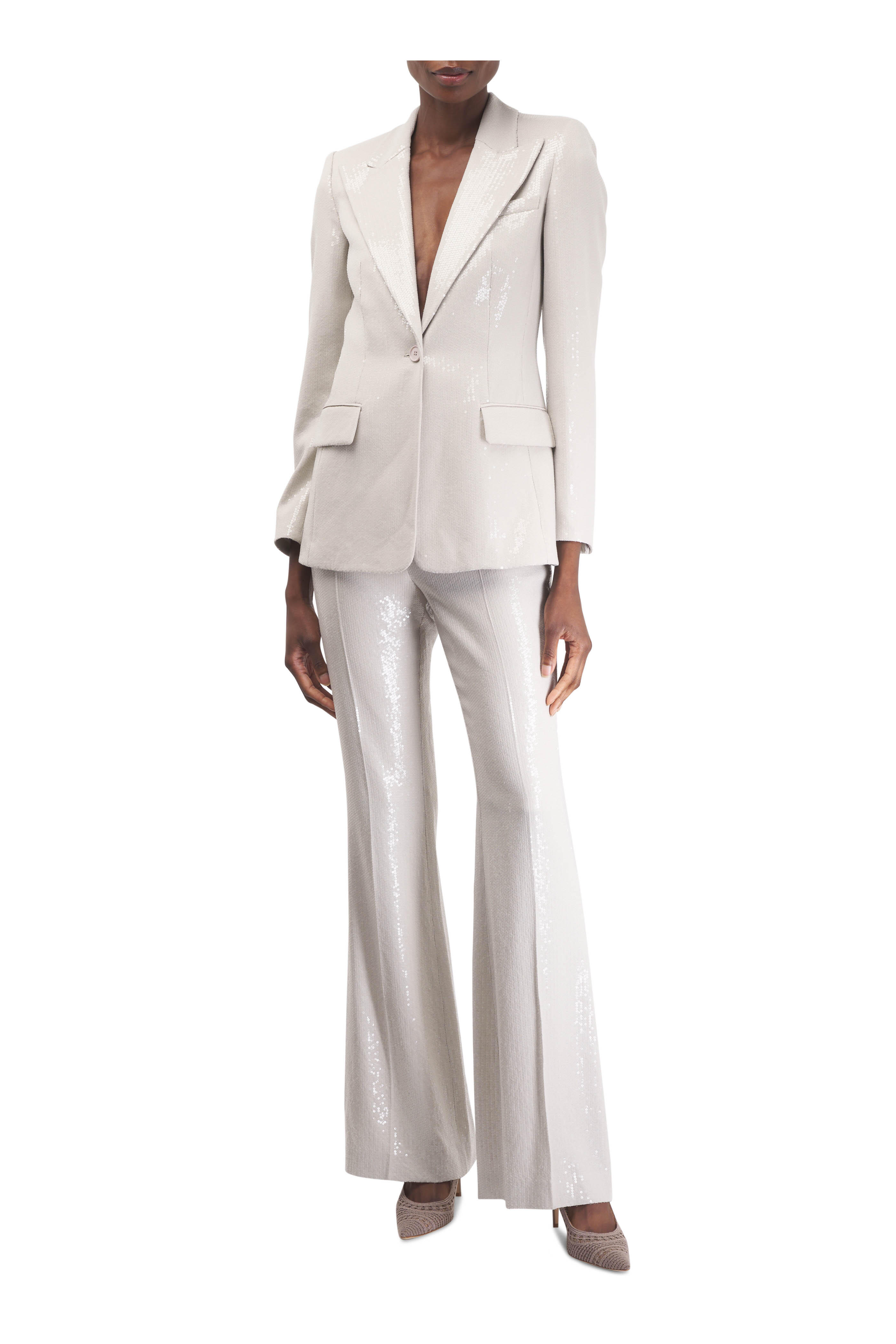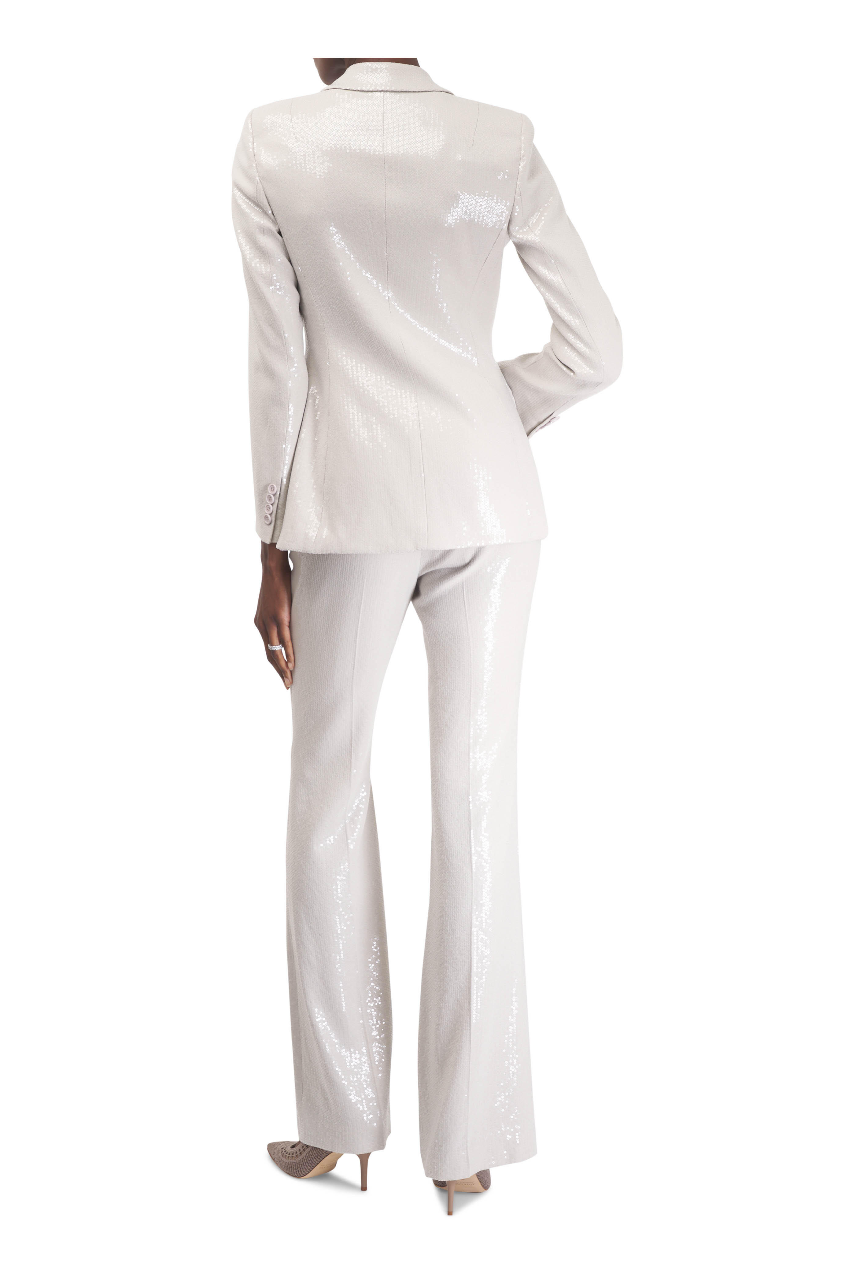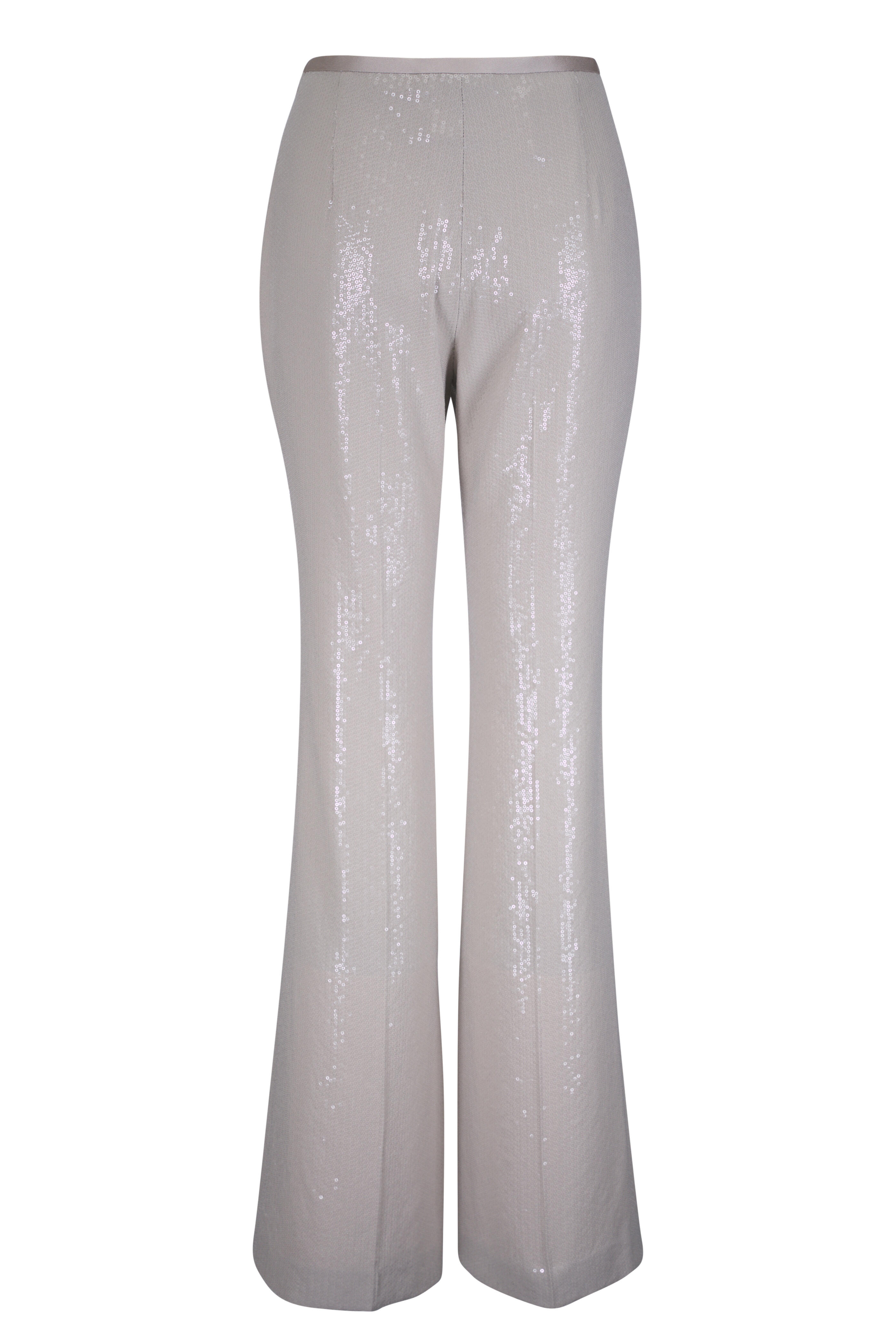 Banded waist. Concealed side zip closure. Creased front & back seam. All over sequin. Flared hem. Made in Italy. 35" Inseam (size 4). 53% acetate, 47% viscose; partially lined. Dry clean.