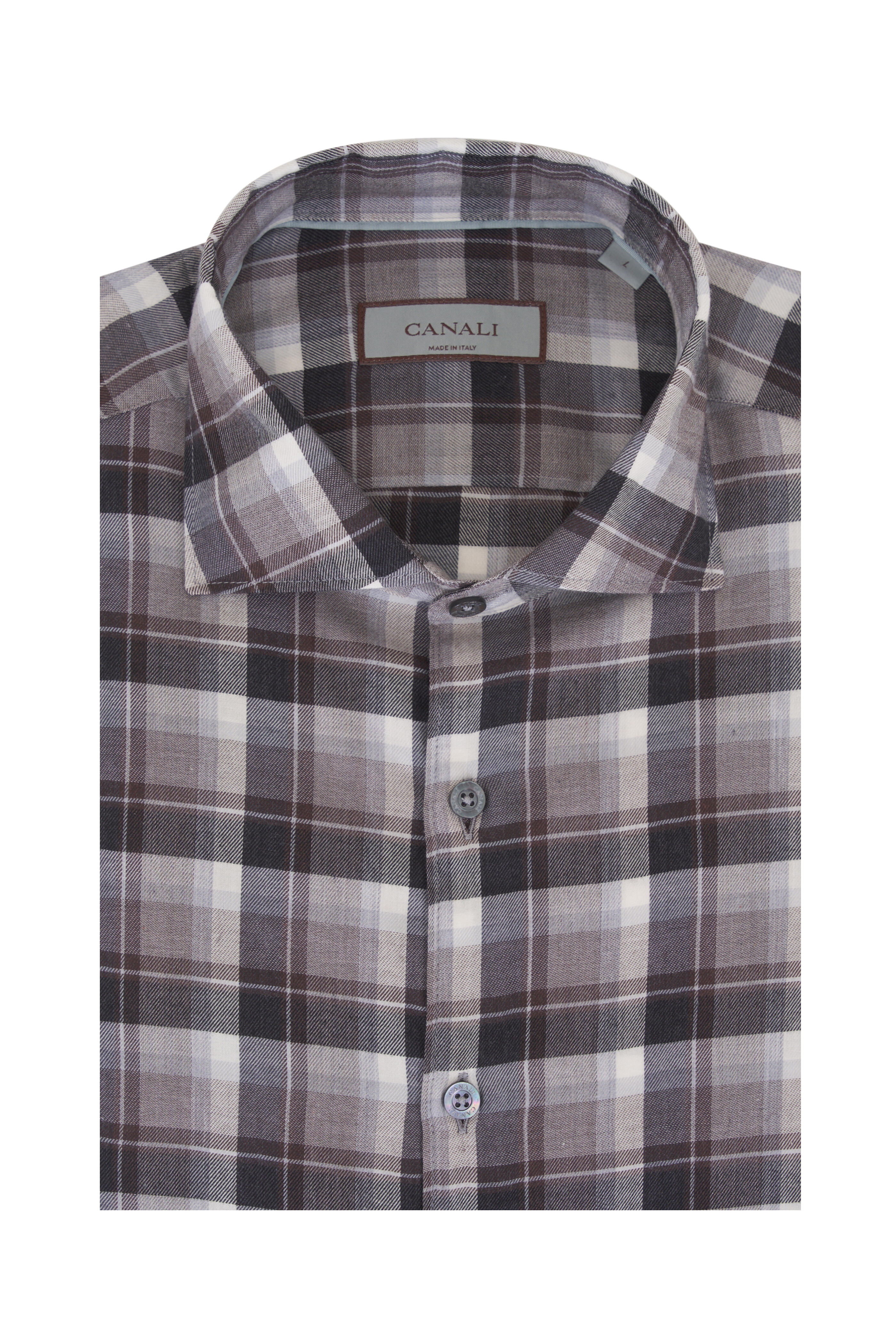 Spread collar. French front button placket. Single button barrel cuffs. Made in Italy. 100% cotton. Machine wash.