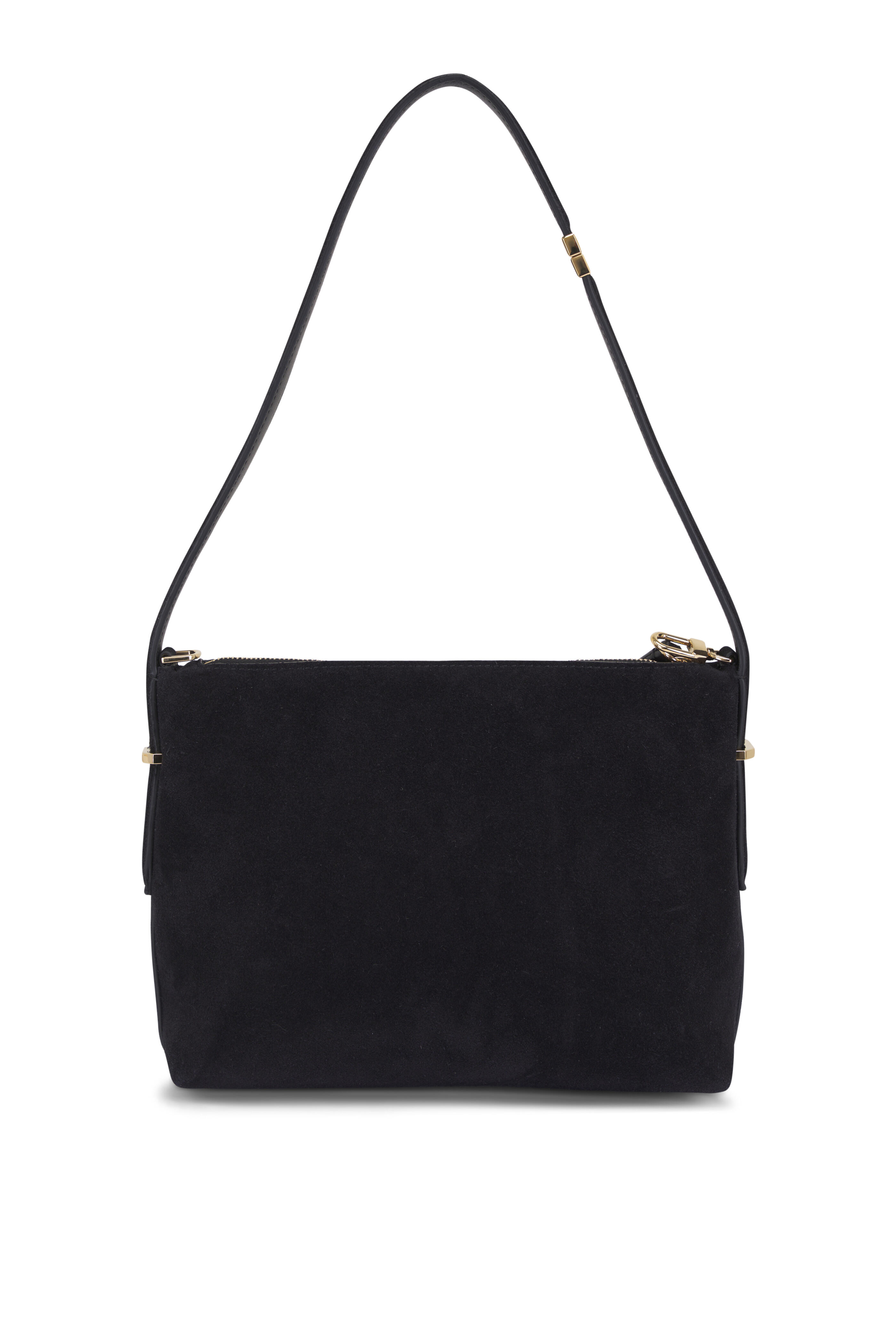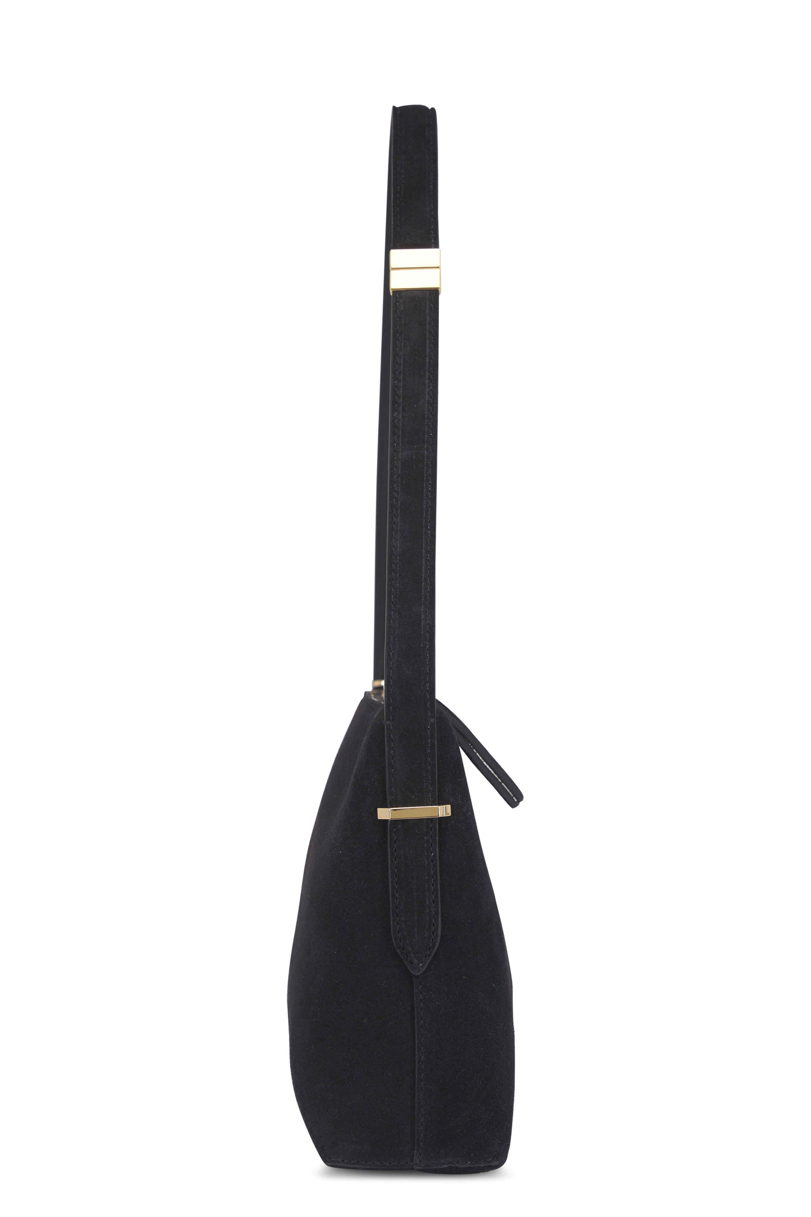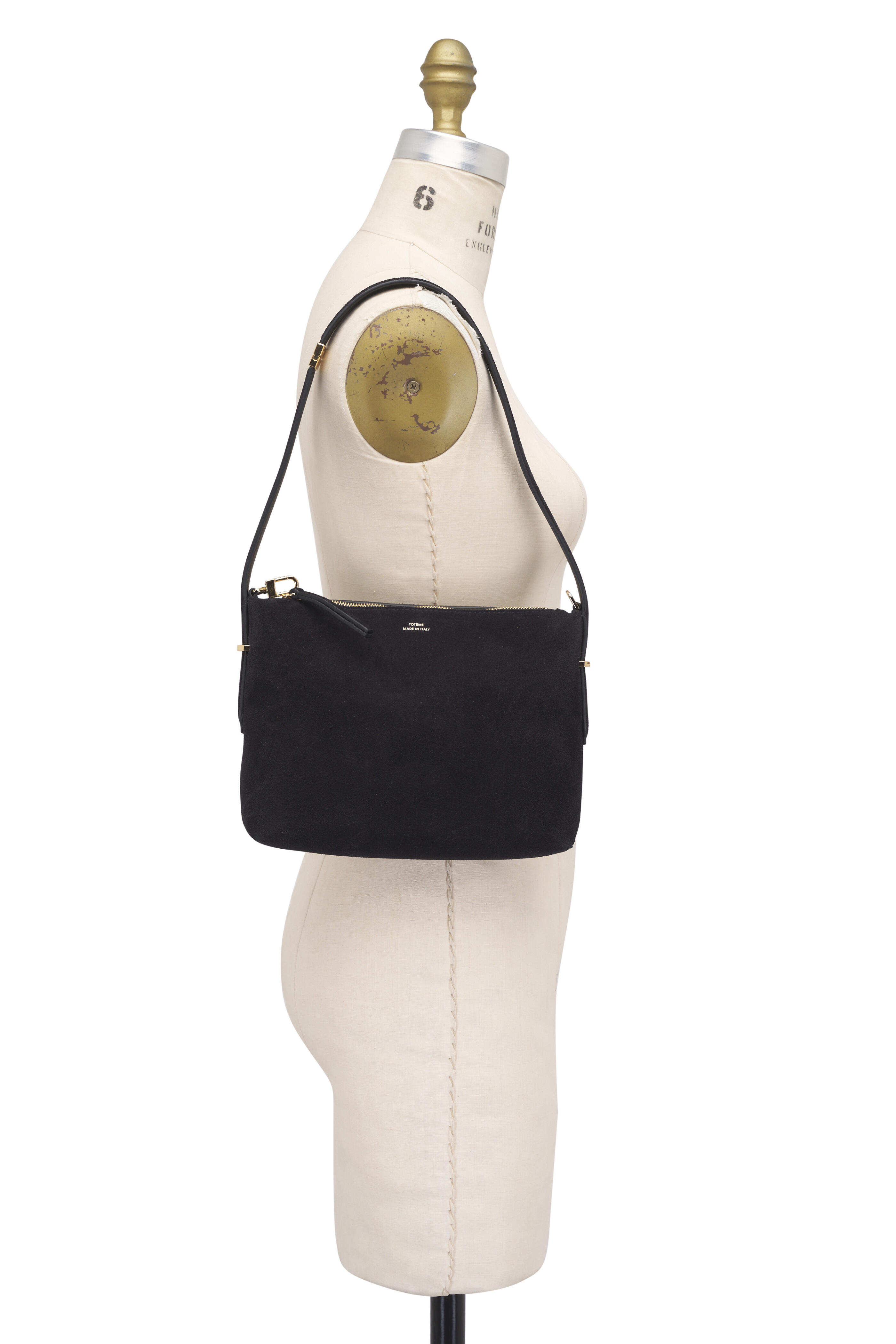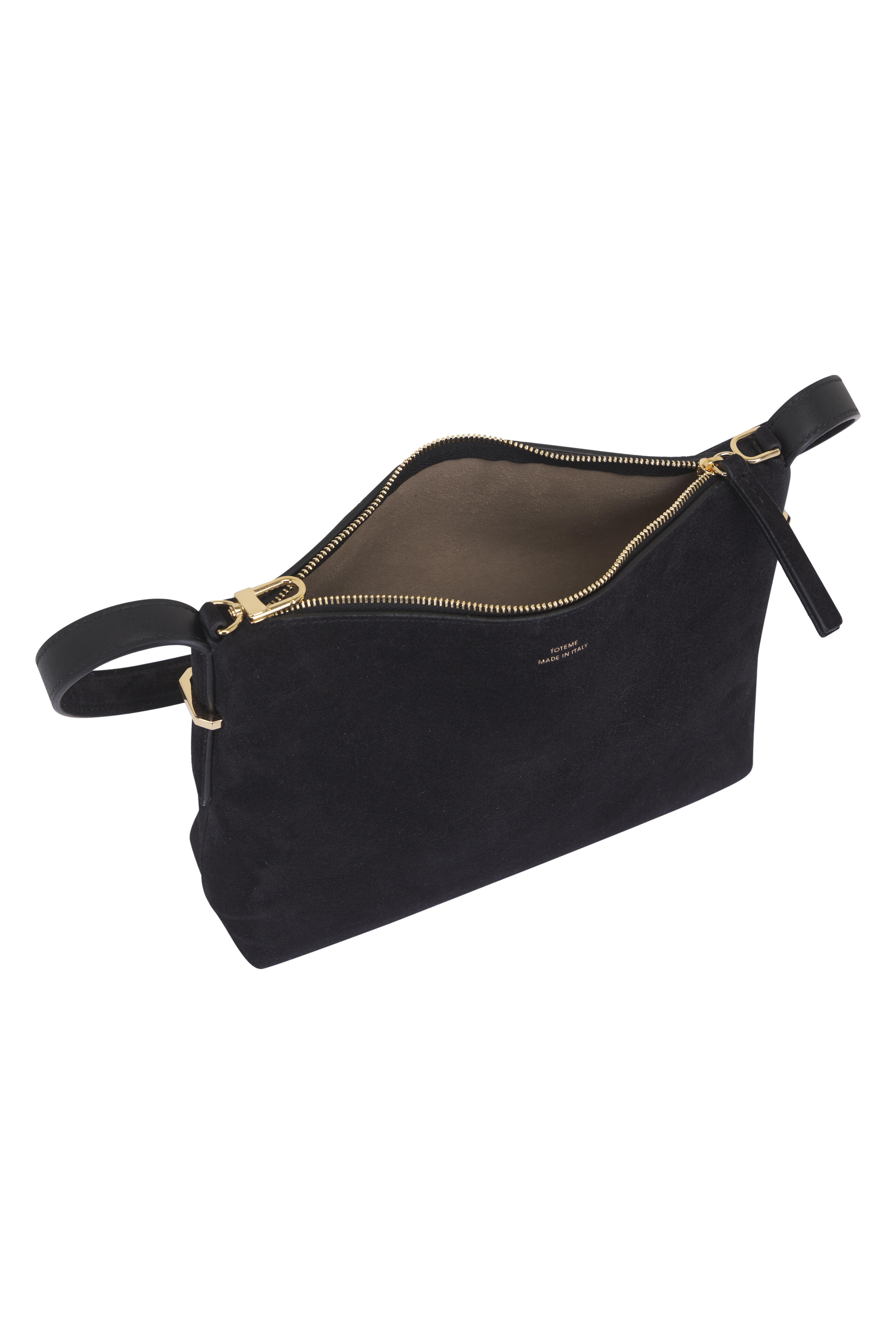 Suede. Adjustable shoulder strap. Top zip. One main compartment. Leather lining. Made in Italy. Approx 9" W x 7" H x 2.5" D. Shoulder strap with a 9.2" drop.