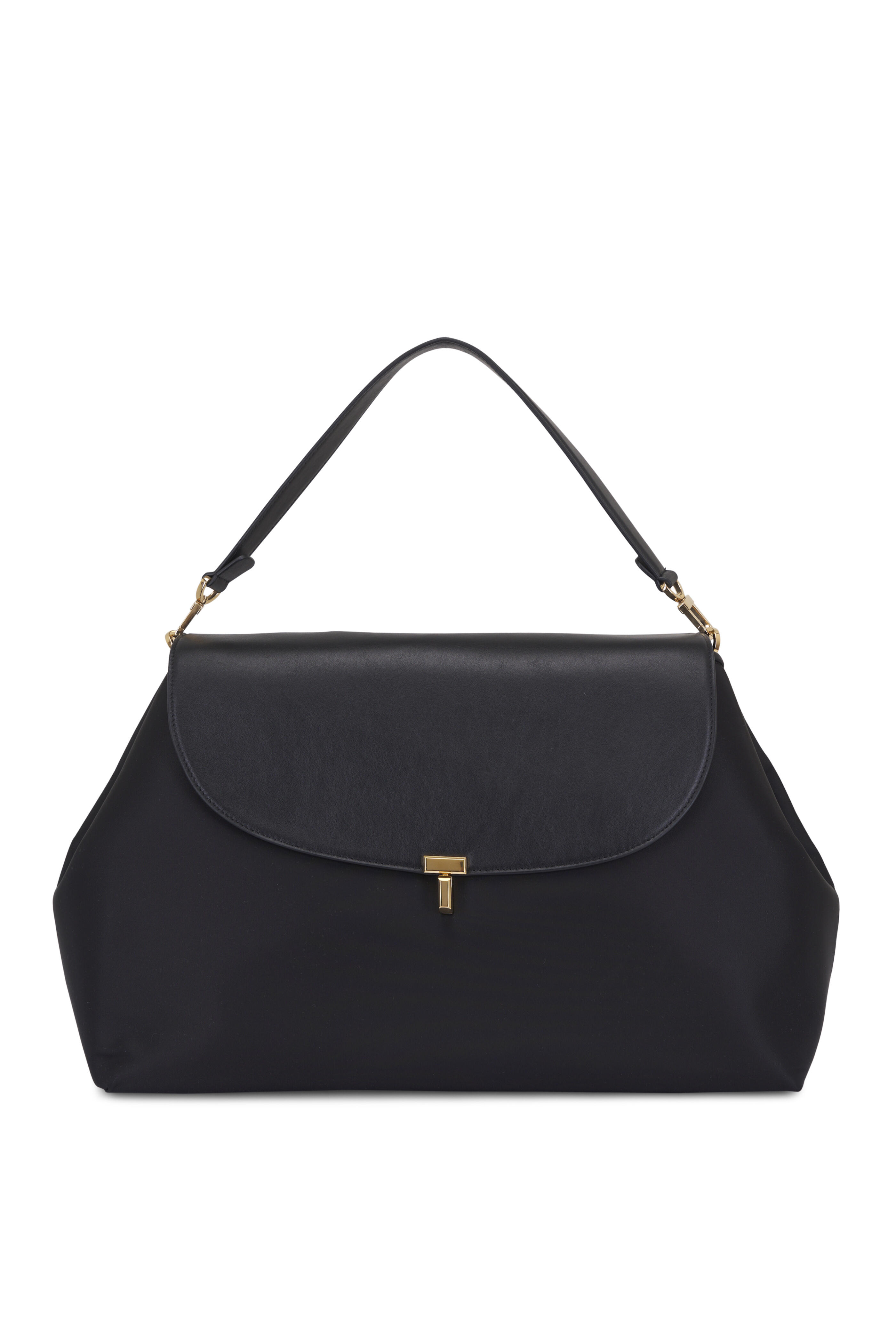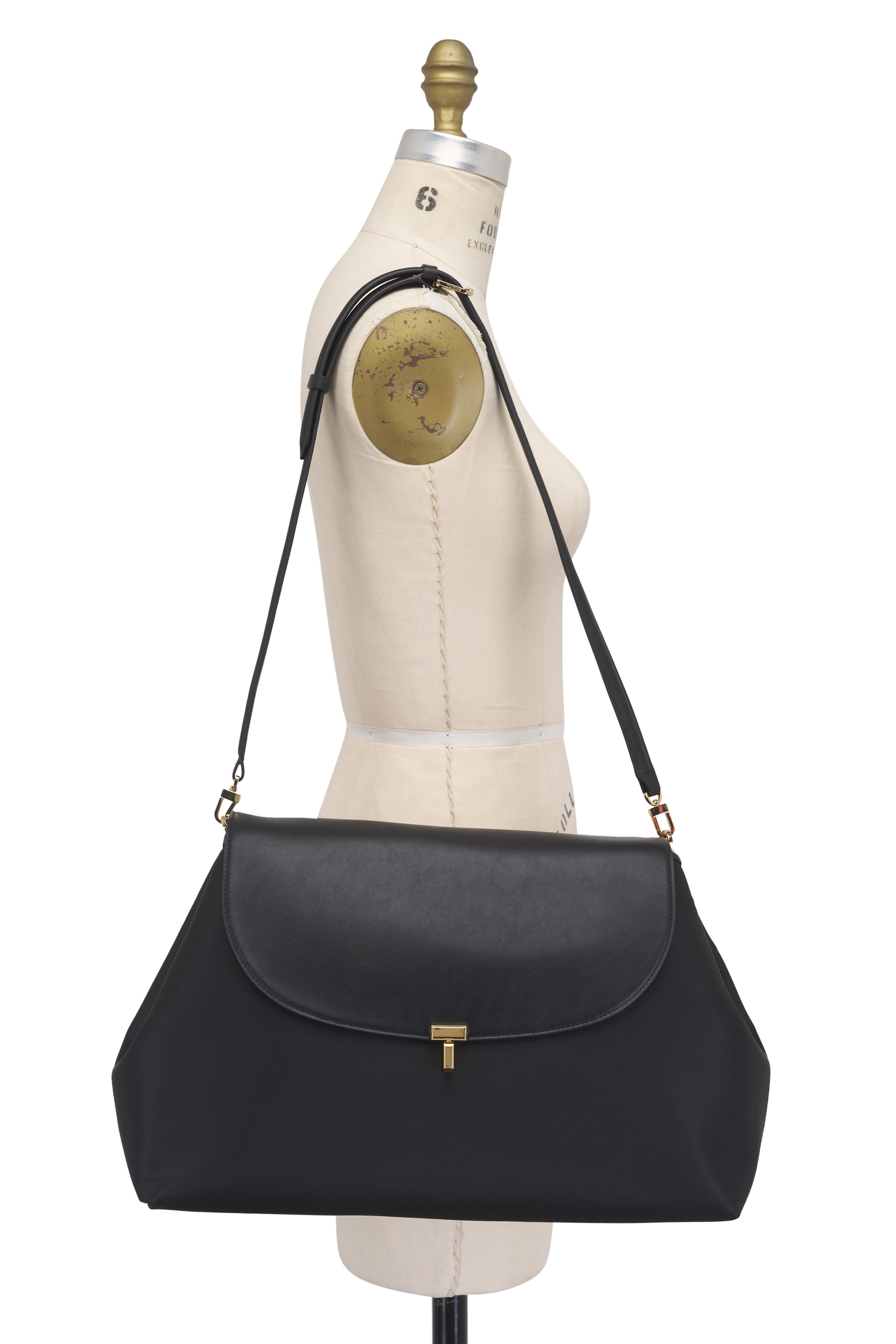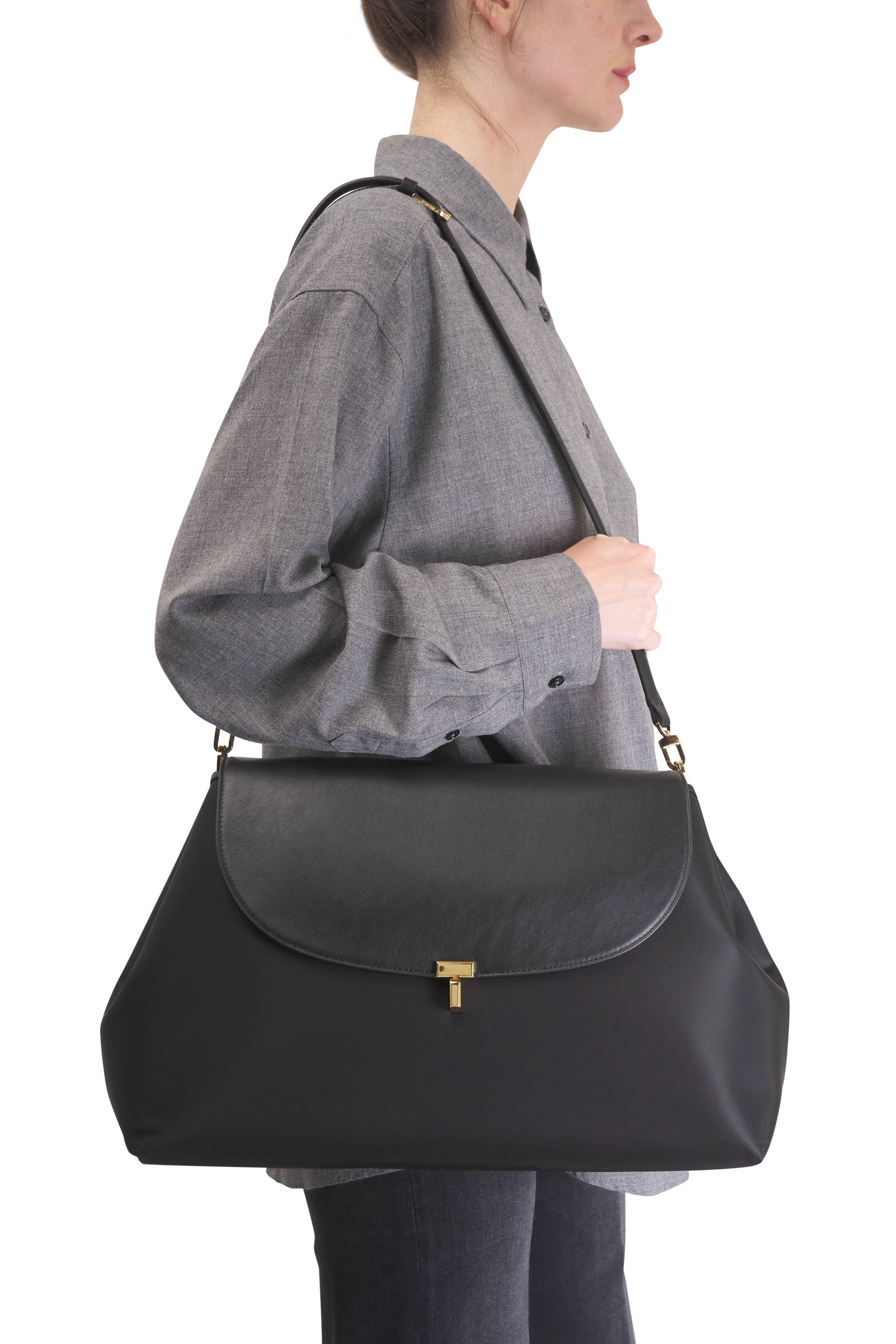 Detachable and adjustable strap, detachable top handle. Front flap; t-lock closure. Back slip pocket, two internal slip pockets. Gold-tone hardware. Made in Italy. Strap drop 39cm/15.3". Top handle drop 20cm/8". Height 26cm/10.2". Width 40cm/16". Depth 14cm/5.5". 90% polyamide recycled, 7% acrylic, 3% polyurethane; trim: 100% calf leather.