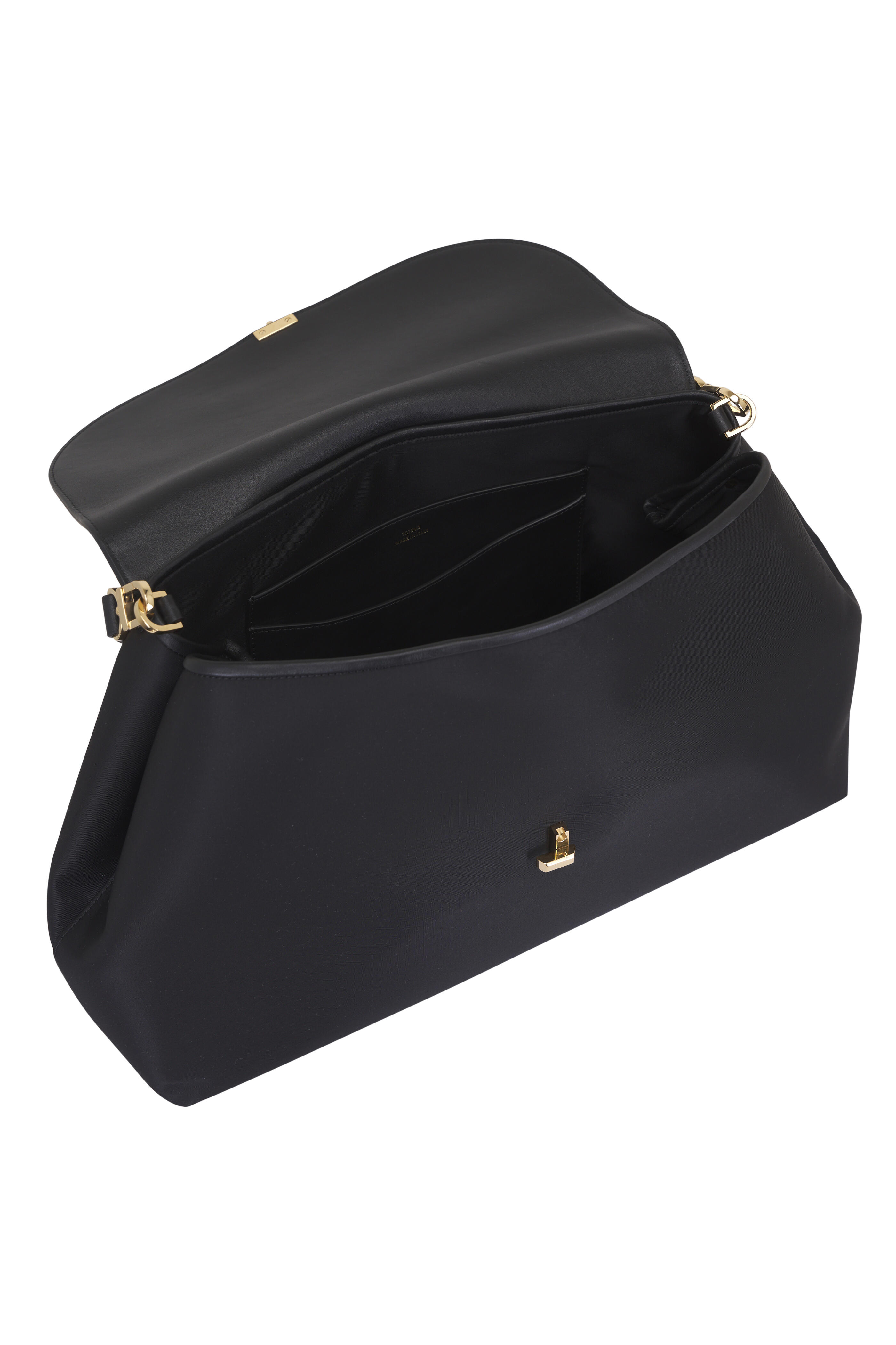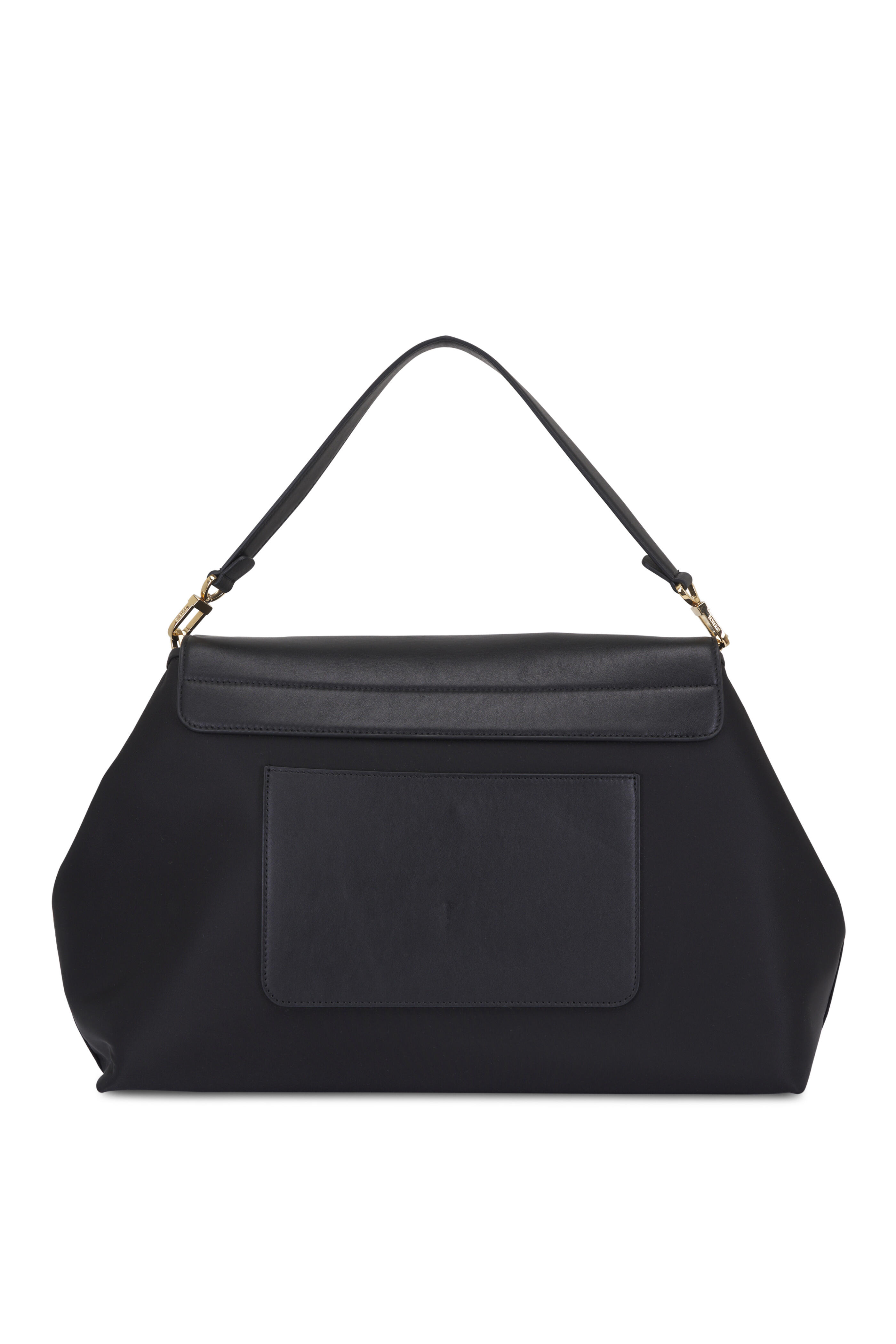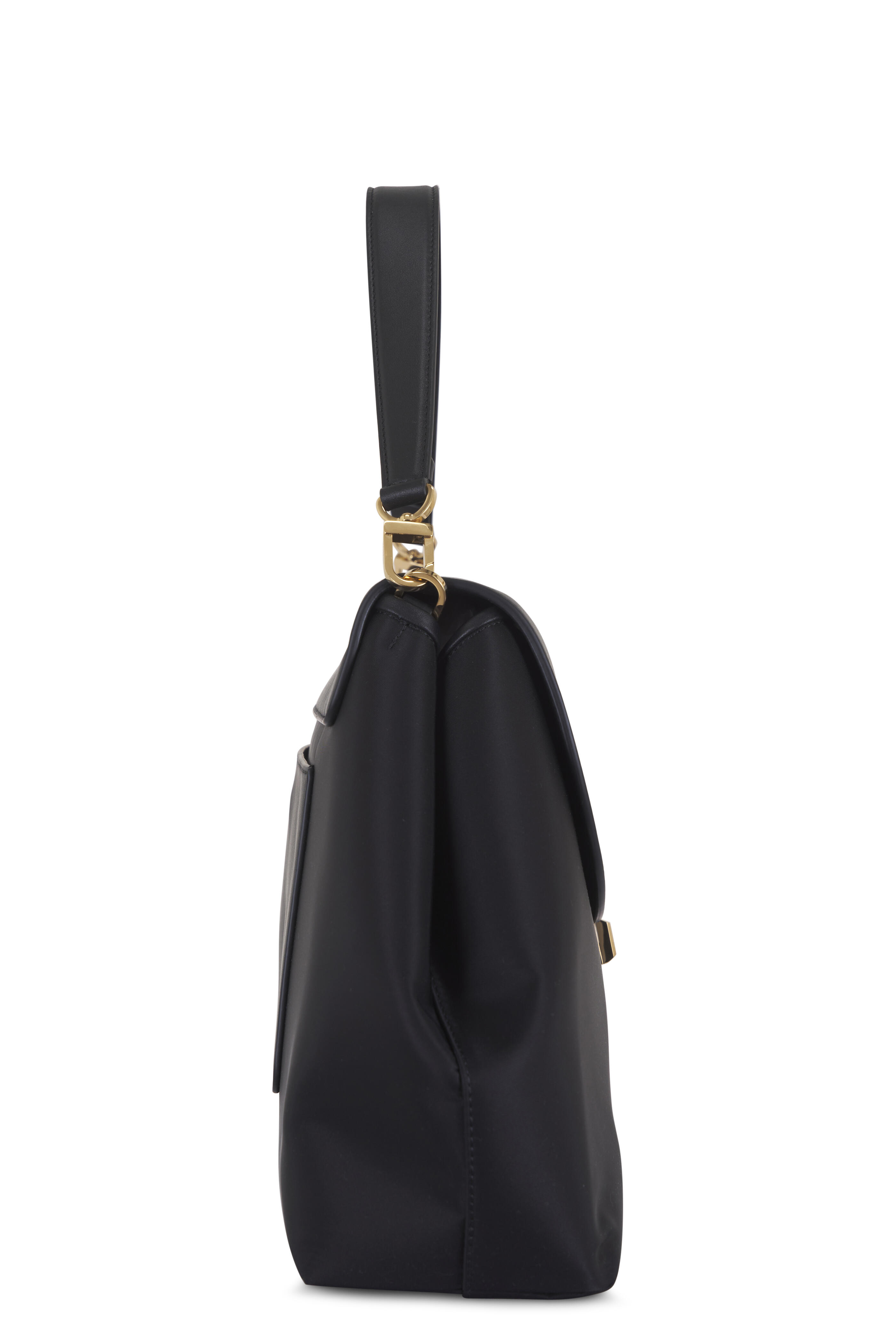 Detachable and adjustable strap, detachable top handle. Front flap; t-lock closure. Back slip pocket, two internal slip pockets. Gold-tone hardware. Made in Italy. Strap drop 39cm/15.3". Top handle drop 20cm/8". Height 26cm/10.2". Width 40cm/16". Depth 14cm/5.5". 90% polyamide recycled, 7% acrylic, 3% polyurethane; trim: 100% calf leather.