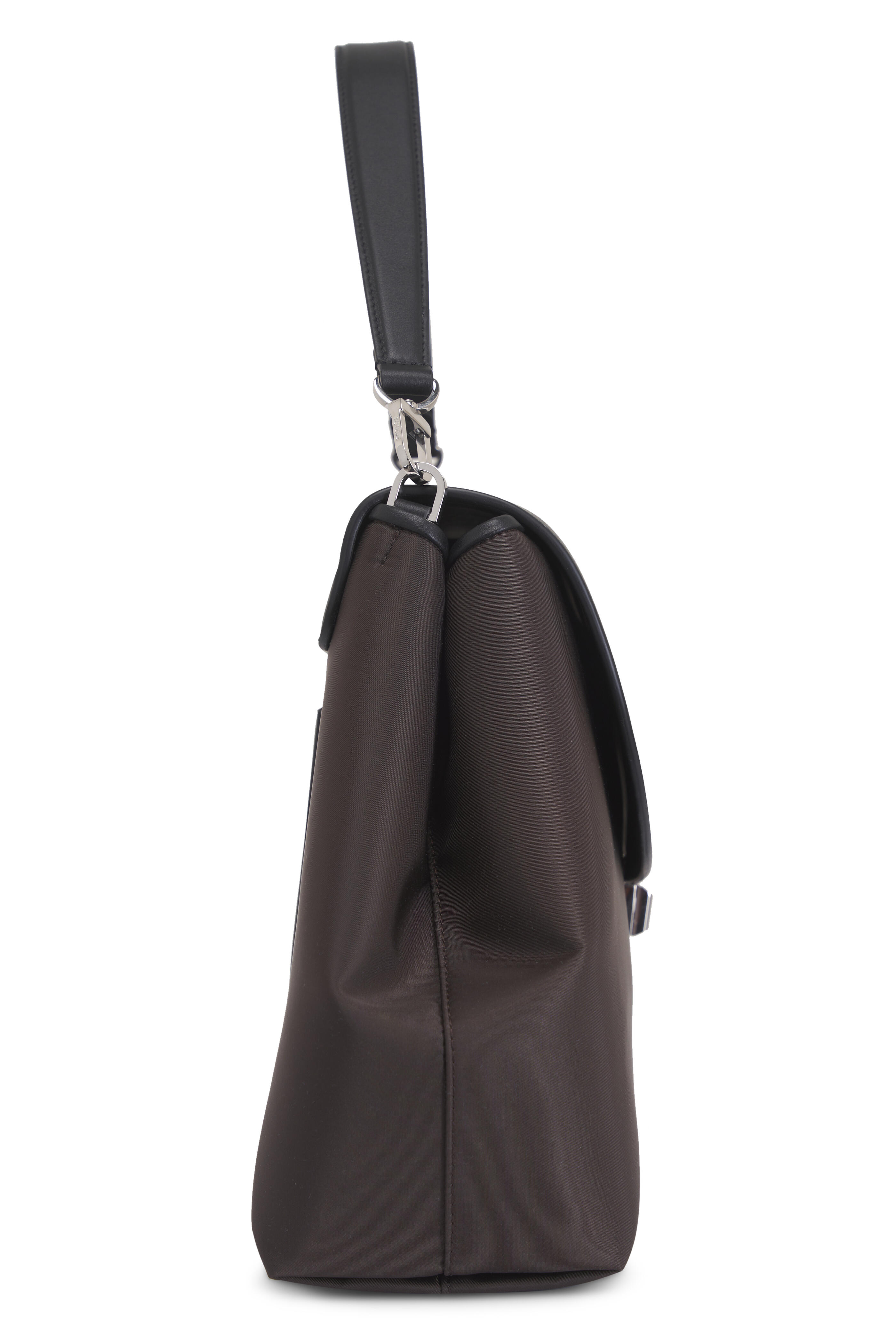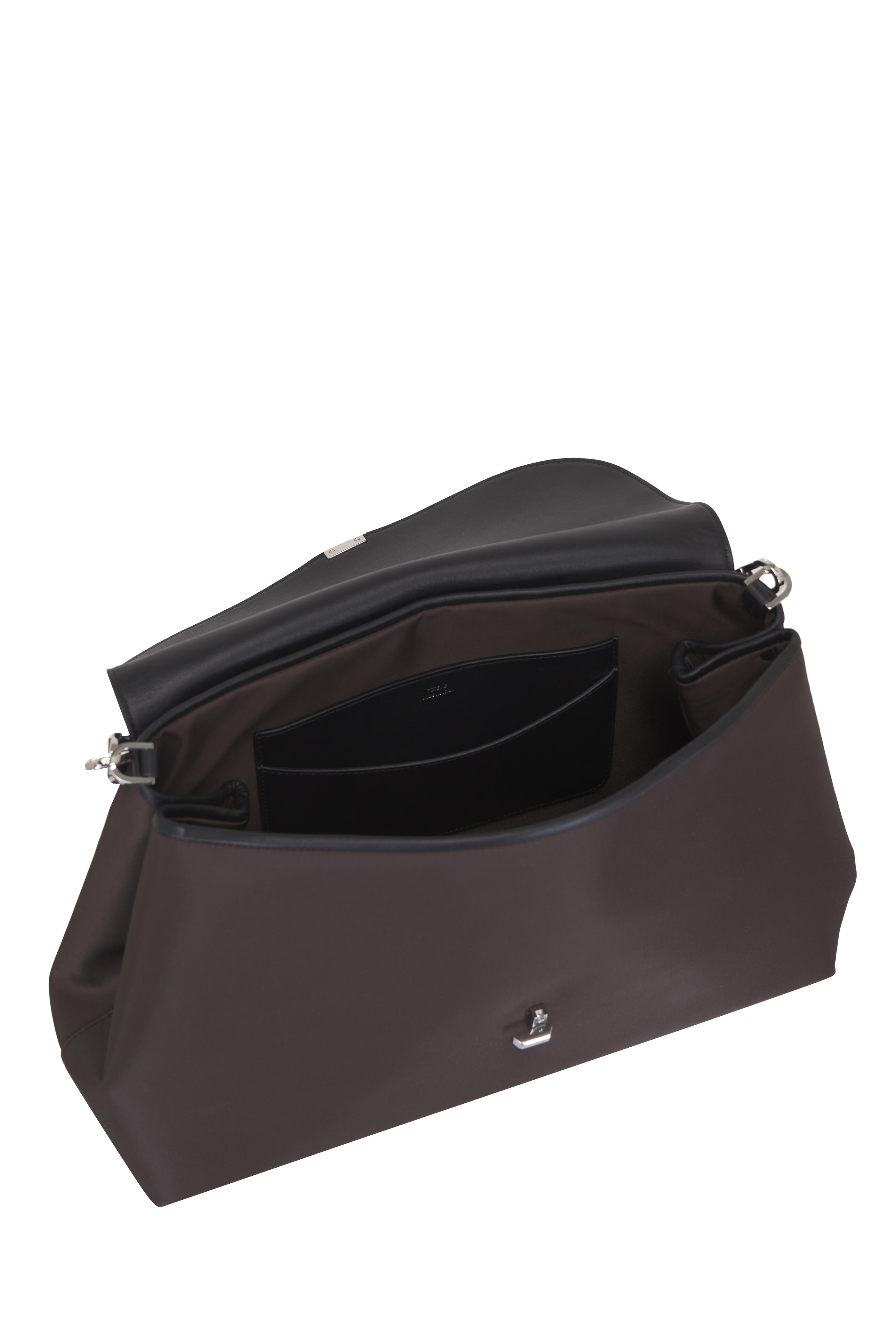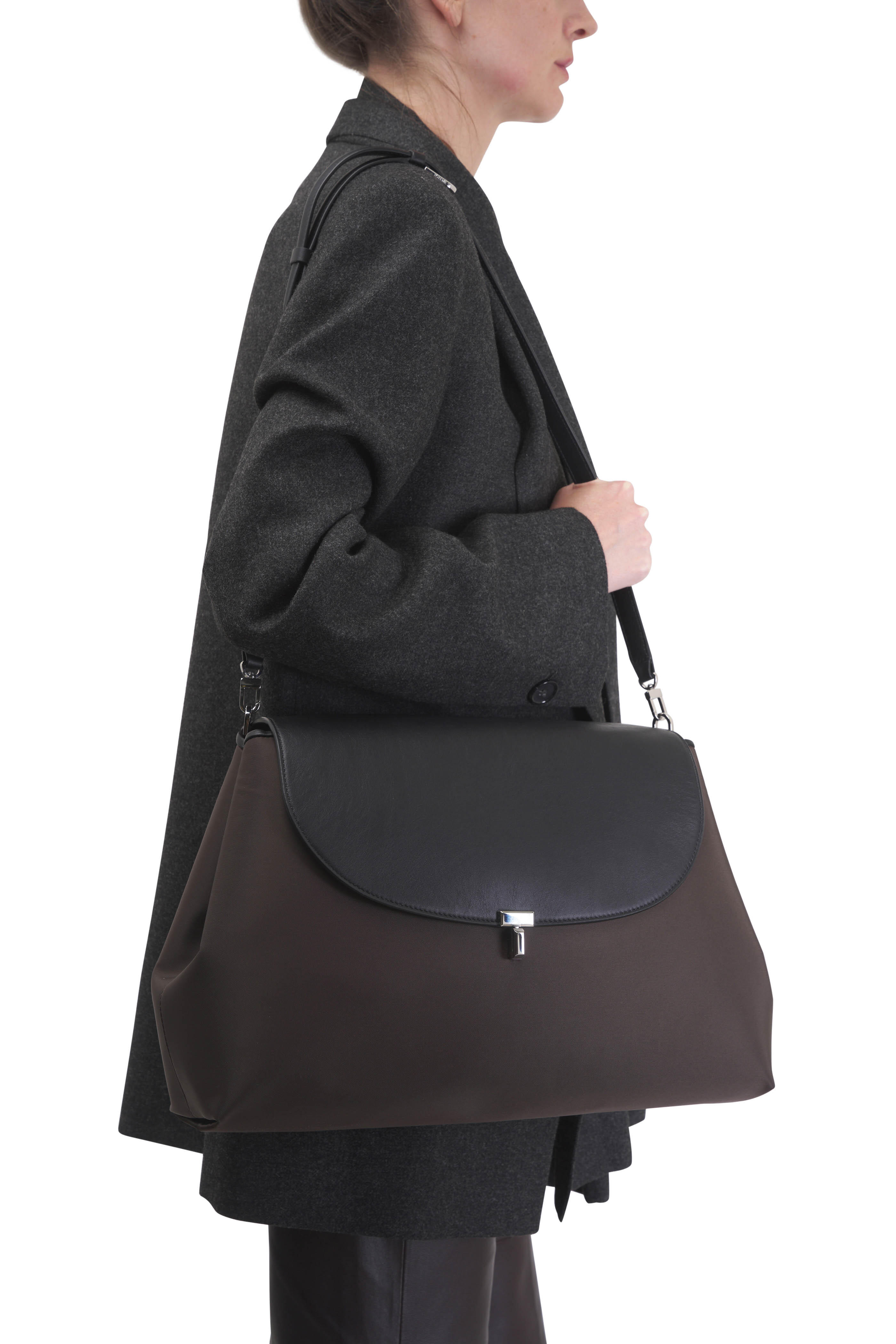 Detachable and adjustable strap, detachable top handle. Front flap; t-lock closure. Back slip pocket, two internal slip pockets. Made in Italy. Strap drop 39cm/15.3". Top handle drop 20cm/8". Height 26cm/10.2". Width 40cm/16". Depth 14cm/5.5". 90% polyamide recycled, 7% acrylic, 3% polyurethane; trim: 100% calf leather.