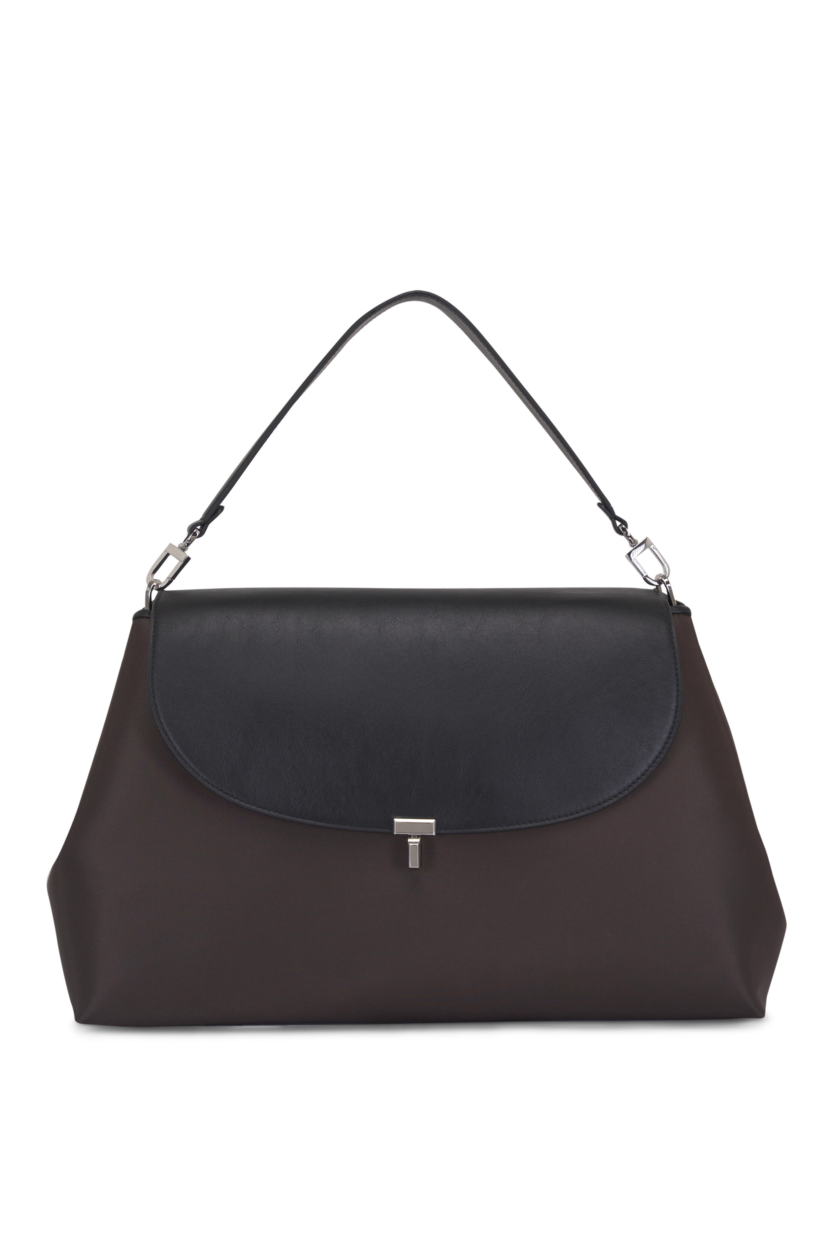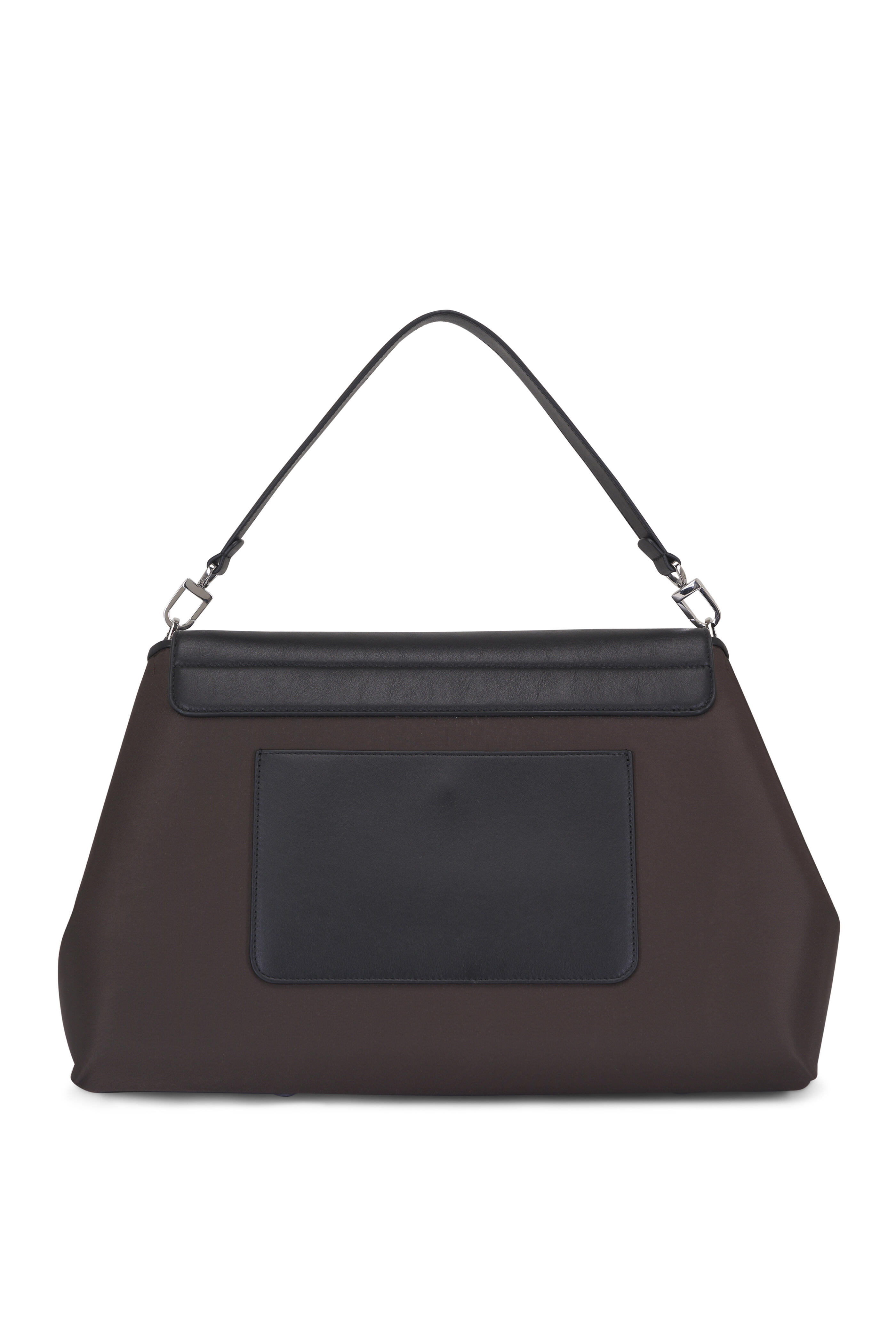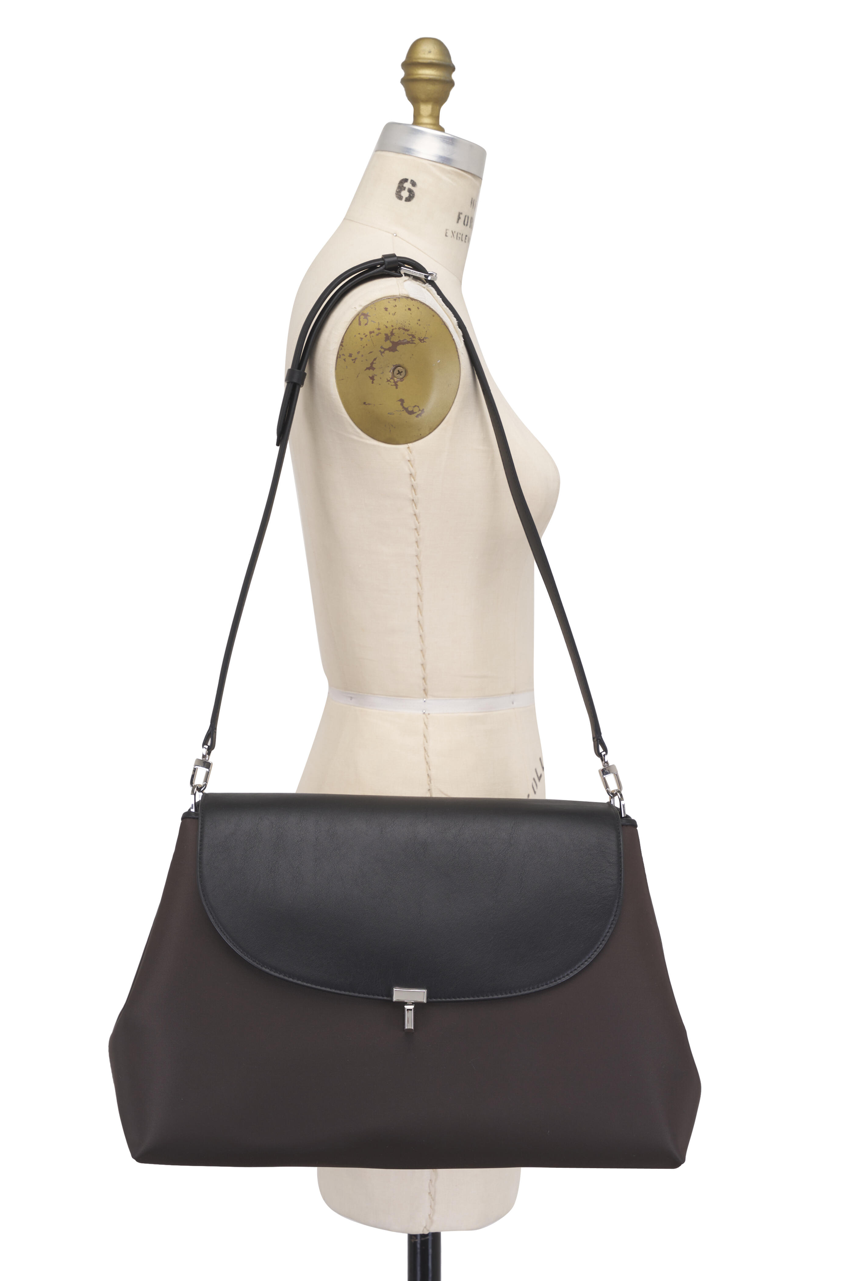 Detachable and adjustable strap, detachable top handle. Front flap; t-lock closure. Back slip pocket, two internal slip pockets. Made in Italy. Strap drop 39cm/15.3". Top handle drop 20cm/8". Height 26cm/10.2". Width 40cm/16". Depth 14cm/5.5". 90% polyamide recycled, 7% acrylic, 3% polyurethane; trim: 100% calf leather.