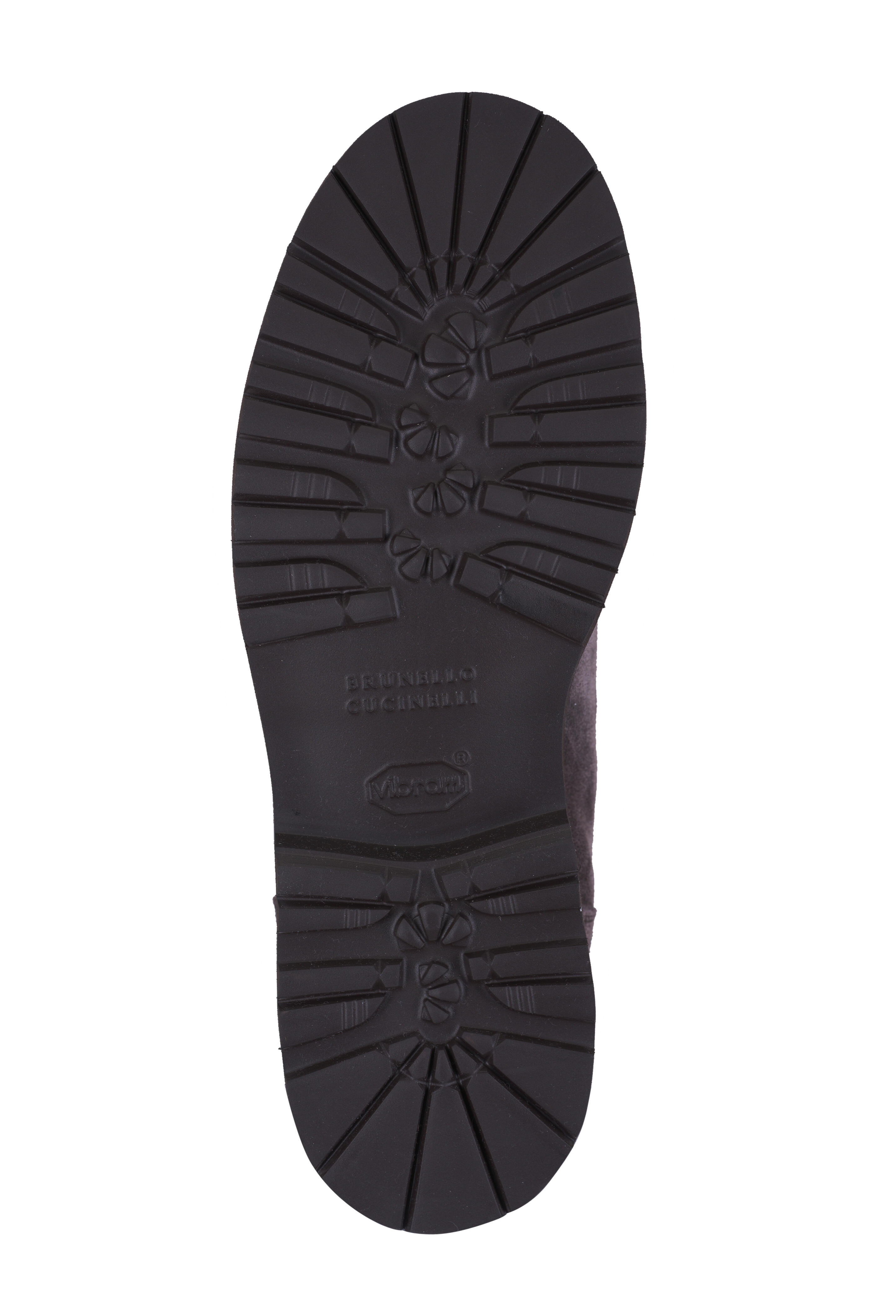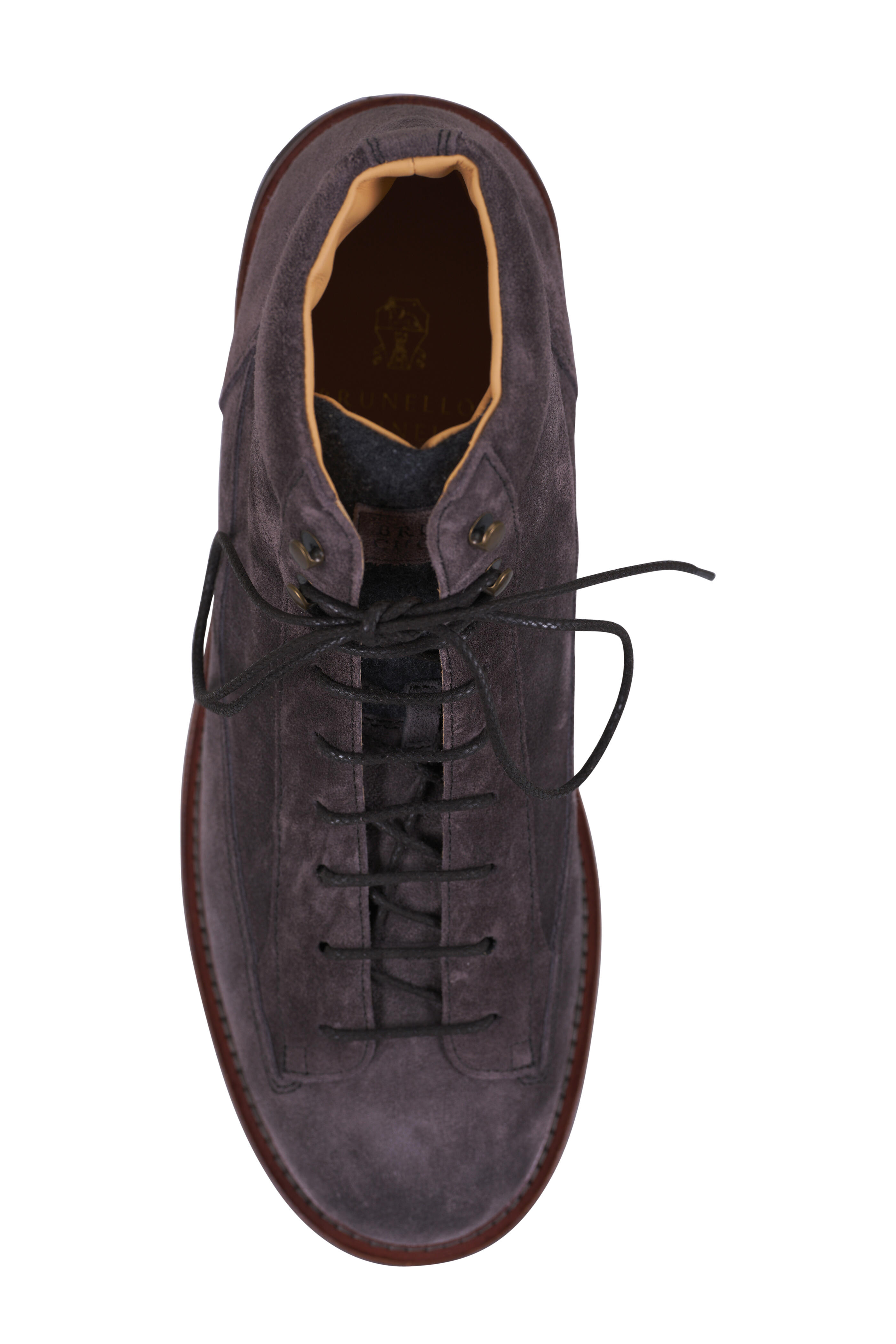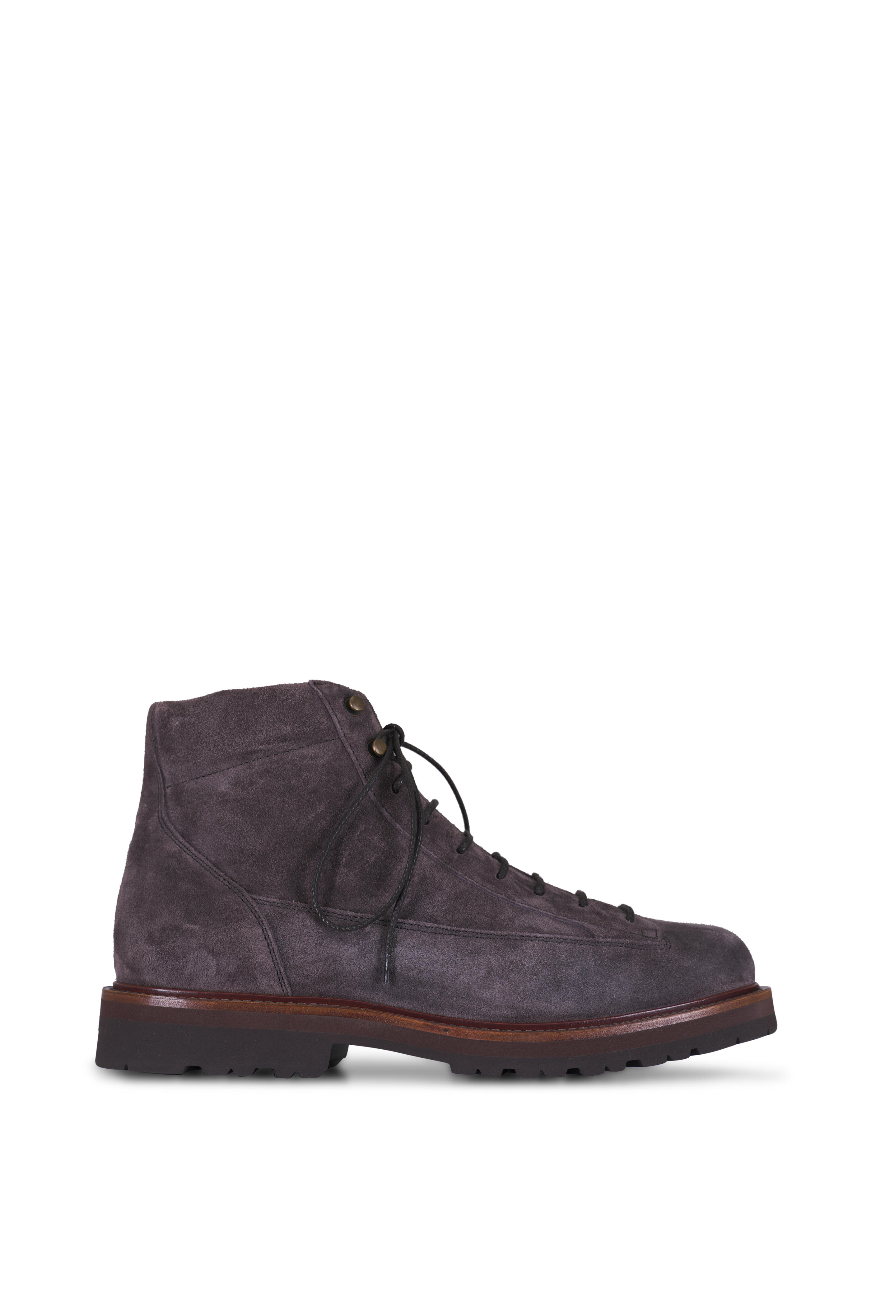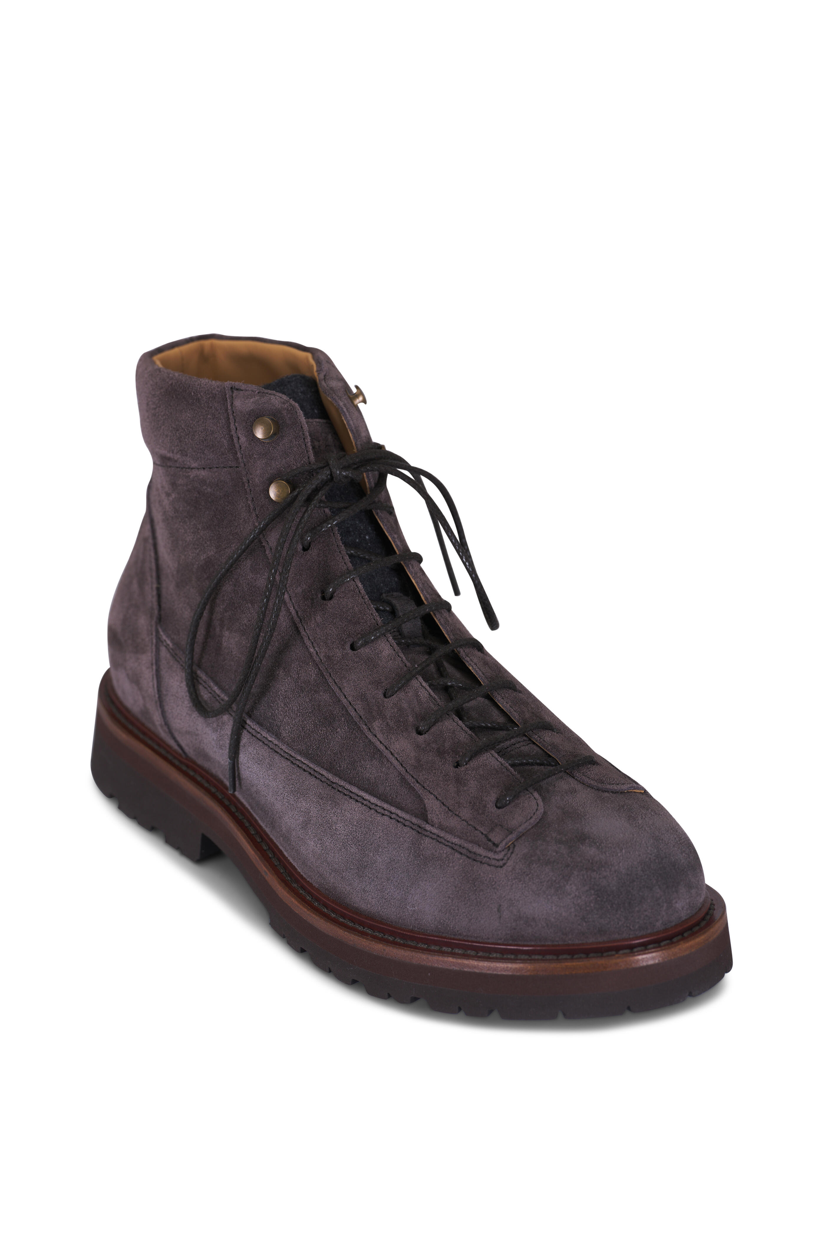 Suede upper. Round toe. Lace up closure. Padded collar. Leather lining and insole. Rubber lug sole. Made in Italy.