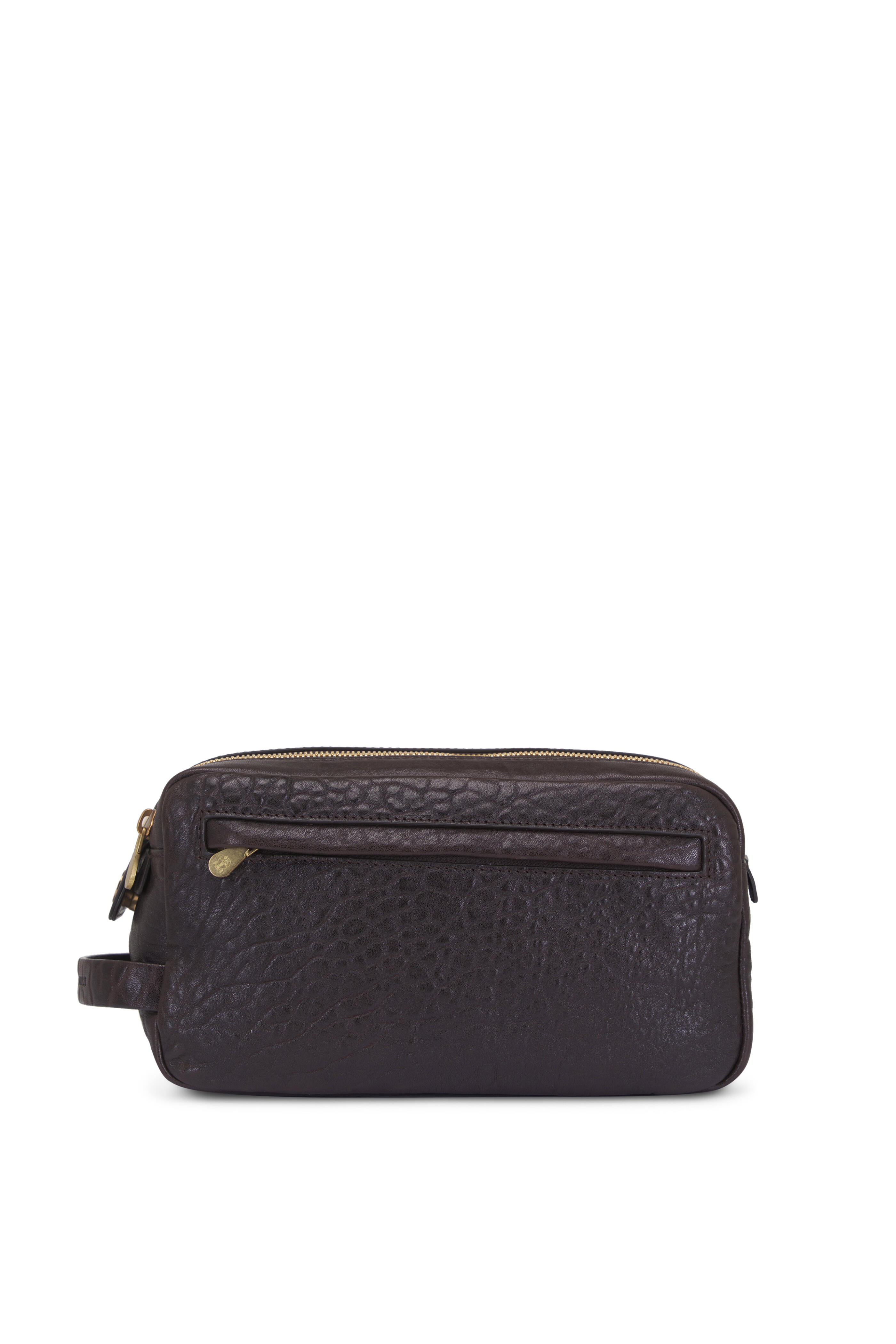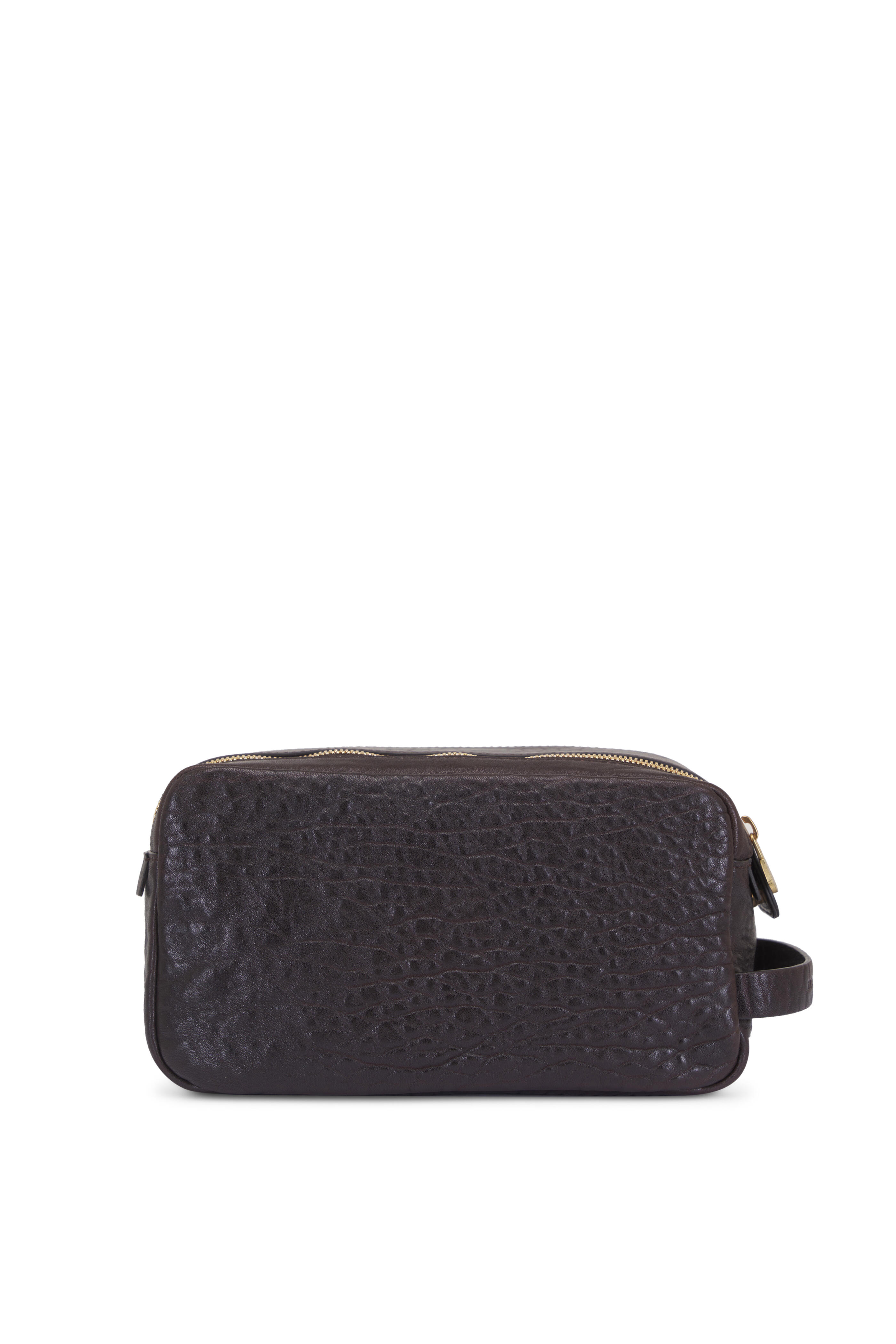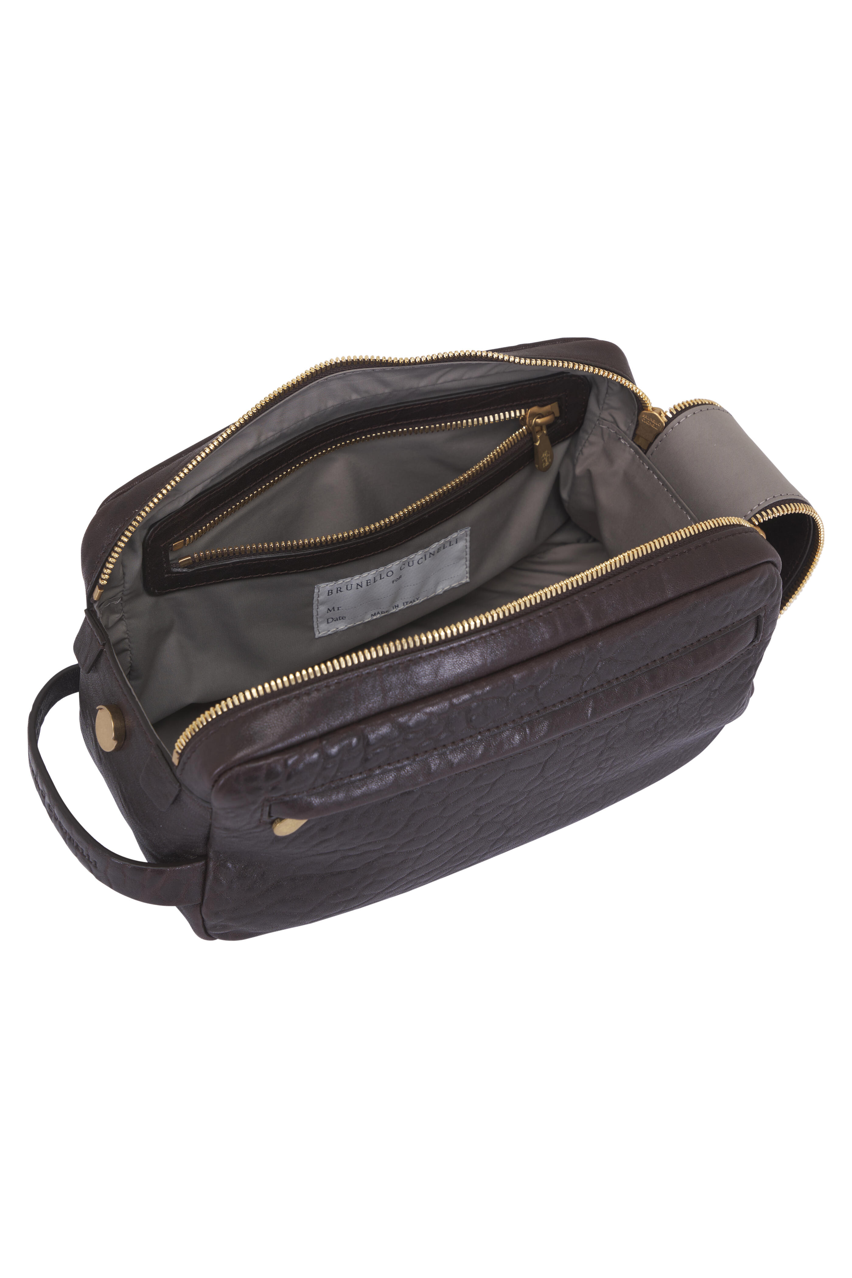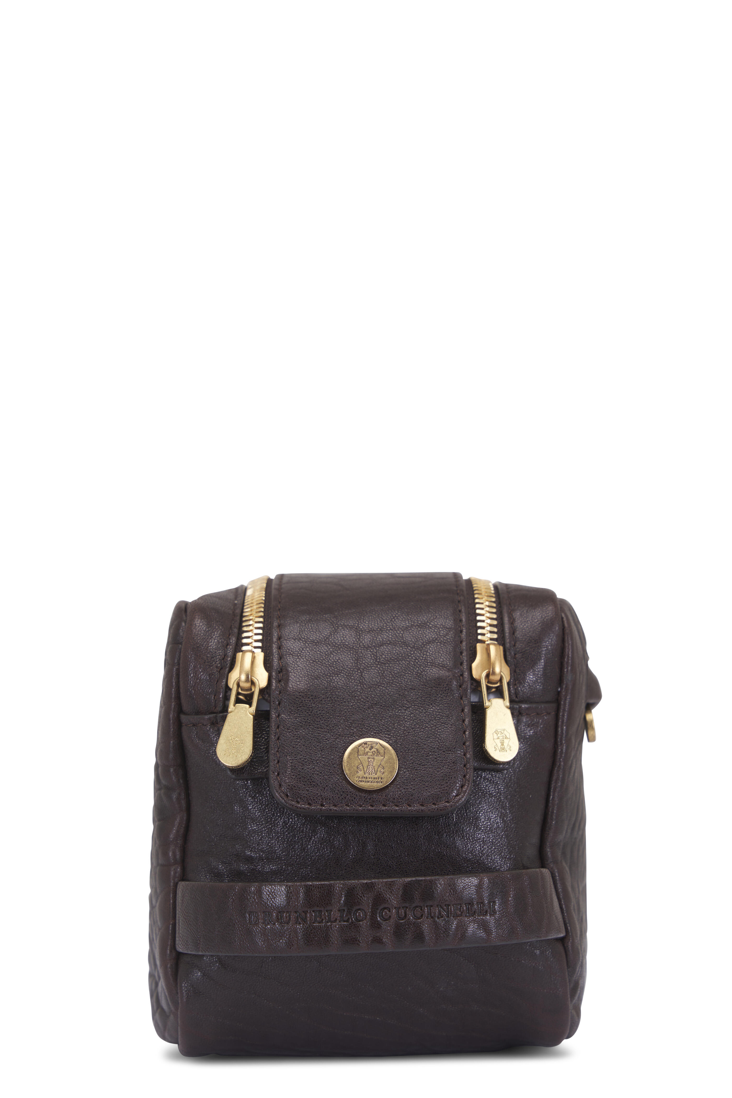 Calfskin leather. Double zip and magnet closure. Side handle. Interior side zip pocket. Outside zip pocket. Water-resistant fabric lining. Made in Italy. Length: 9.06". Height: 5.12". Width: 4.72".