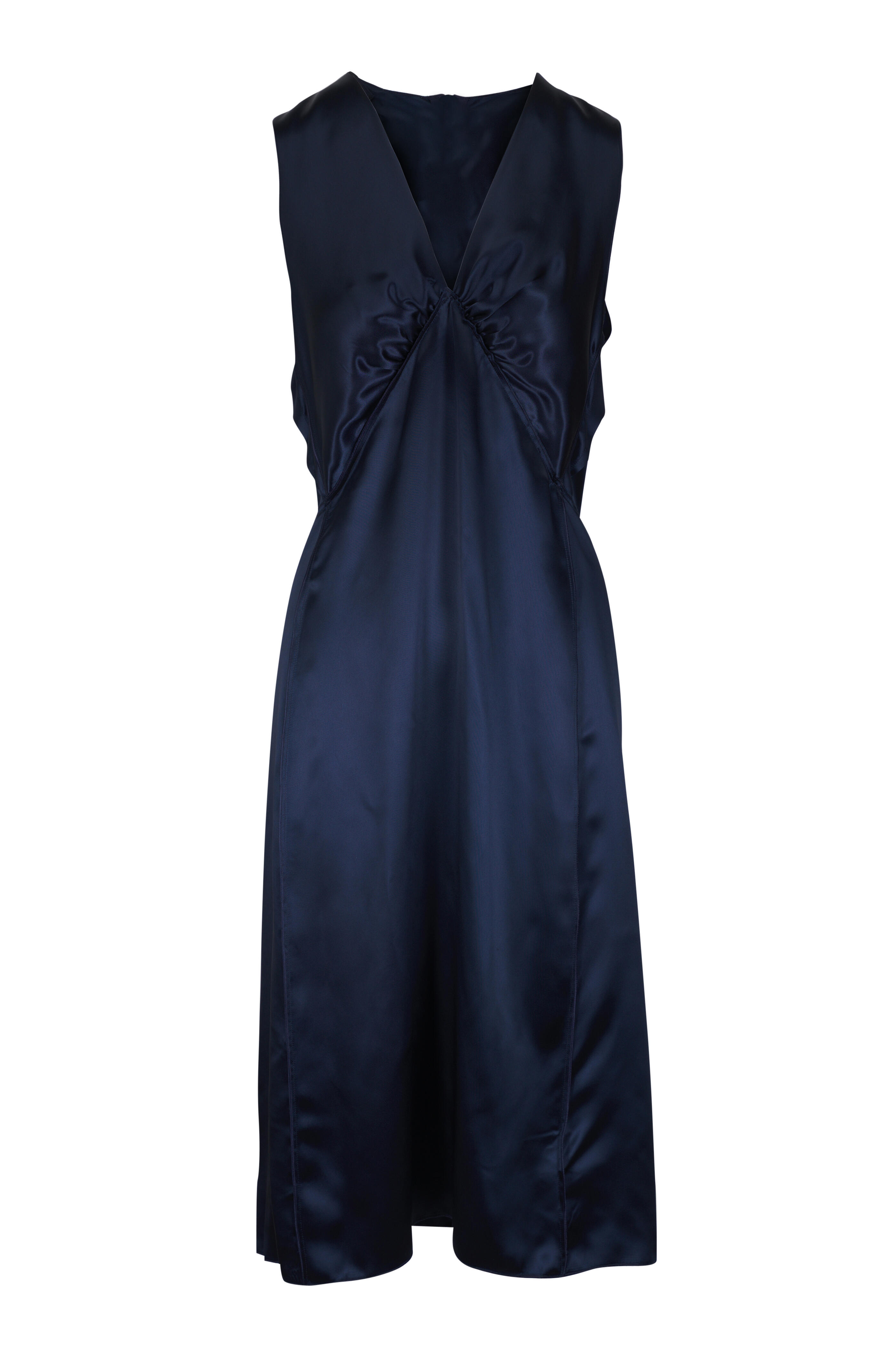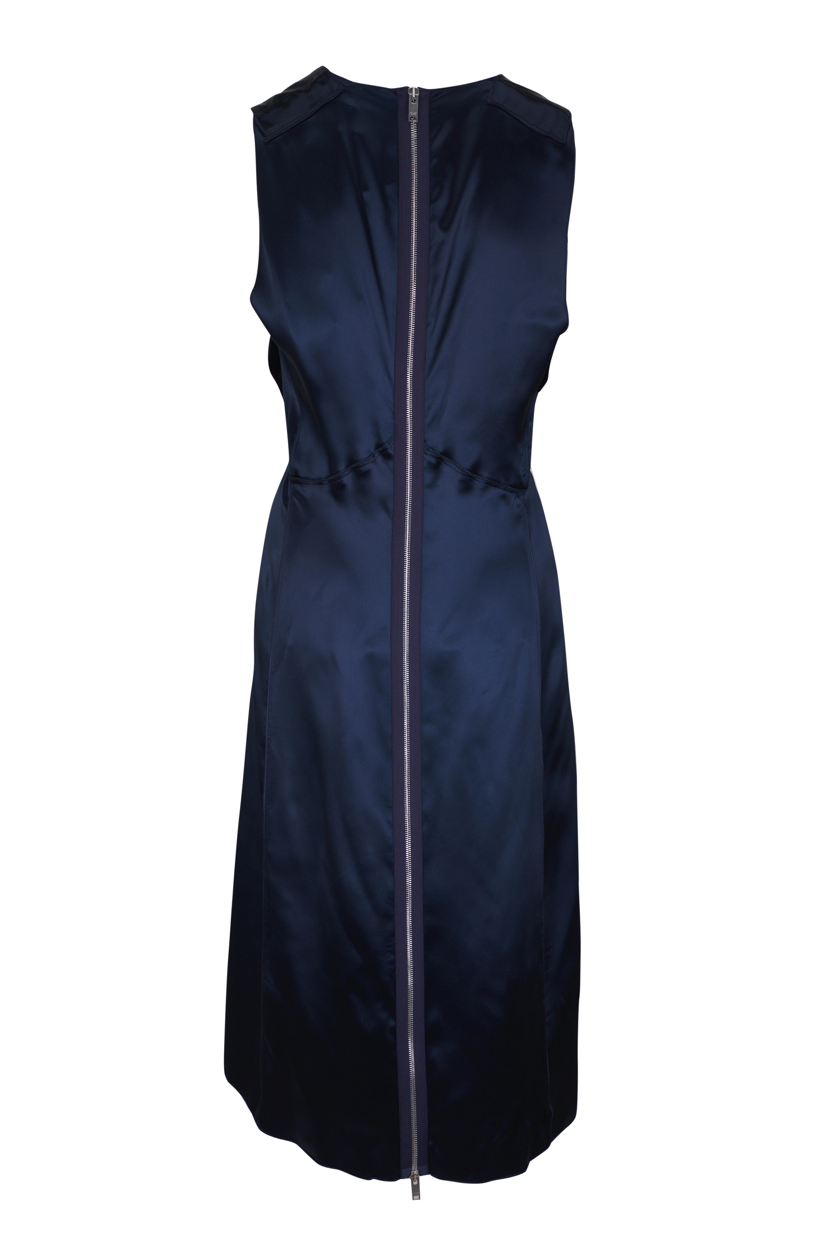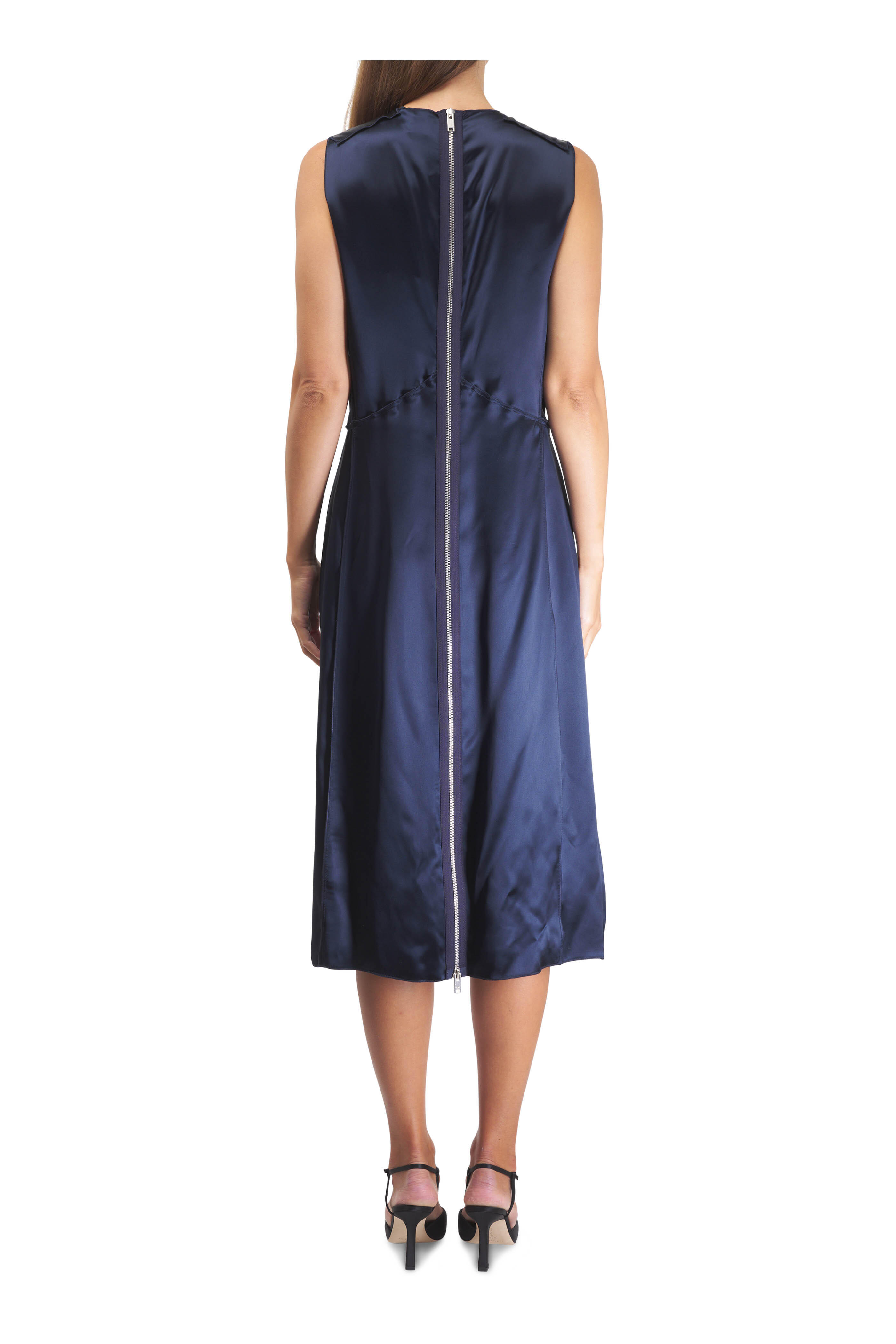 V-neckline. Back zip. Exposed seems. Made in Italy. 59% acetate, 41% viscose. Dry clean.