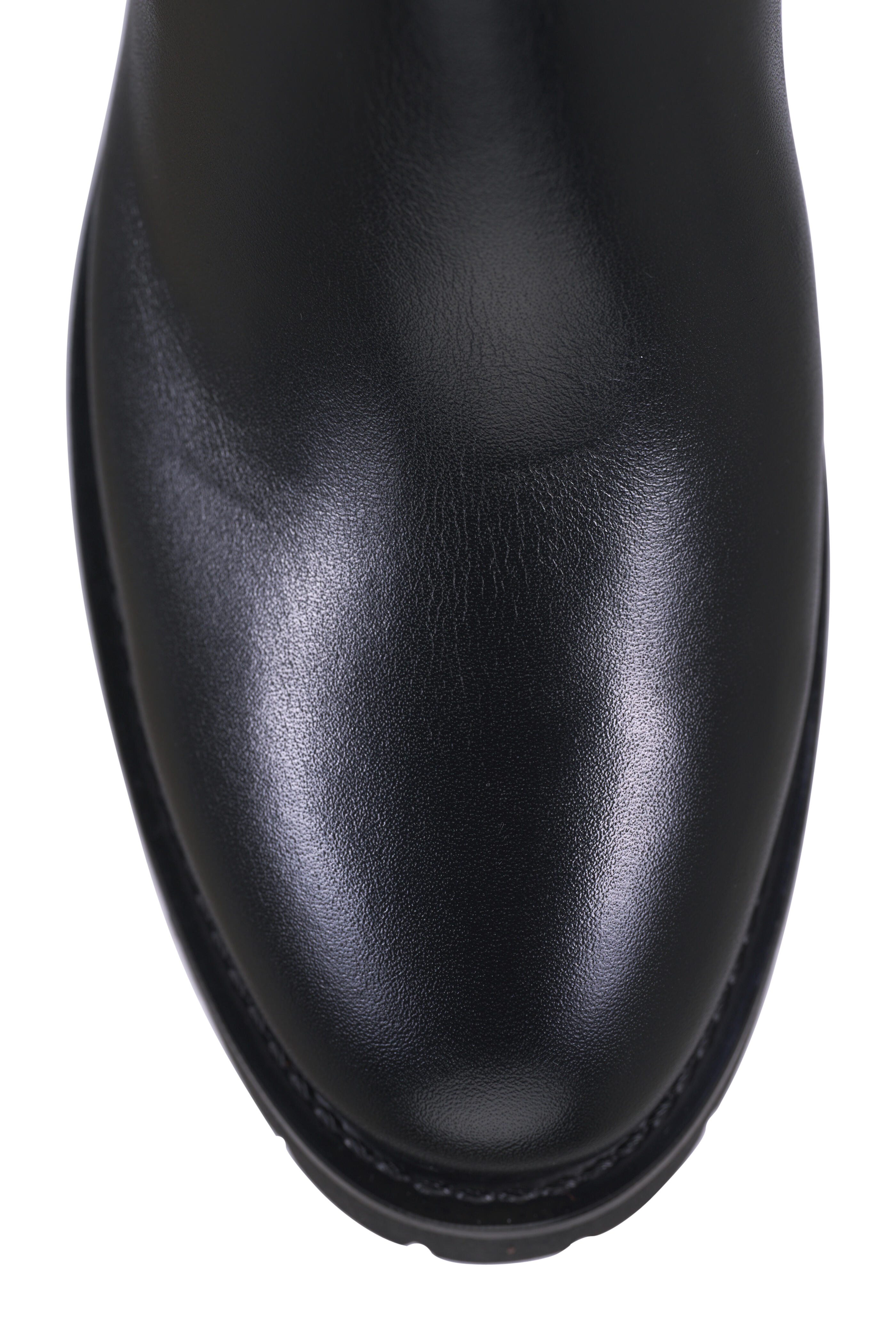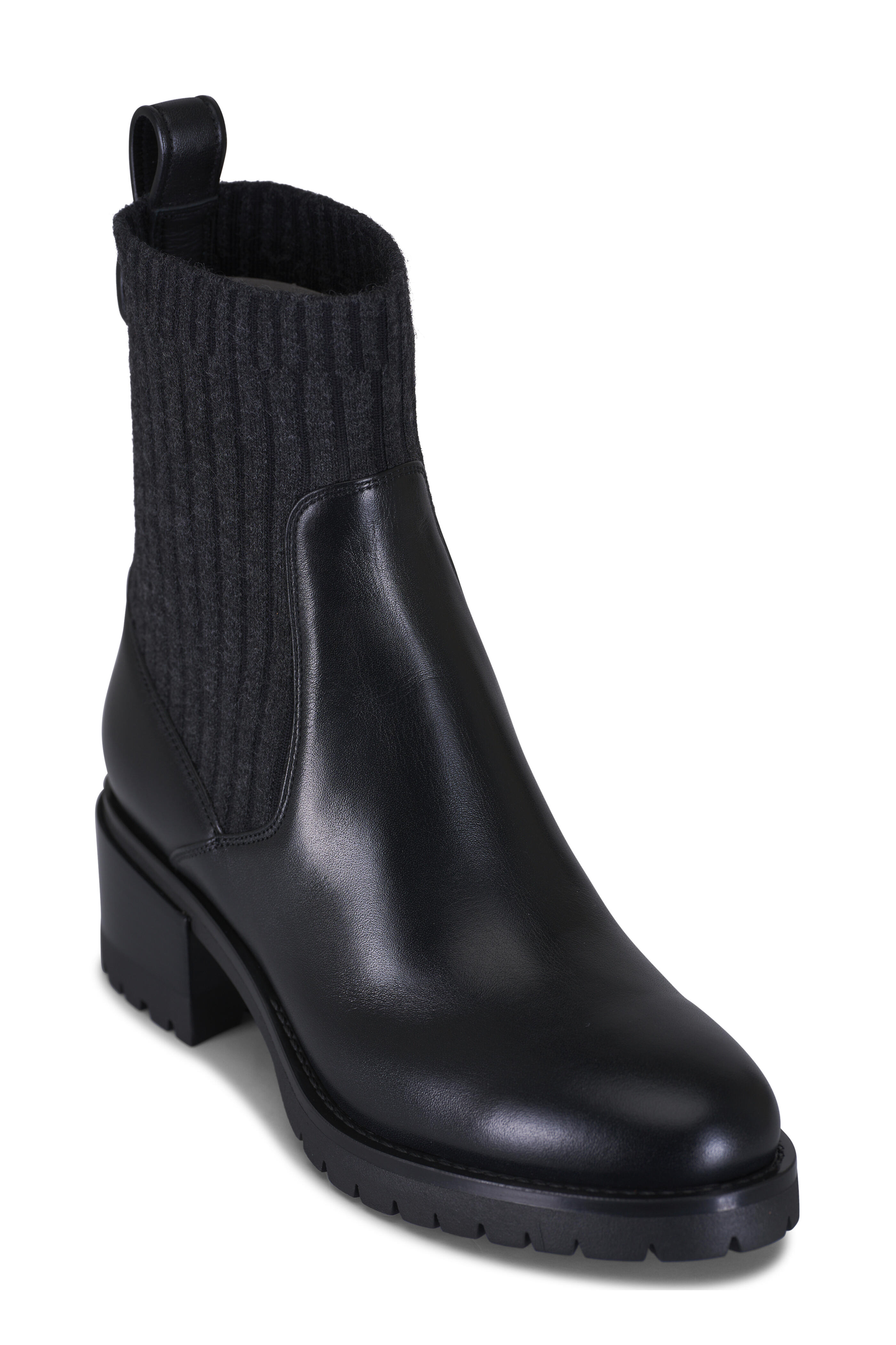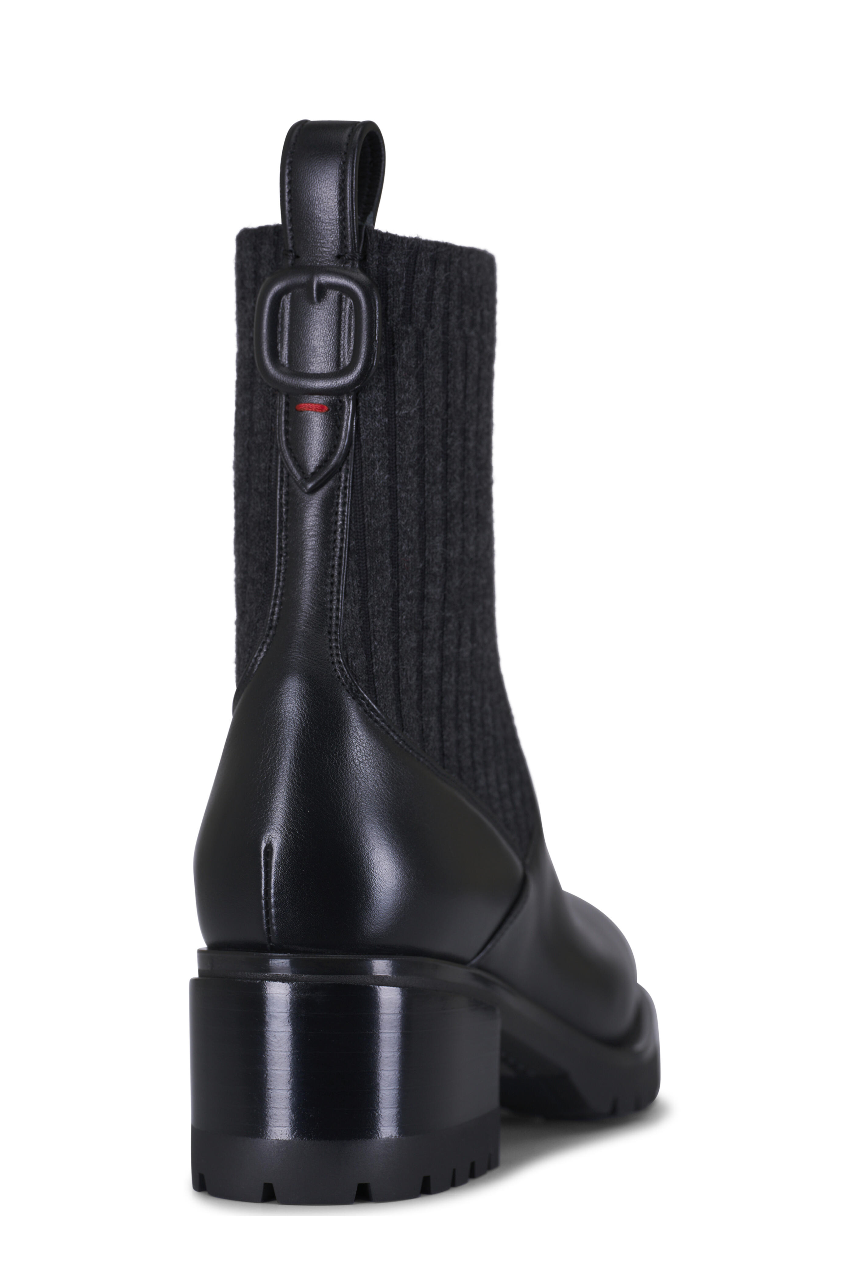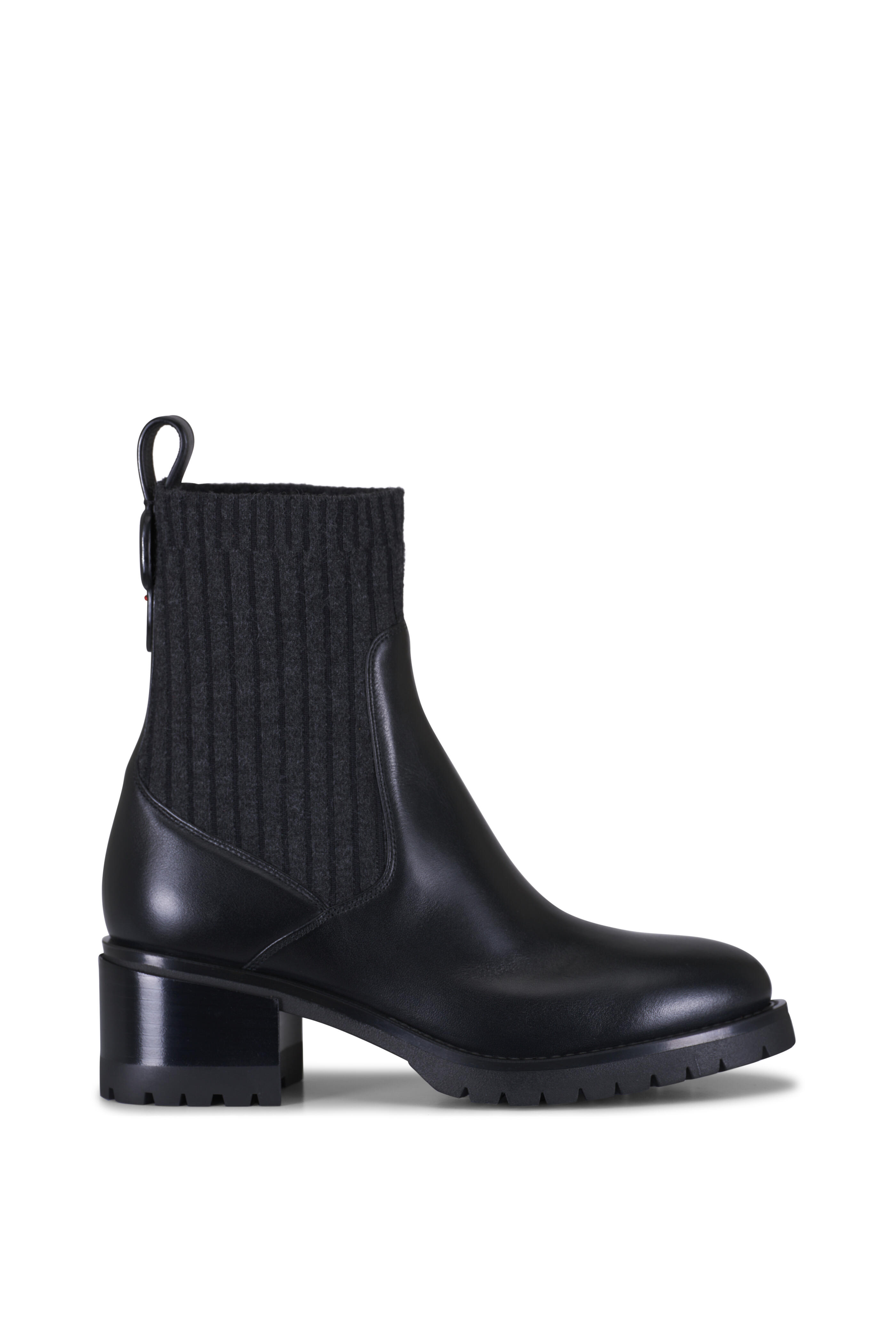 Leather and textile upper. Round toe. Slip-on style. Back pull tab. Textile lining. Leather insole. Block heel. Rubber lug sole. Made in Italy.