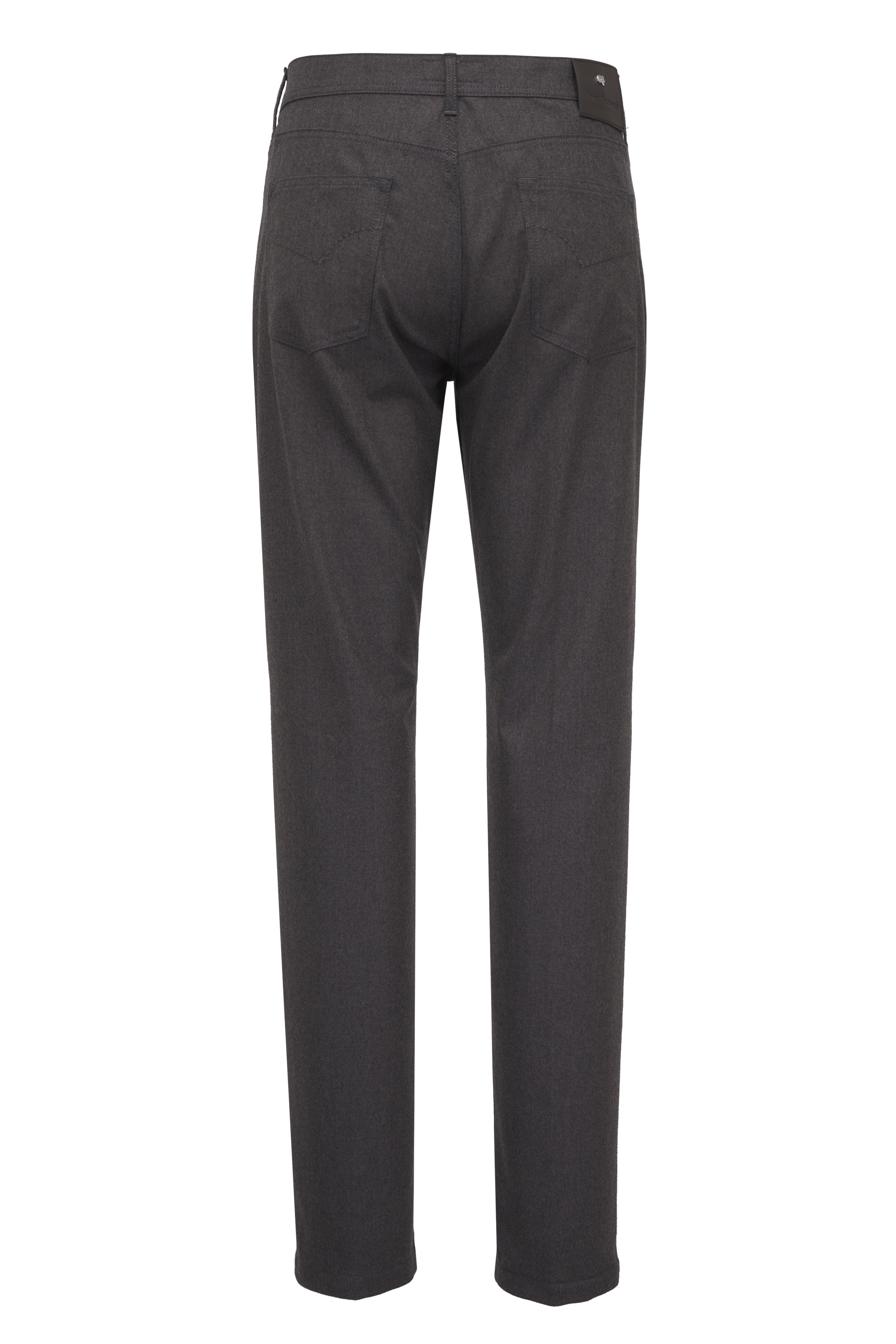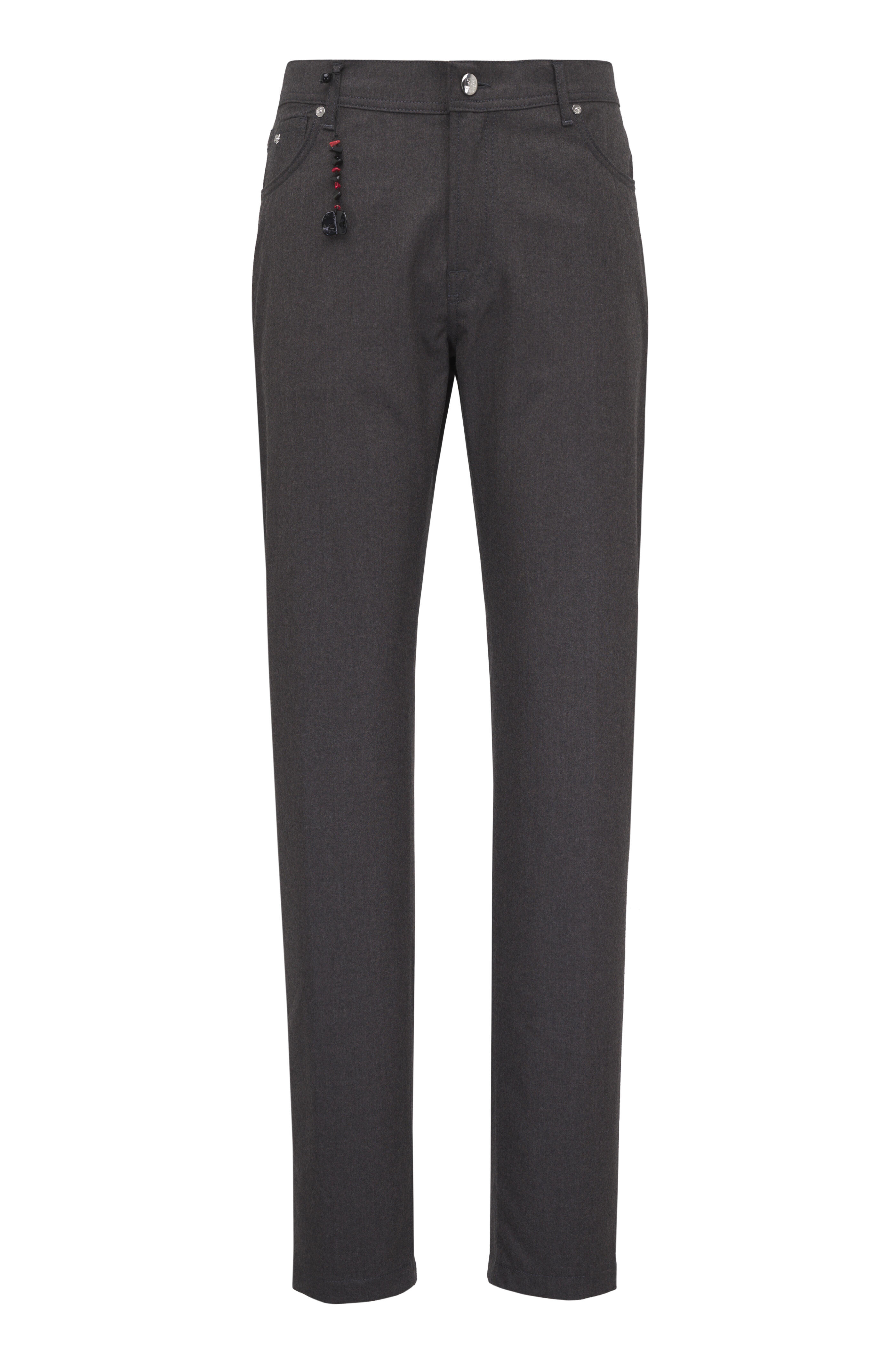 Zip fly with button closure. Banded waist; belt loops. Five pocket styling. Made in Italy. 35" Inseam. 96% cashmere, 4% elastane. Dry clean.