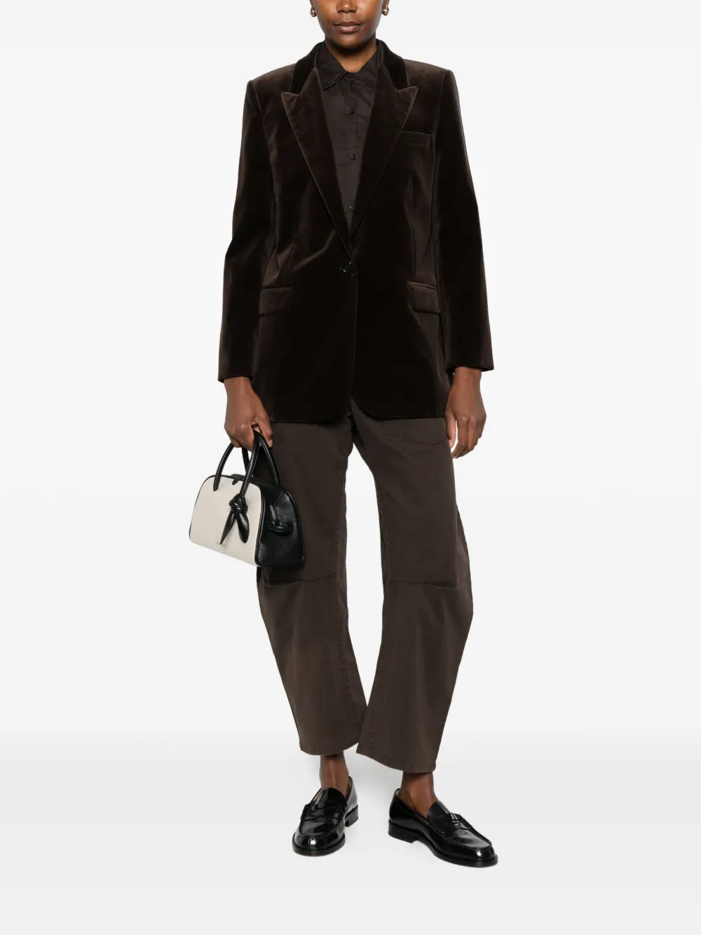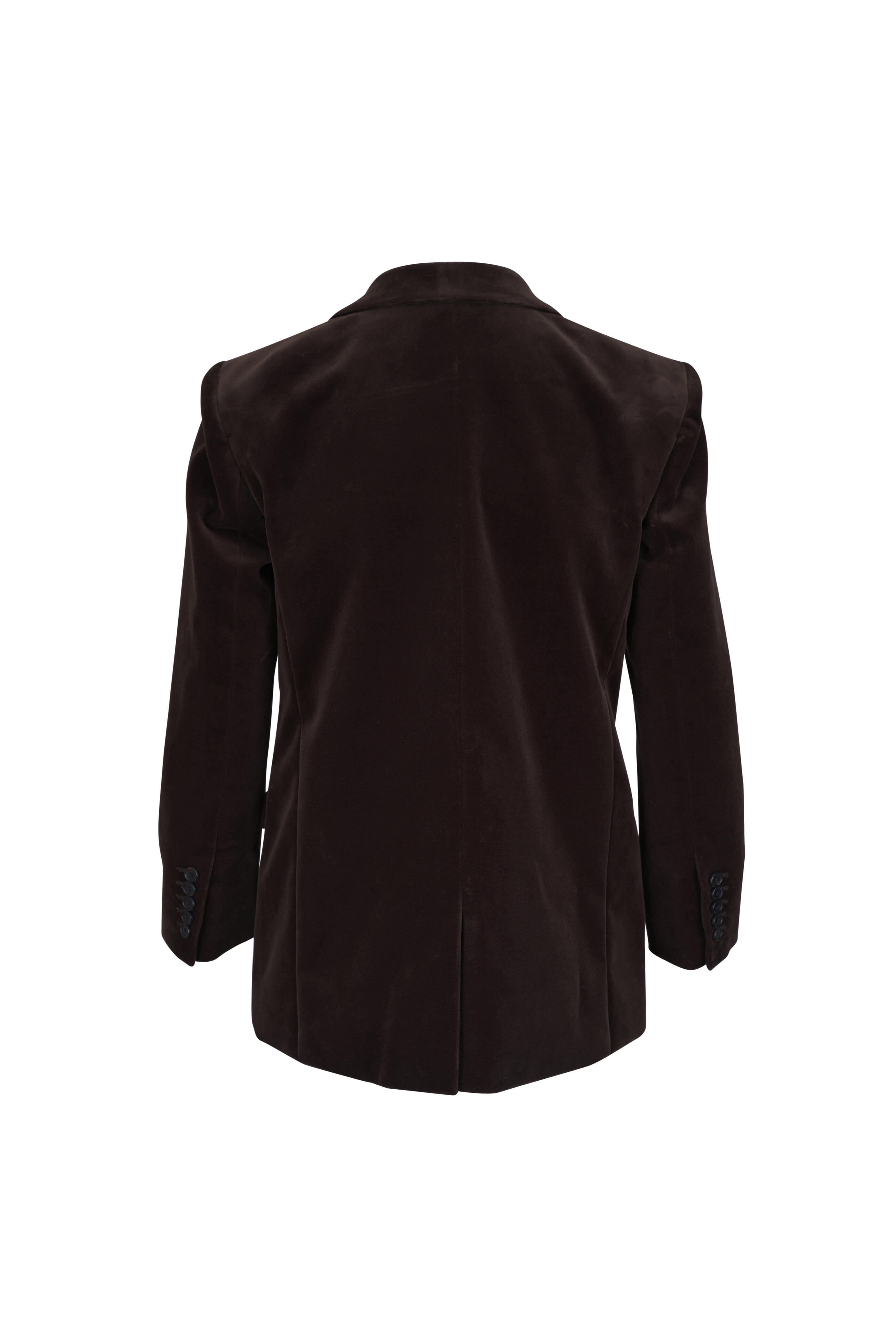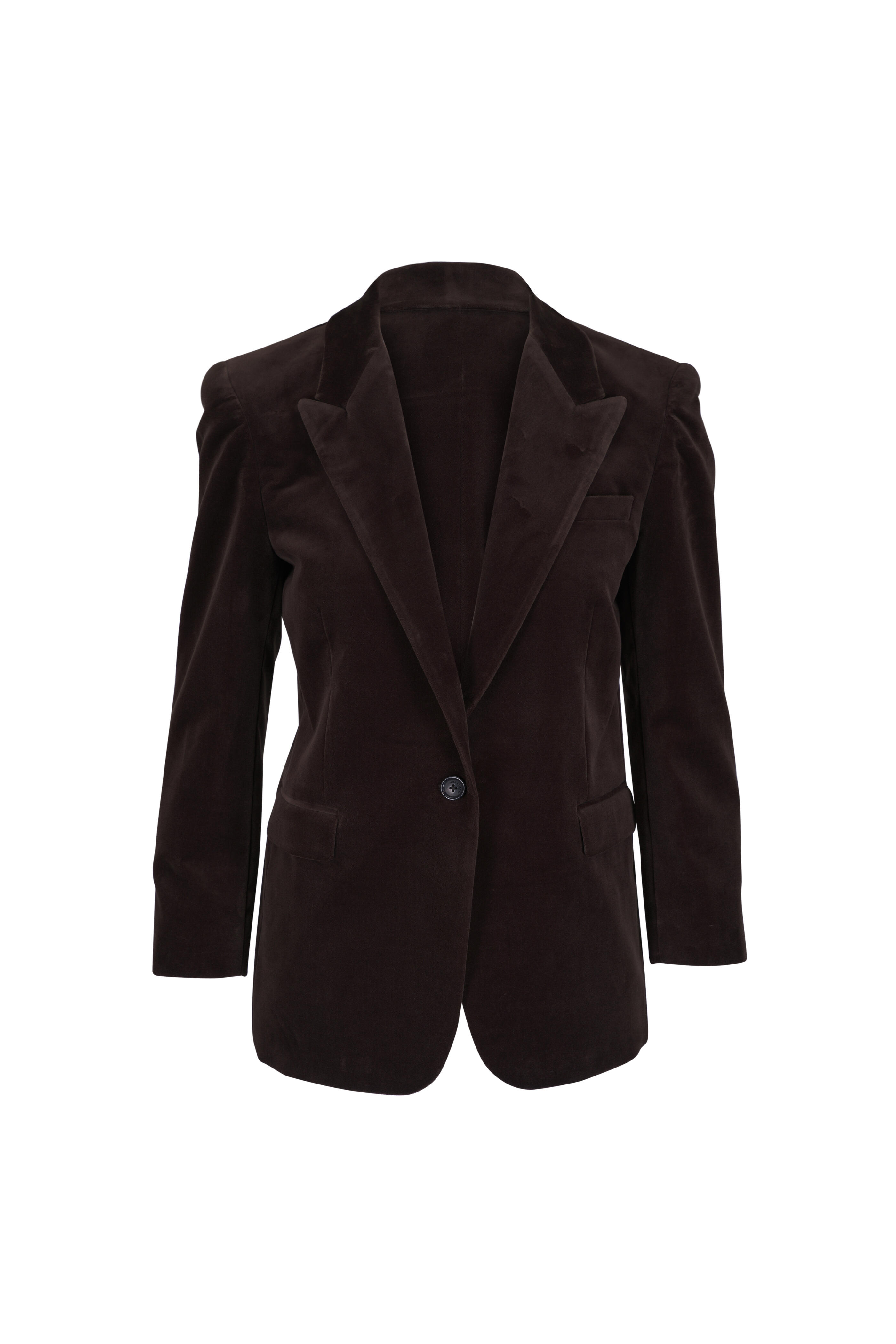 Peak lapels. Single button closure. Chest welt pocket; Lower waist flap pockets. Five button cuffs. Single vent. Imported. Shoulder to hem 29" (size 2). 98% Cotton, 2% elastane; fully lined. Dry clean.