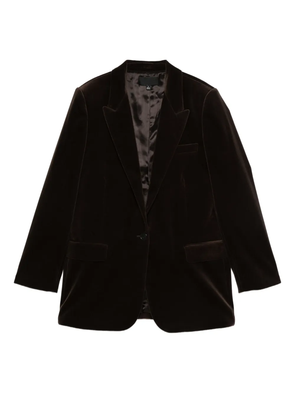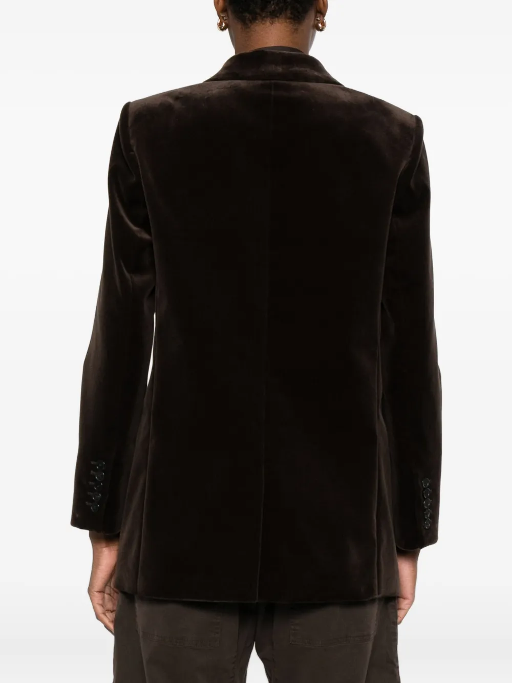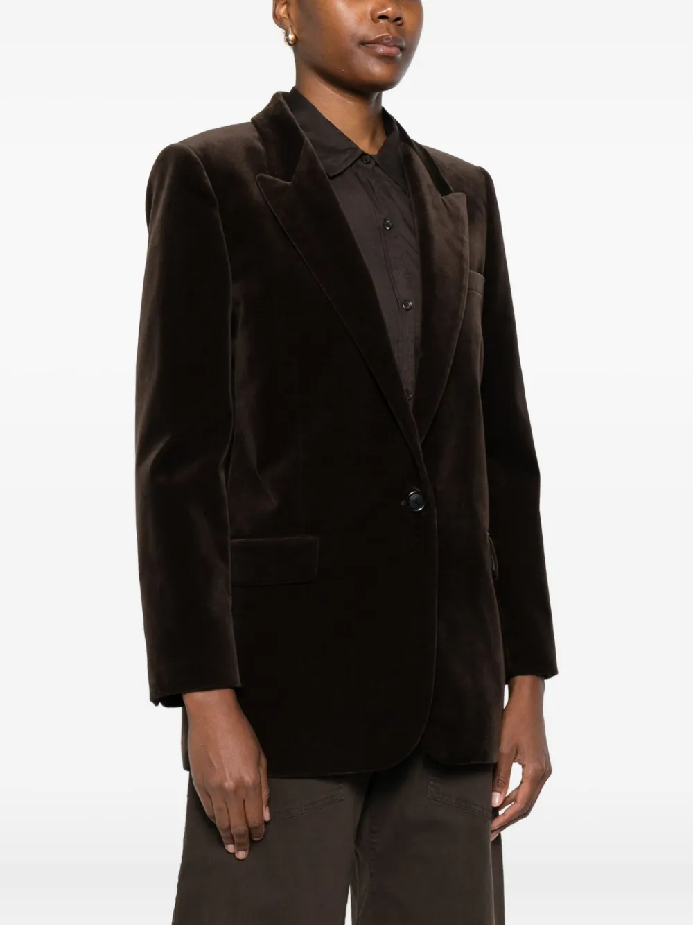 Peak lapels. Single button closure. Chest welt pocket; Lower waist flap pockets. Five button cuffs. Single vent. Imported. Shoulder to hem 29" (size 2). 98% Cotton, 2% elastane; fully lined. Dry clean.