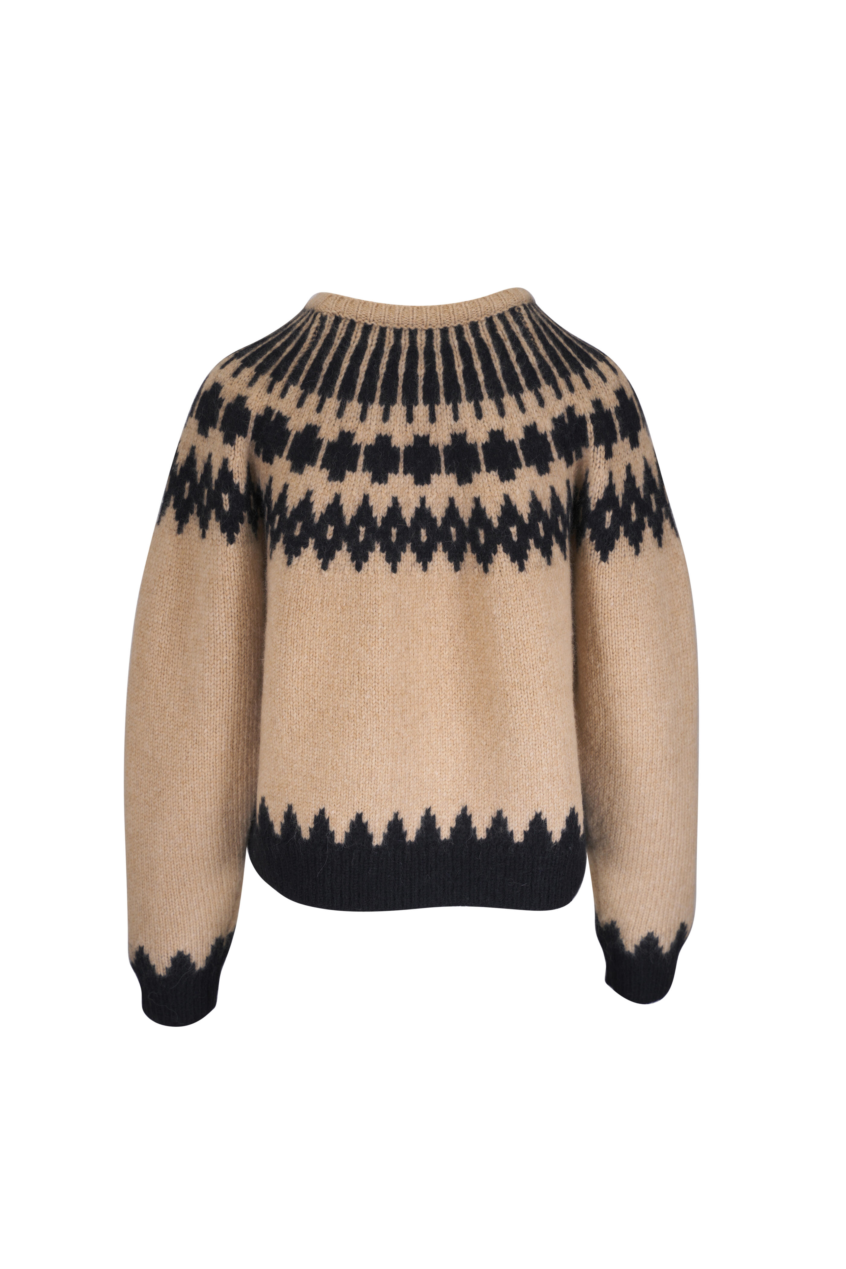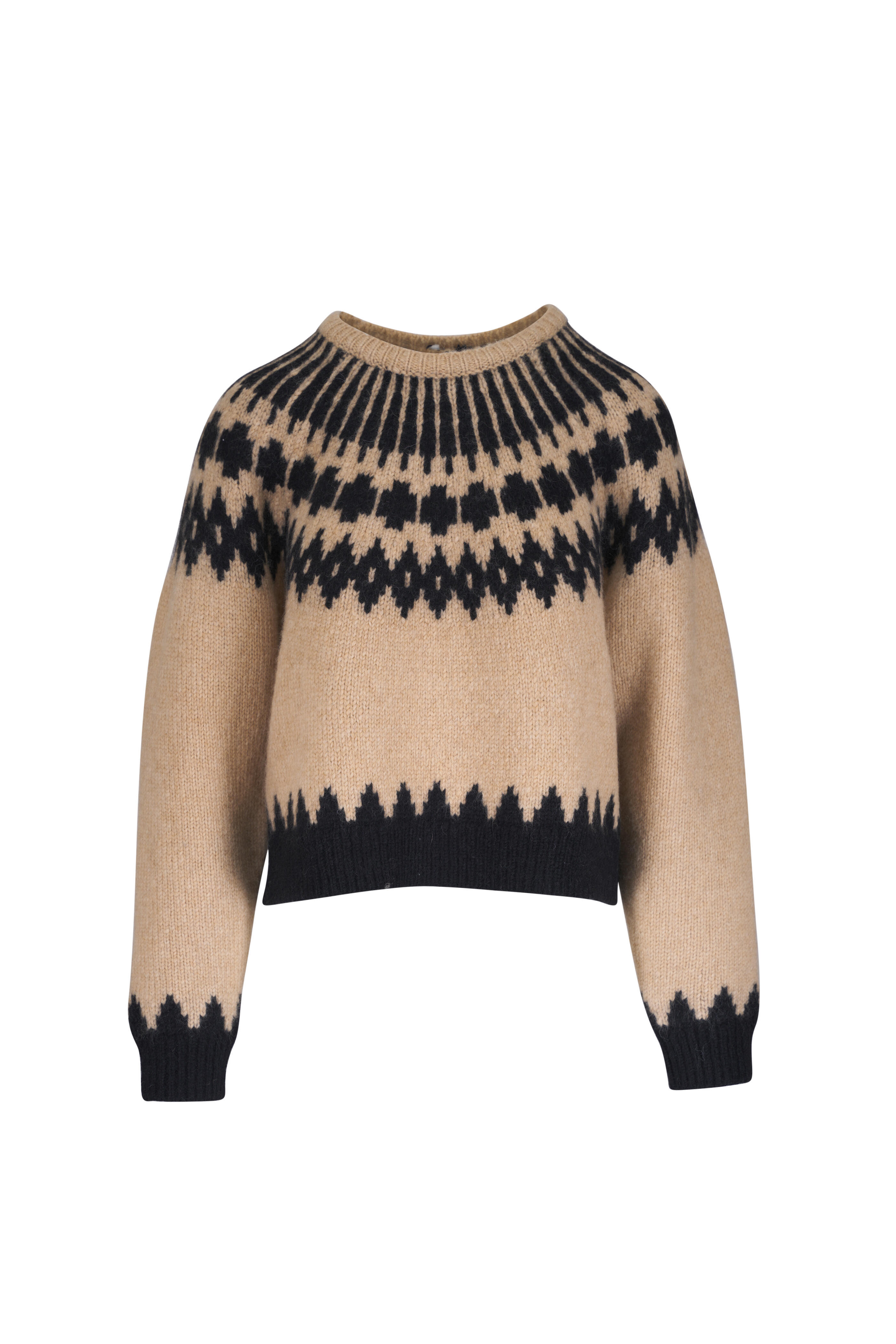 Crew neckline. Ribbed trims. Imported. 55% alpaca, 23% wool, 22% polyamide. Dry clean.