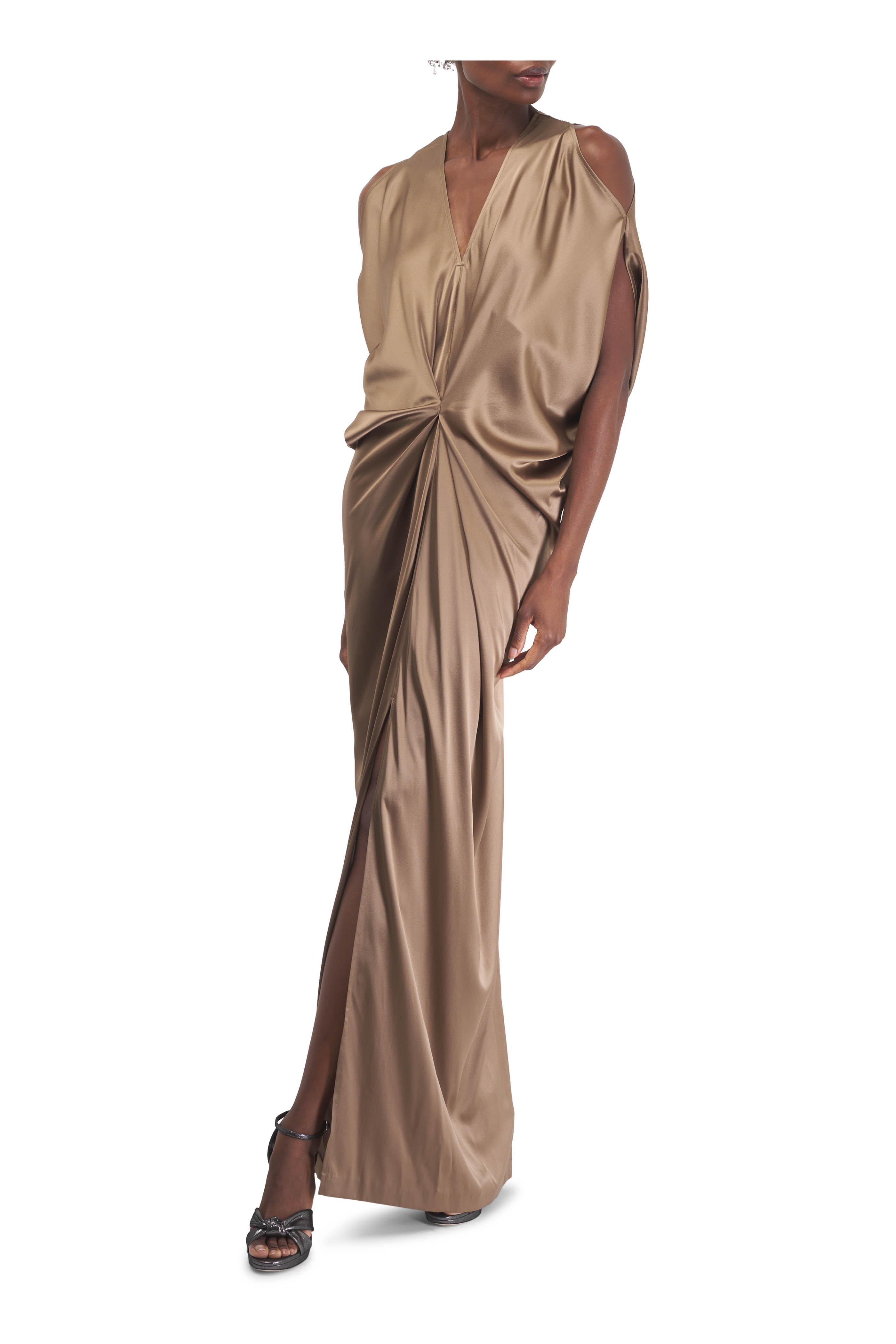 V-neckline. Pullover style. Short dolman sleeves. Center front ruched detail. Front center split. Straight hem. Made in USA. Shoulder to hem 69" (size 8). 95% silk, 5% elastane. Dry clean.
